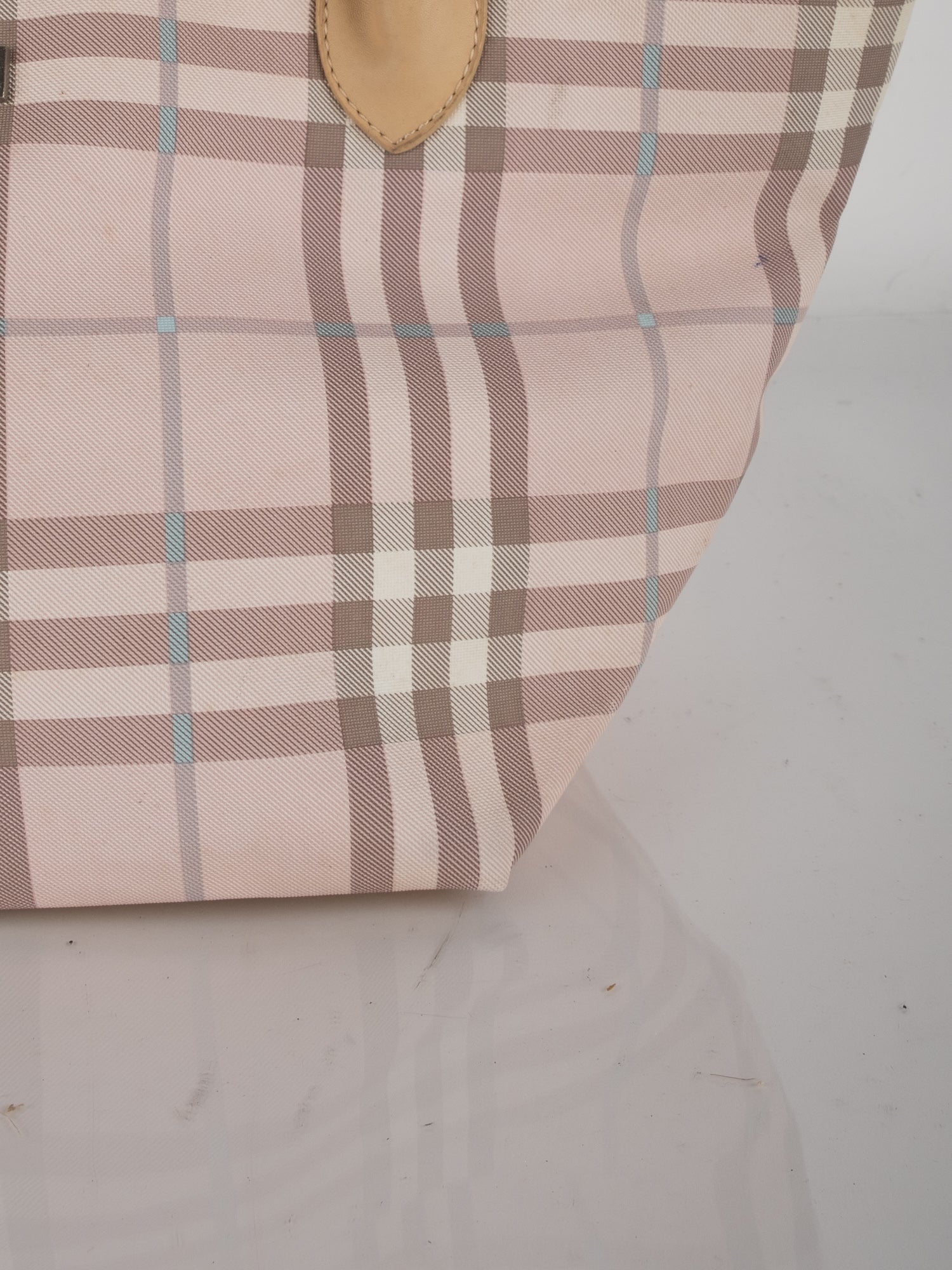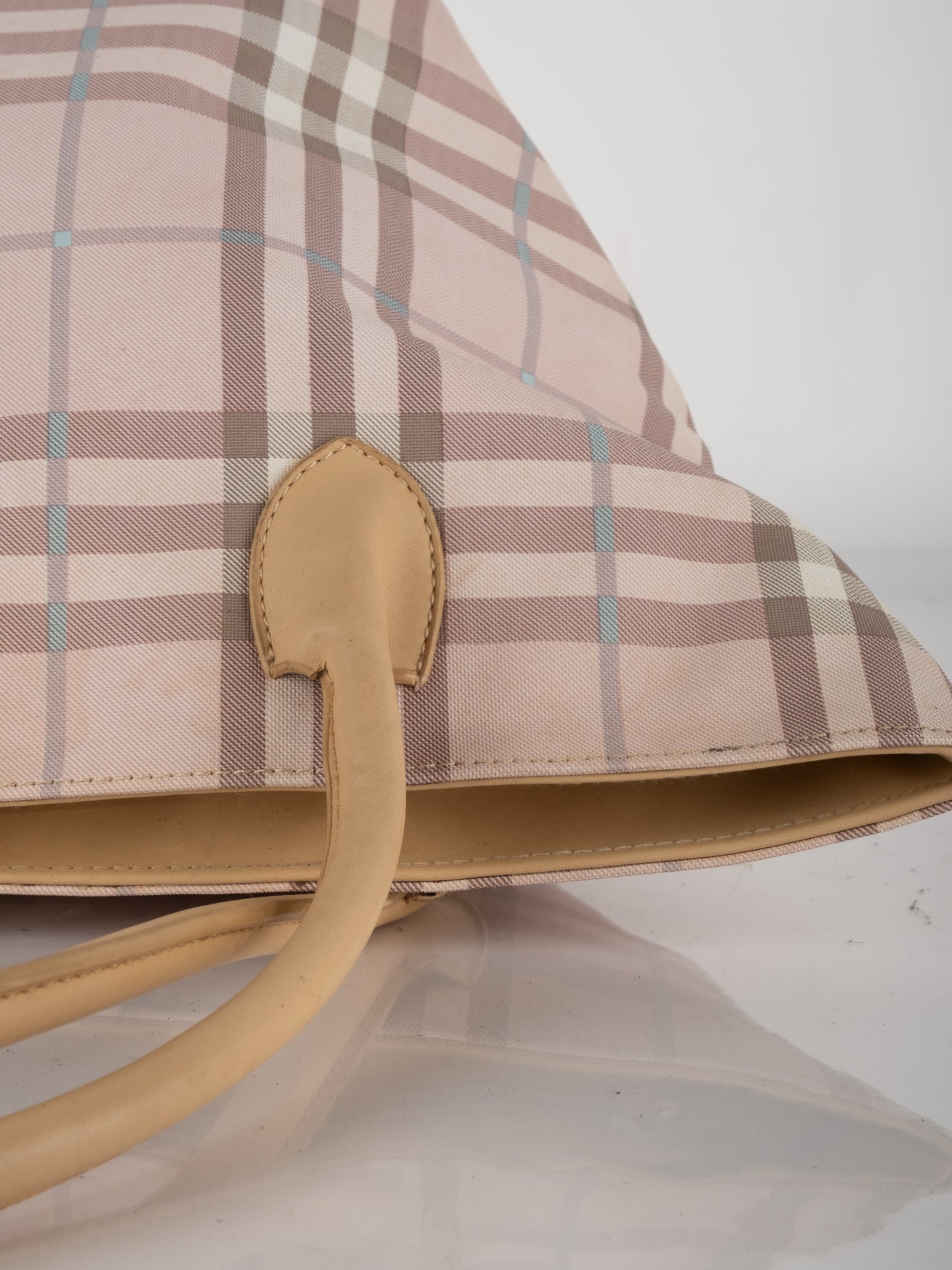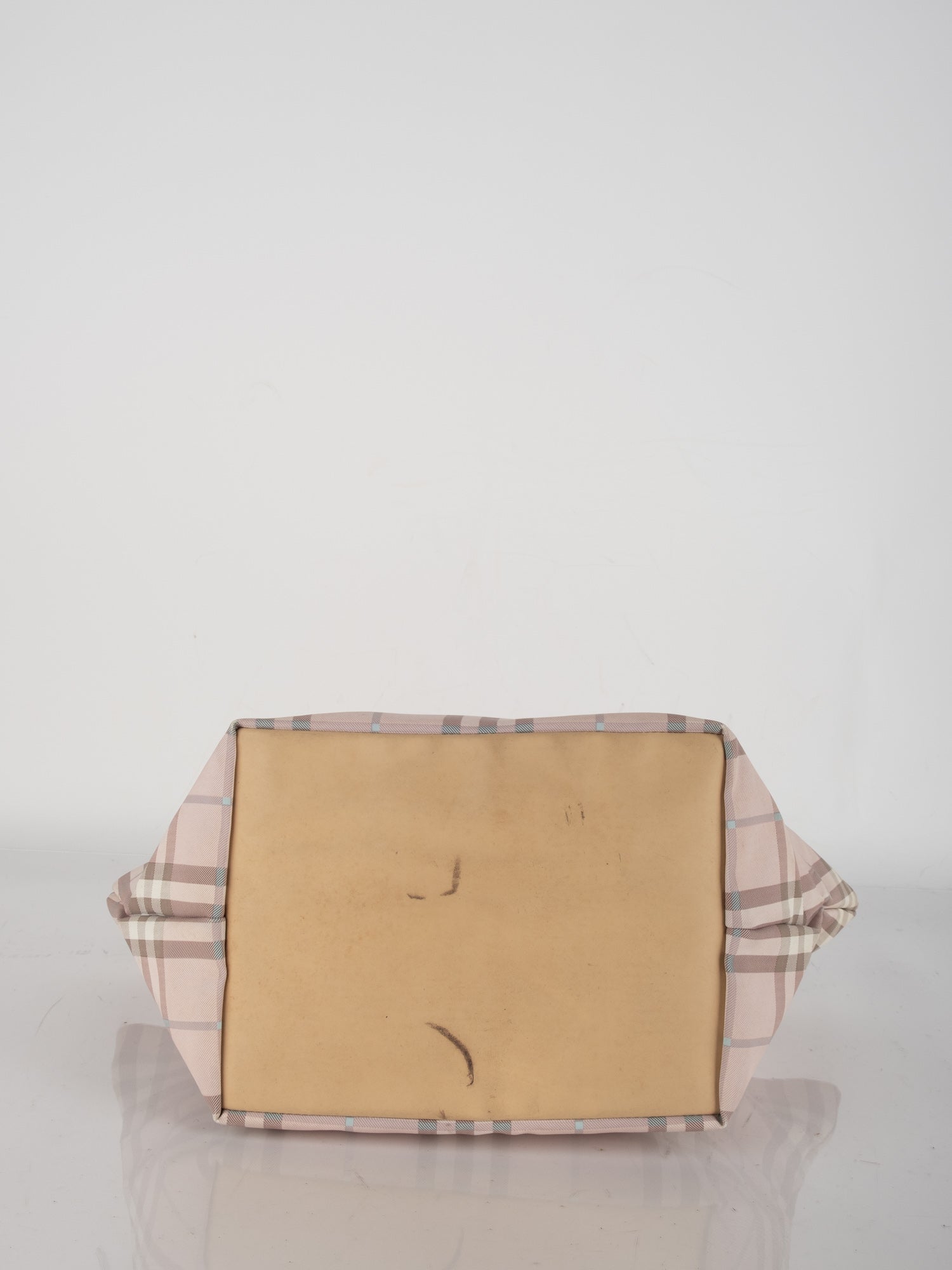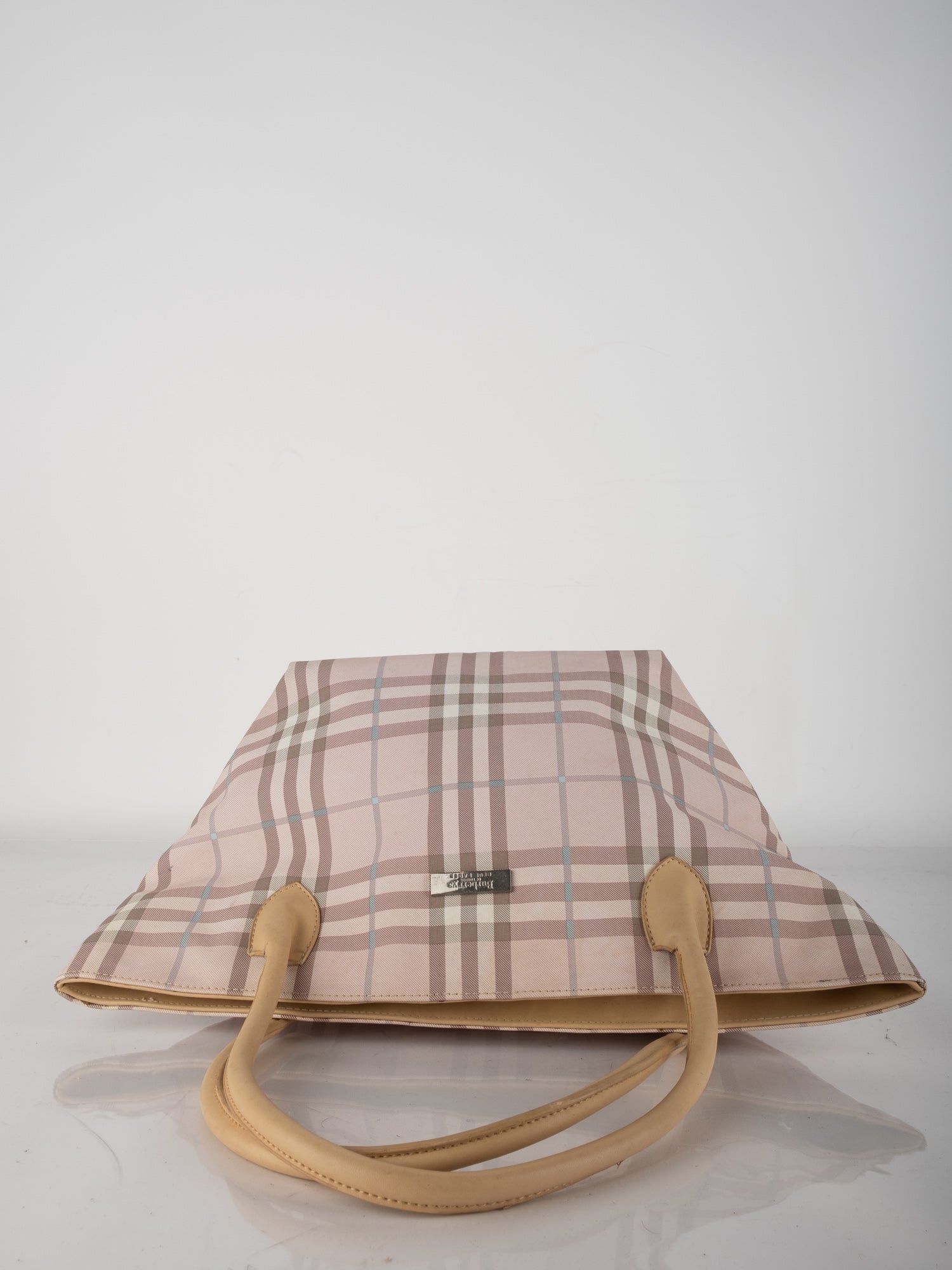התיק עשוי קנבס בדוגמת Check בגווני ורוד ובז׳, עם ידיות נשיאה עליונות בגוון בז׳. מבנה רחב, תא מרכזי נוח ורוחב שמאפשר שימוש יומיומי קל ומאורגן.