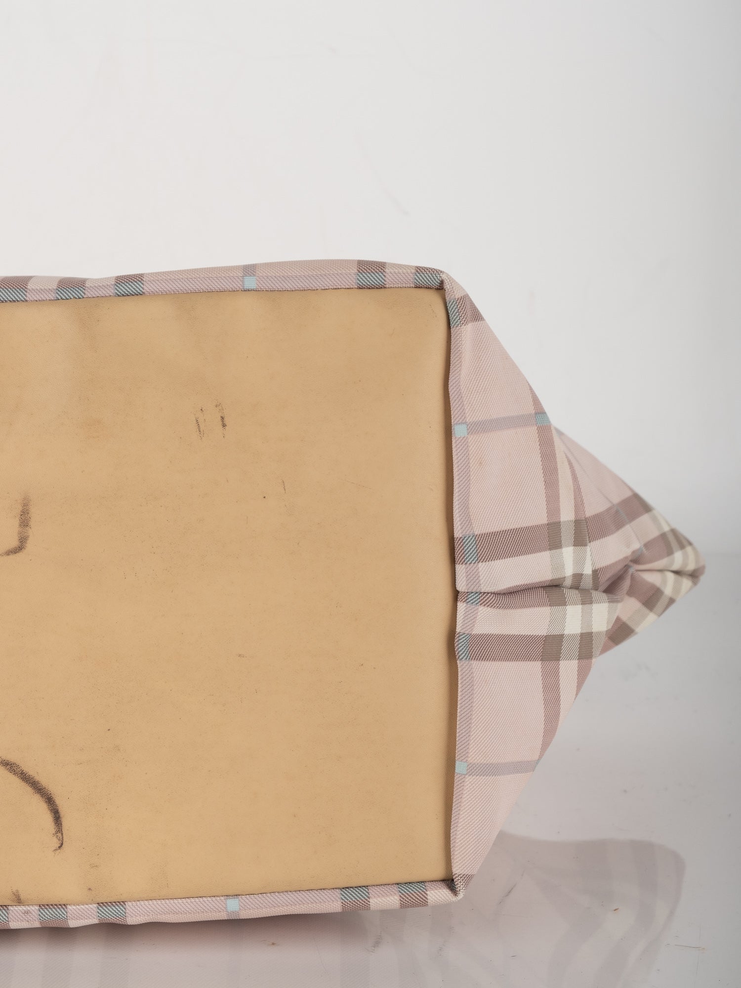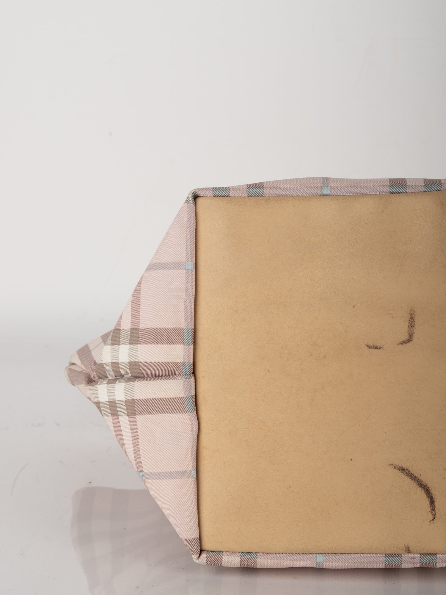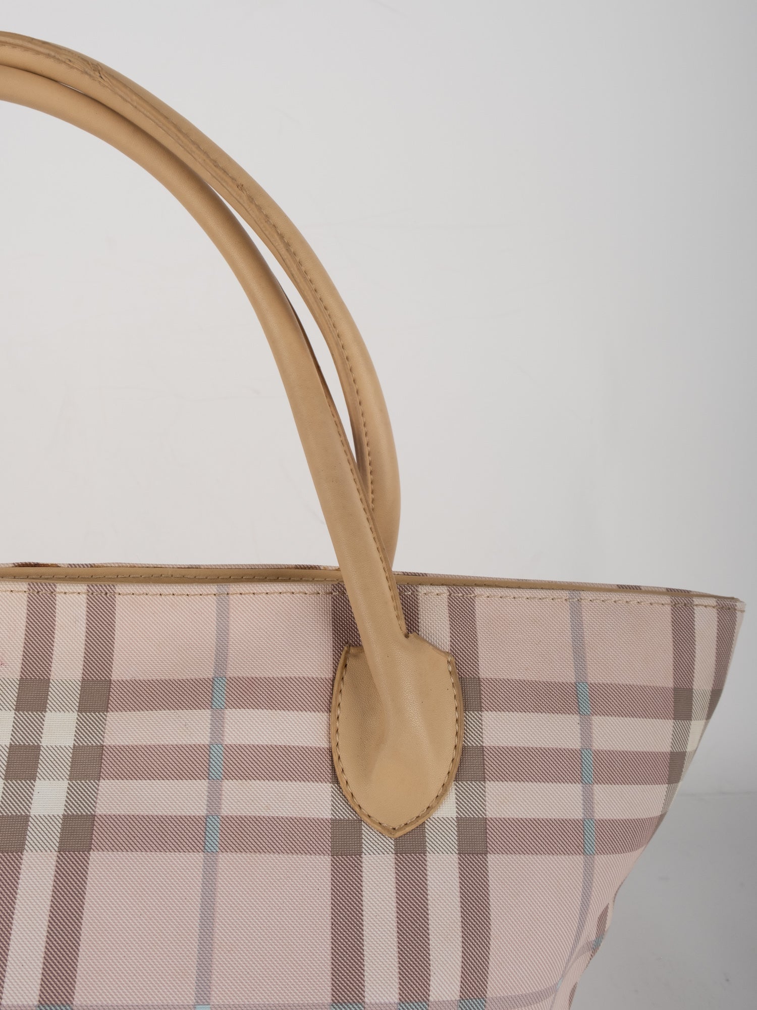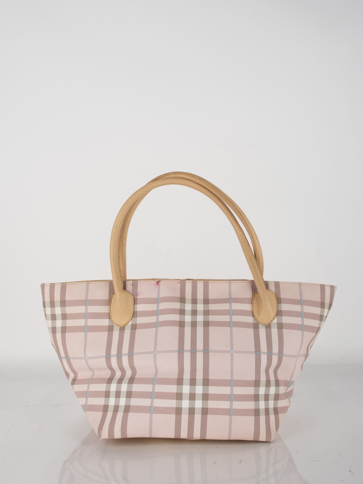 התיק עשוי קנבס בדוגמת Check בגווני ורוד ובז׳, עם ידיות נשיאה עליונות בגוון בז׳. מבנה רחב, תא מרכזי נוח ורוחב שמאפשר שימוש יומיומי קל ומאורגן.