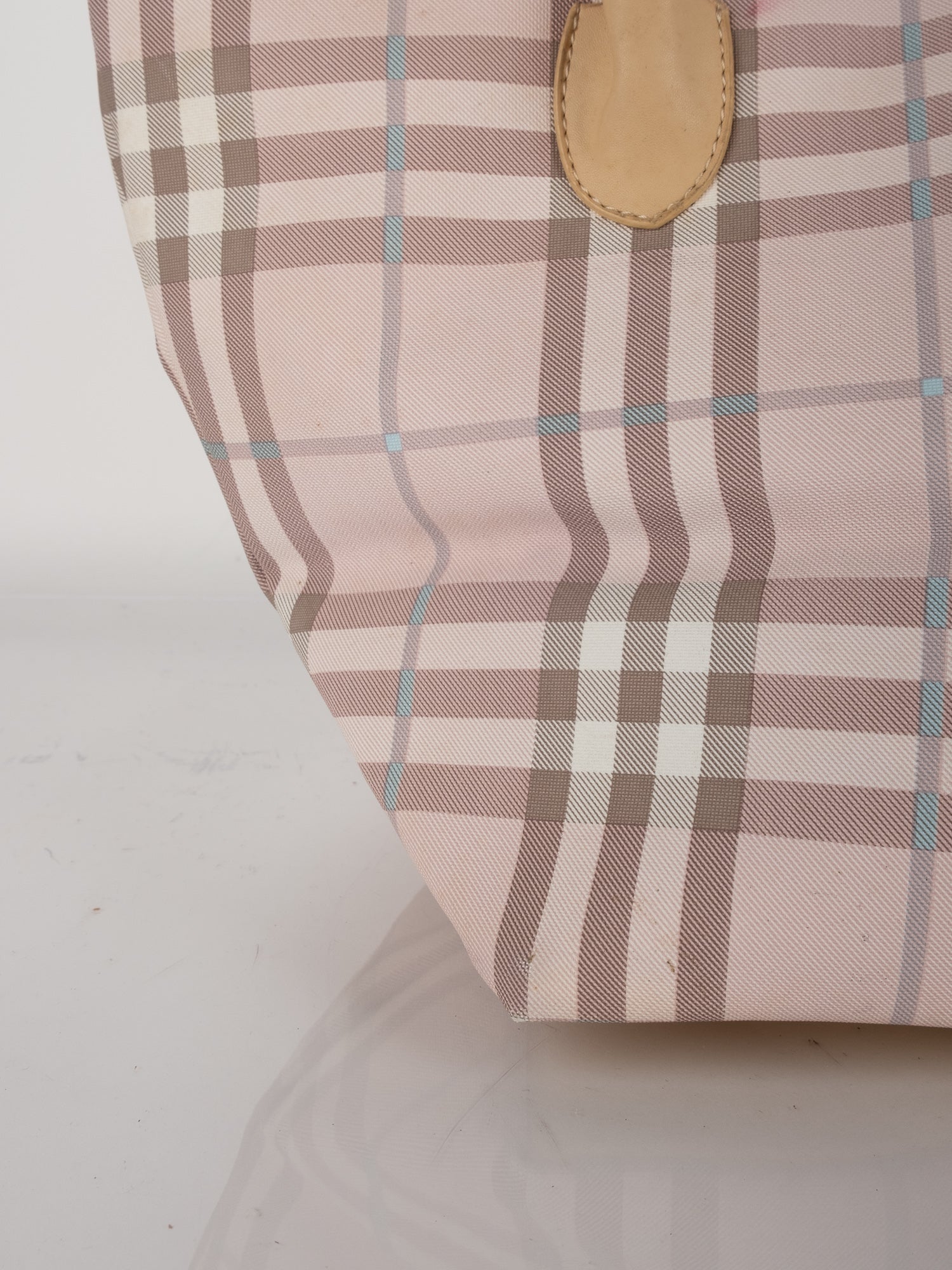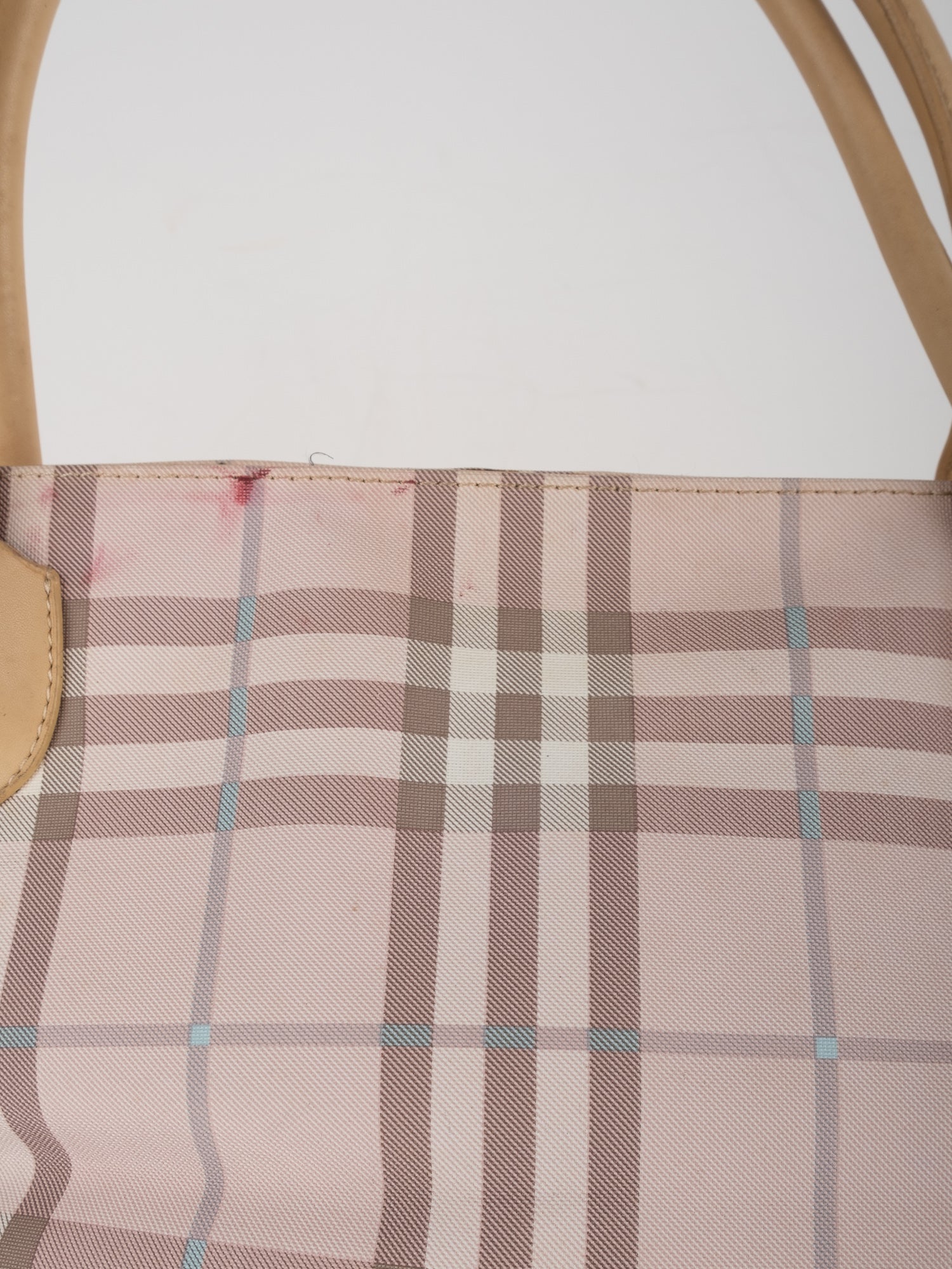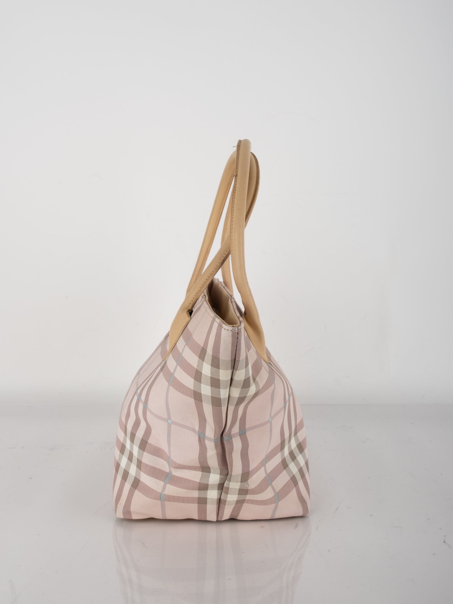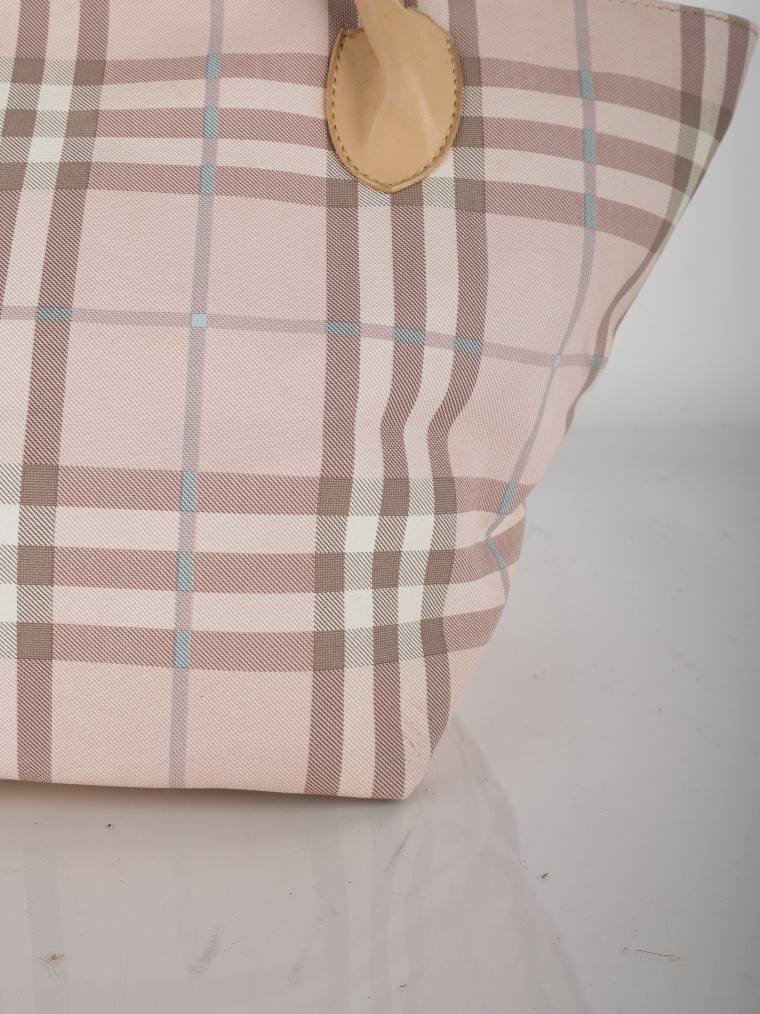 התיק עשוי קנבס בדוגמת Check בגווני ורוד ובז׳, עם ידיות נשיאה עליונות בגוון בז׳. מבנה רחב, תא מרכזי נוח ורוחב שמאפשר שימוש יומיומי קל ומאורגן.