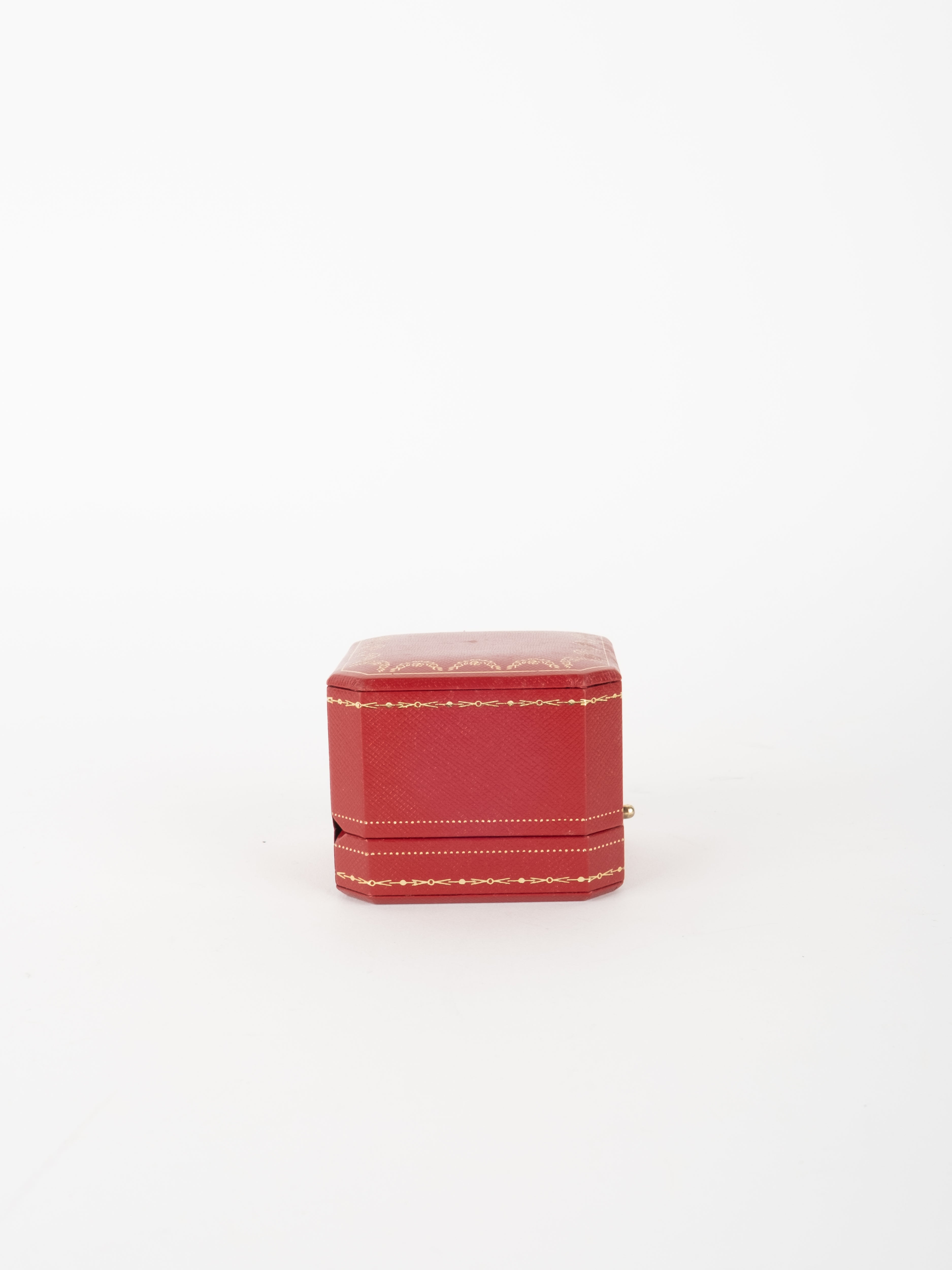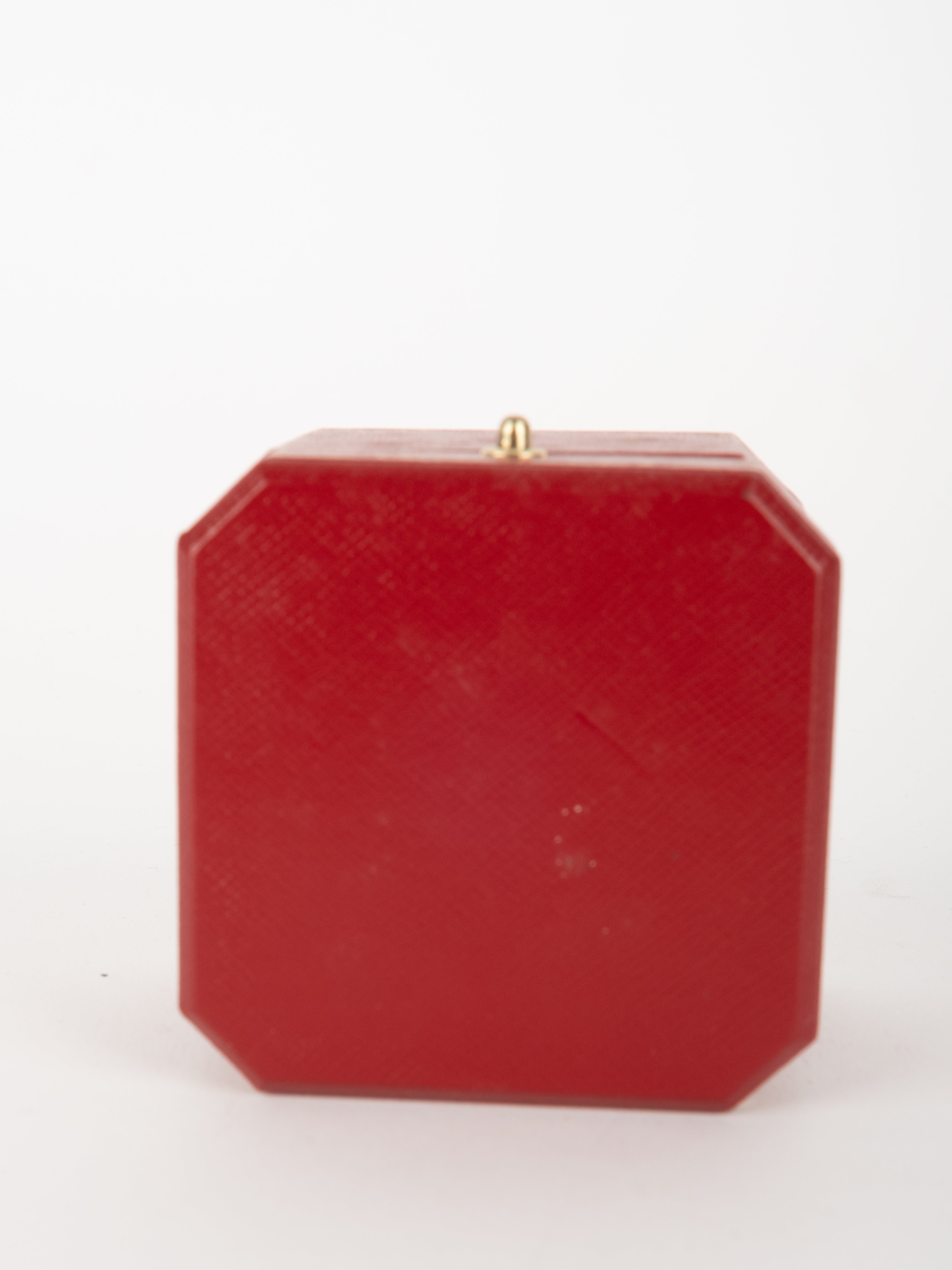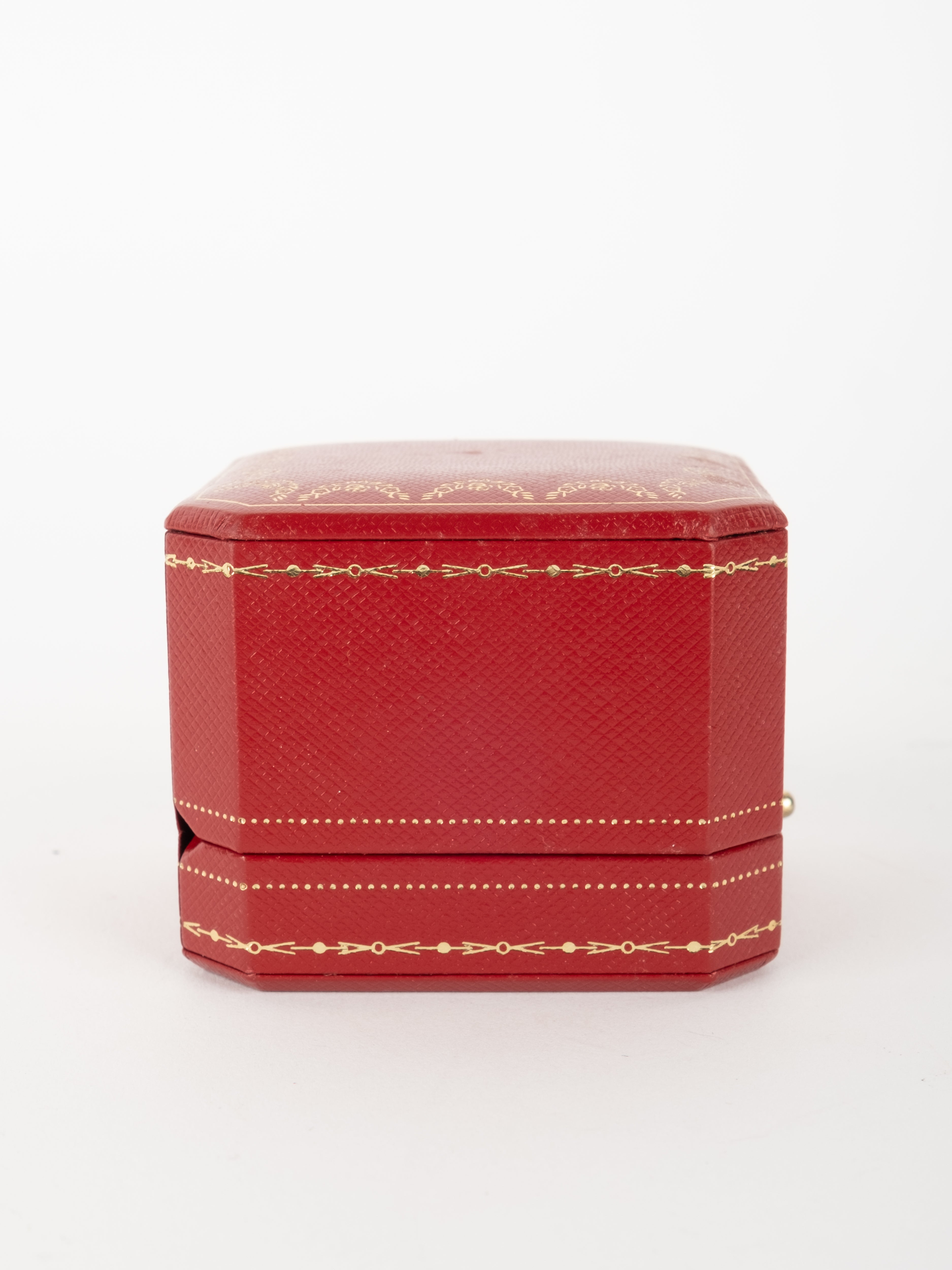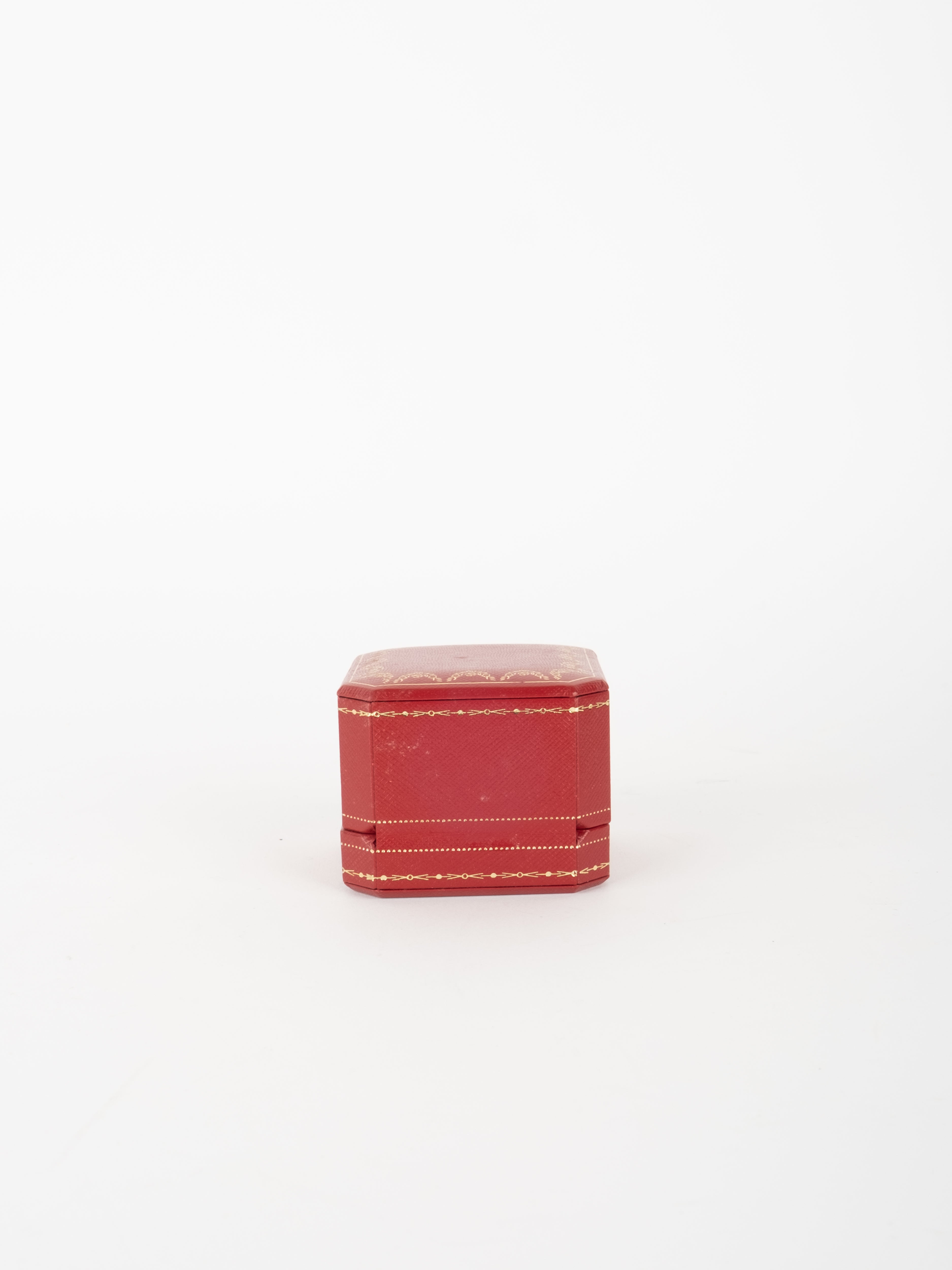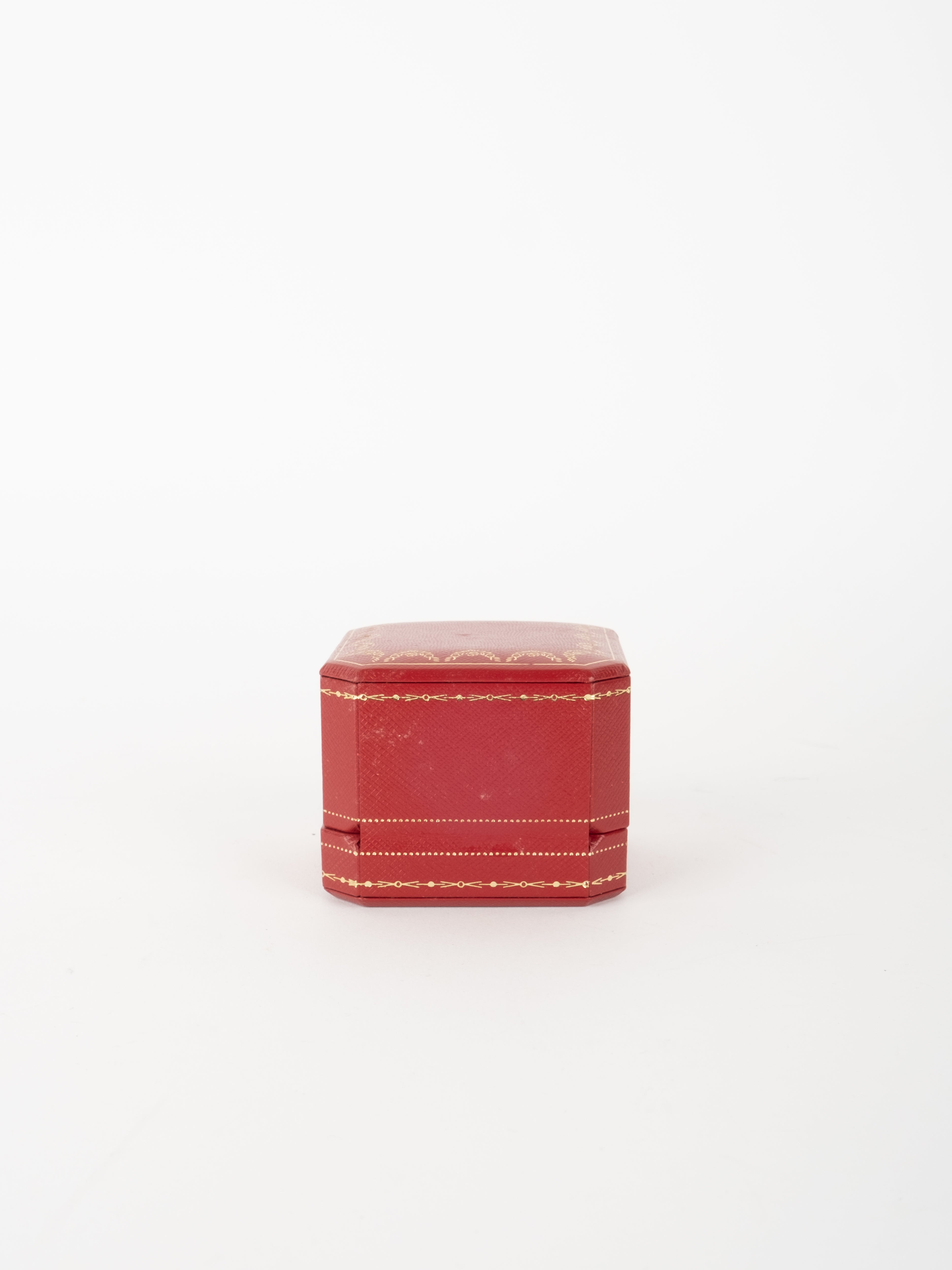 הפריט עשוי חומר קשיח בגוון אדום עם גימורים מוזהבים ועיצוב קלאסי של קופסת תכשיטים מקורית. פנים הקופסה מרופד בגוון בהיר, ומתאים לאחסון טבעת או תכשיט קטן בצורה אלגנטית ומכובדת.
