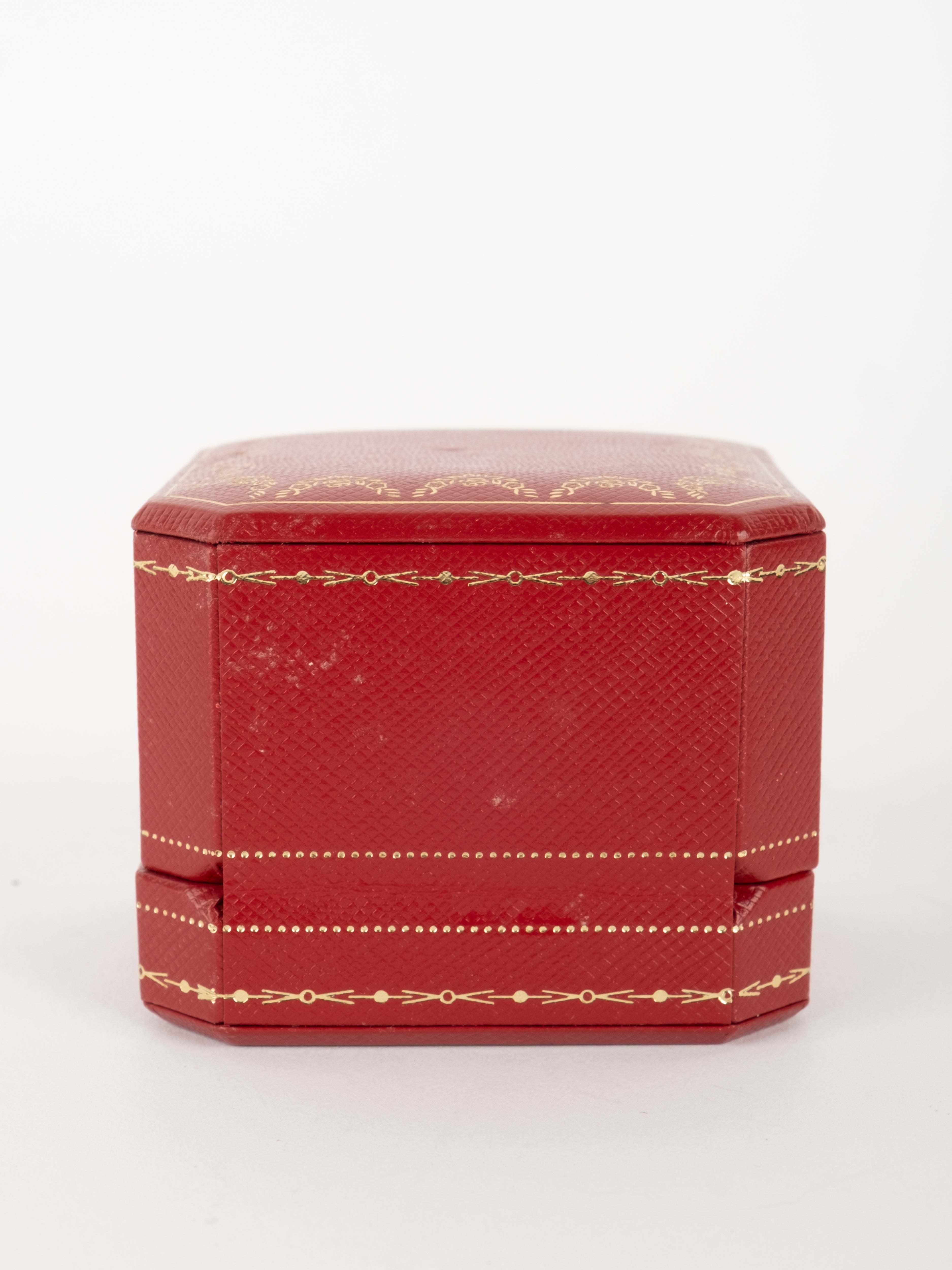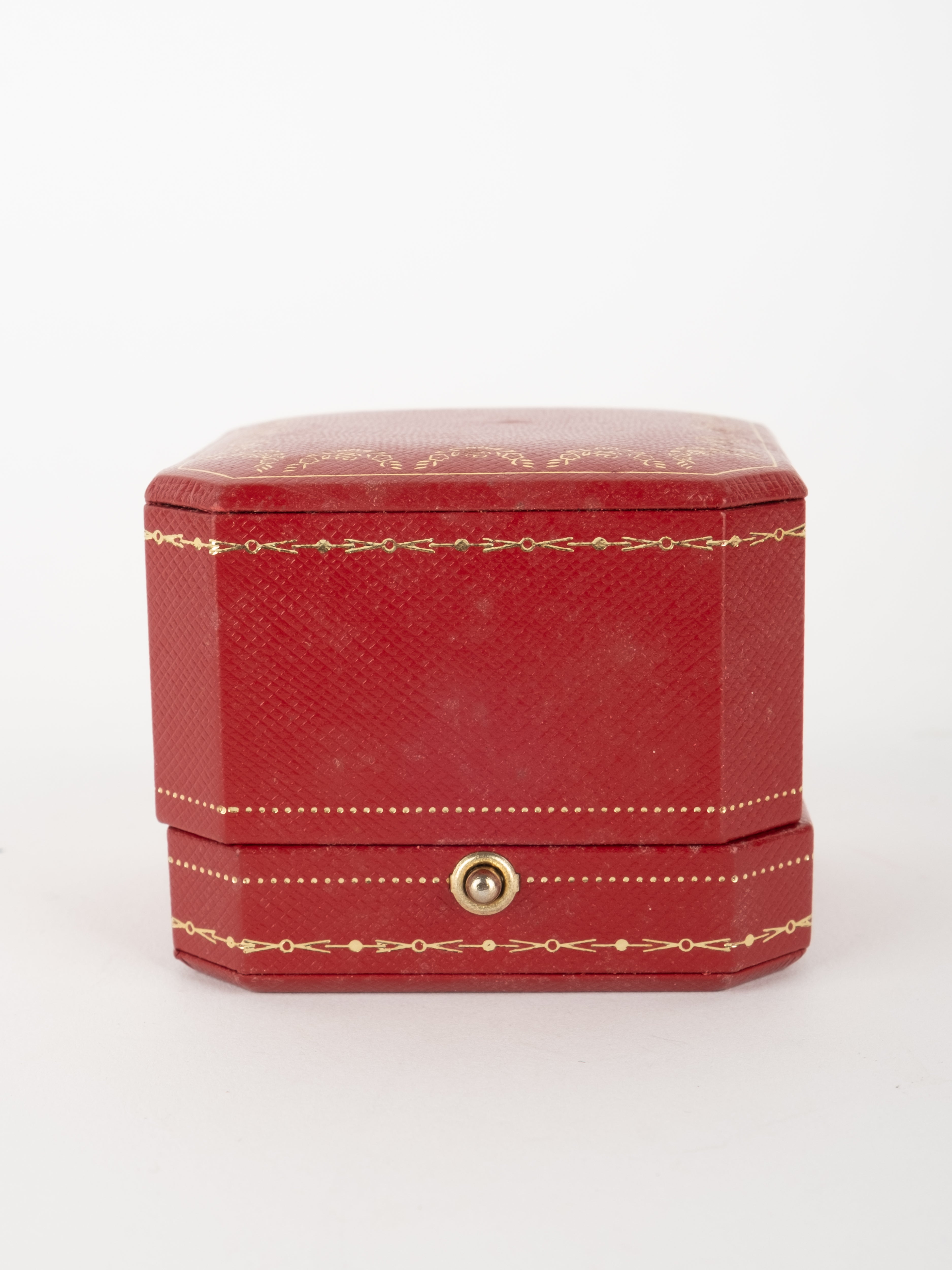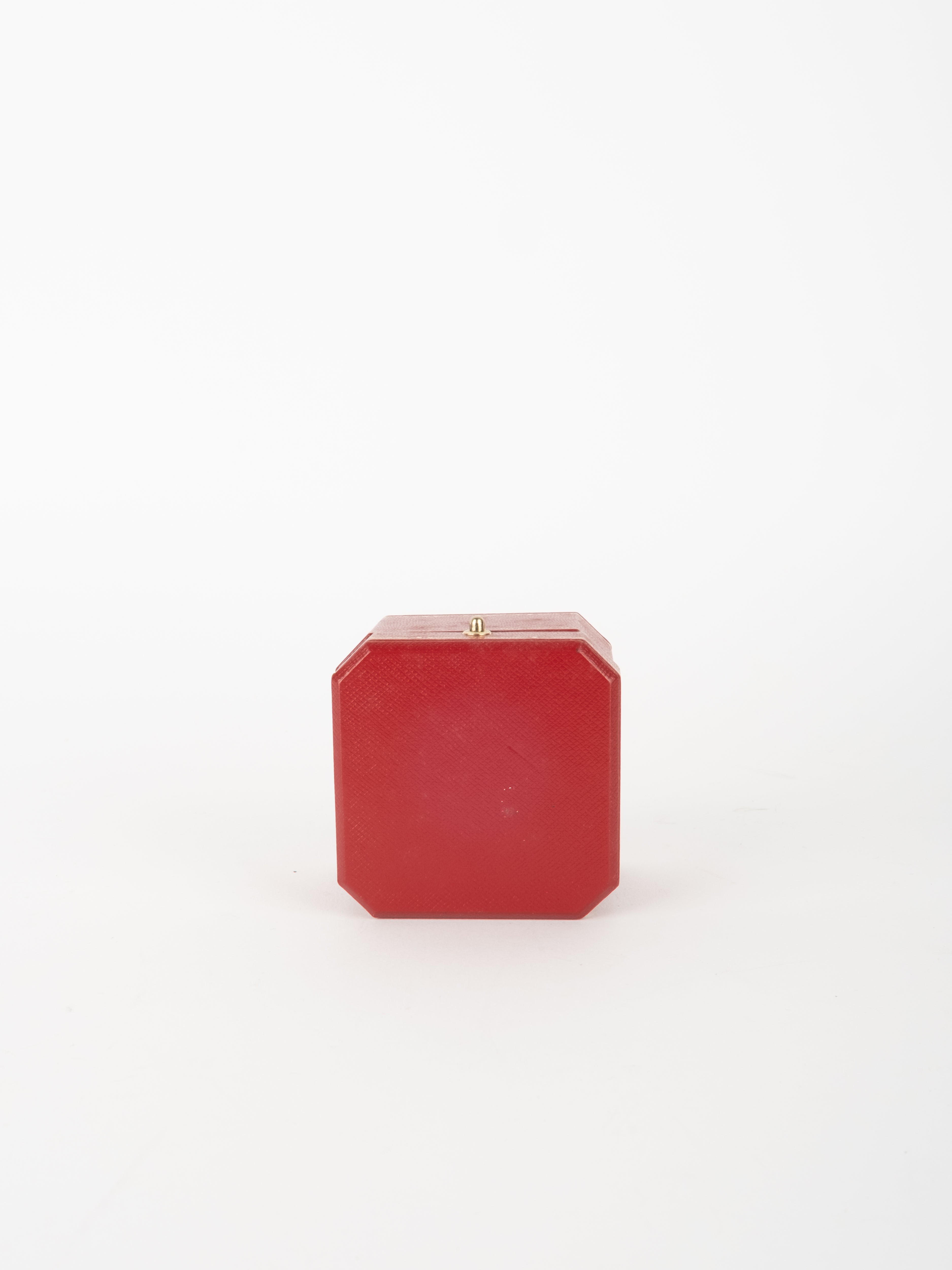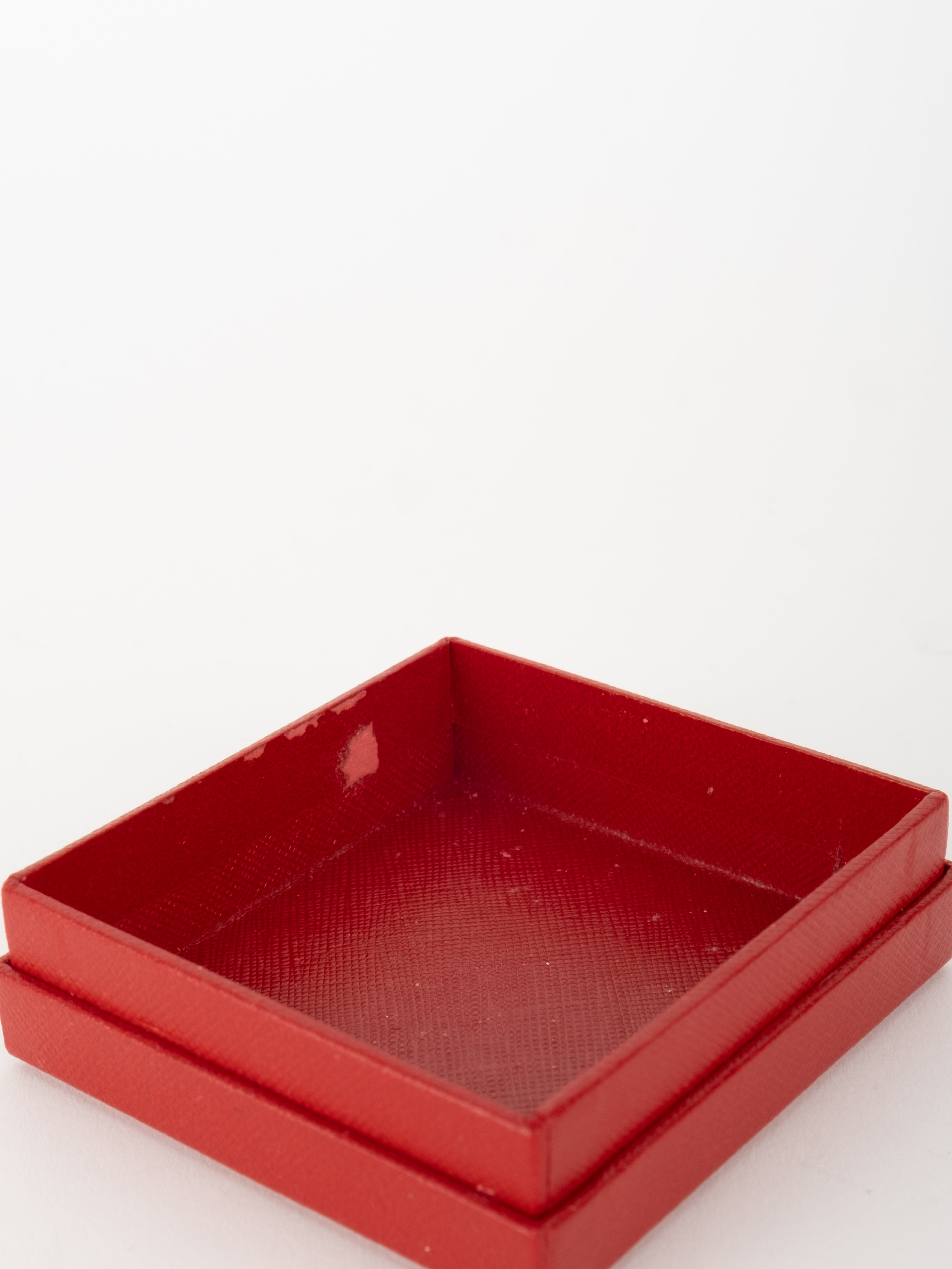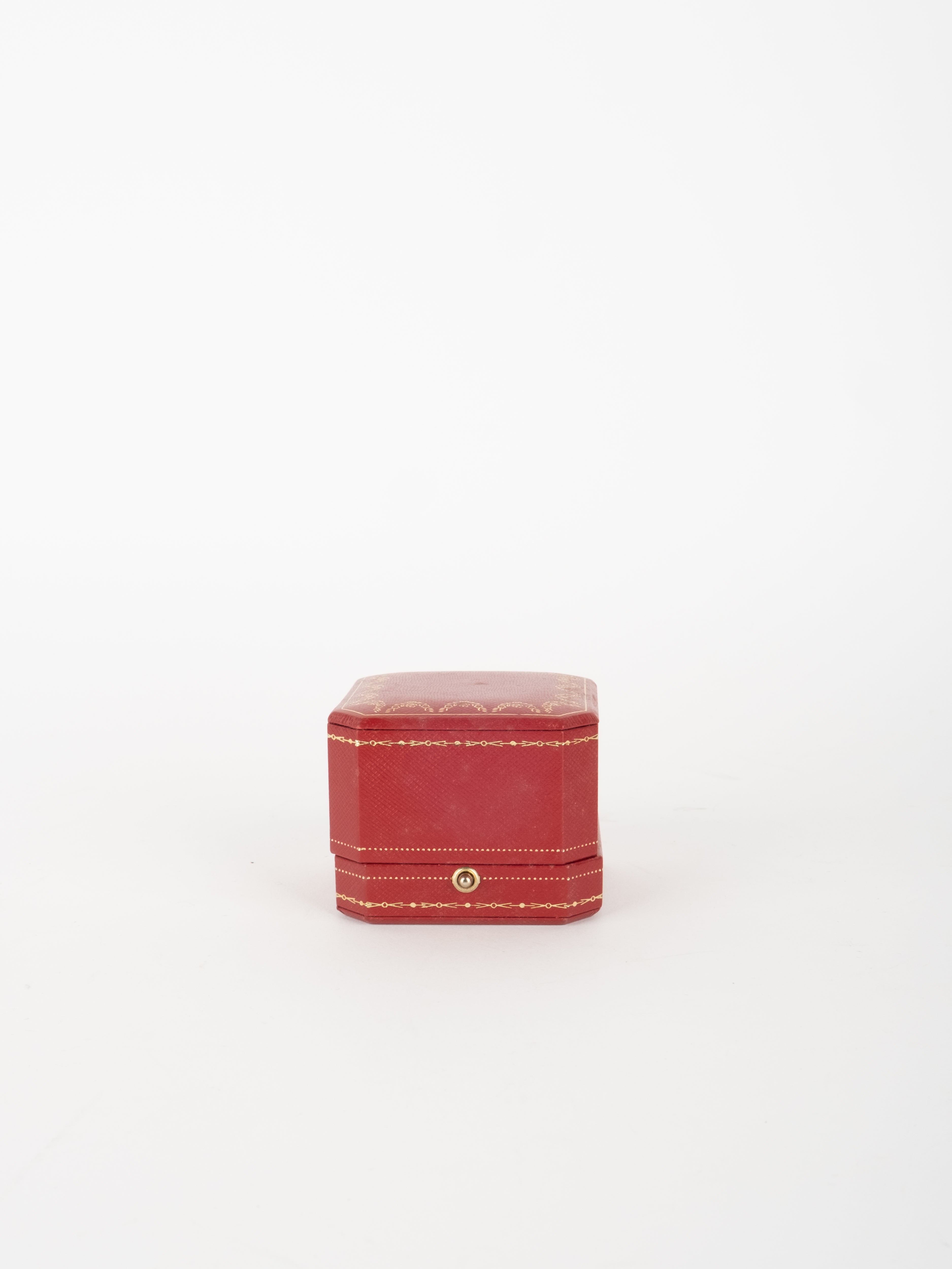 הפריט עשוי חומר קשיח בגוון אדום עם גימורים מוזהבים ועיצוב קלאסי של קופסת תכשיטים מקורית. פנים הקופסה מרופד בגוון בהיר, ומתאים לאחסון טבעת או תכשיט קטן בצורה אלגנטית ומכובדת.