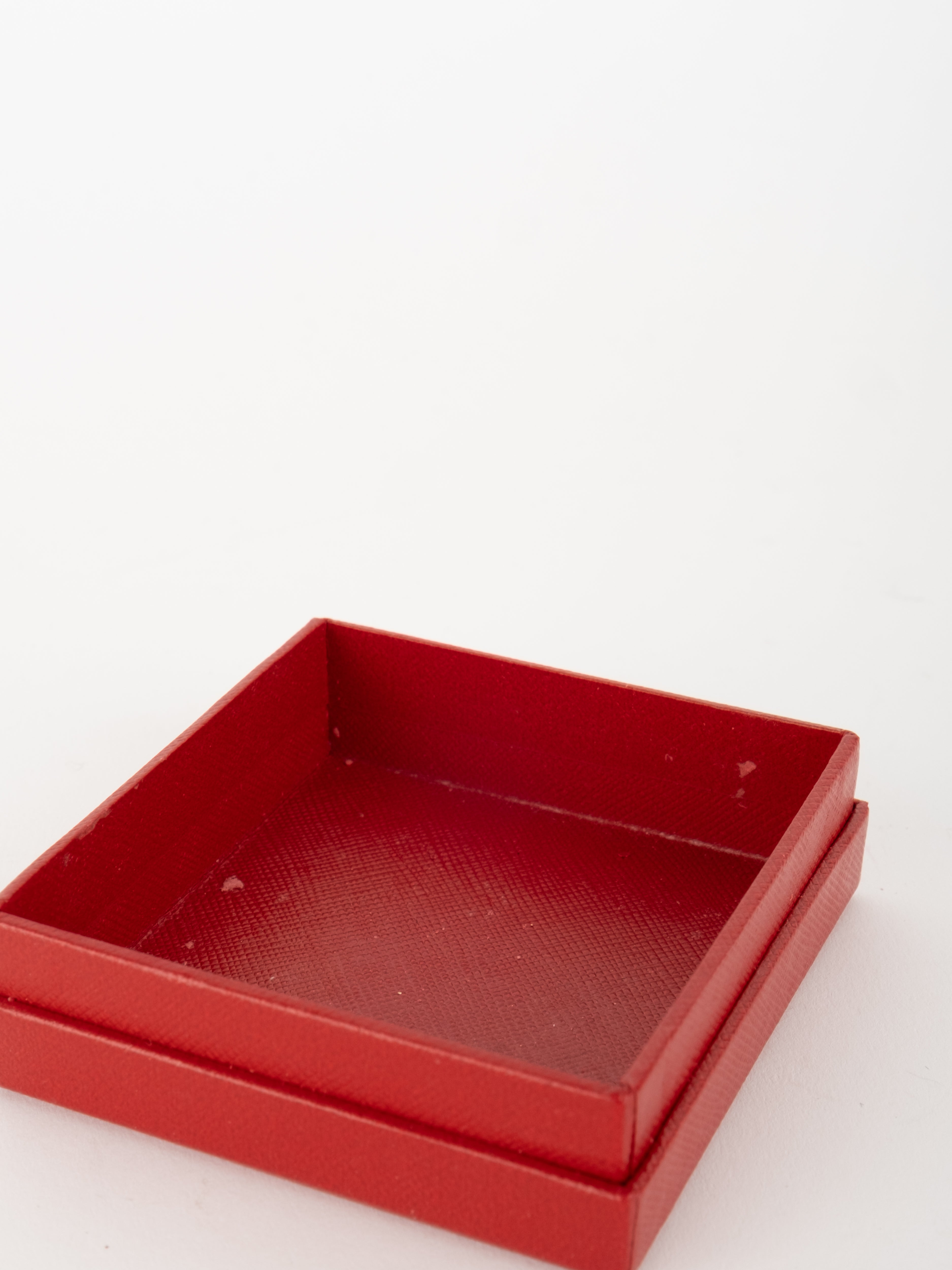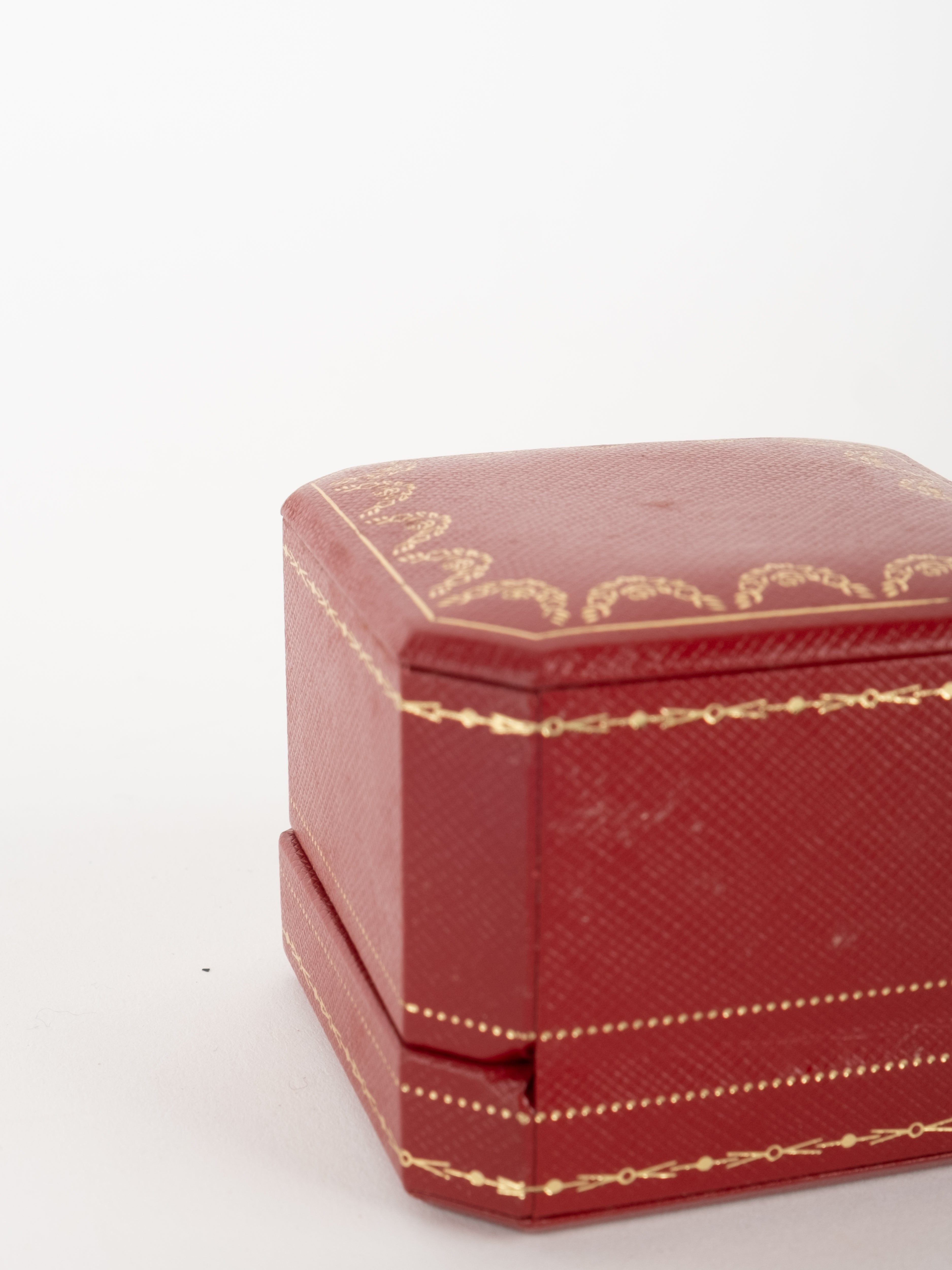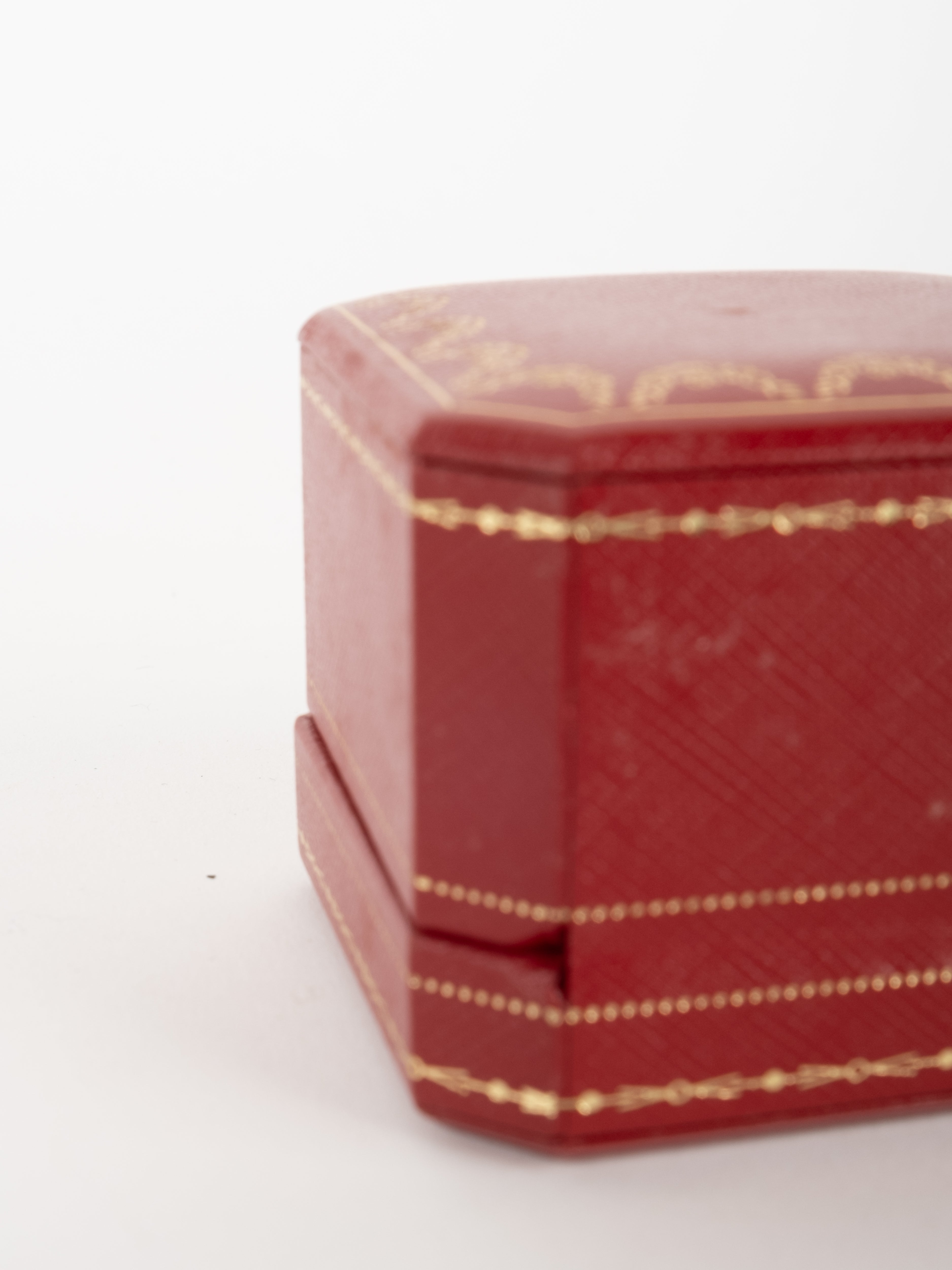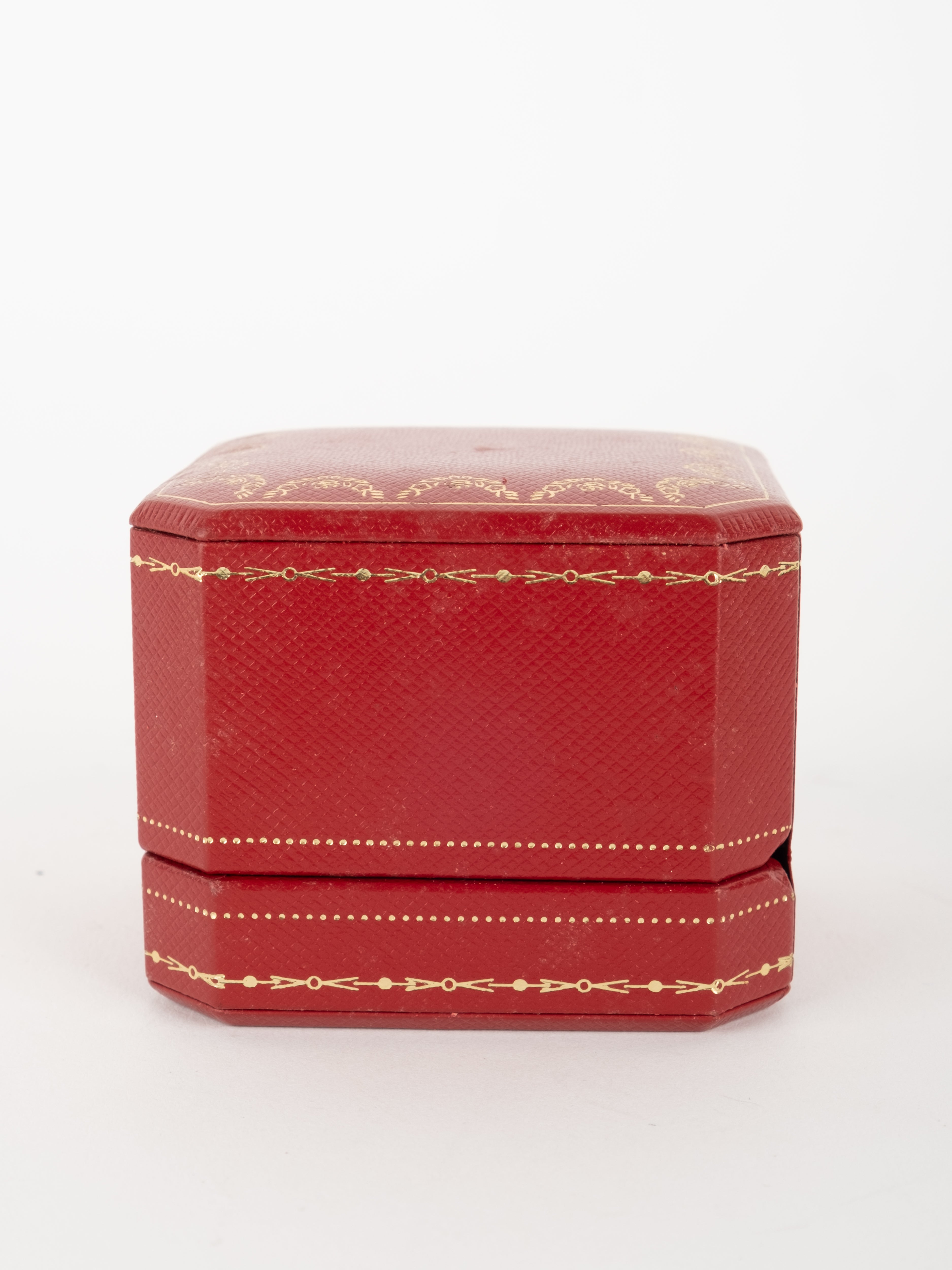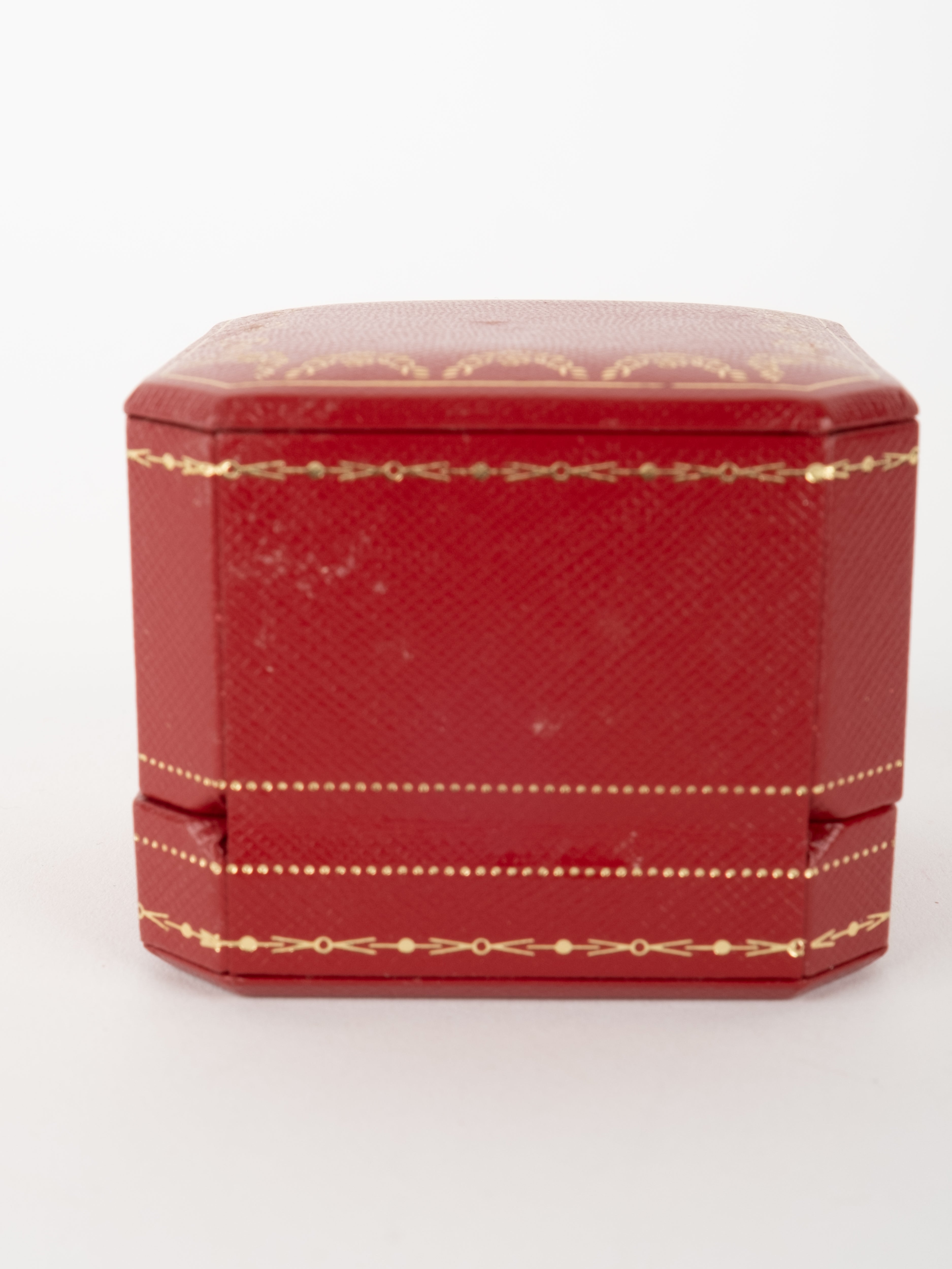 הפריט עשוי חומר קשיח בגוון אדום עם גימורים מוזהבים ועיצוב קלאסי של קופסת תכשיטים מקורית. פנים הקופסה מרופד בגוון בהיר, ומתאים לאחסון טבעת או תכשיט קטן בצורה אלגנטית ומכובדת.