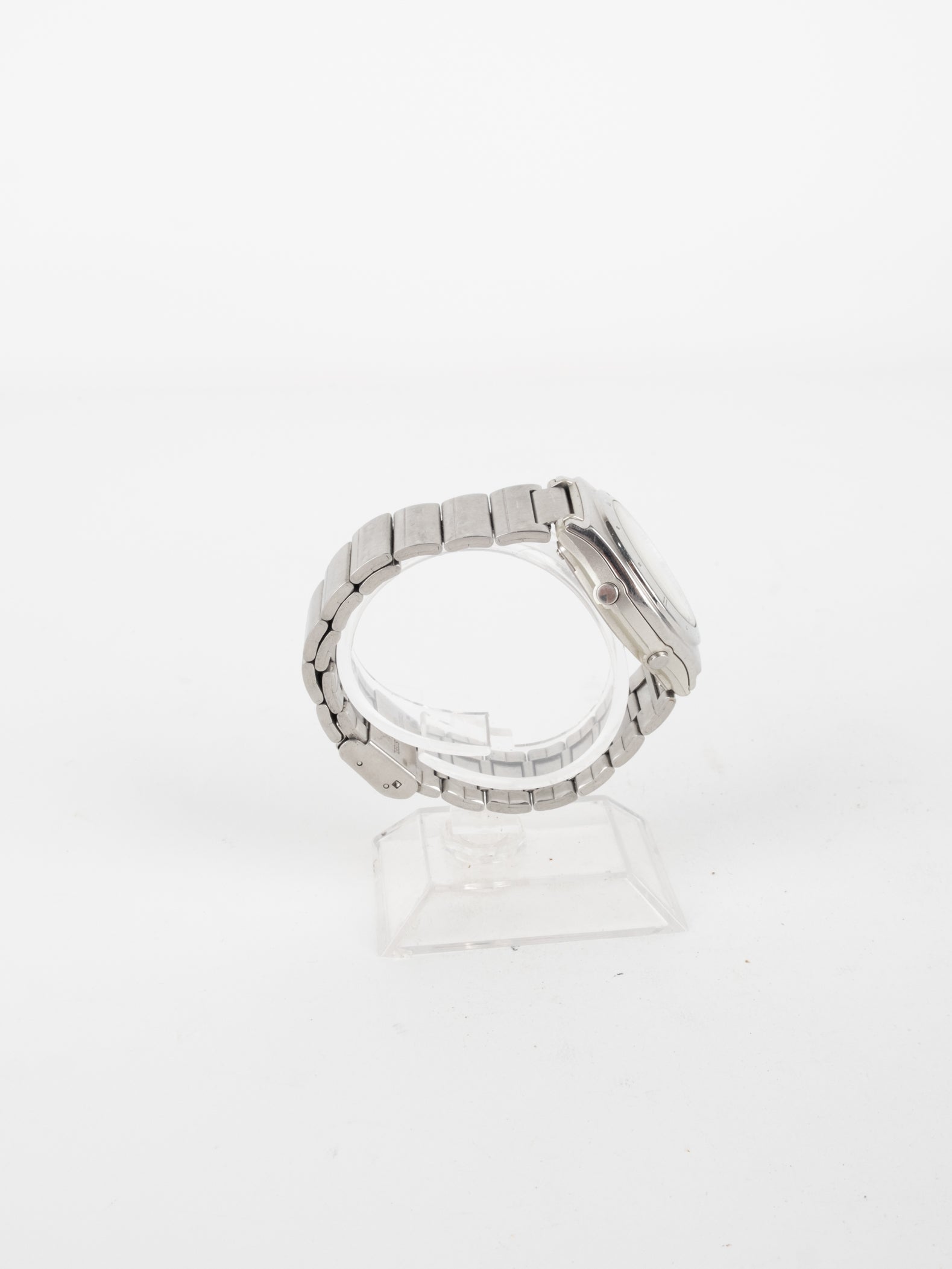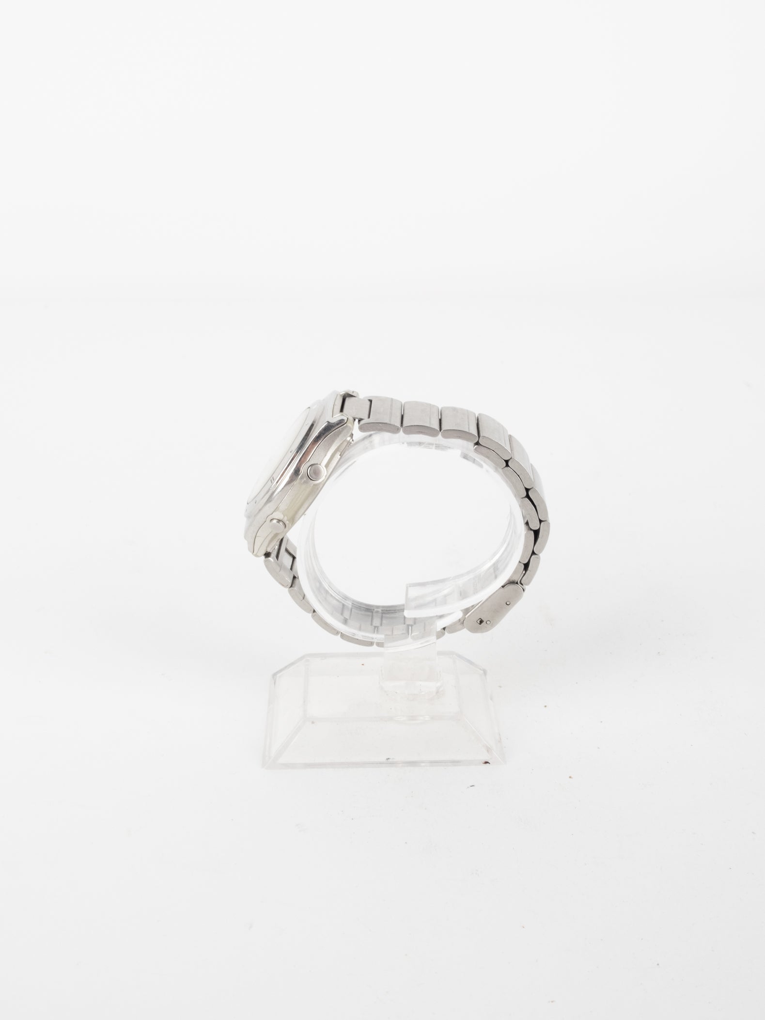שעון קלאסי בצבע כסוף בעל פני שעון בצורה עגולה עם רקע לבן ומחוגים. שעון זה נסגר באמצעות סוגר ממותג.