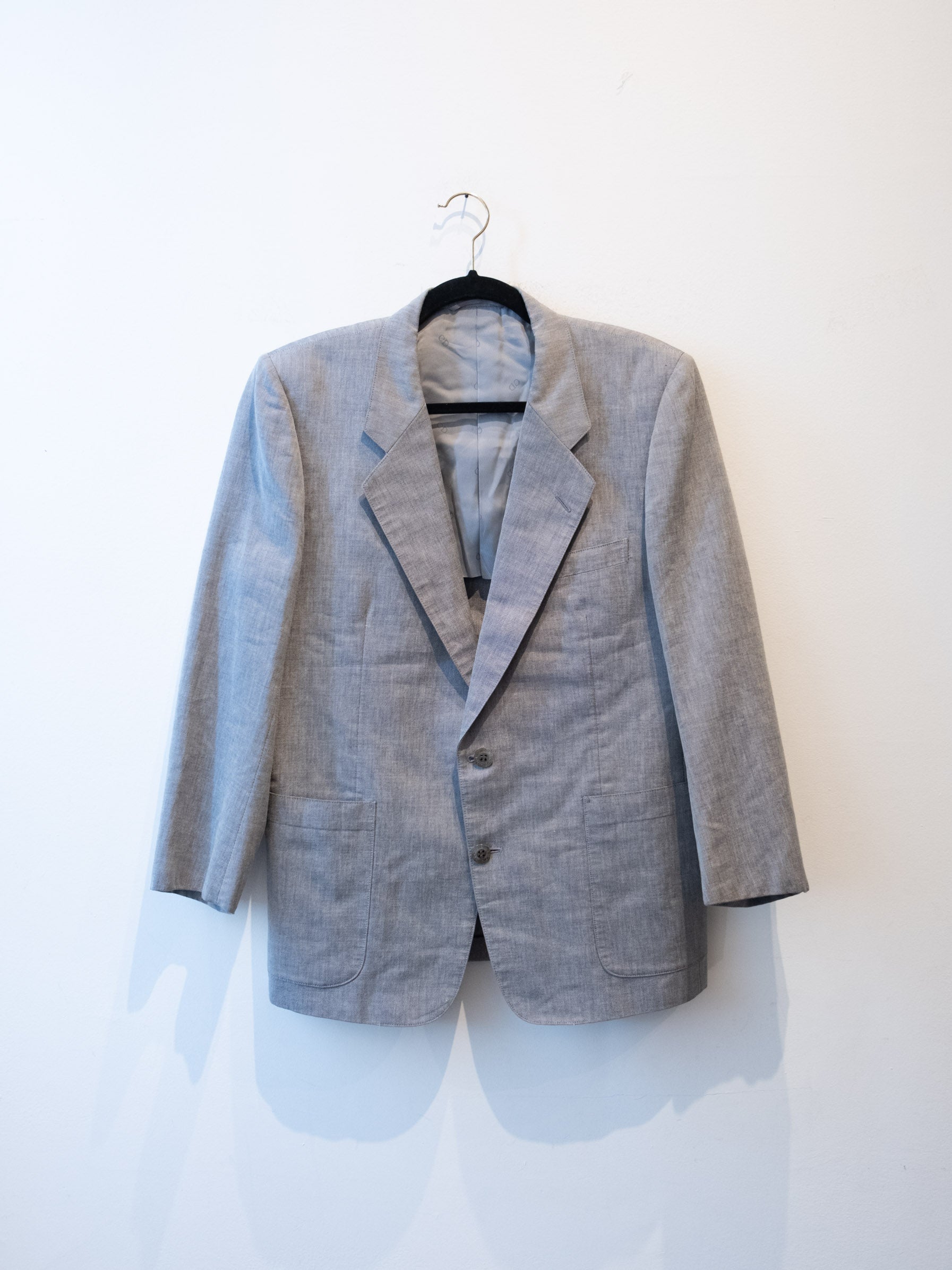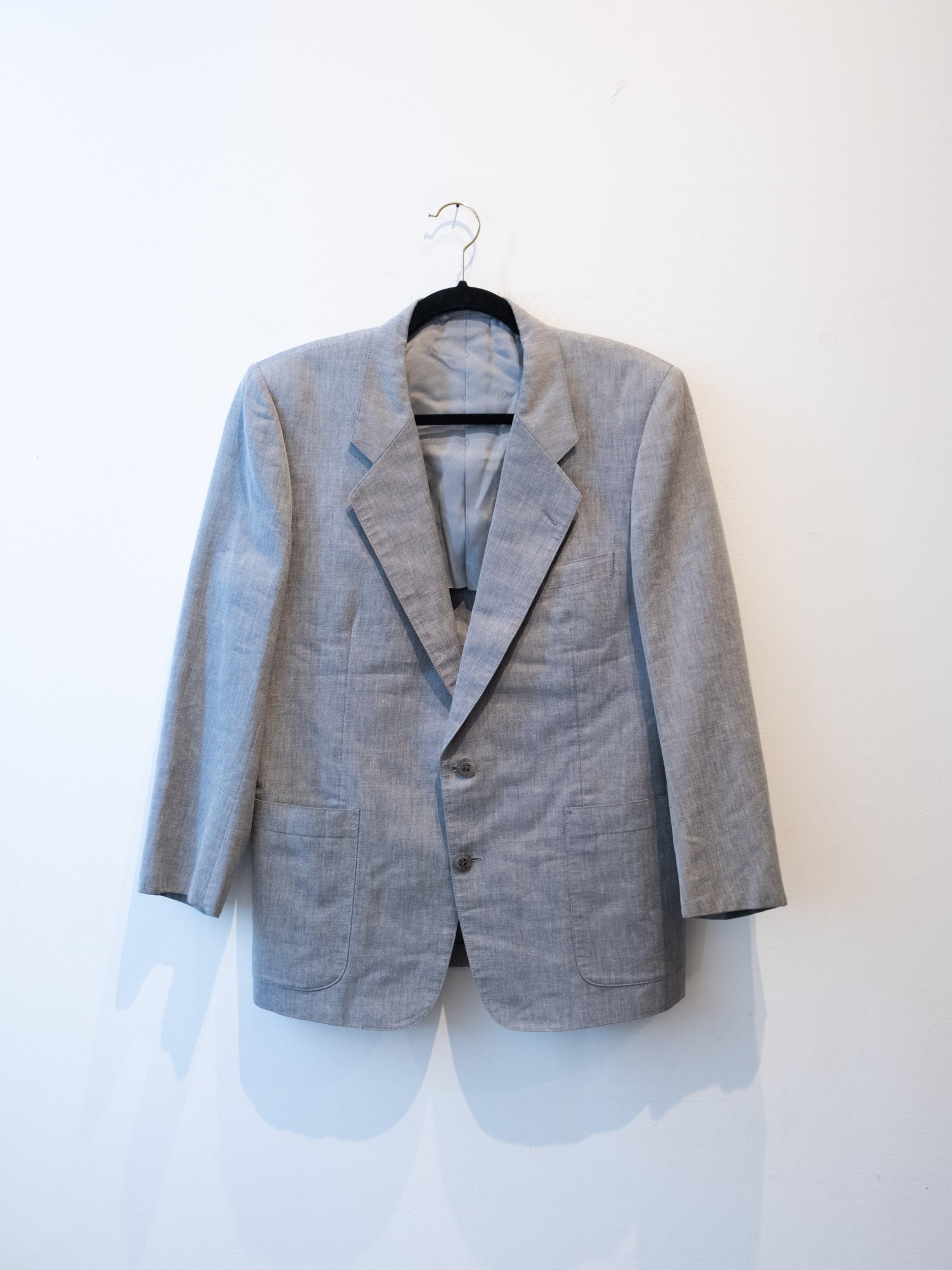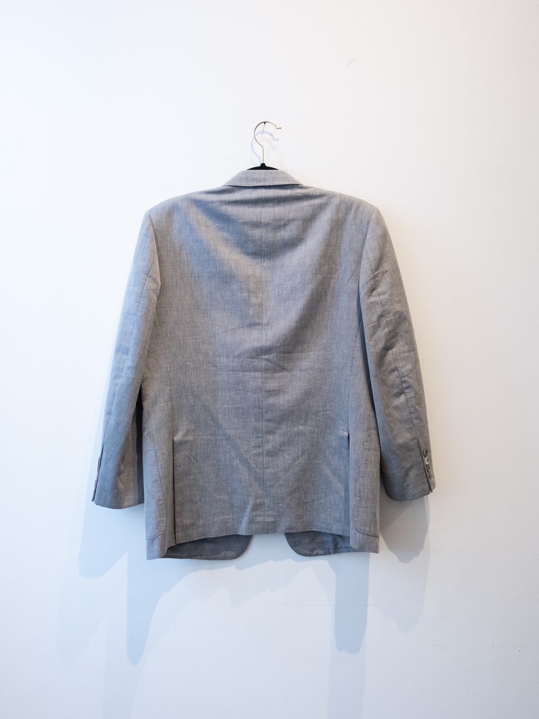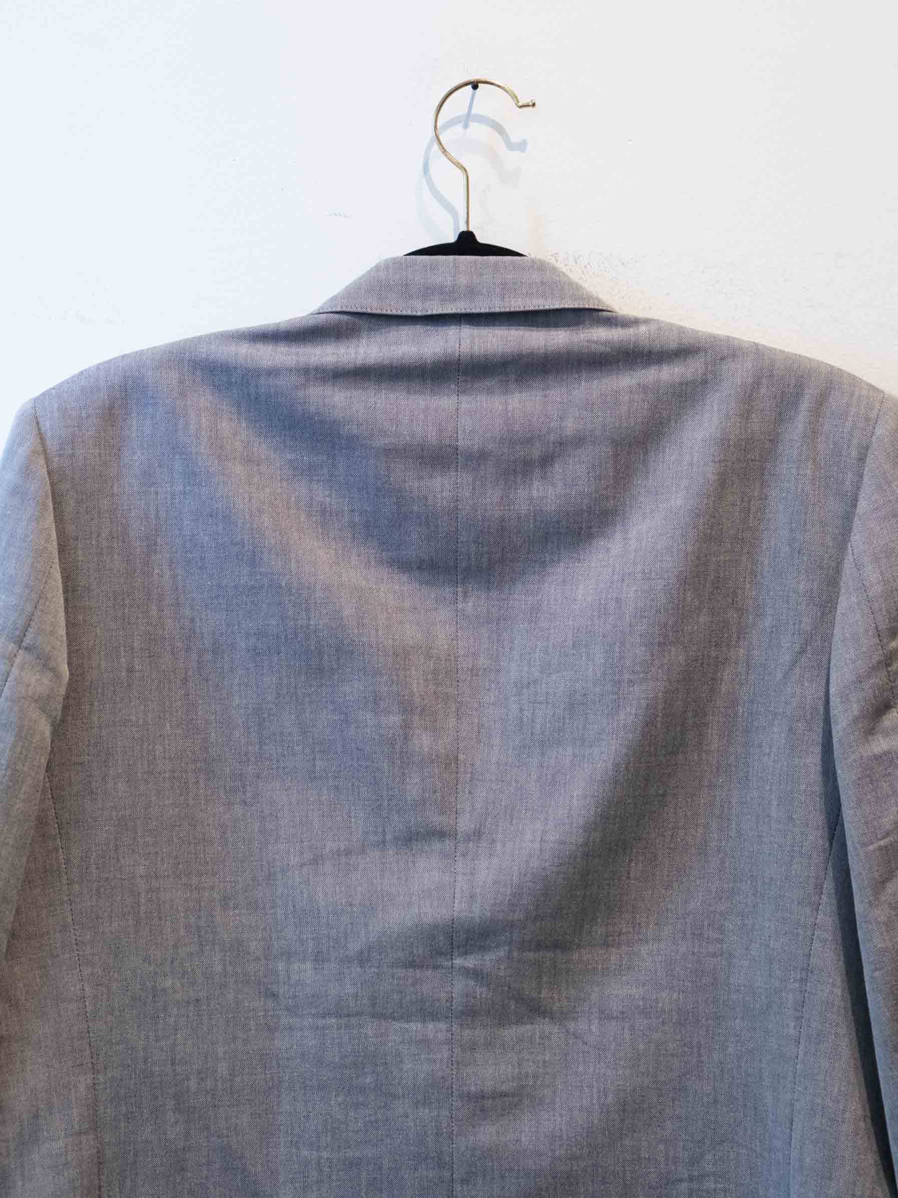 בלייזר מחויט בצבע אפור הנסגר באמצעות כפתורים, בעל כיסים צדדים ללא סגירה.