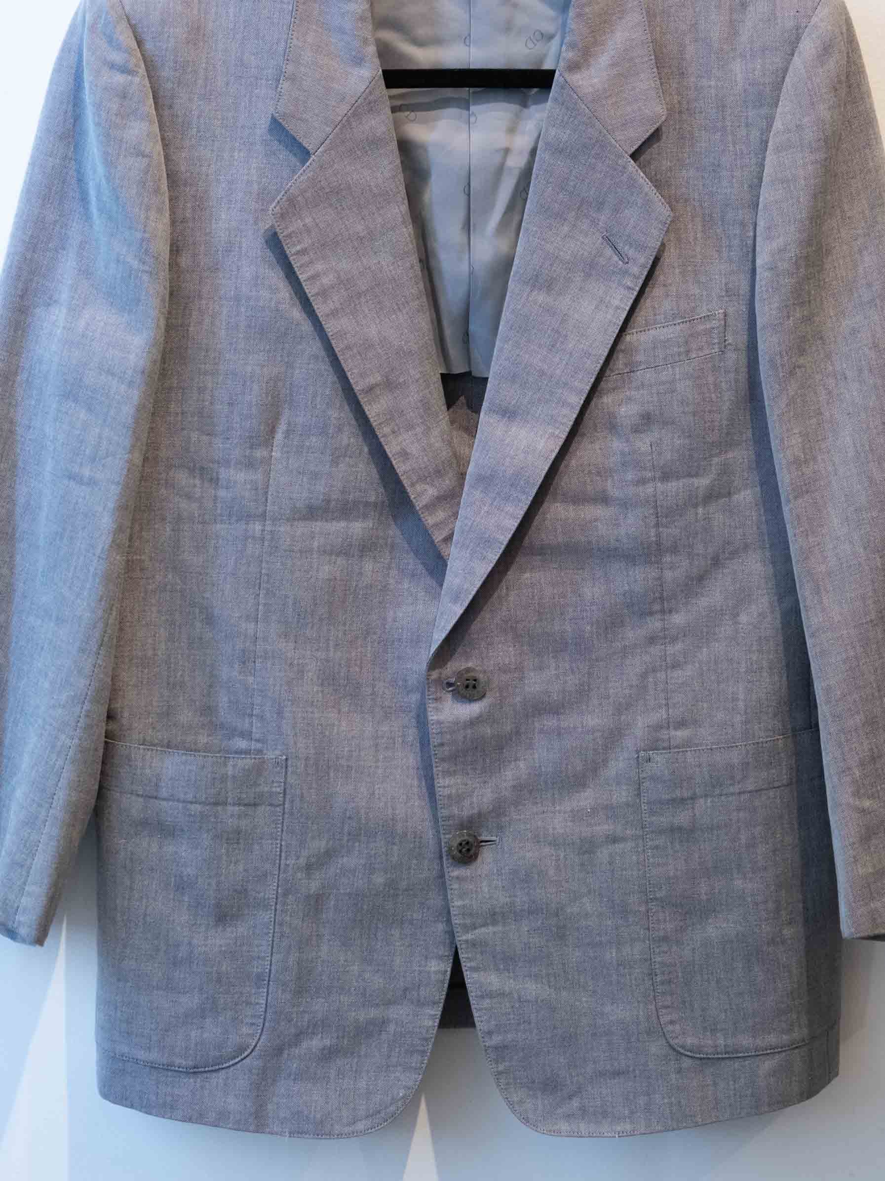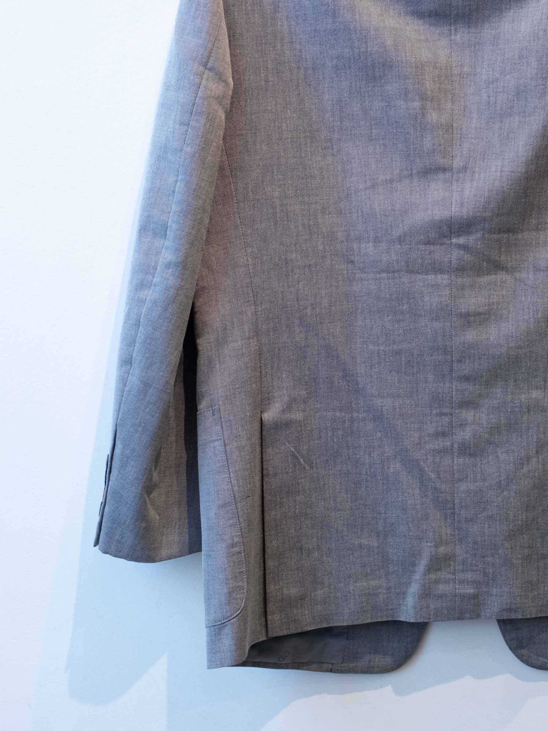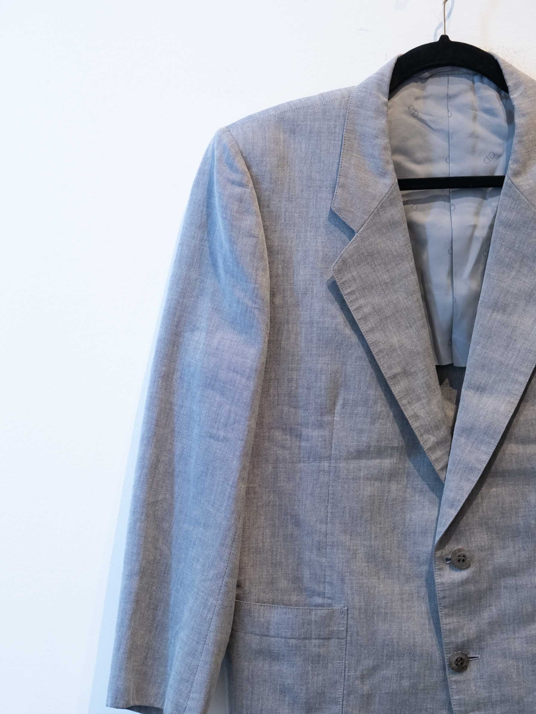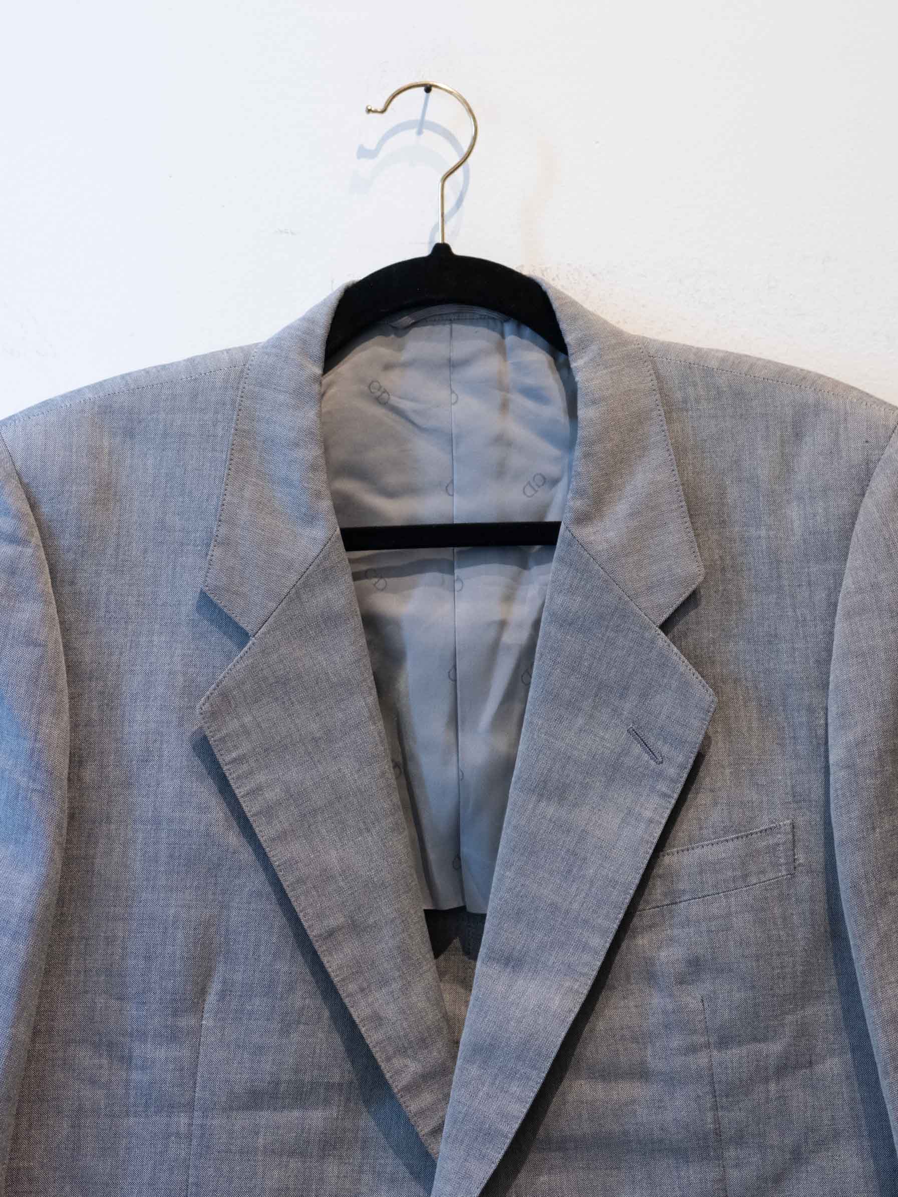 בלייזר מחויט בצבע אפור הנסגר באמצעות כפתורים, בעל כיסים צדדים ללא סגירה.