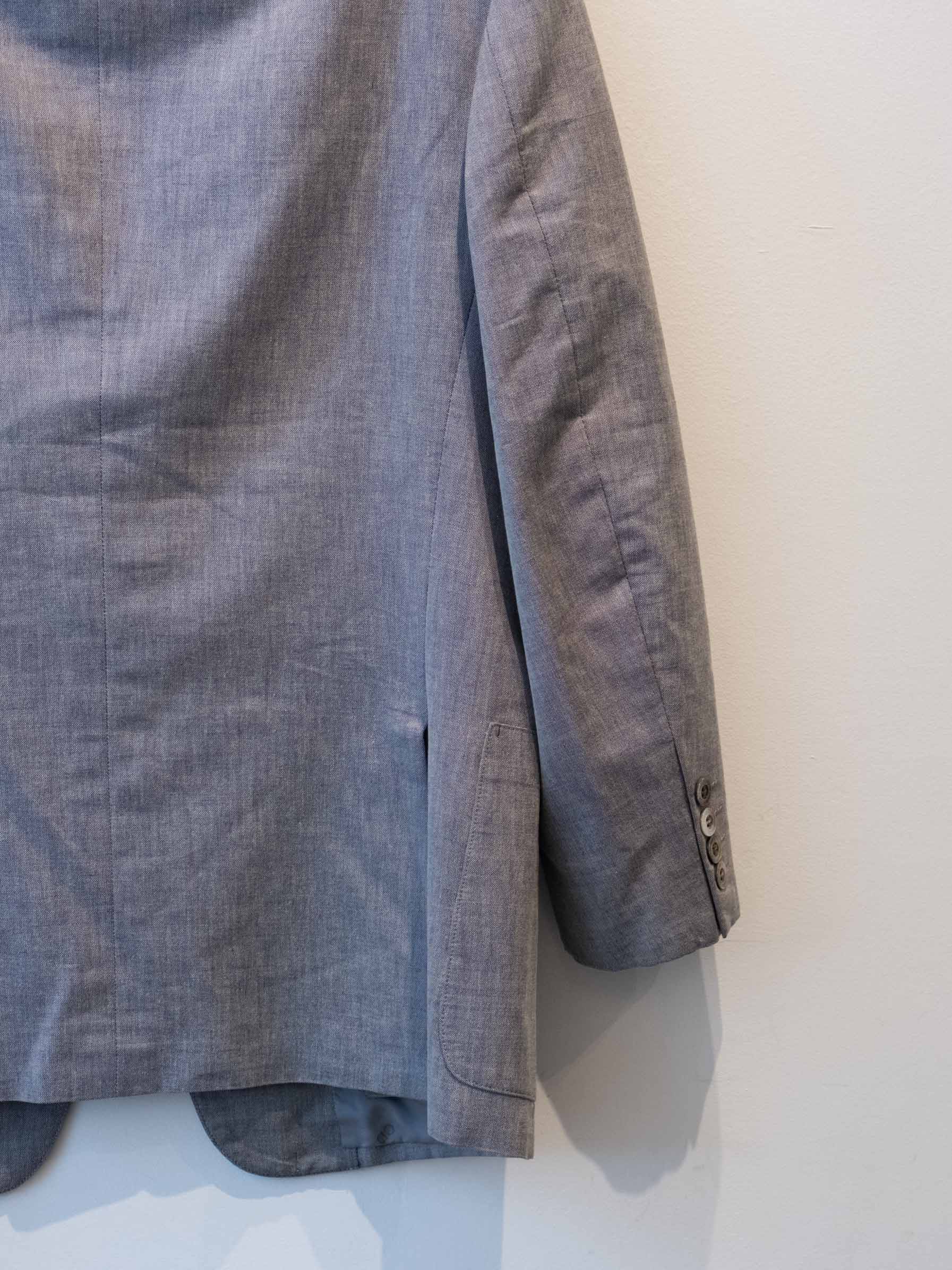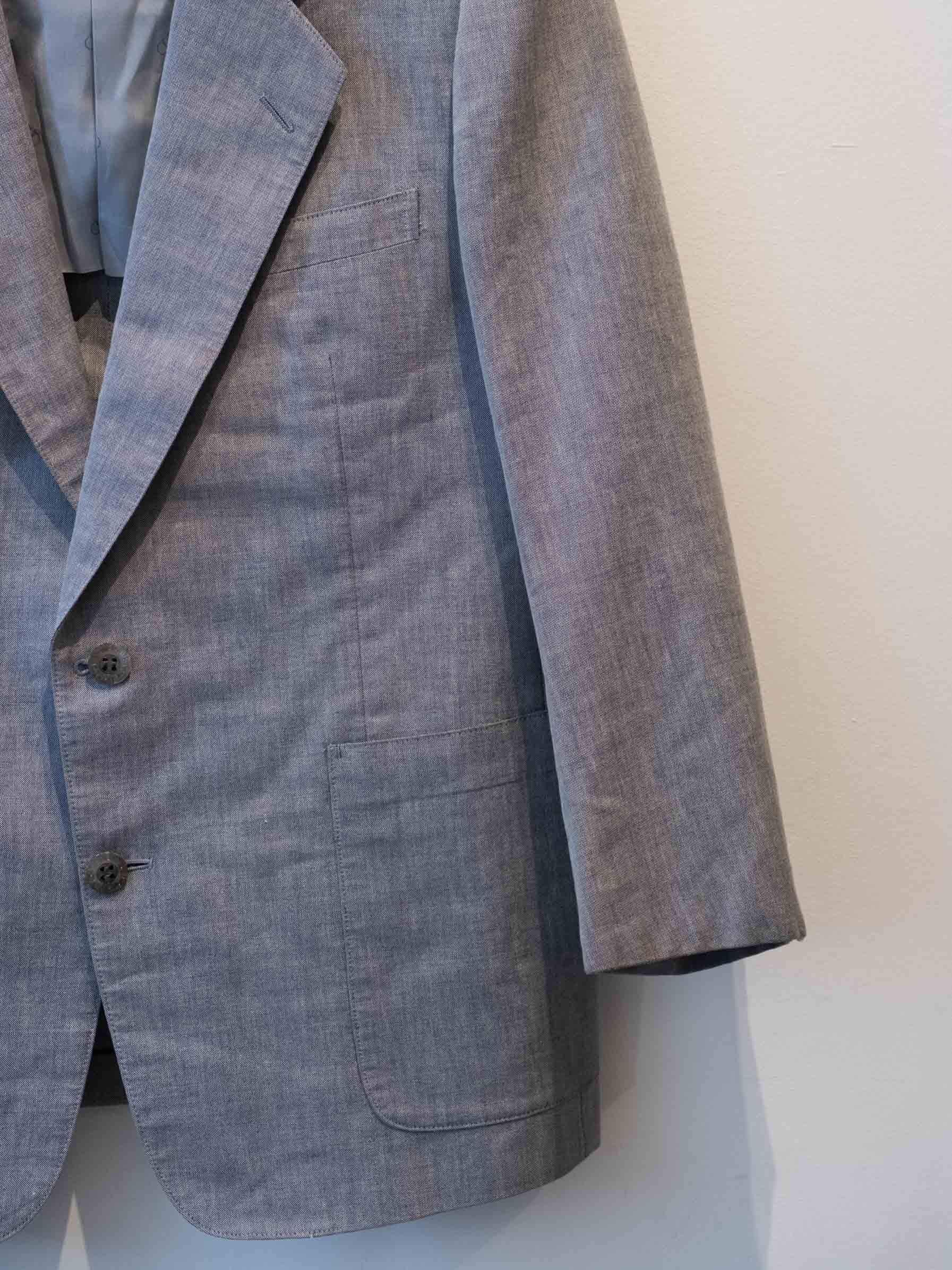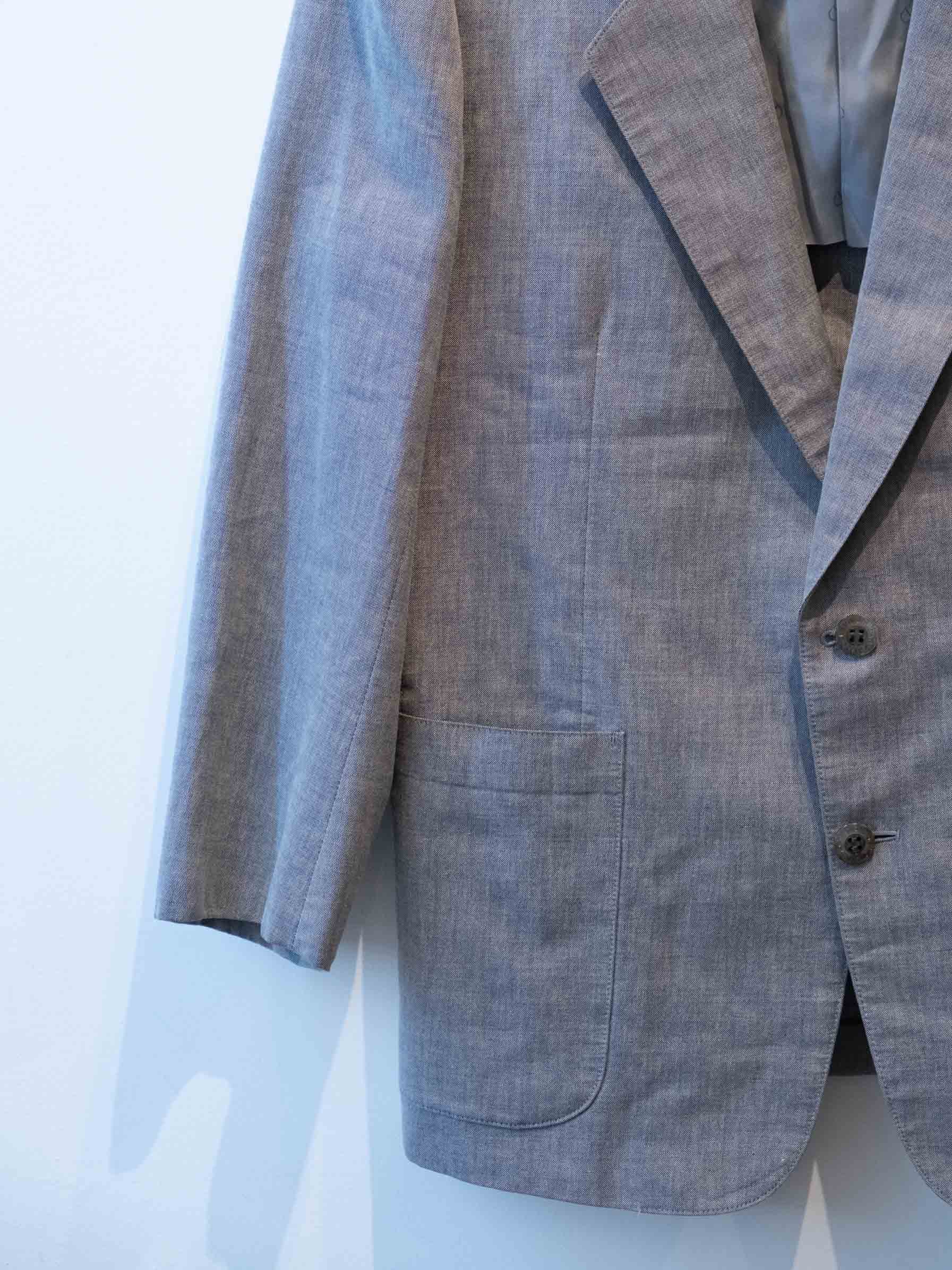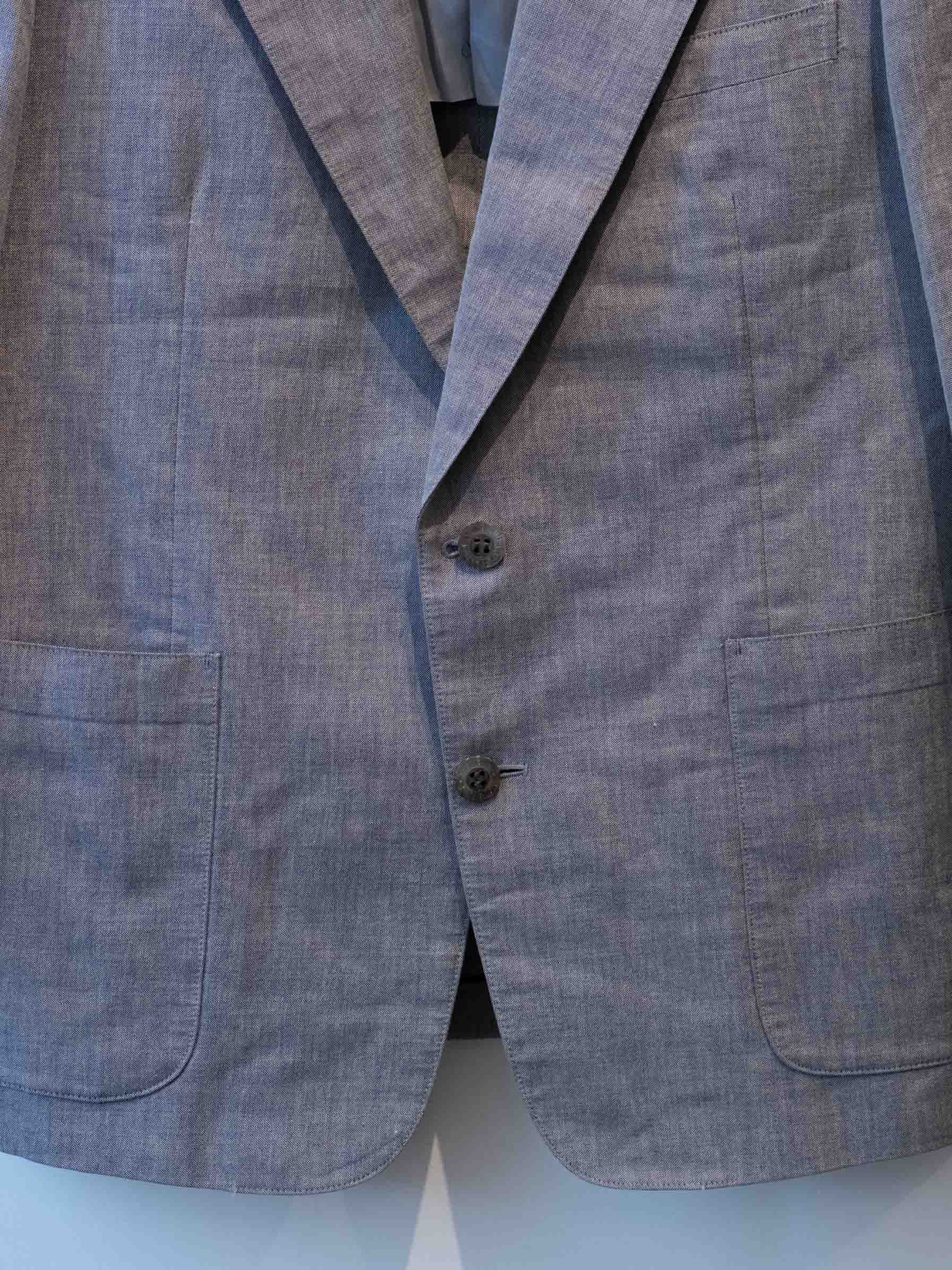 בלייזר מחויט בצבע אפור הנסגר באמצעות כפתורים, בעל כיסים צדדים ללא סגירה.