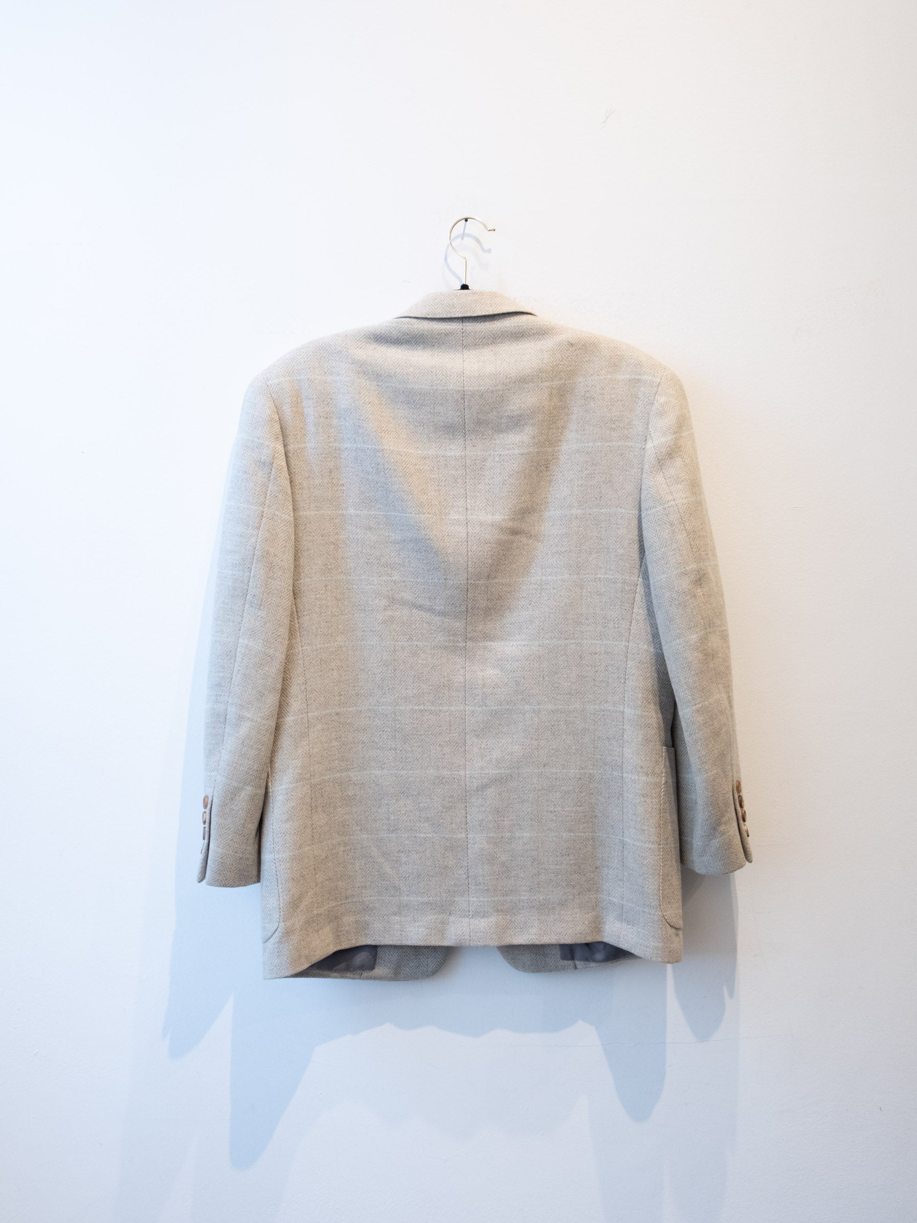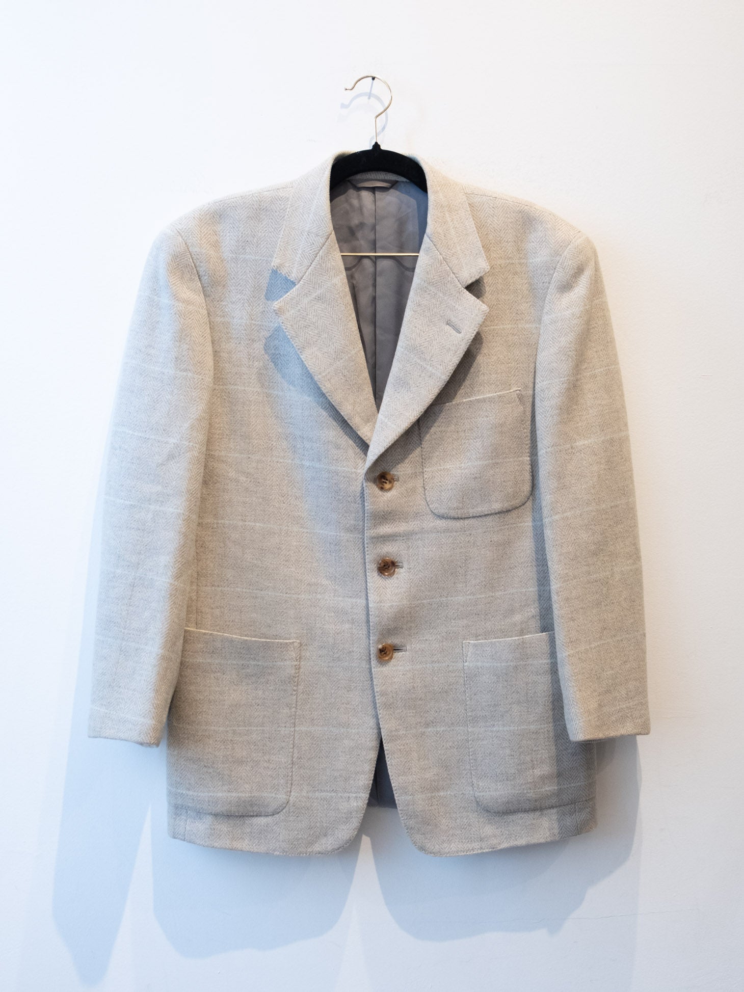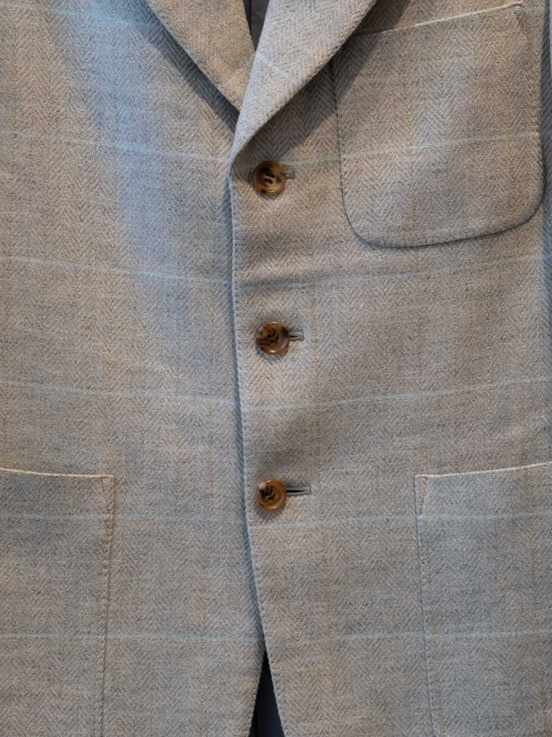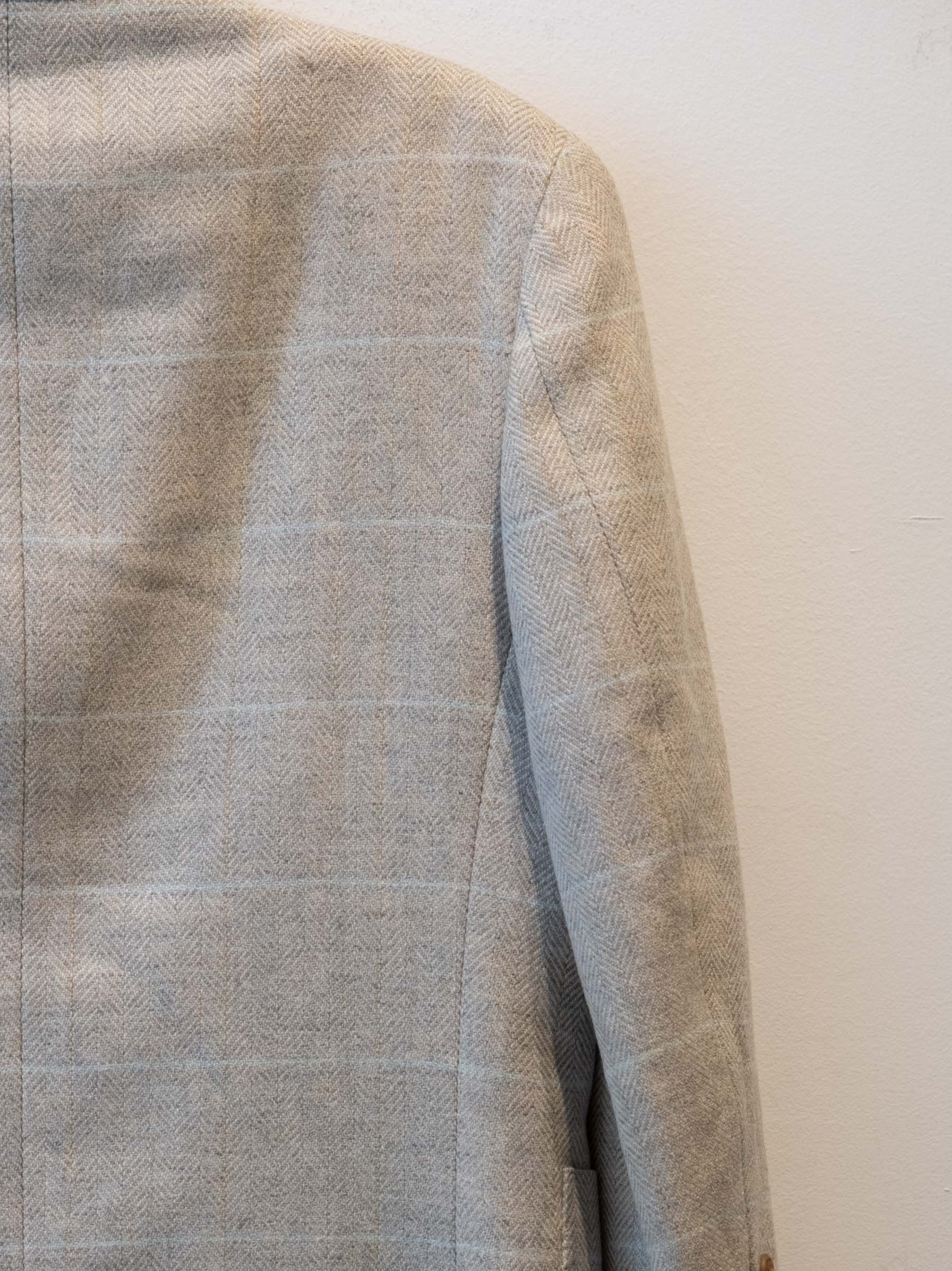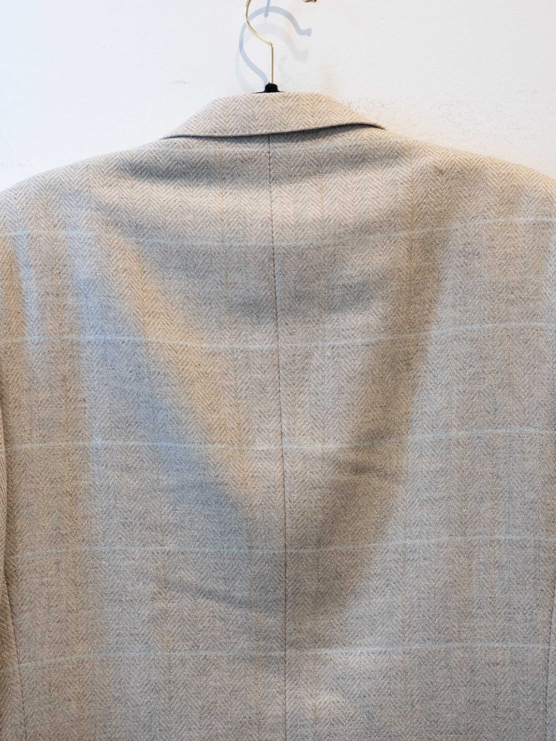 בלייזר מחויט בצבע אפור הנסגר באמצעות כפתורים, בעל כיסים צדדים ללא סגירה.