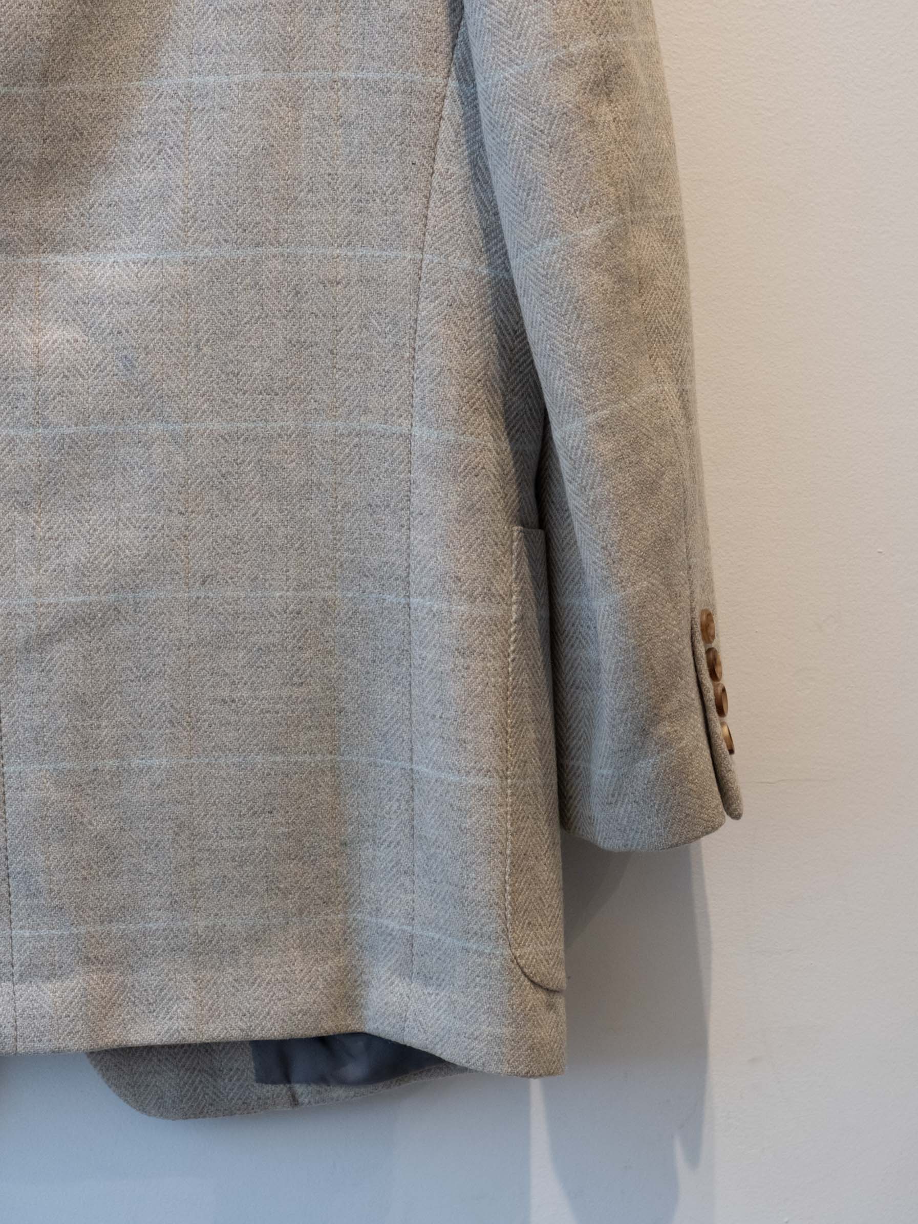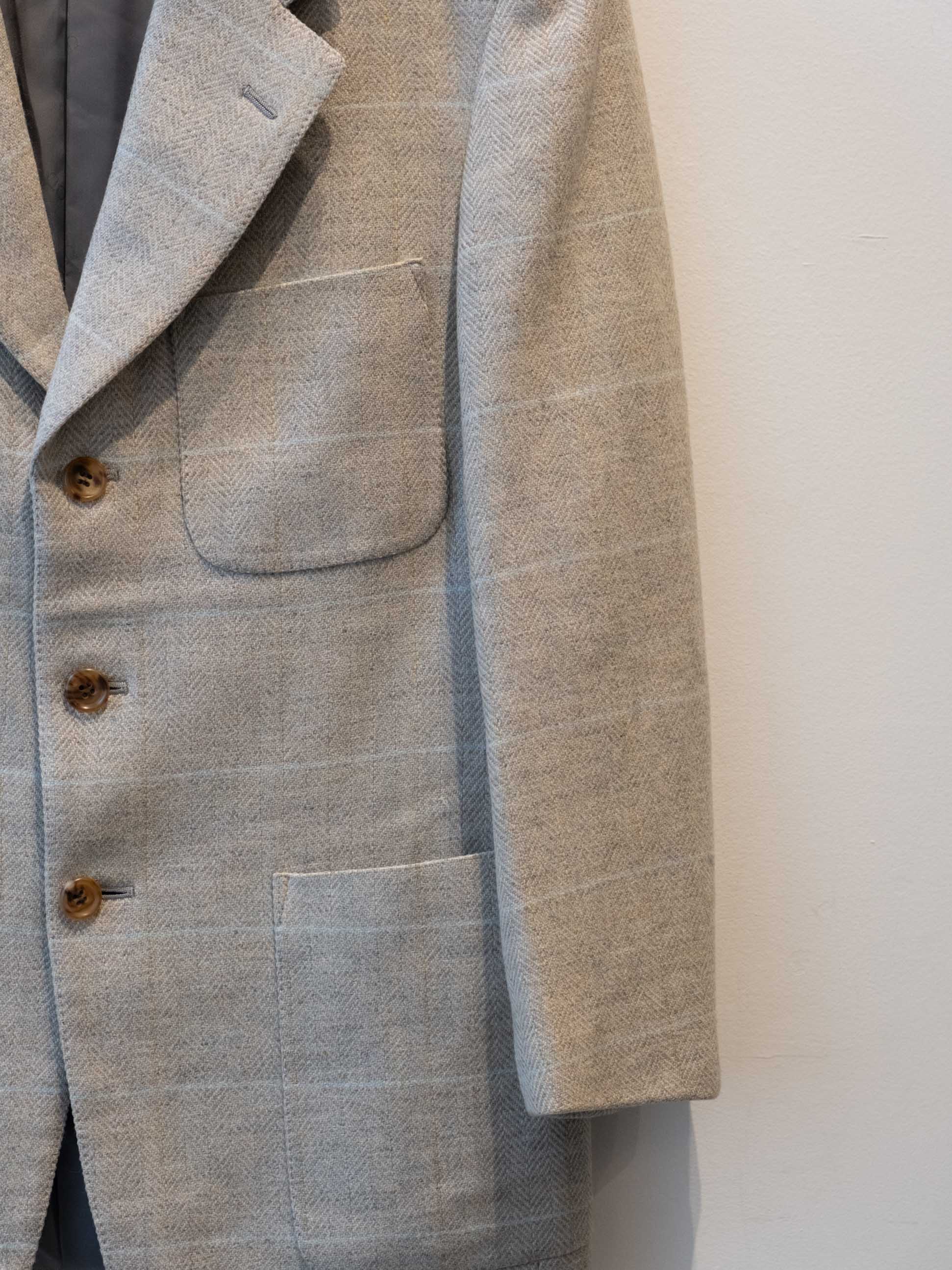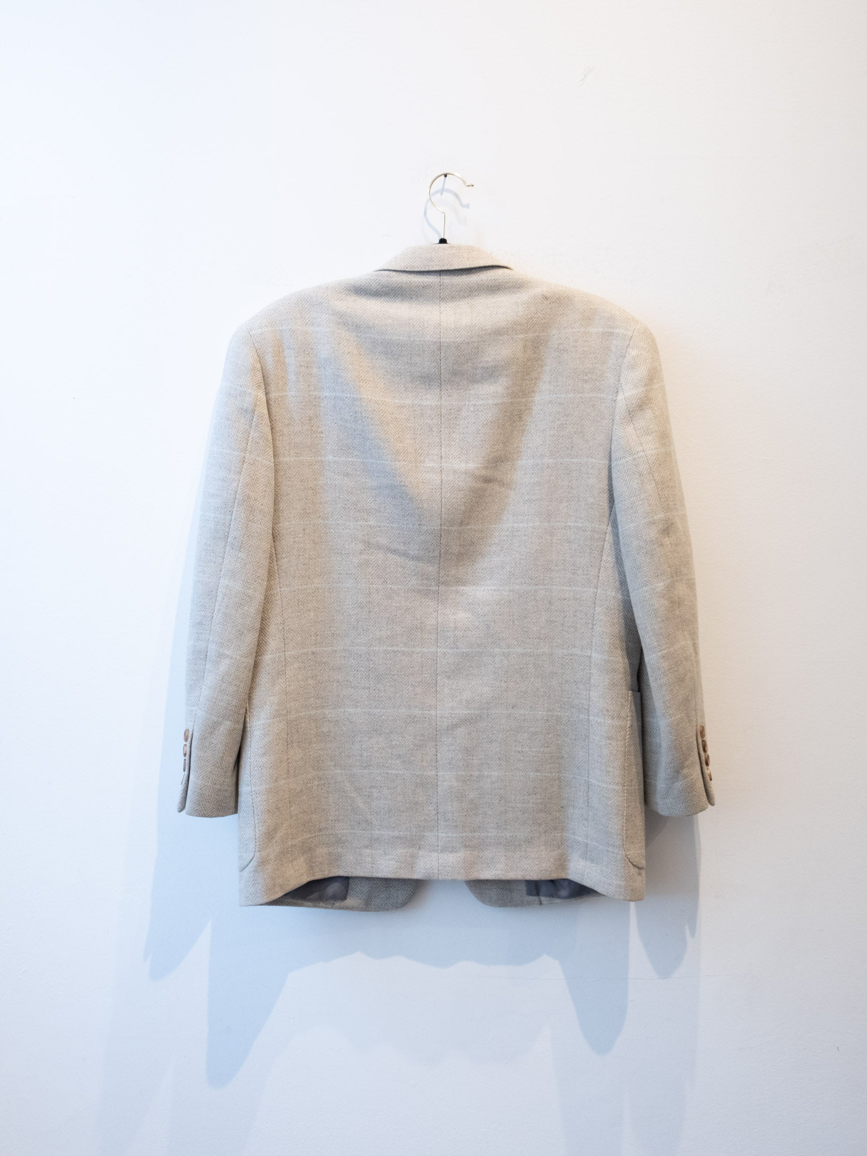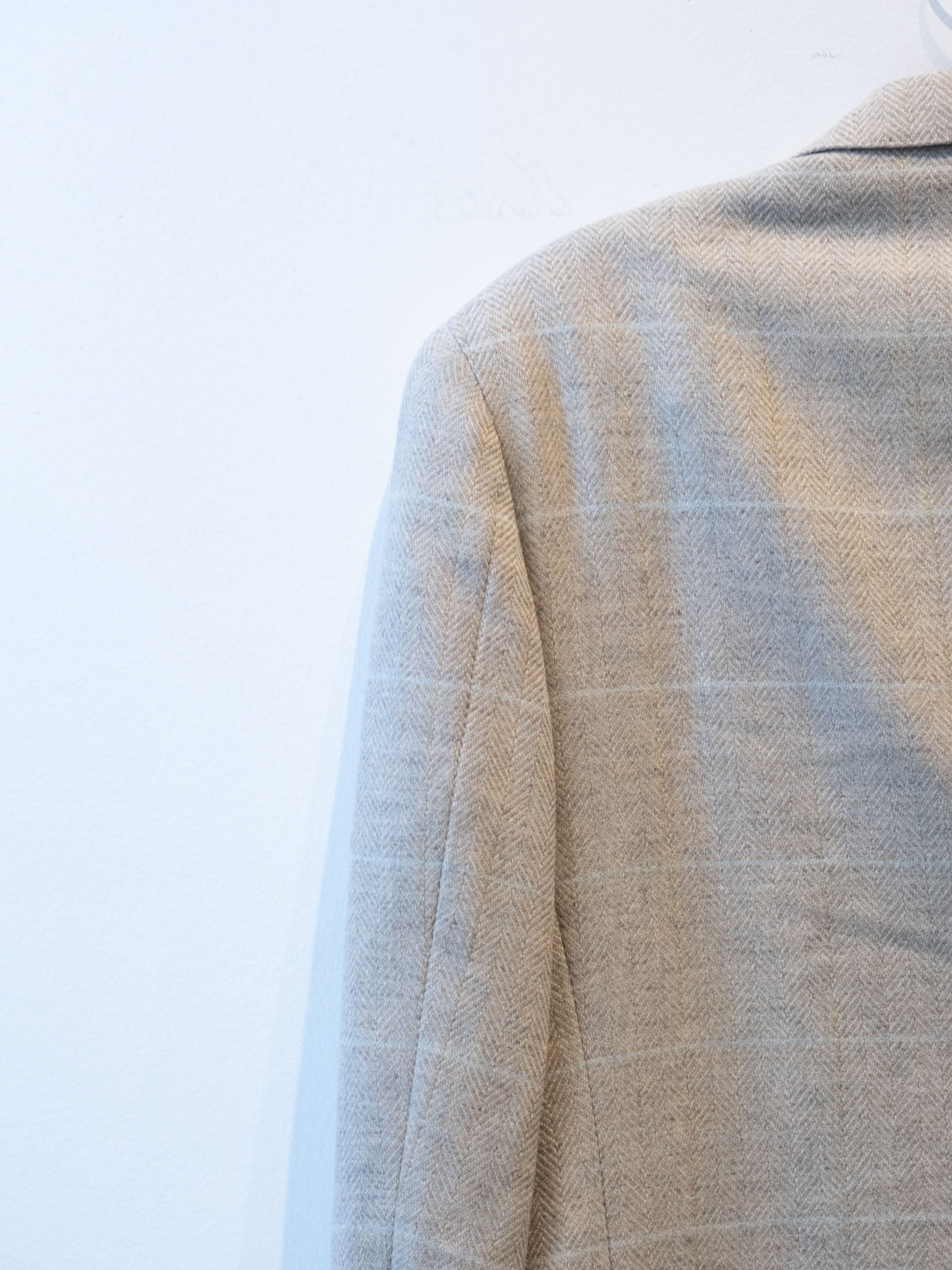 בלייזר מחויט בצבע אפור הנסגר באמצעות כפתורים, בעל כיסים צדדים ללא סגירה.