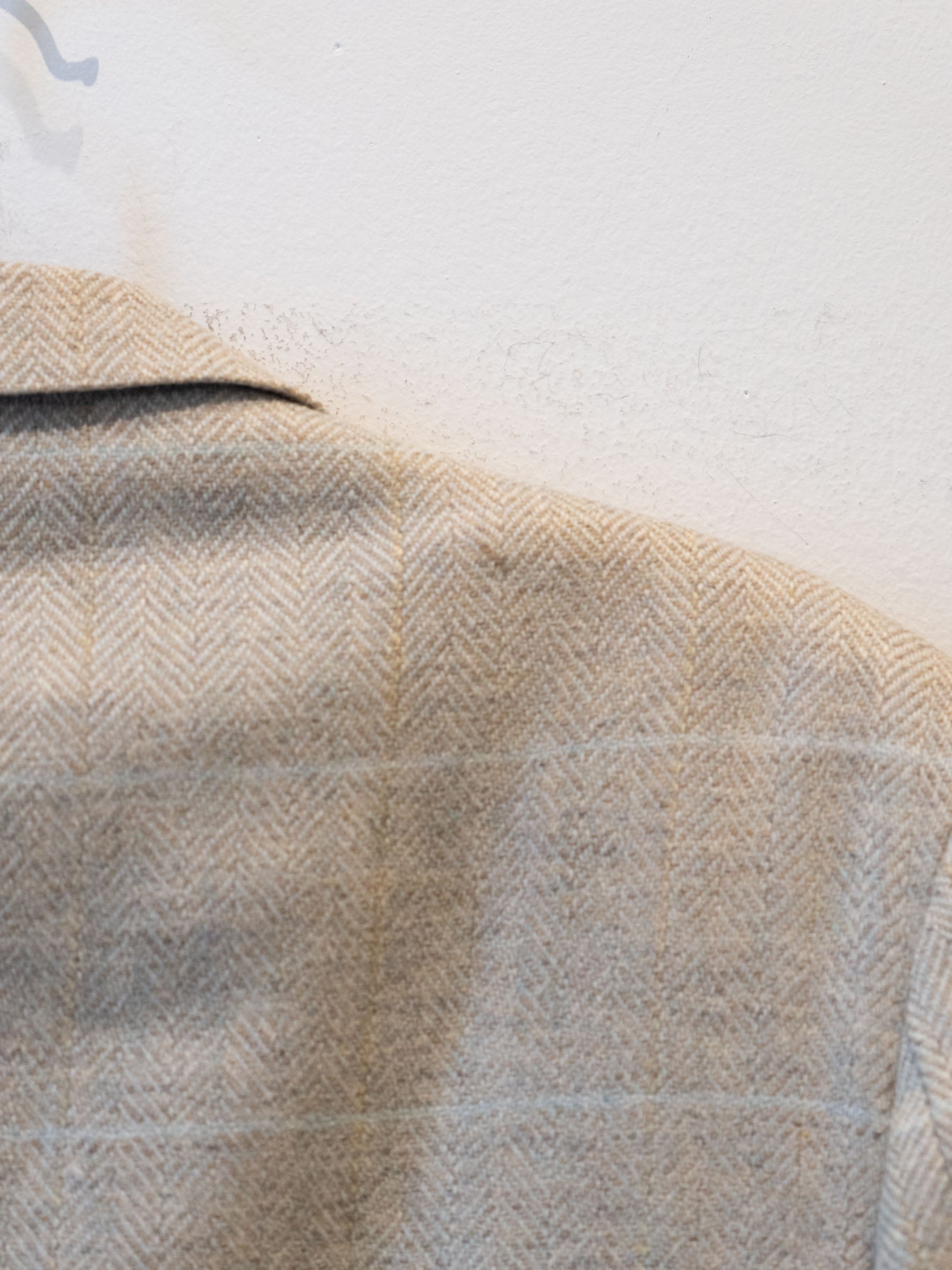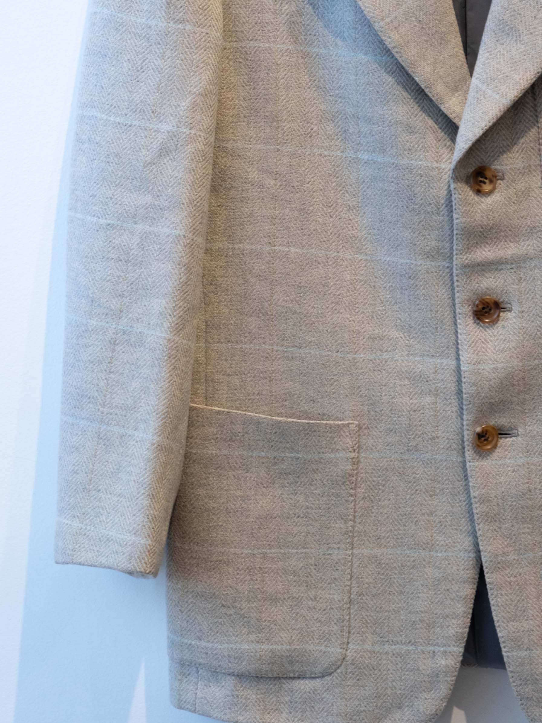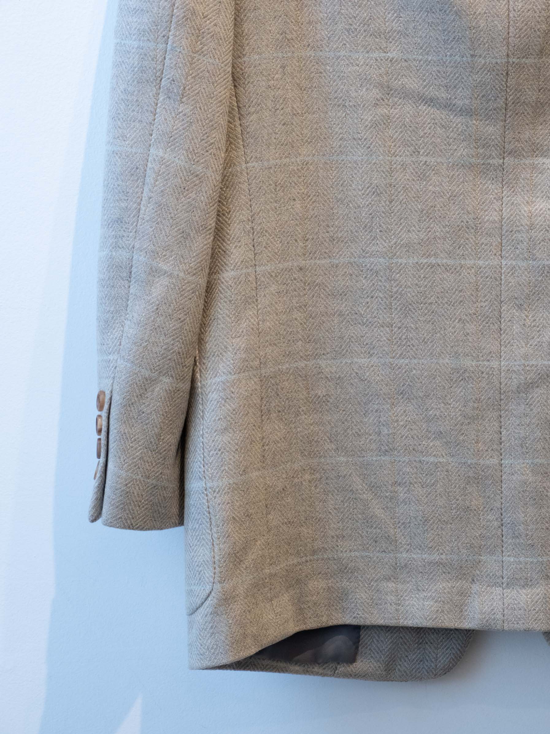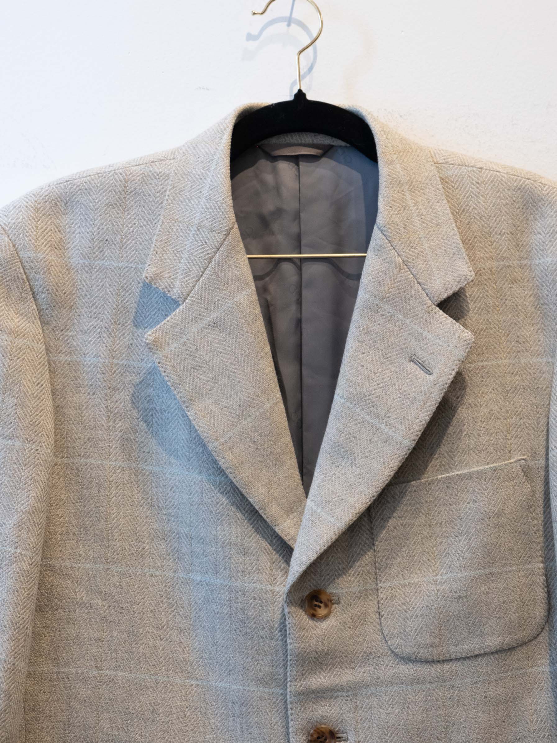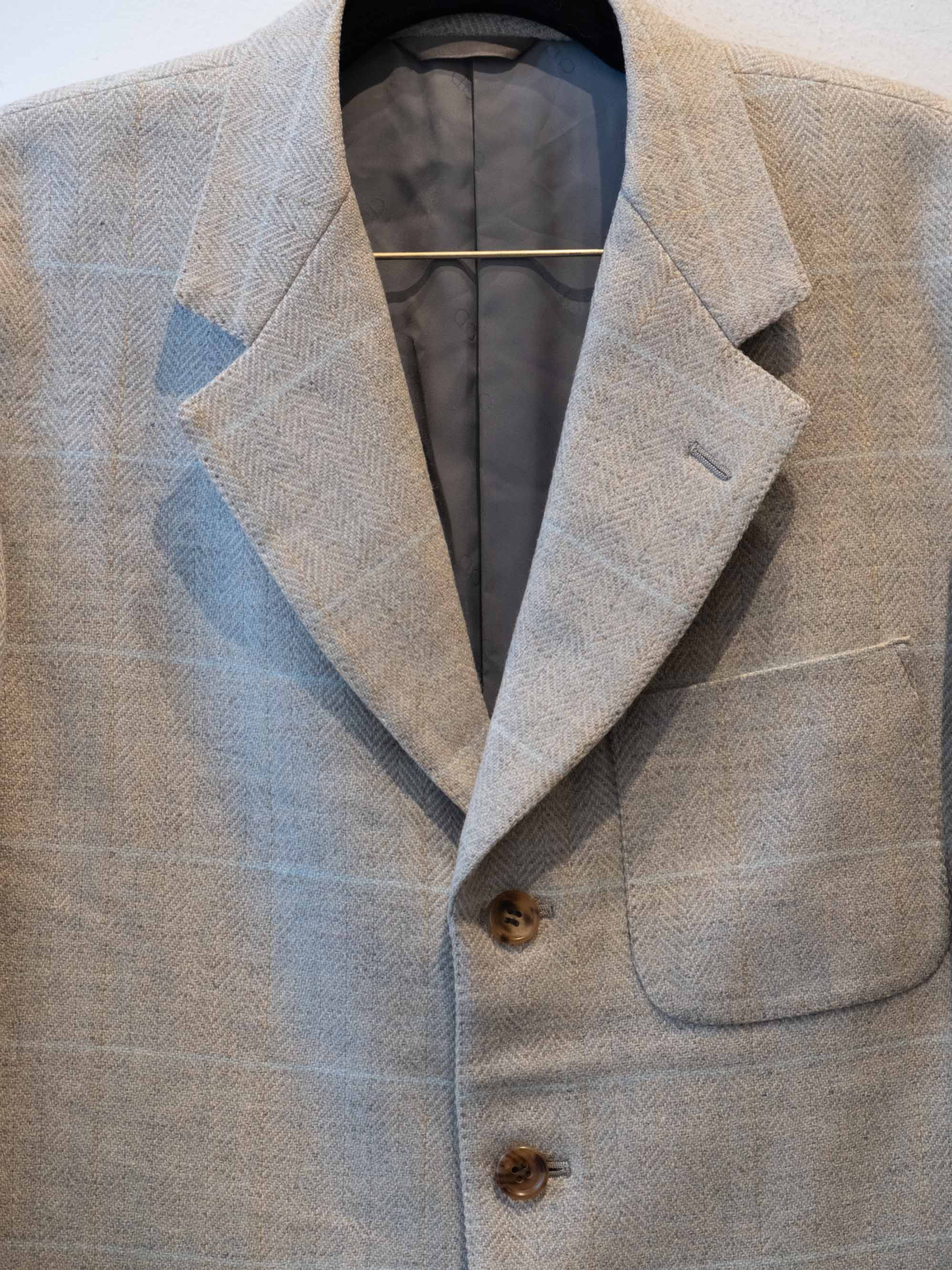 בלייזר מחויט בצבע אפור הנסגר באמצעות כפתורים, בעל כיסים צדדים ללא סגירה.