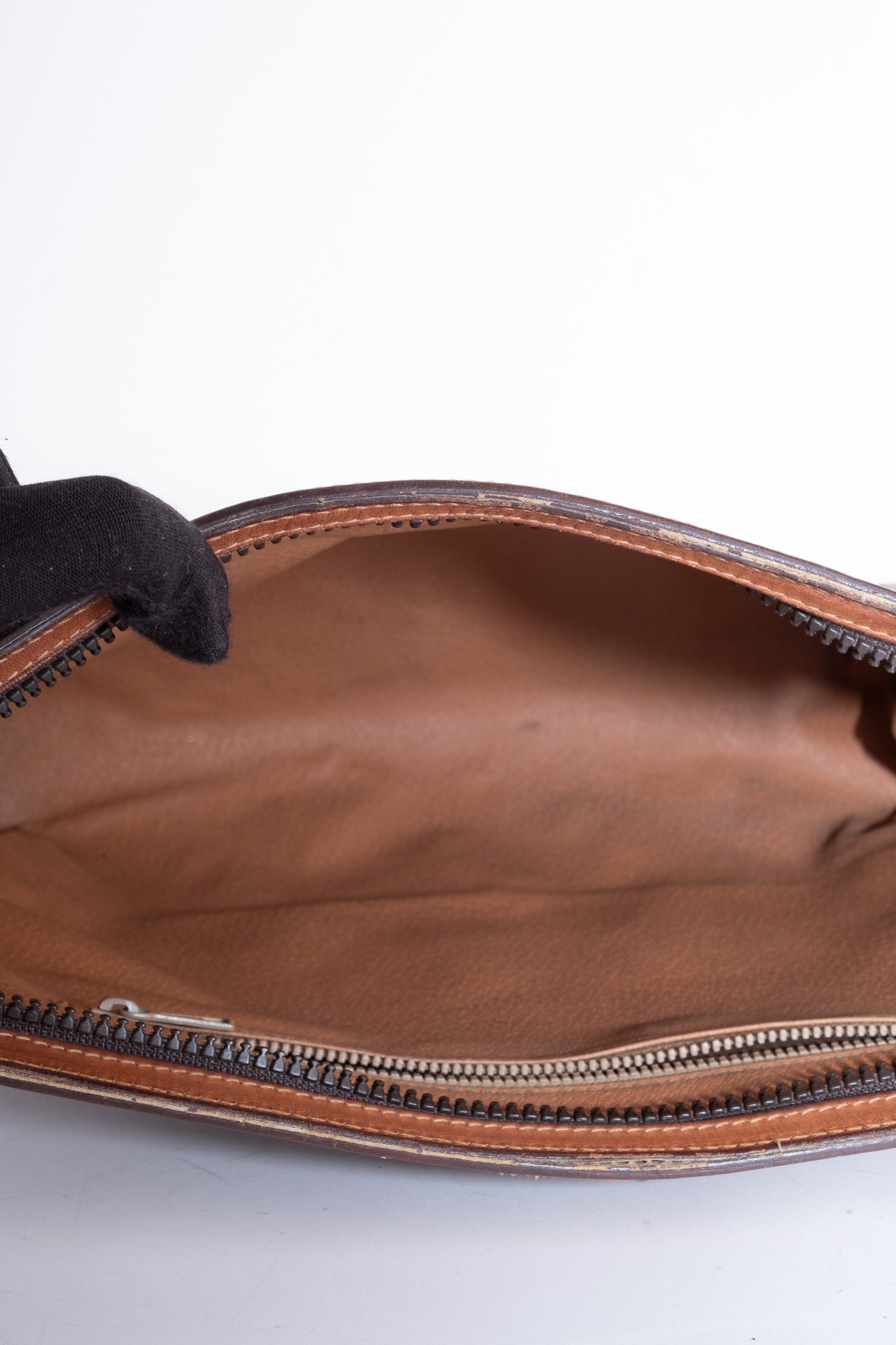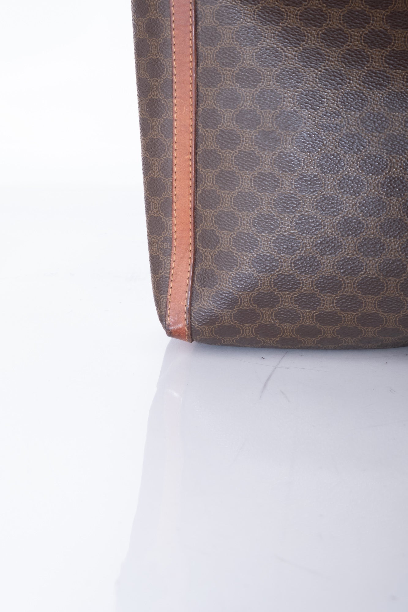 הקלאץ׳ עשוי קנבס מצופה עם דוגמת המאקאדם הקלאסית, שולי עור חום, סגירת רוכסן עליונה, ותא פנימי מרופד.