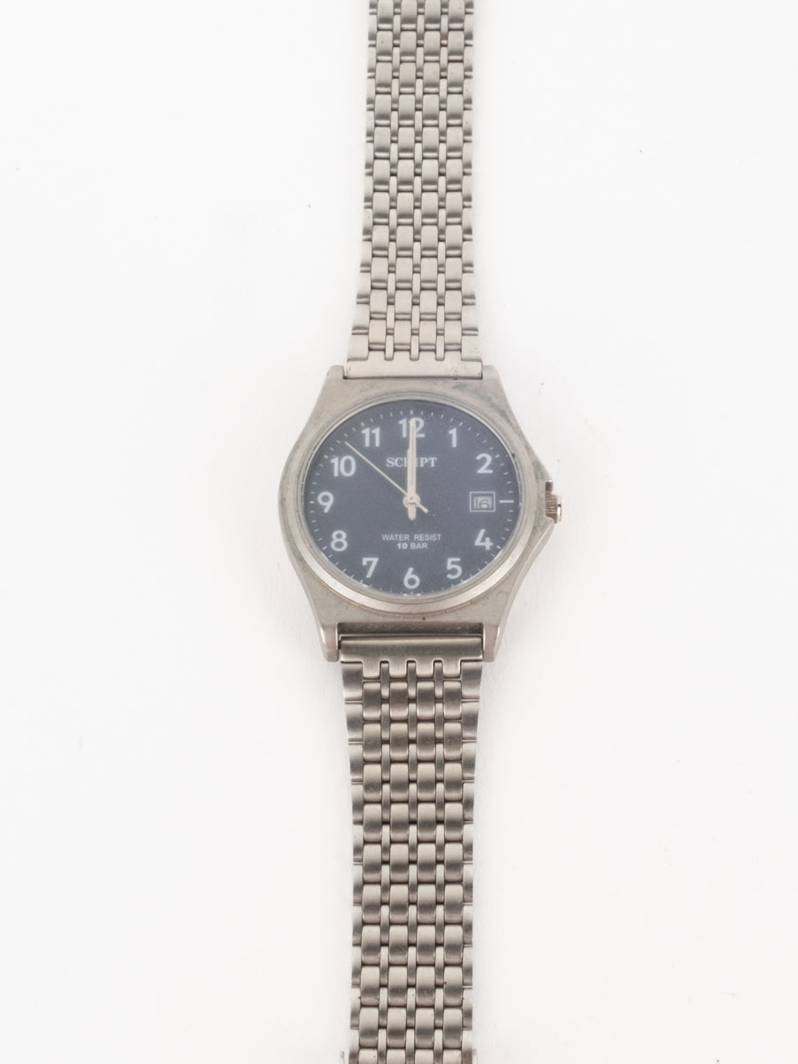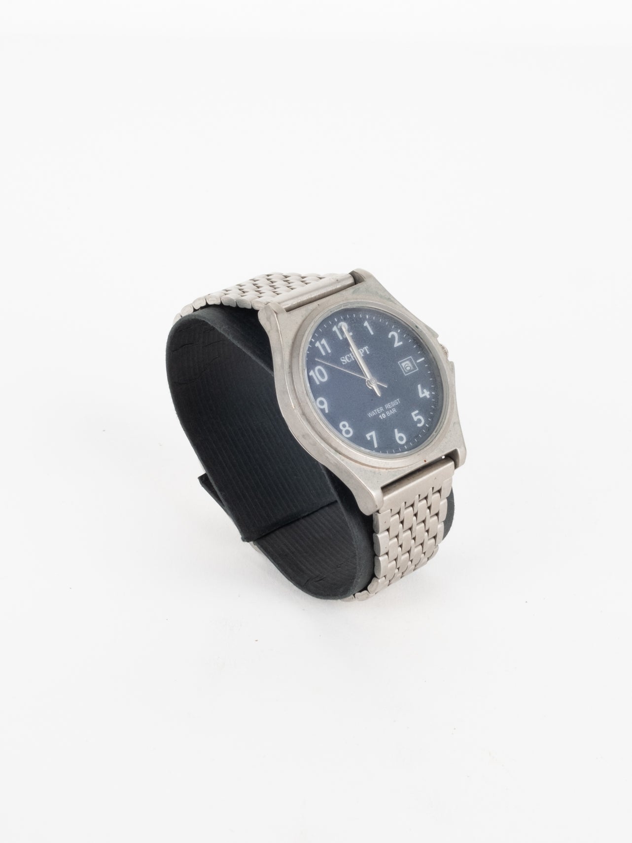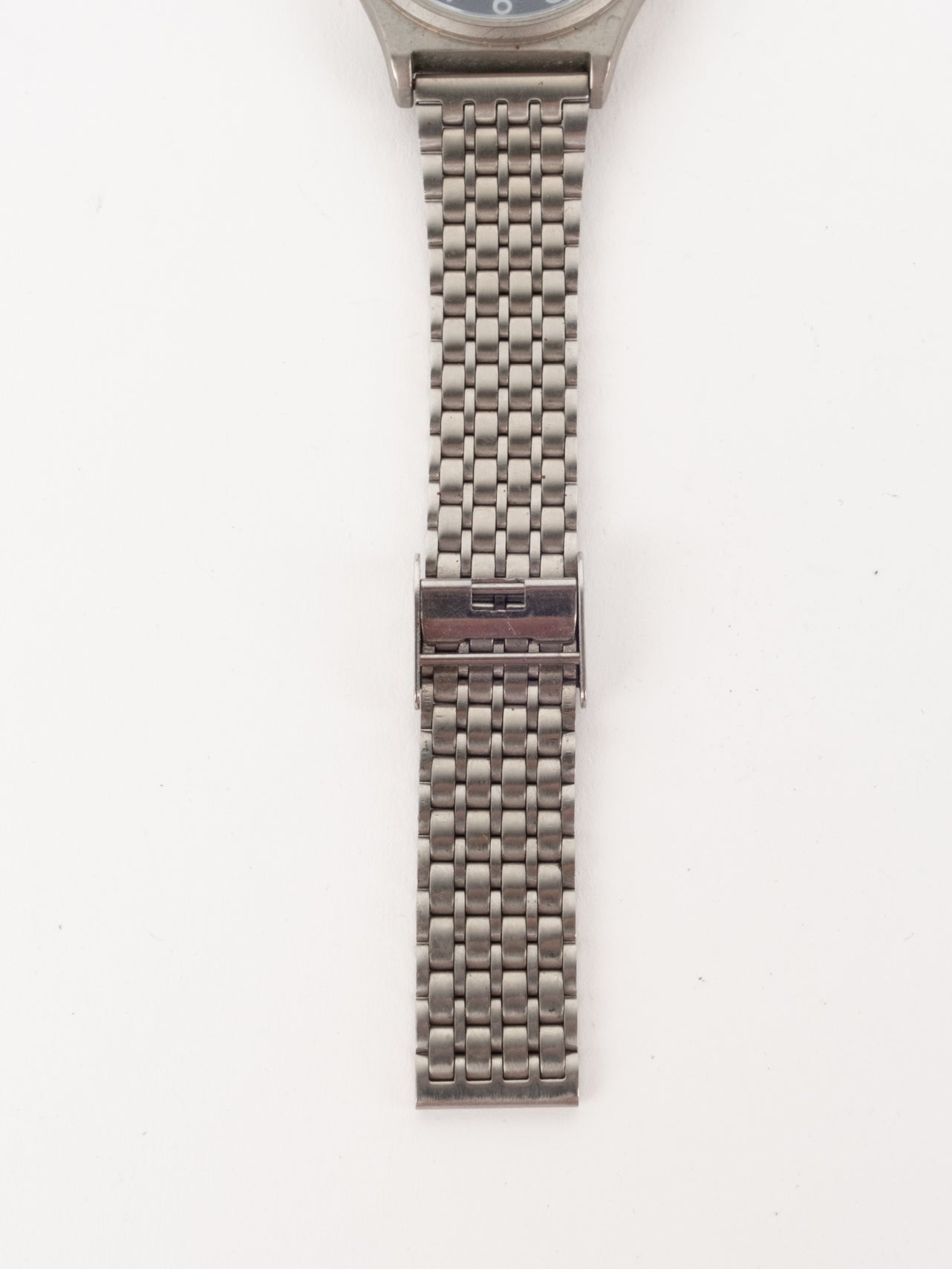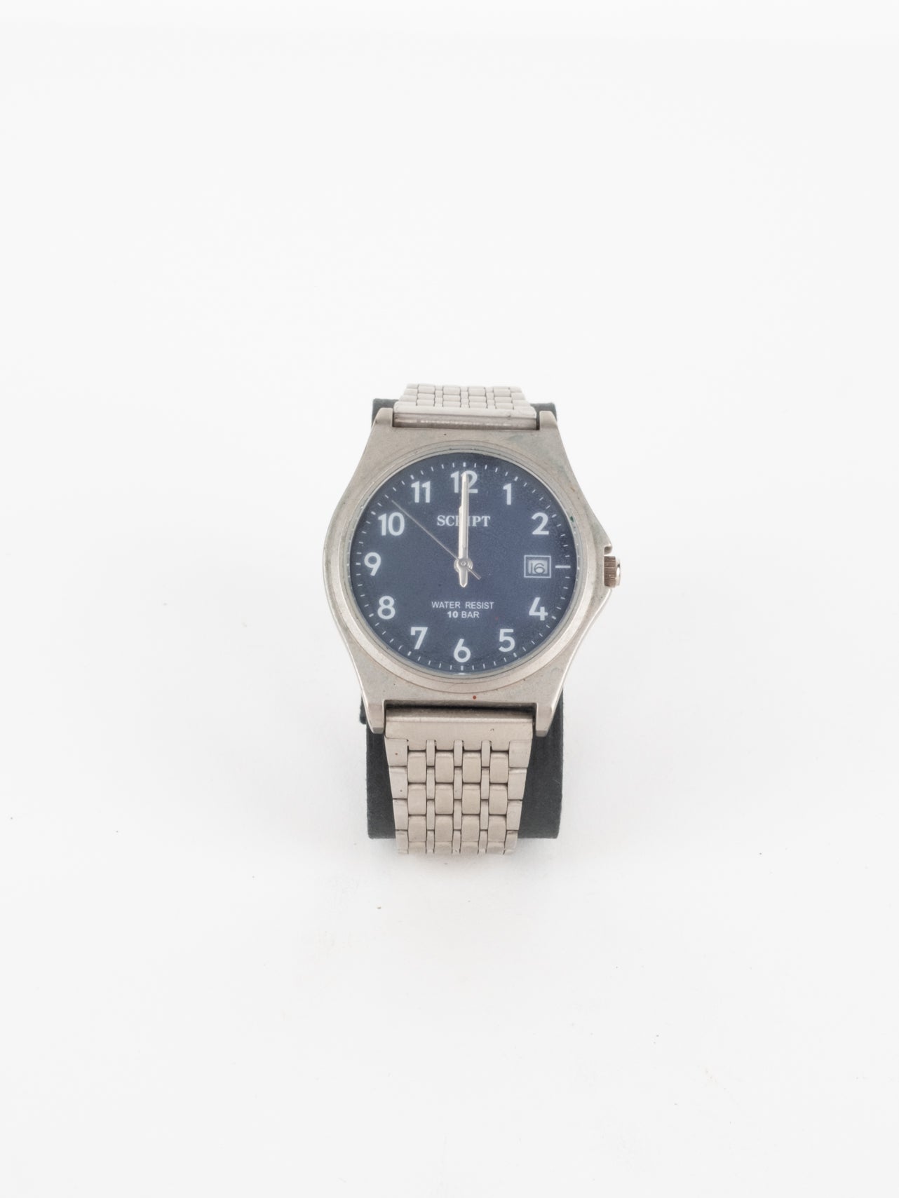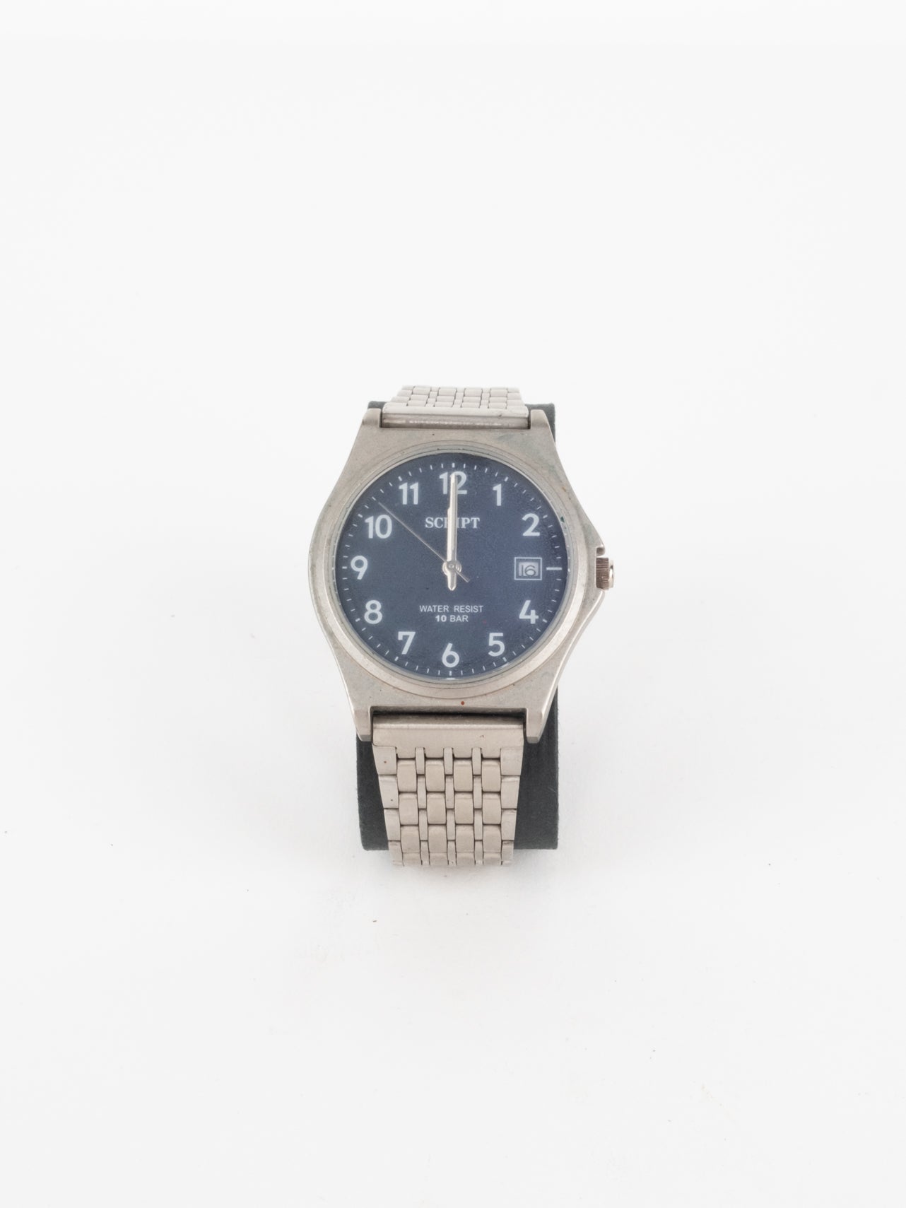שעון מסיבי בסגנון ספורטיבי בצבע כסוף בעל פני שעון בצורה עגולה עם רקע בצבע כחול כהה ומחוגים. השעון נסגר באמצעות סוגר ממותג.