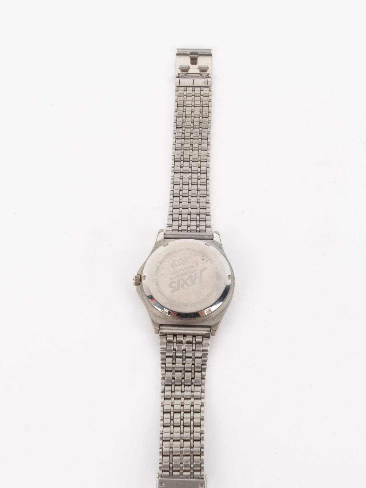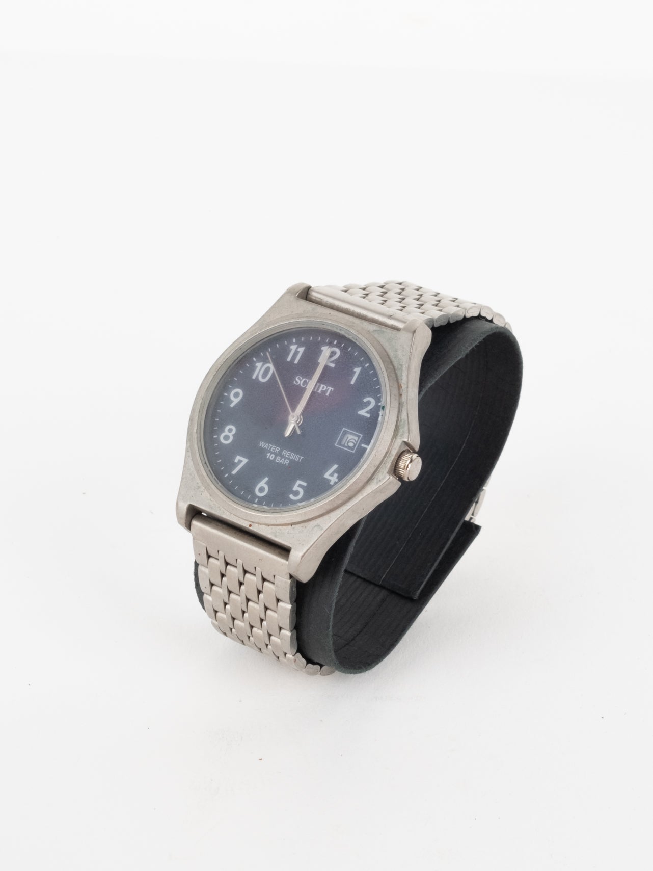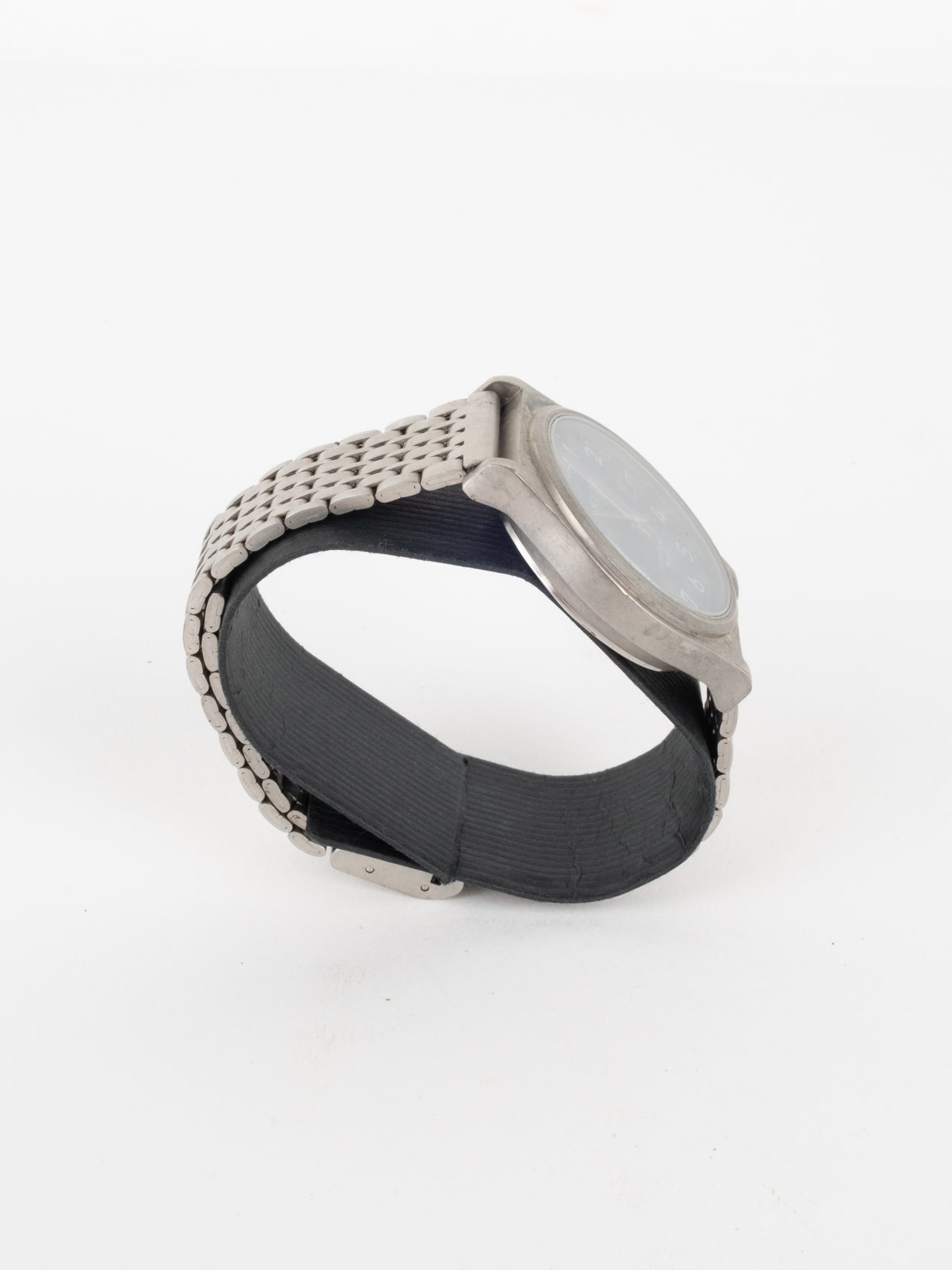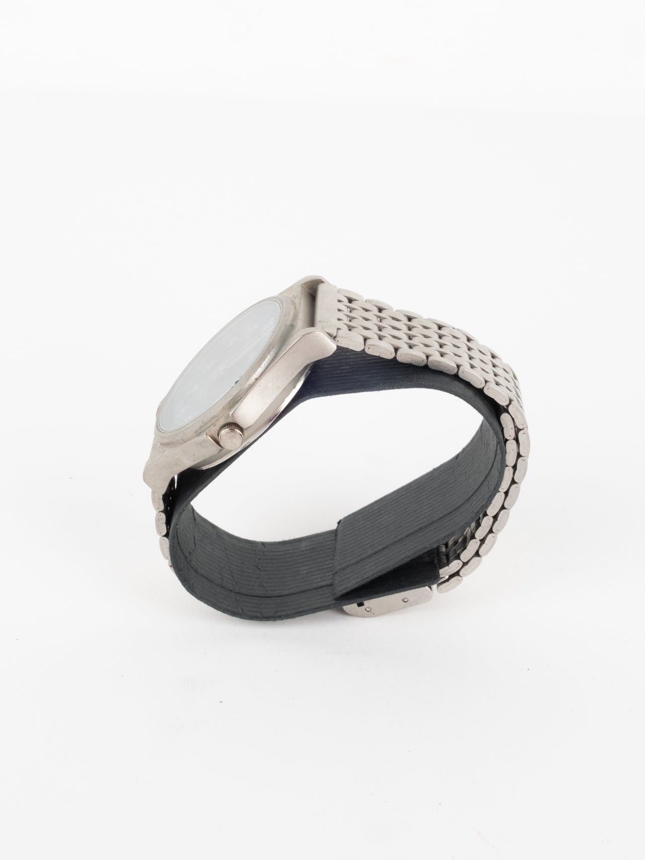 שעון מסיבי בסגנון ספורטיבי בצבע כסוף בעל פני שעון בצורה עגולה עם רקע בצבע כחול כהה ומחוגים. השעון נסגר באמצעות סוגר ממותג.