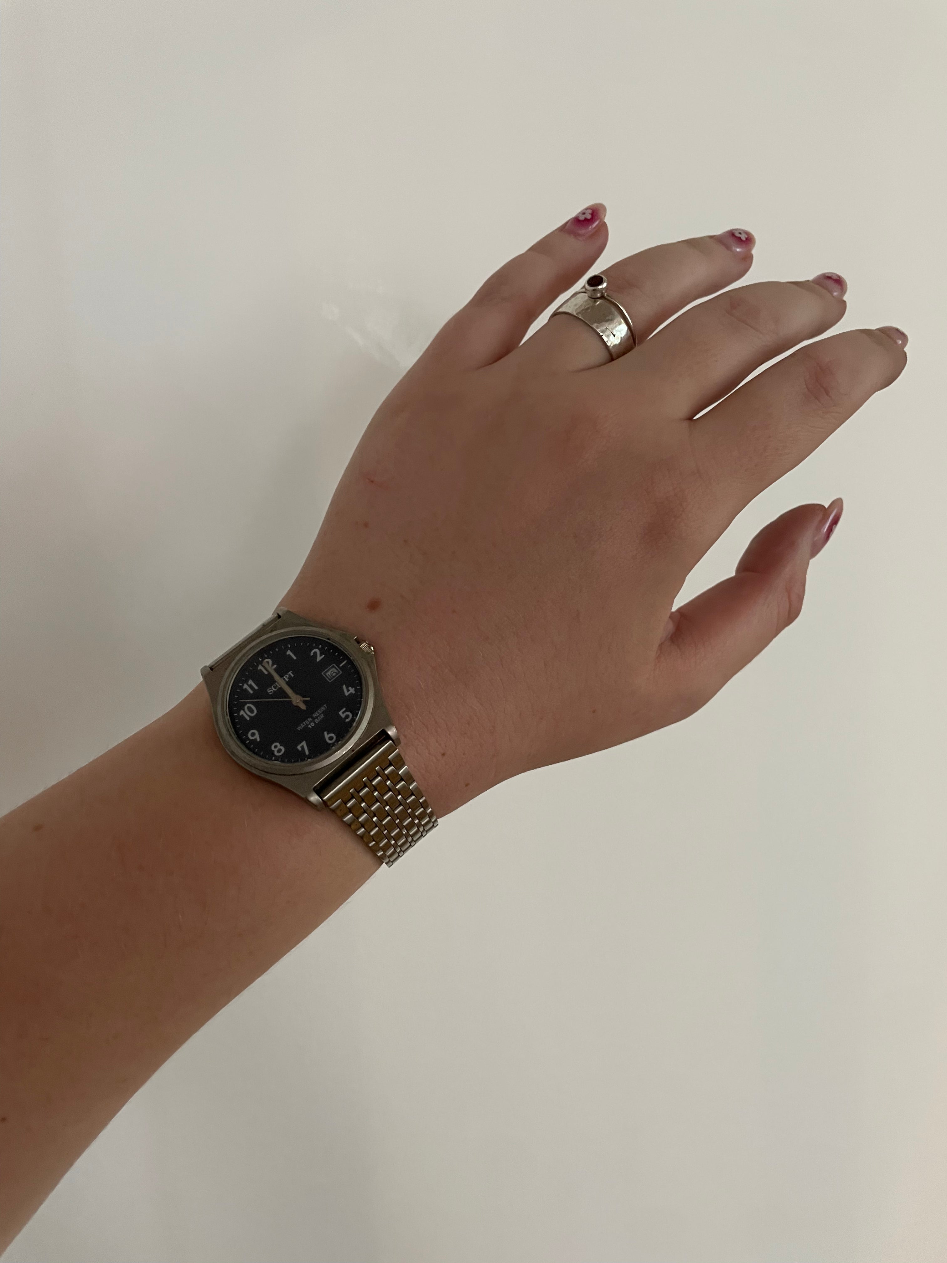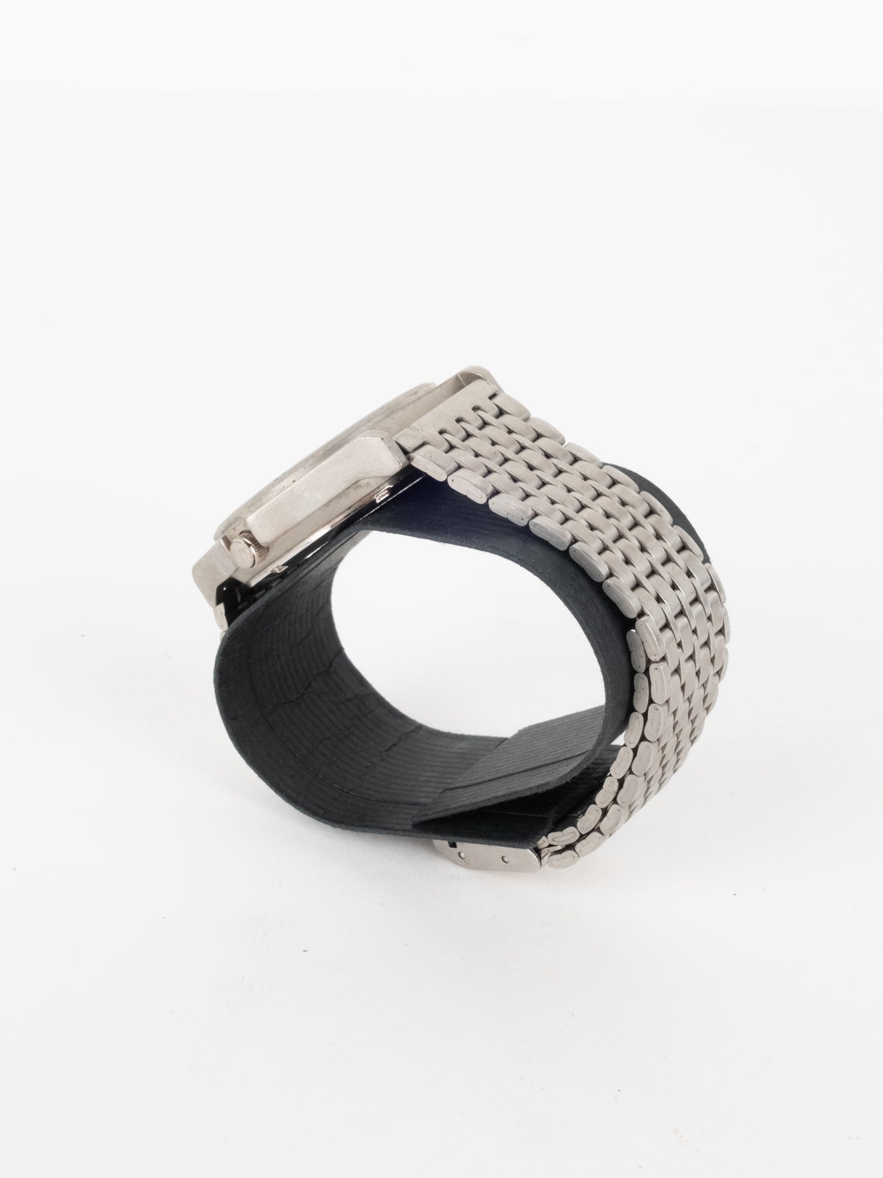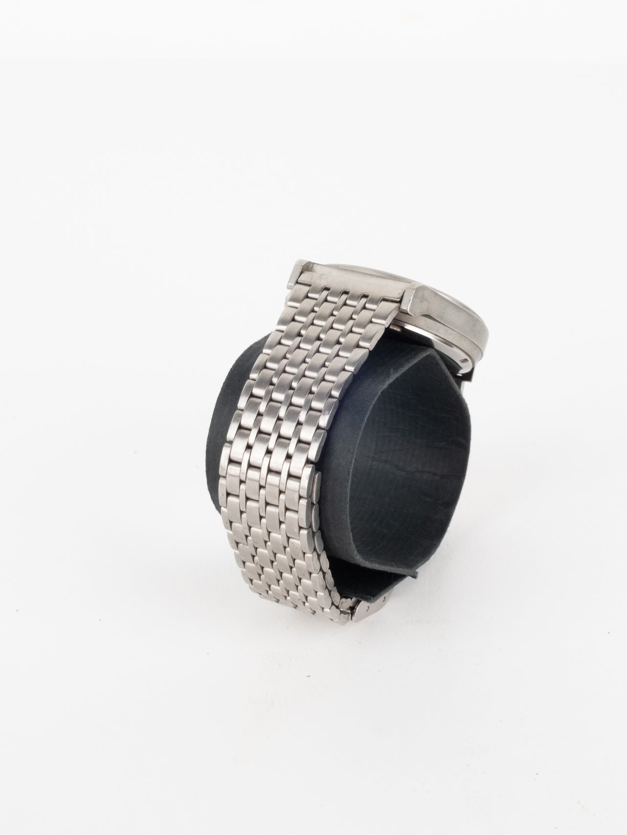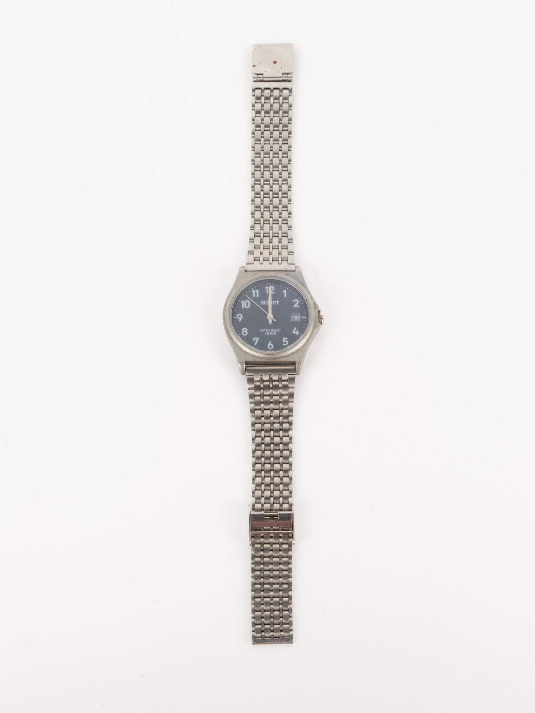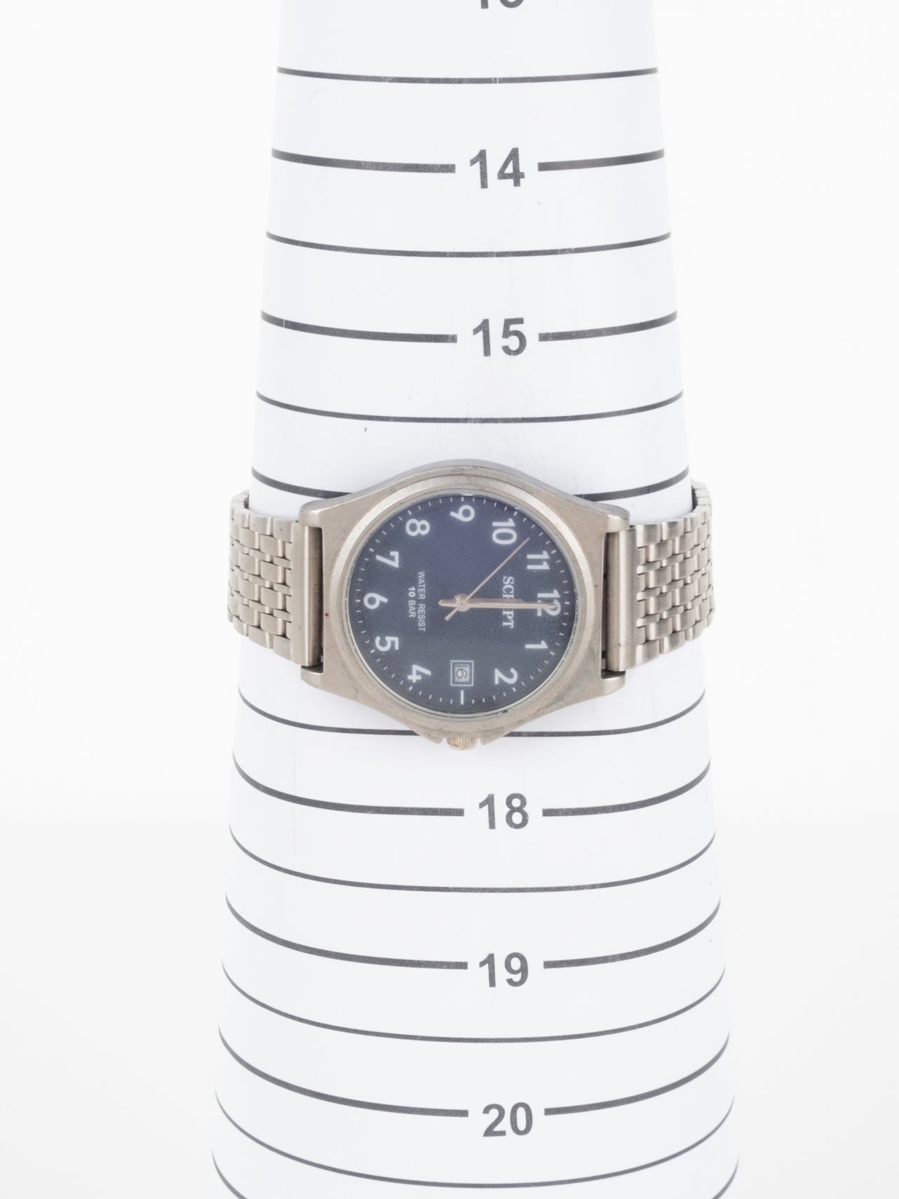 שעון מסיבי בסגנון ספורטיבי בצבע כסוף בעל פני שעון בצורה עגולה עם רקע בצבע כחול כהה ומחוגים. השעון נסגר באמצעות סוגר ממותג.