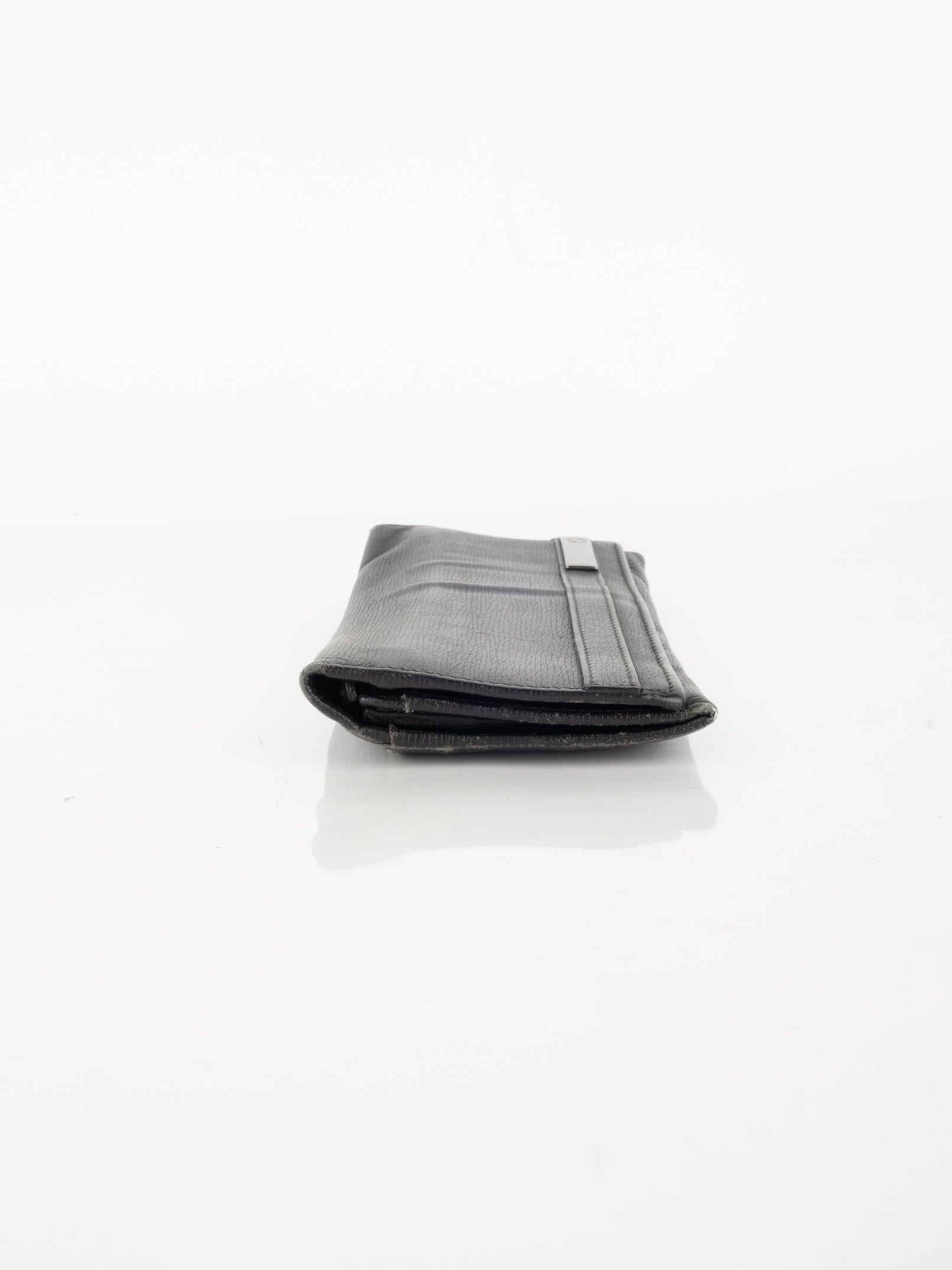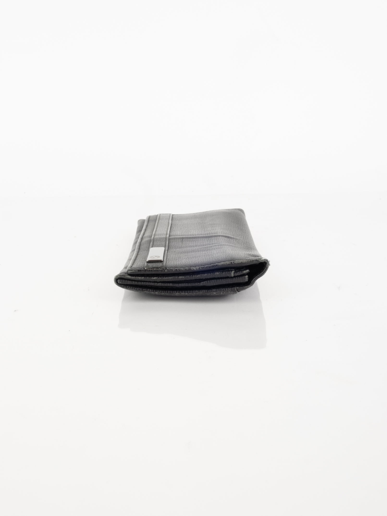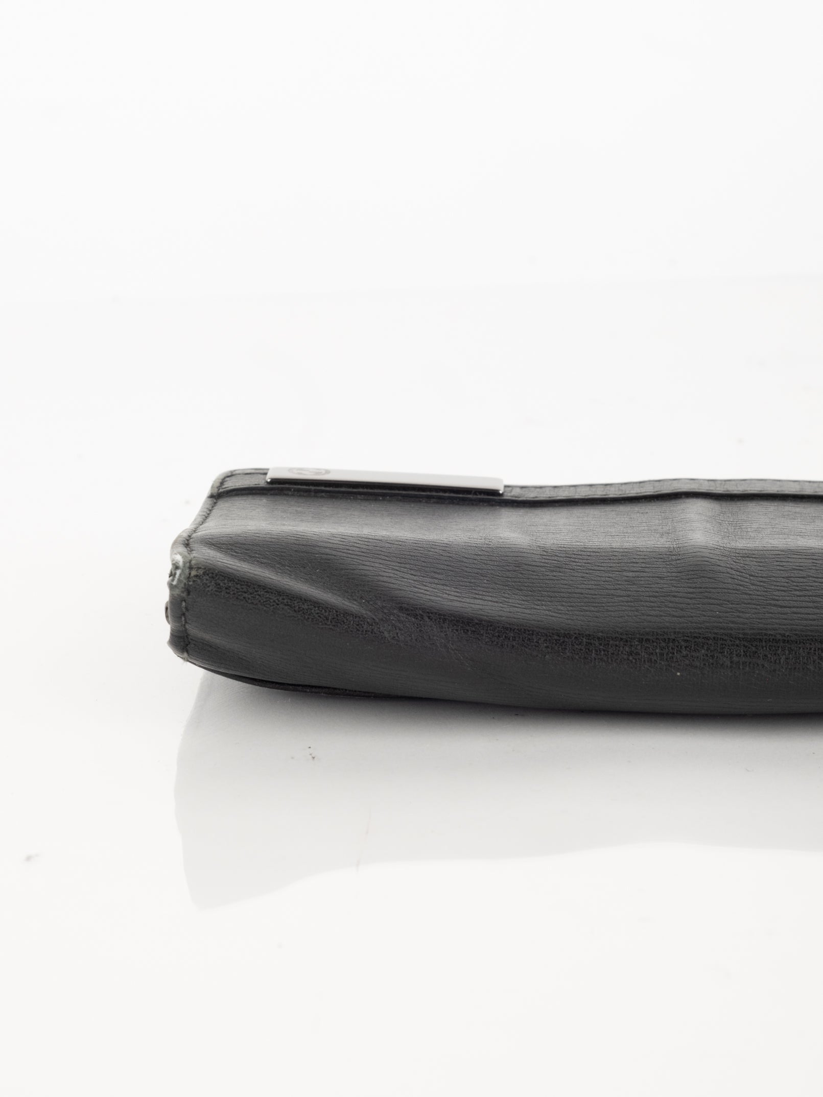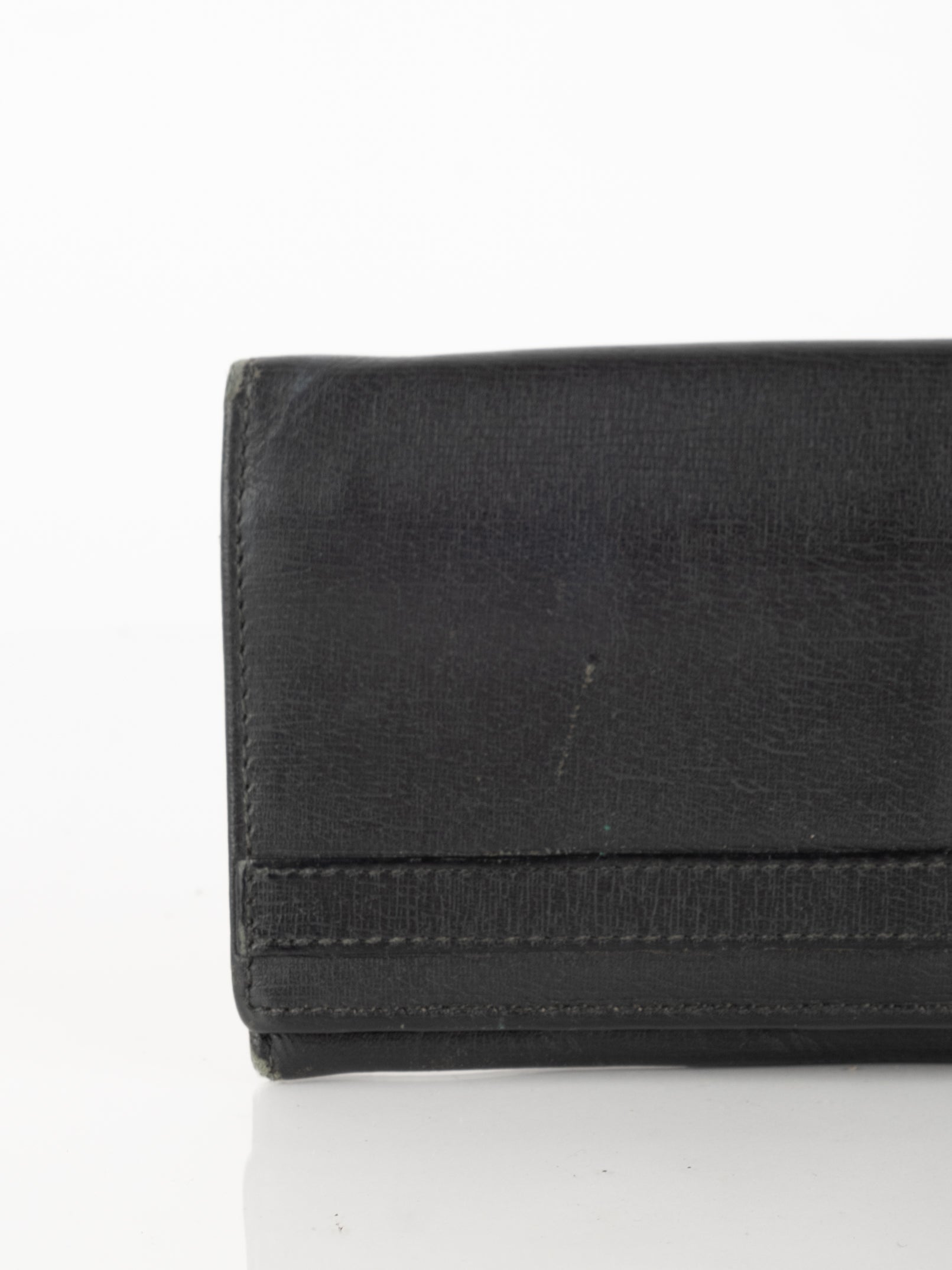 ארנק העשוי מעור בצבע שחור הנסגר באמצעות כפתור תיק-תק כסוף.
