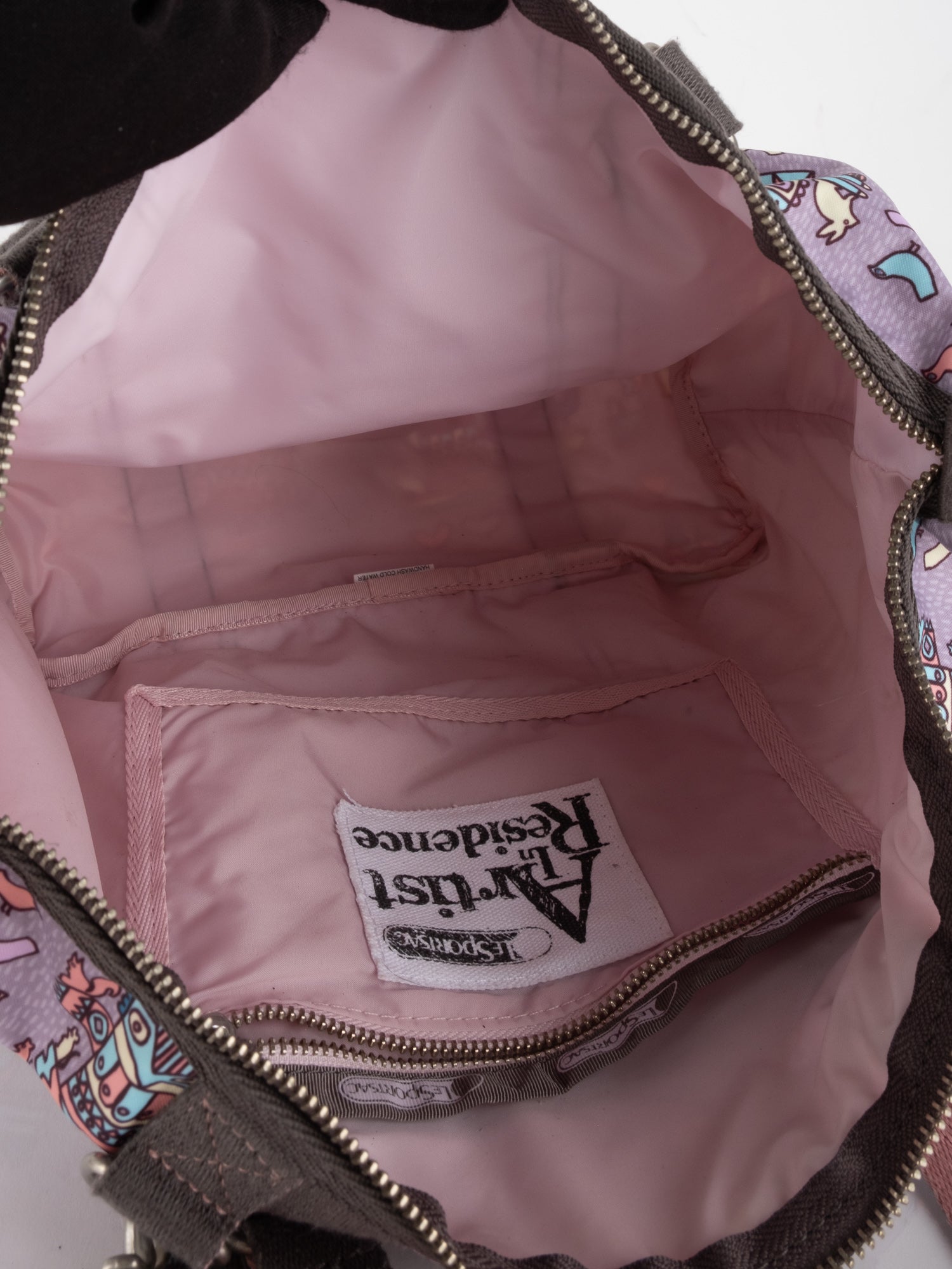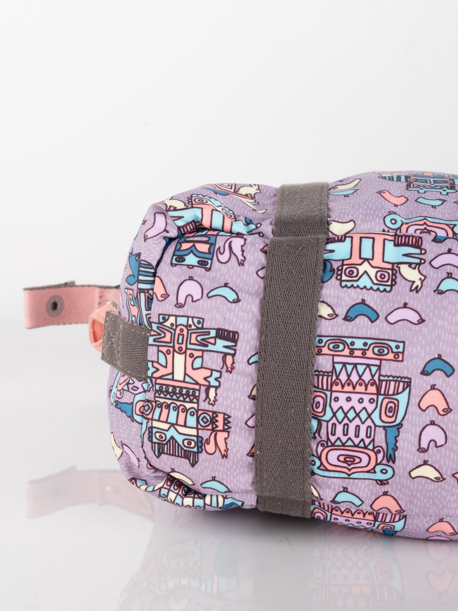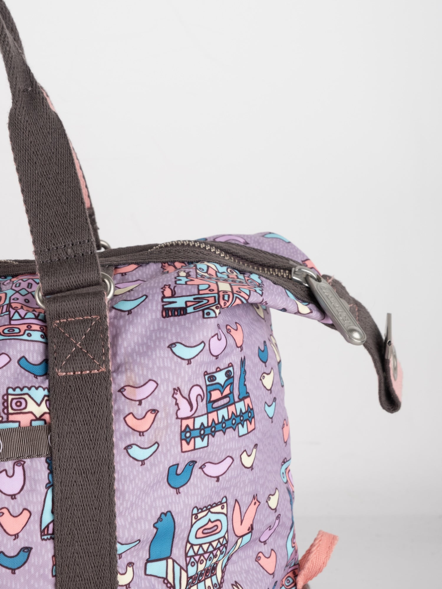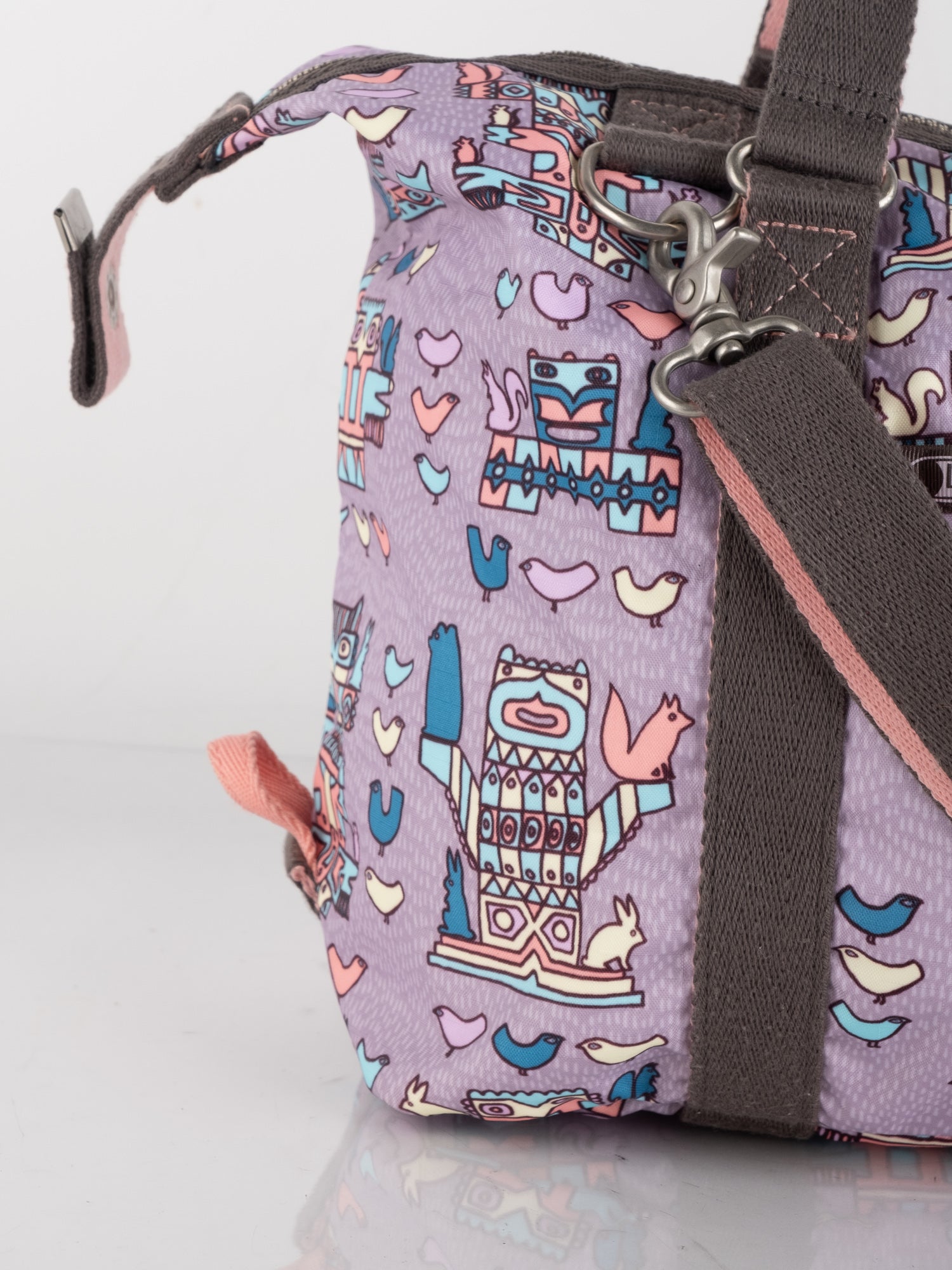 עשוי ניילון עמיד בגוון סגול עם הדפס איורים צבעוניים, רצועות בד חומות, תא מרכזי גדול ותאים חיצוניים.