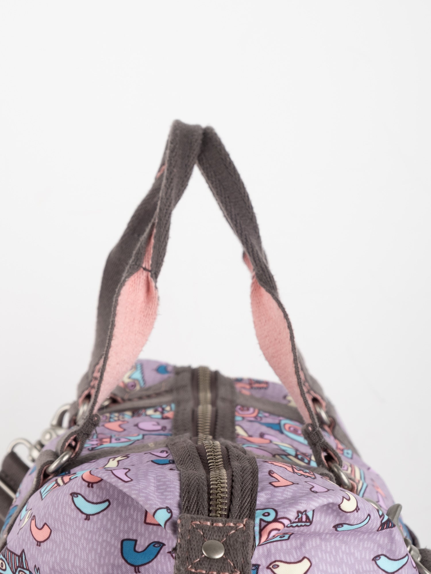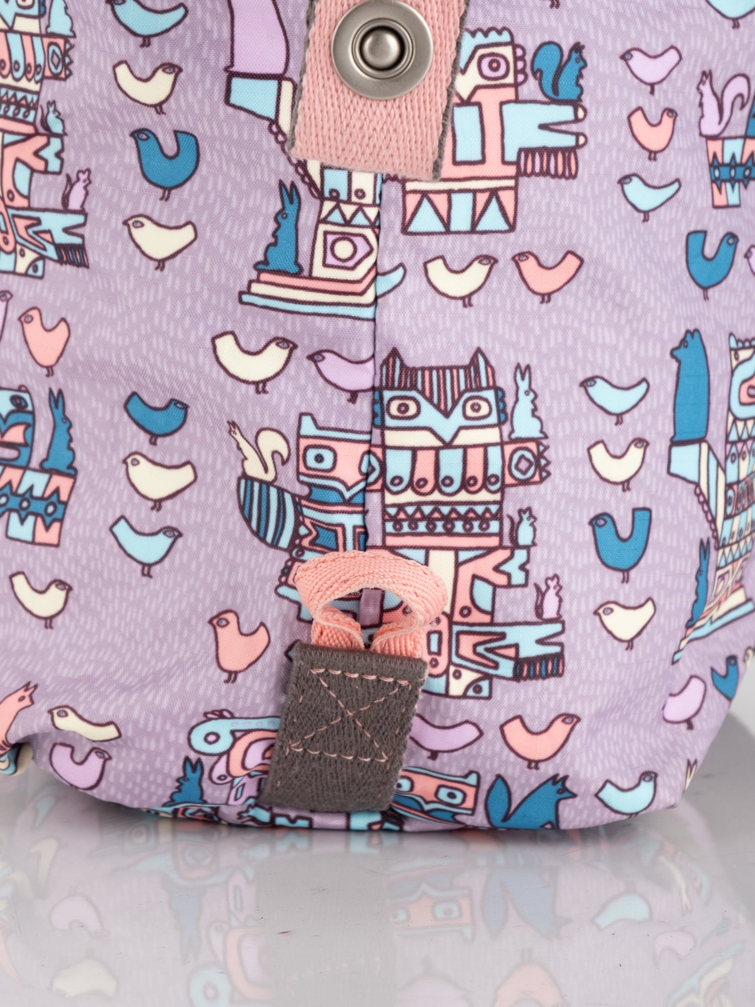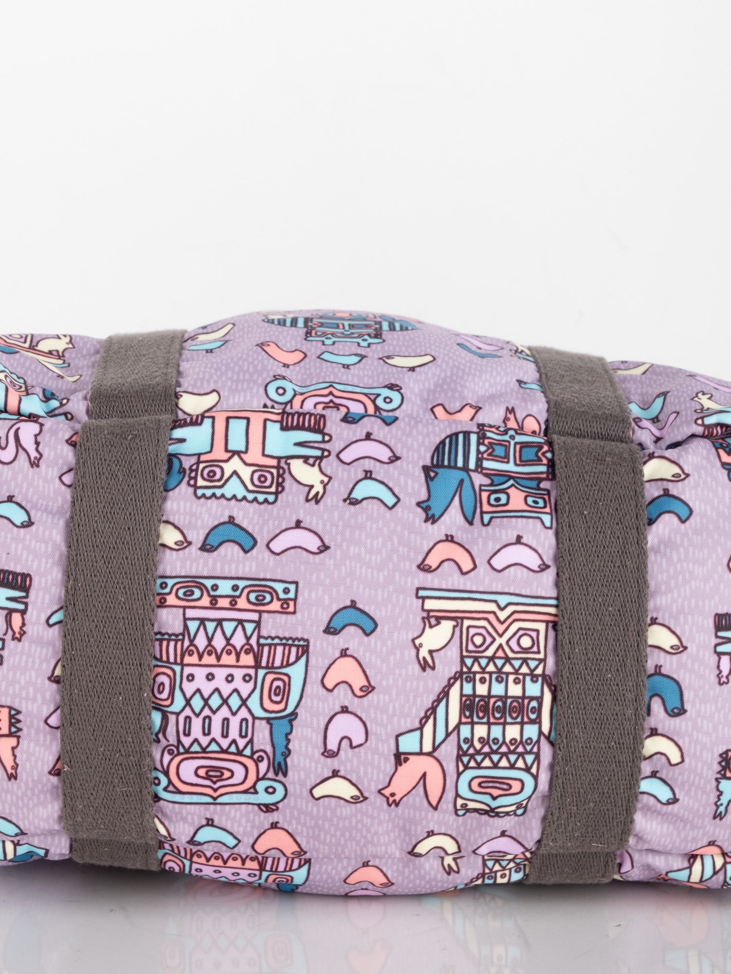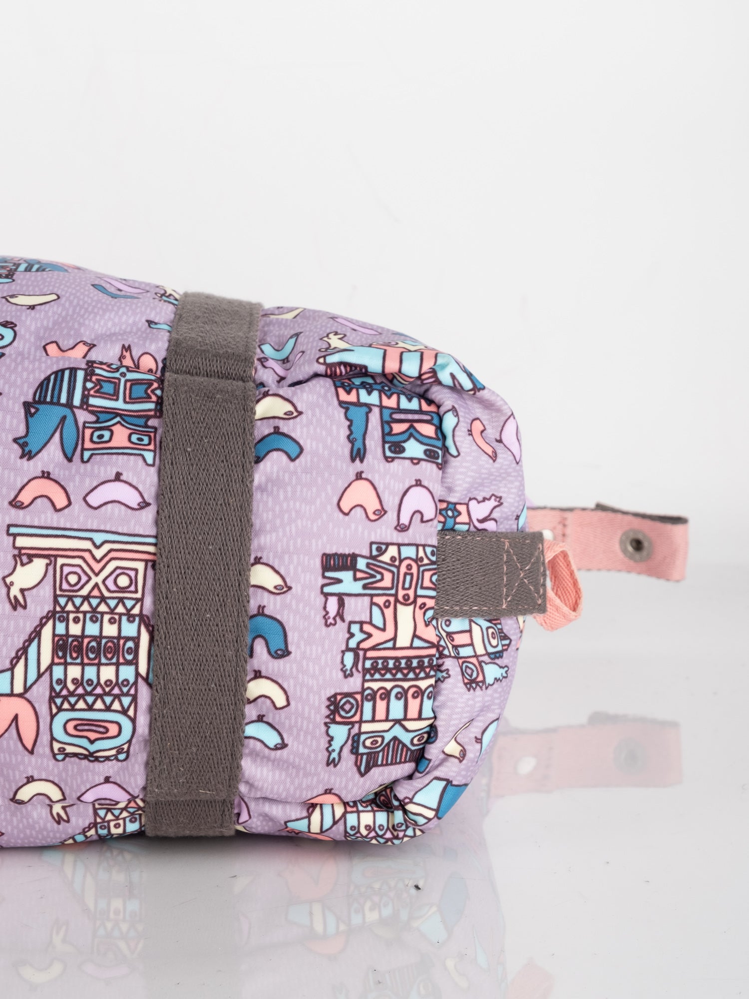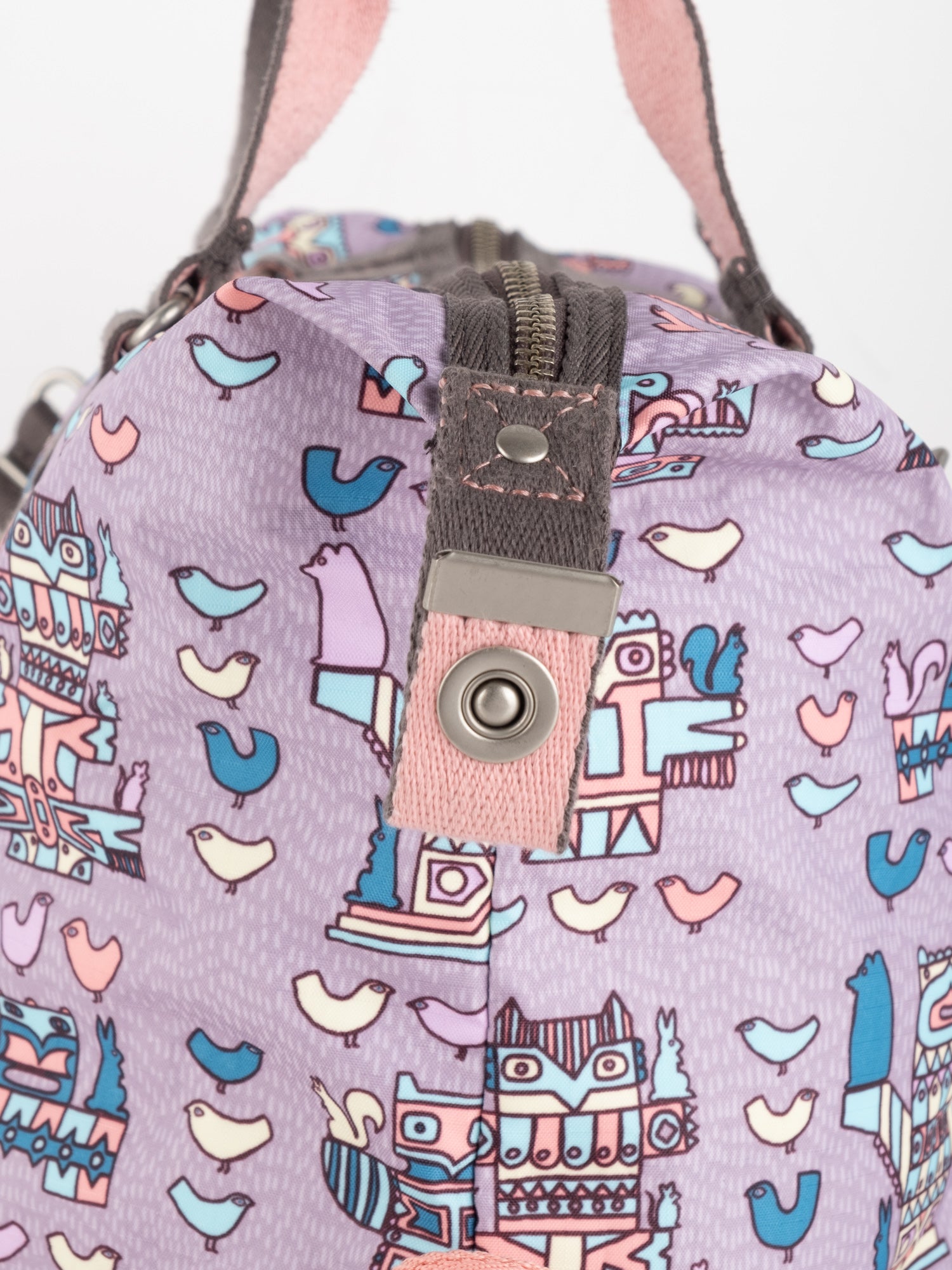 עשוי ניילון עמיד בגוון סגול עם הדפס איורים צבעוניים, רצועות בד חומות, תא מרכזי גדול ותאים חיצוניים.