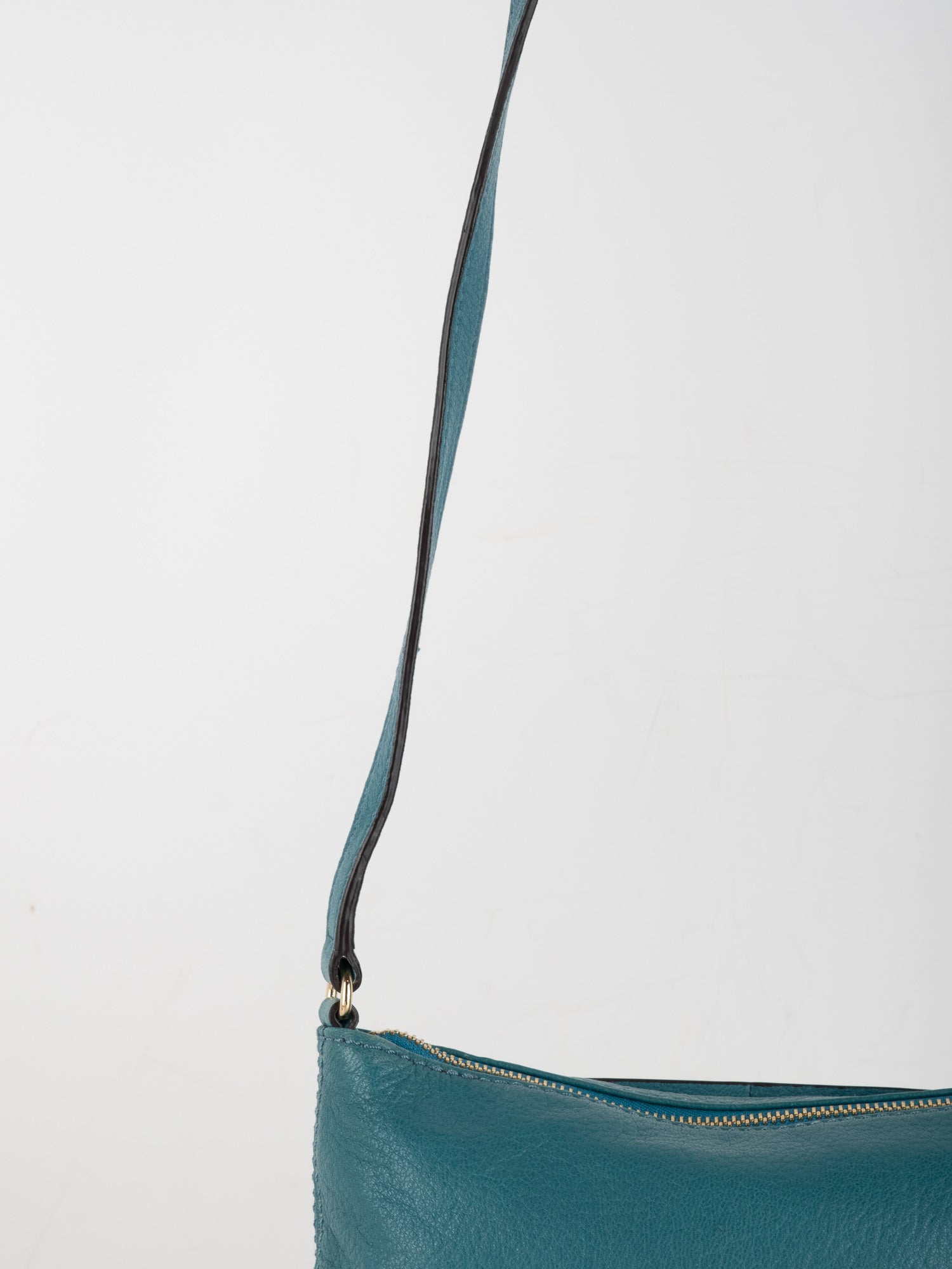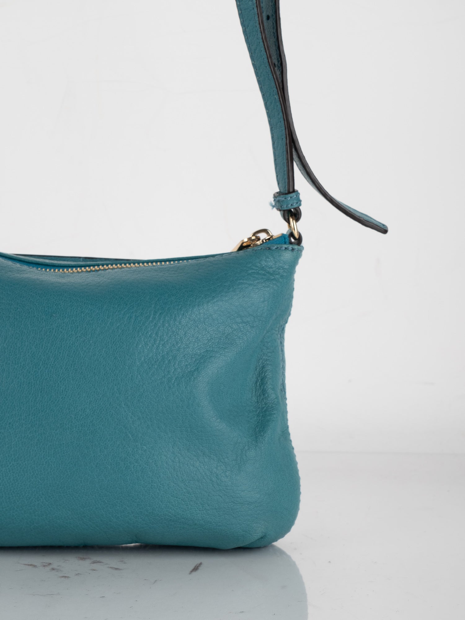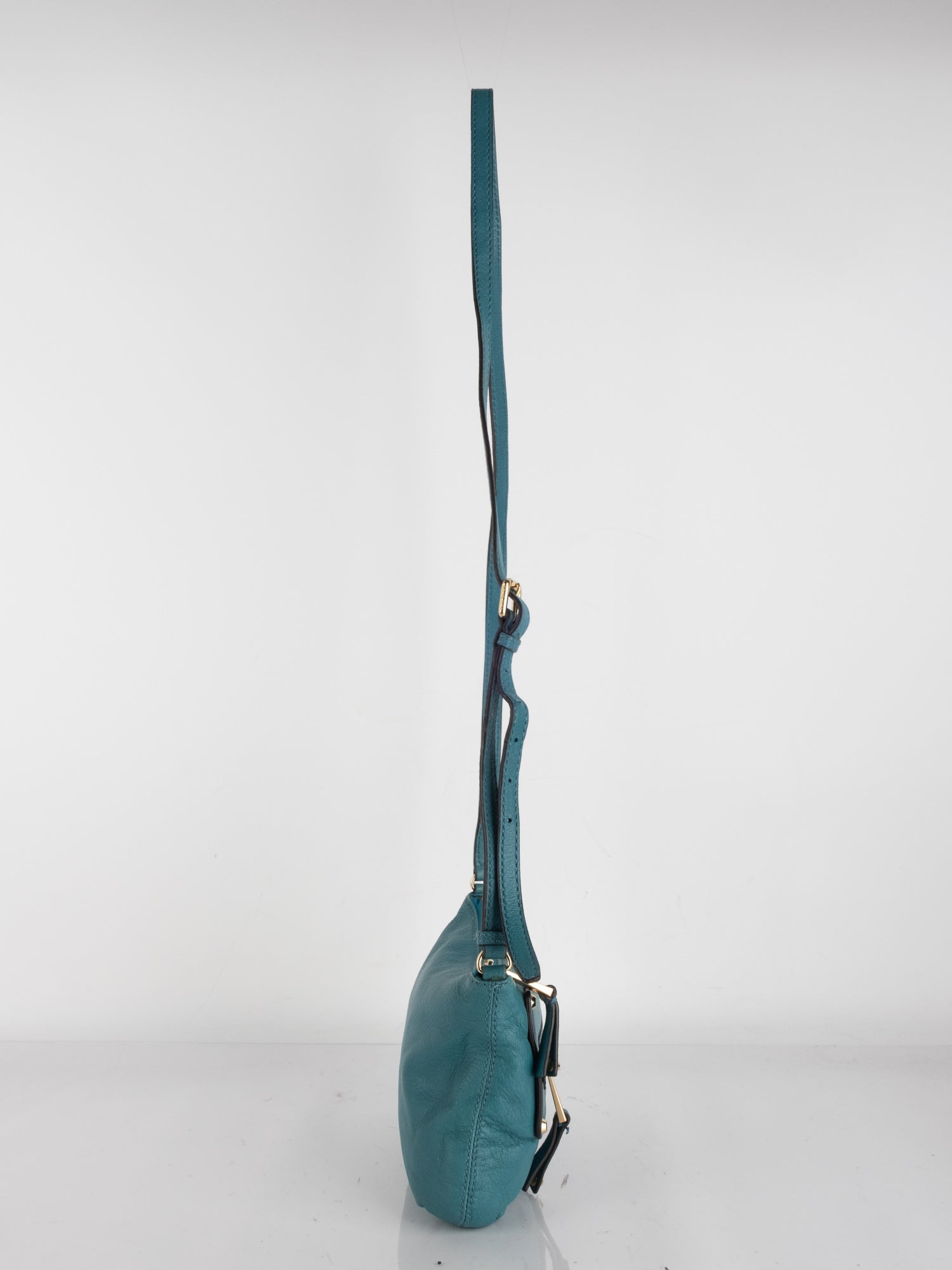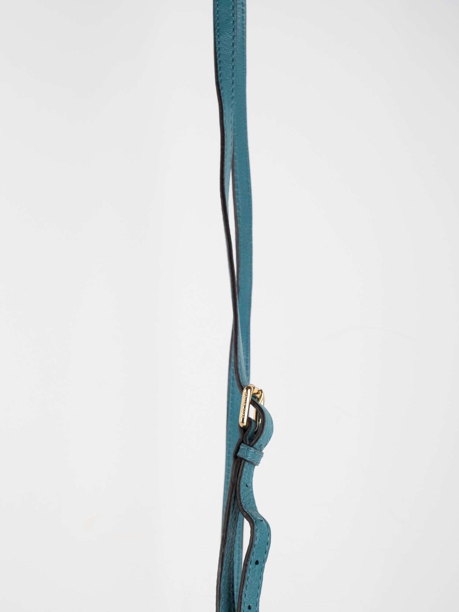 עשוי דמוי עור איכותי בגוון כחול בהיר, רצועת כתף ארוכה ומתכווננת, לוגו מתכתי קדמי ותאים עם סגירות רוכסן.