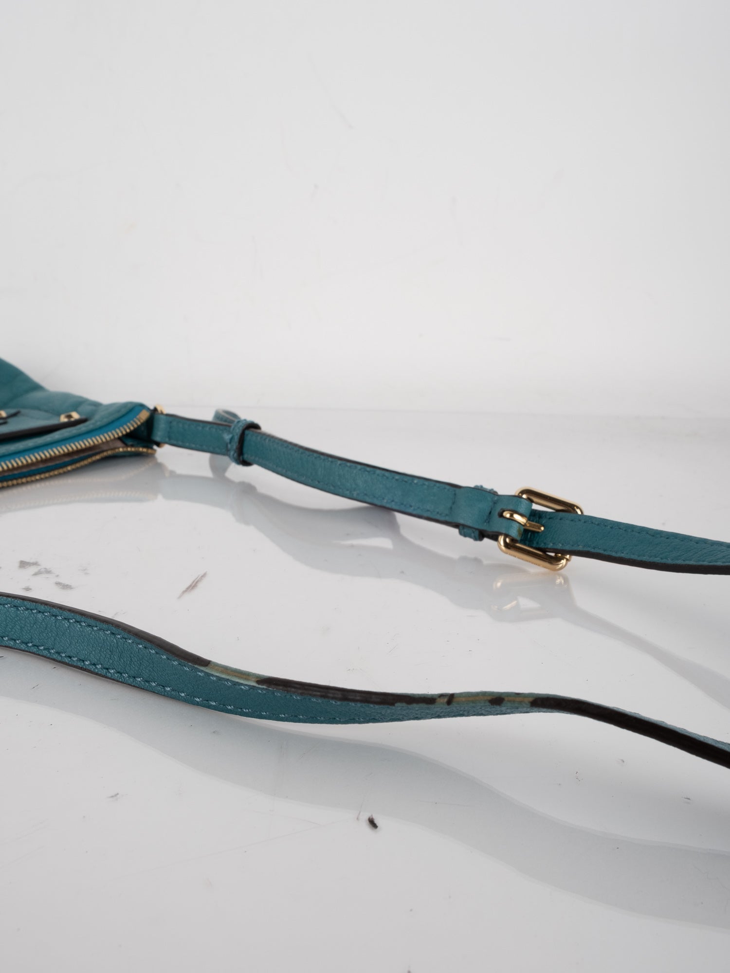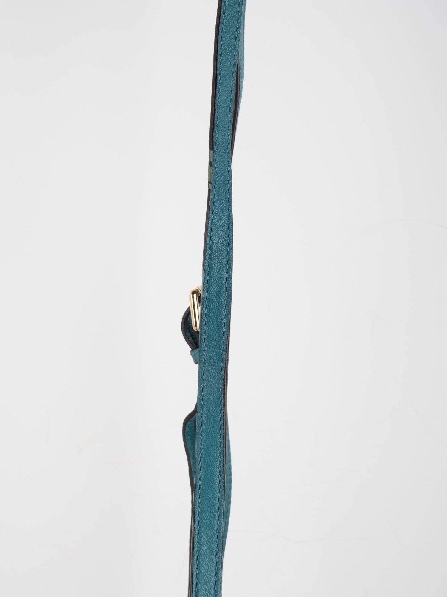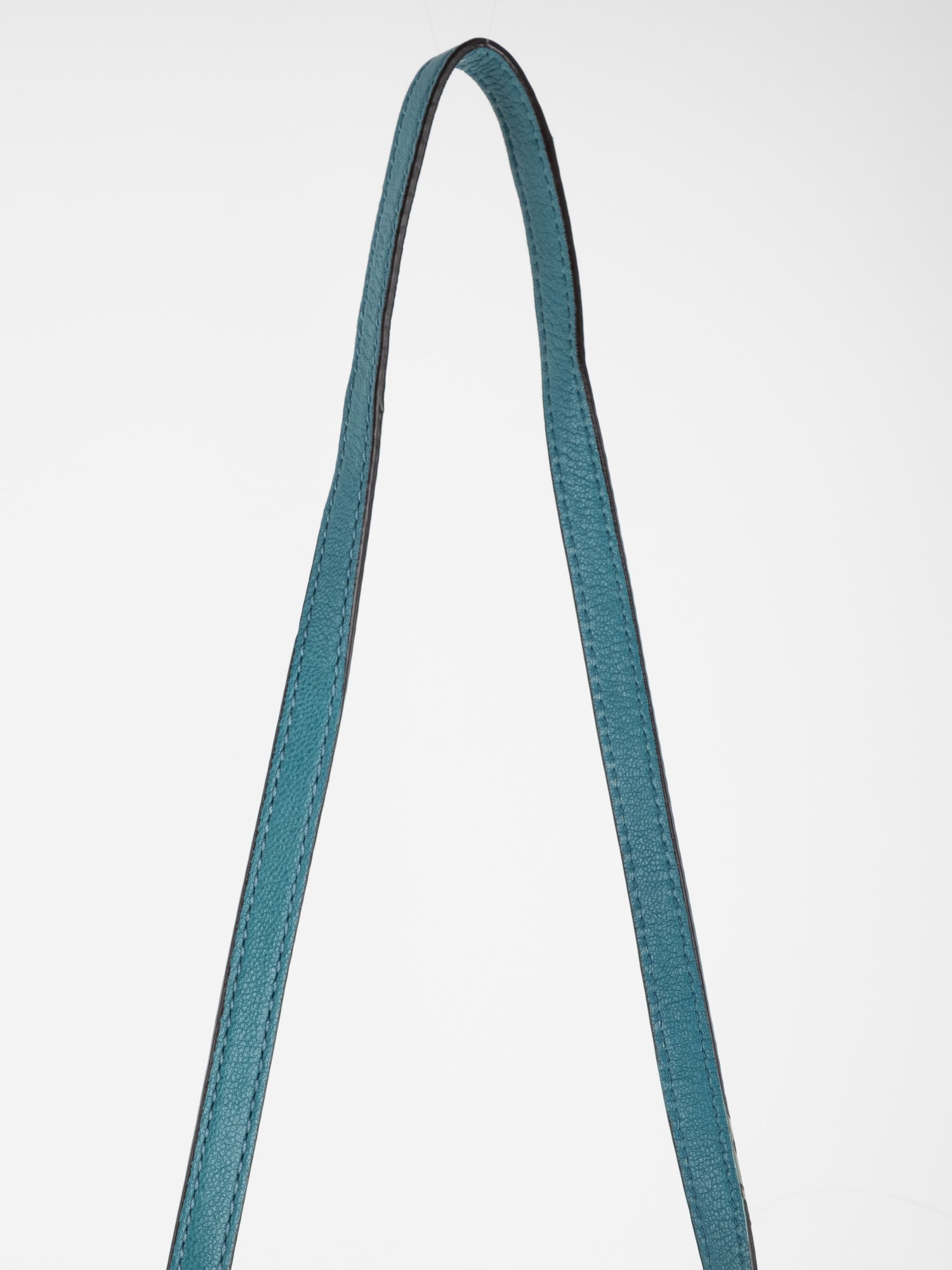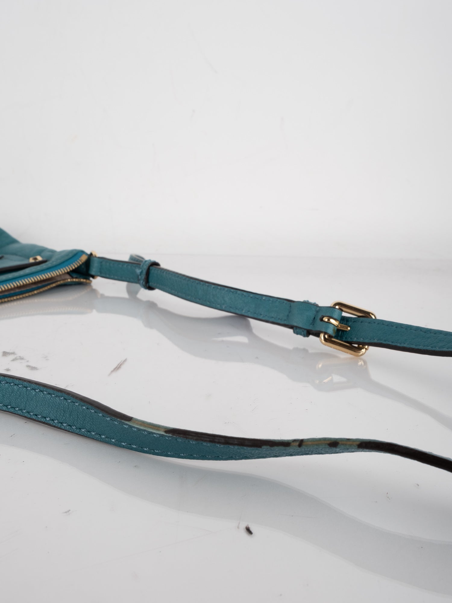 עשוי דמוי עור איכותי בגוון כחול בהיר, רצועת כתף ארוכה ומתכווננת, לוגו מתכתי קדמי ותאים עם סגירות רוכסן.