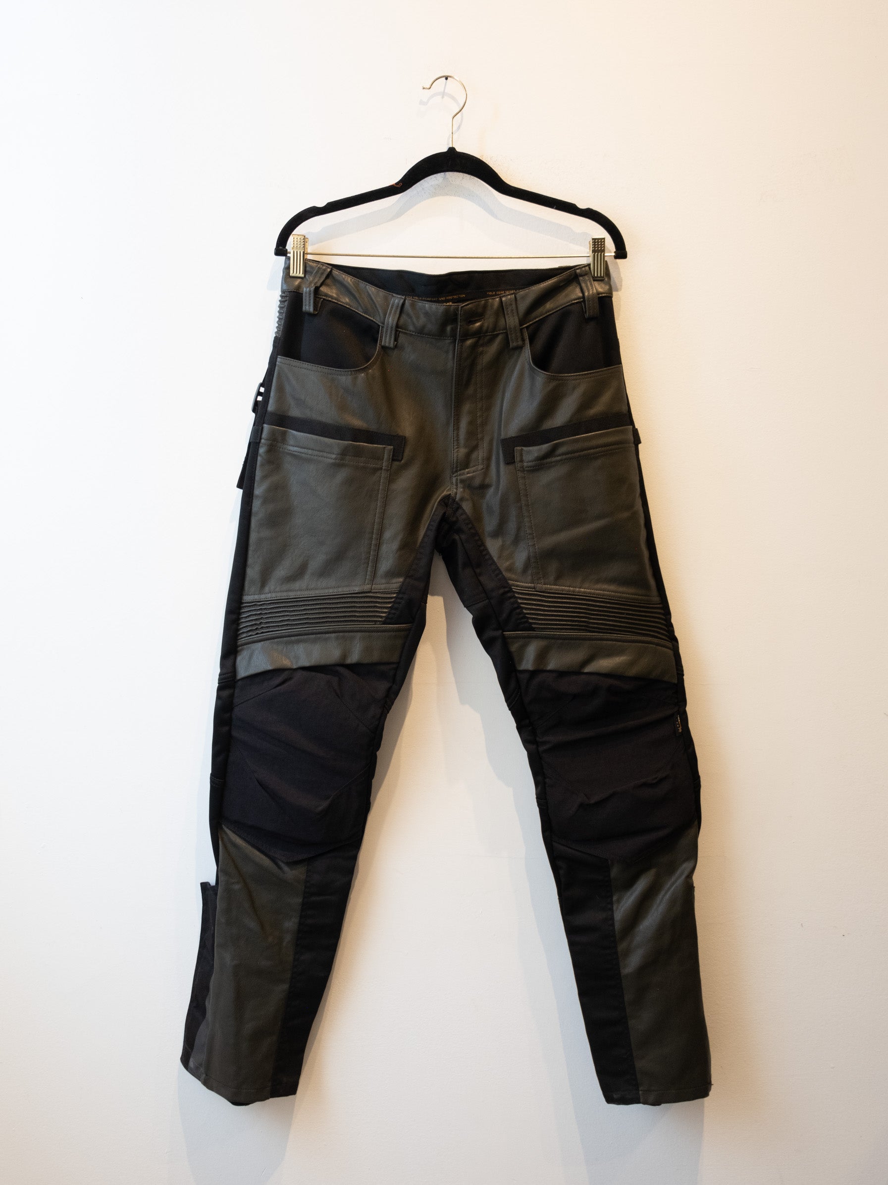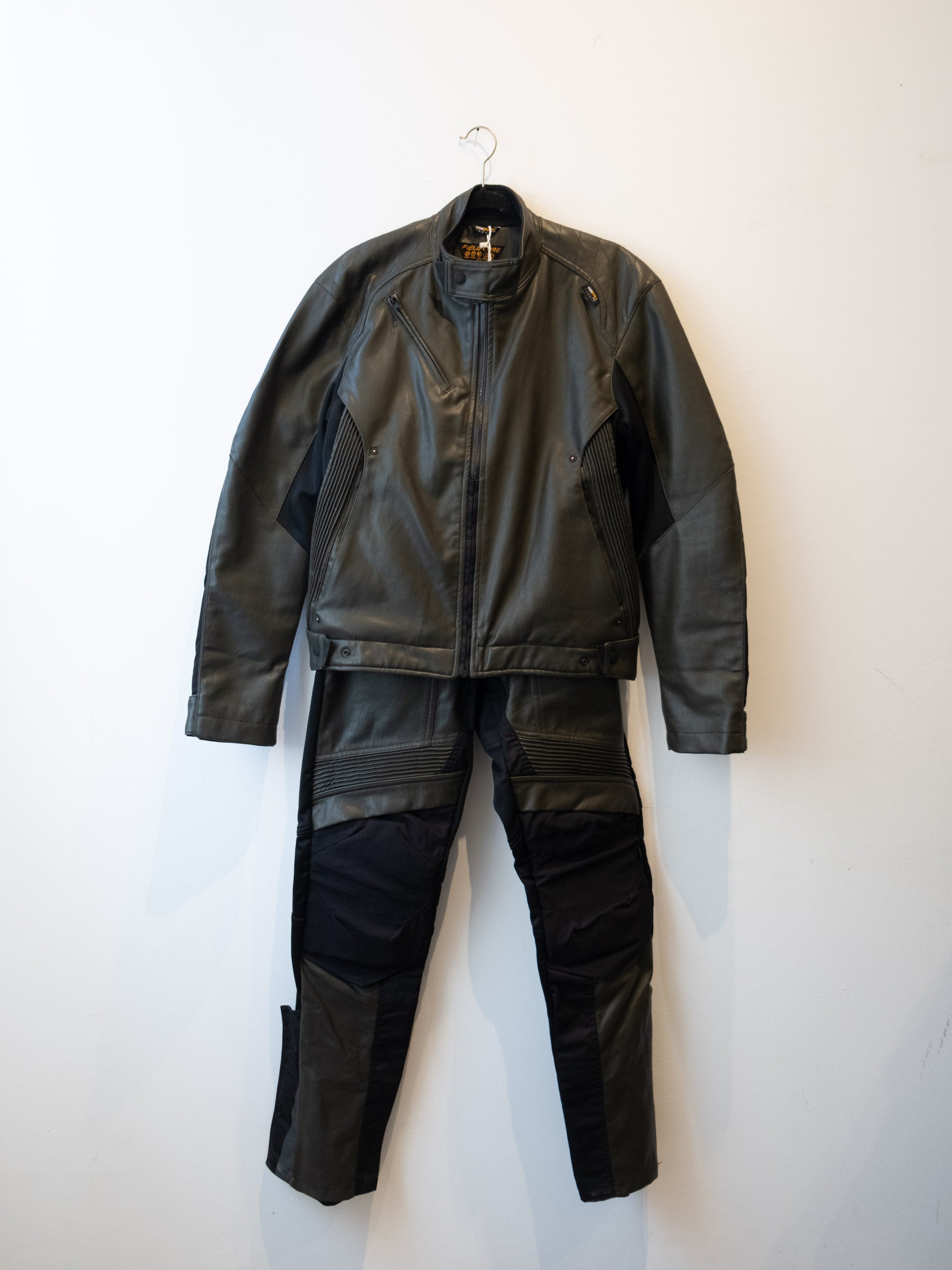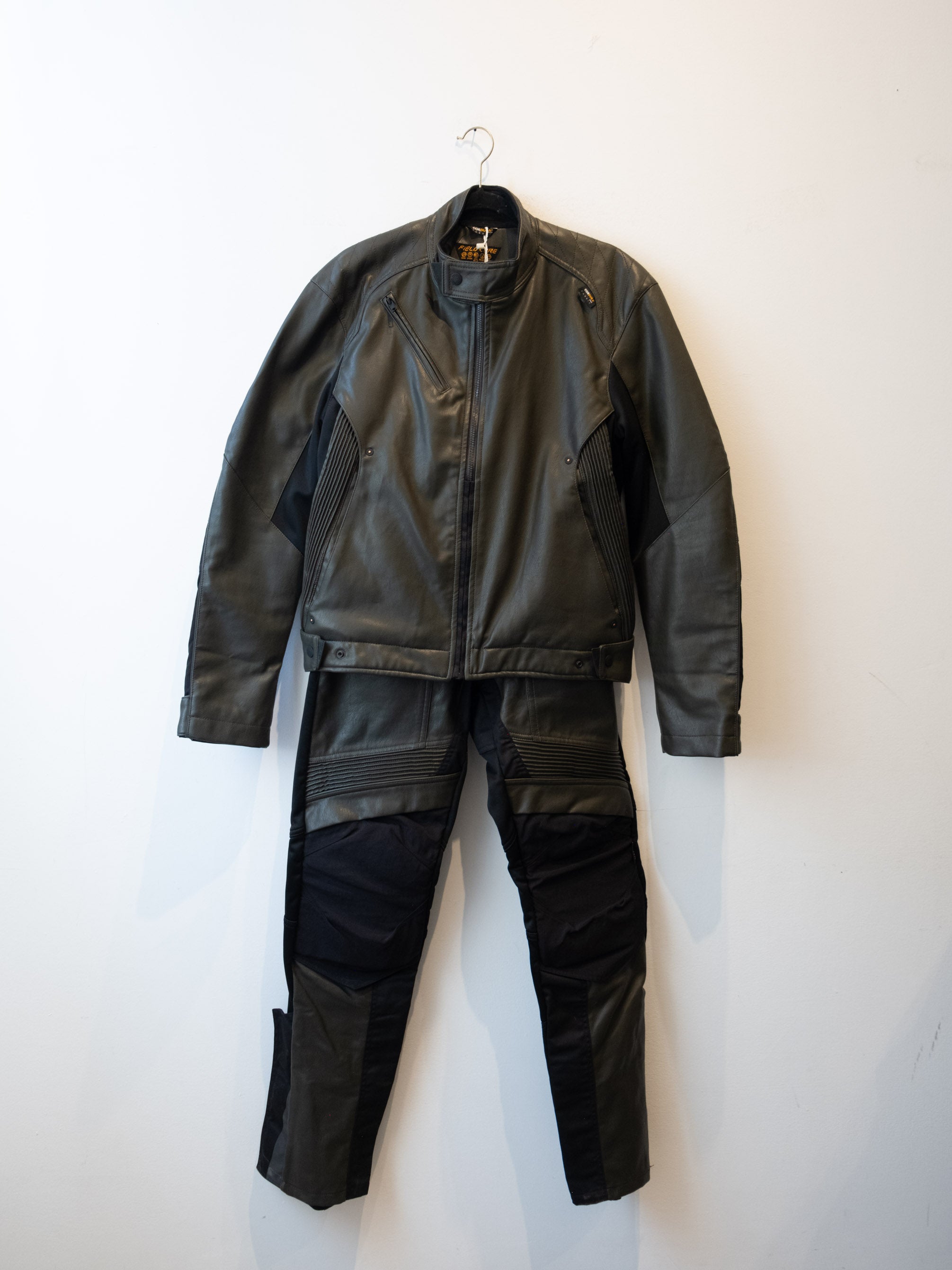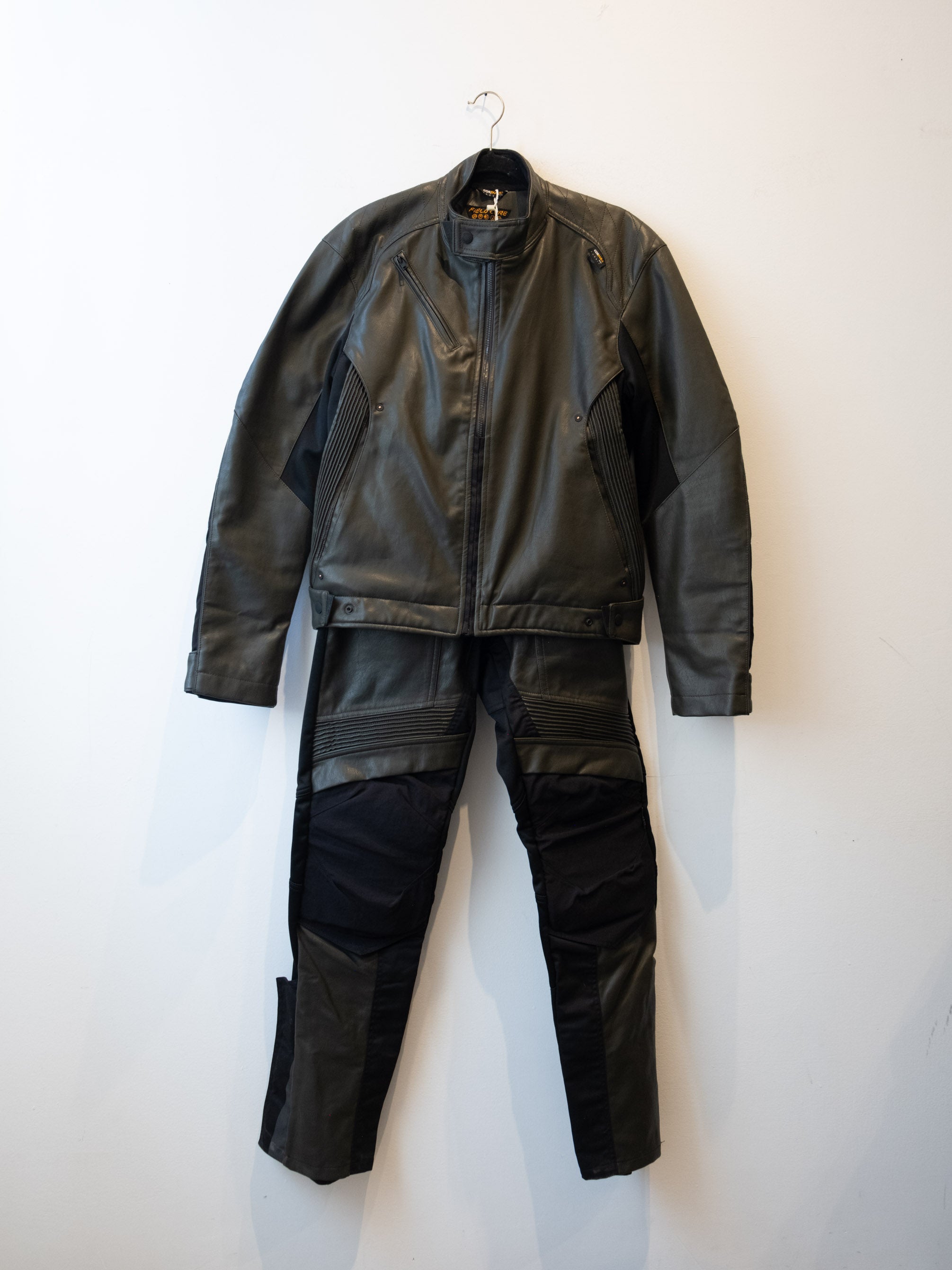 חליפה בסגנון אופנוענים העשוי מעור בצבע ירוק זית בשילוב של בד בצבע שחור. המכנסיים נסגרים באמצעות רוכסן וכפתור בעל מסר כיסים ללא סגירה. ג׳קט נסגר באמצעות רוכסן וכפתורי תיק-תק, בעל כיסים הנסגרים באמצעות רוכסן.