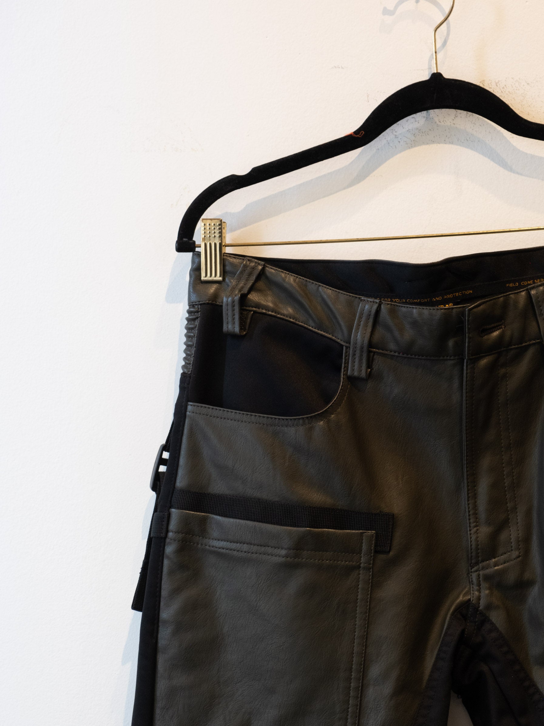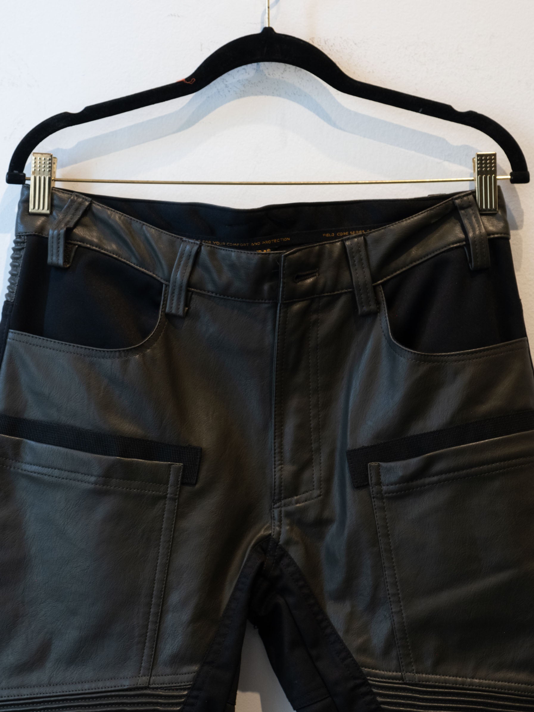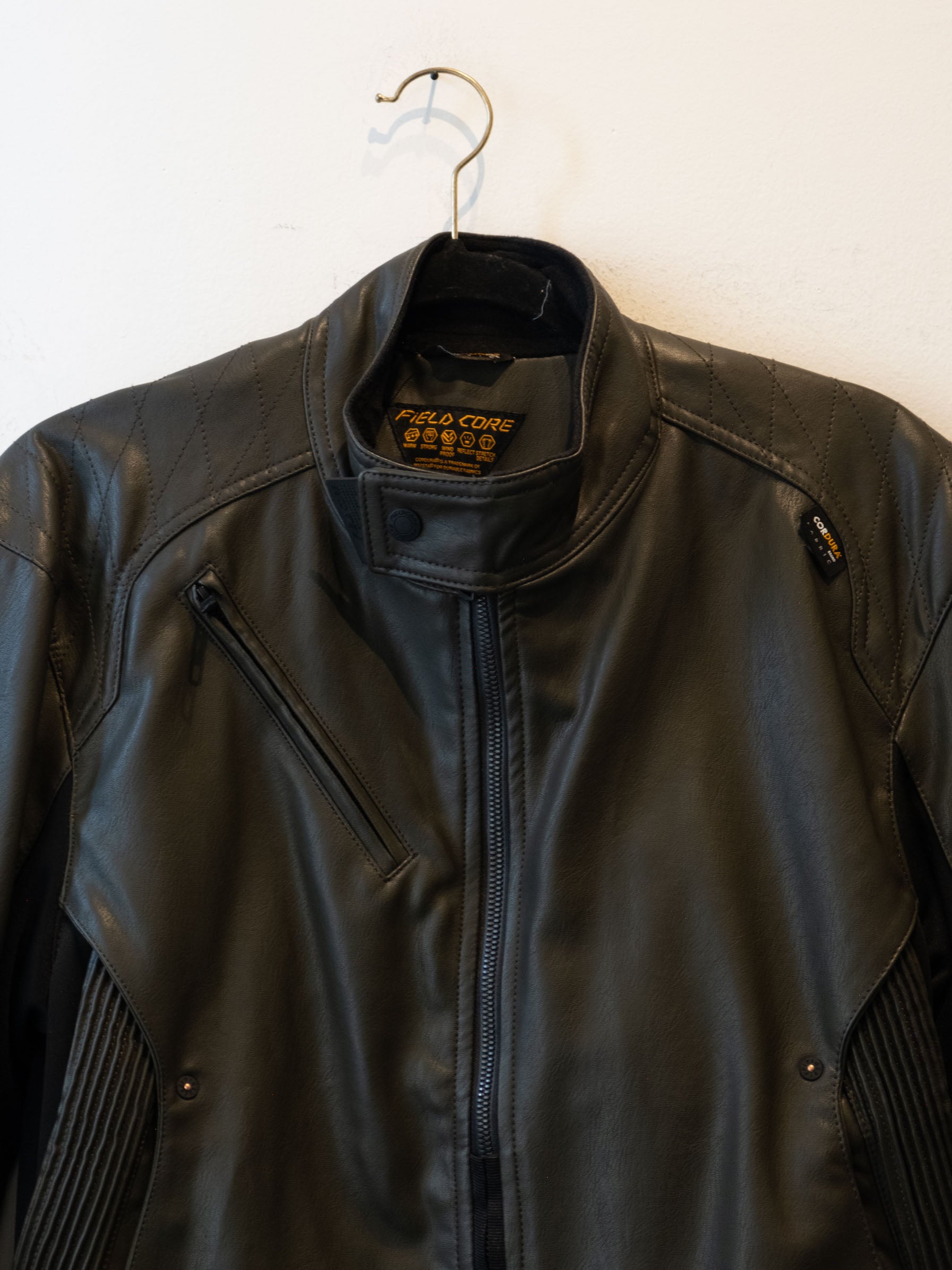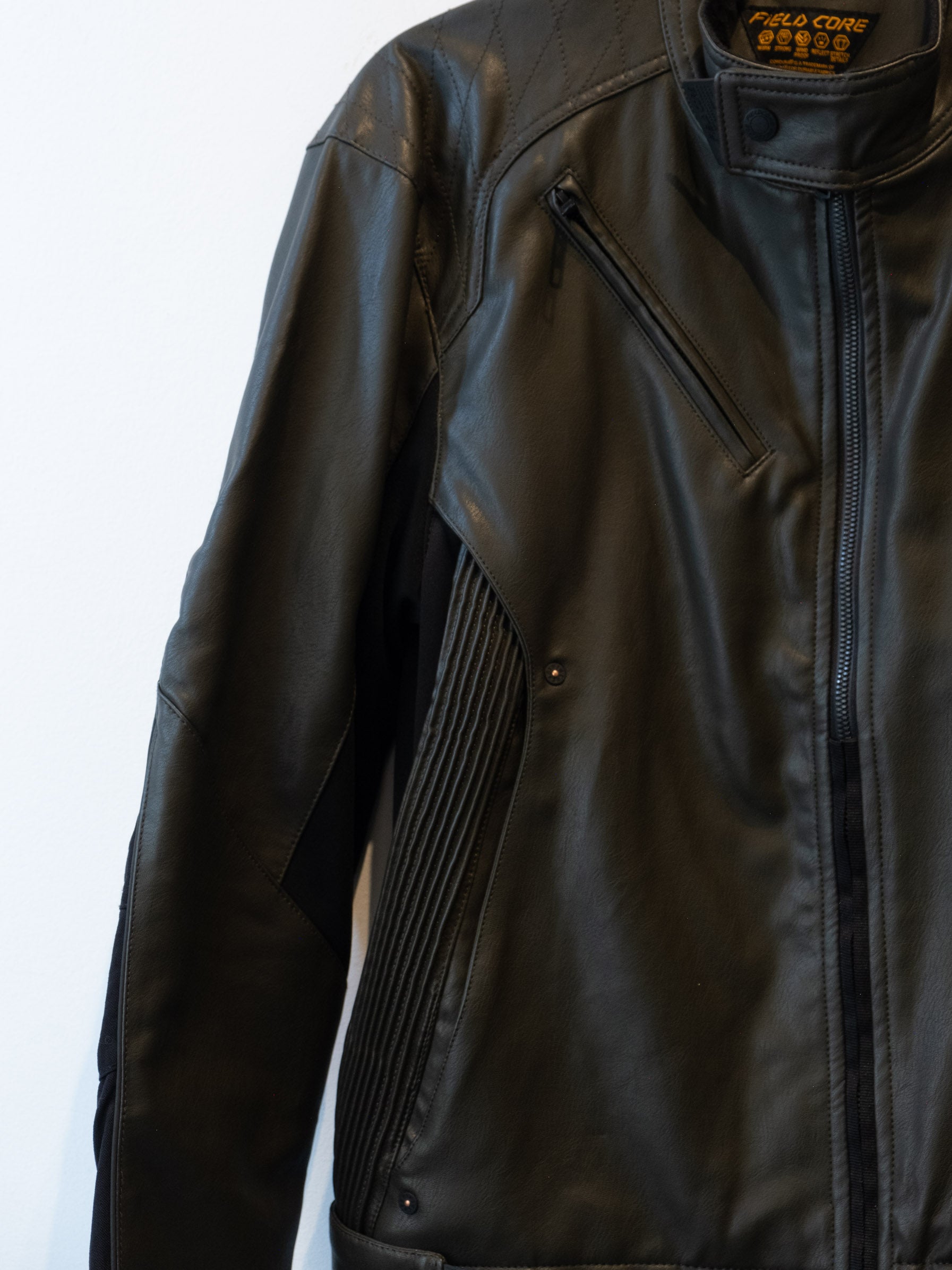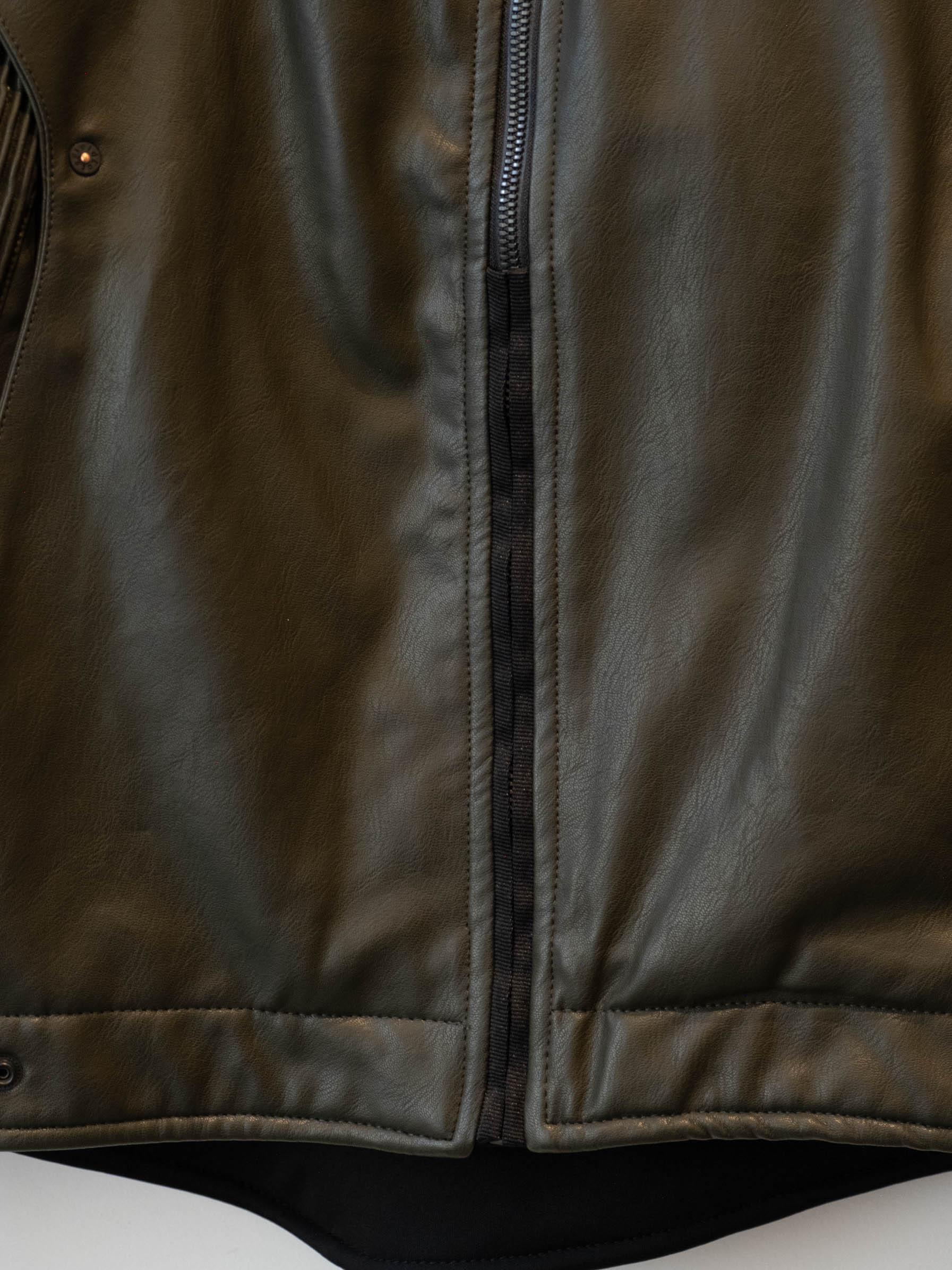 חליפה בסגנון אופנוענים העשוי מעור בצבע ירוק זית בשילוב של בד בצבע שחור. המכנסיים נסגרים באמצעות רוכסן וכפתור בעל מסר כיסים ללא סגירה. ג׳קט נסגר באמצעות רוכסן וכפתורי תיק-תק, בעל כיסים הנסגרים באמצעות רוכסן.