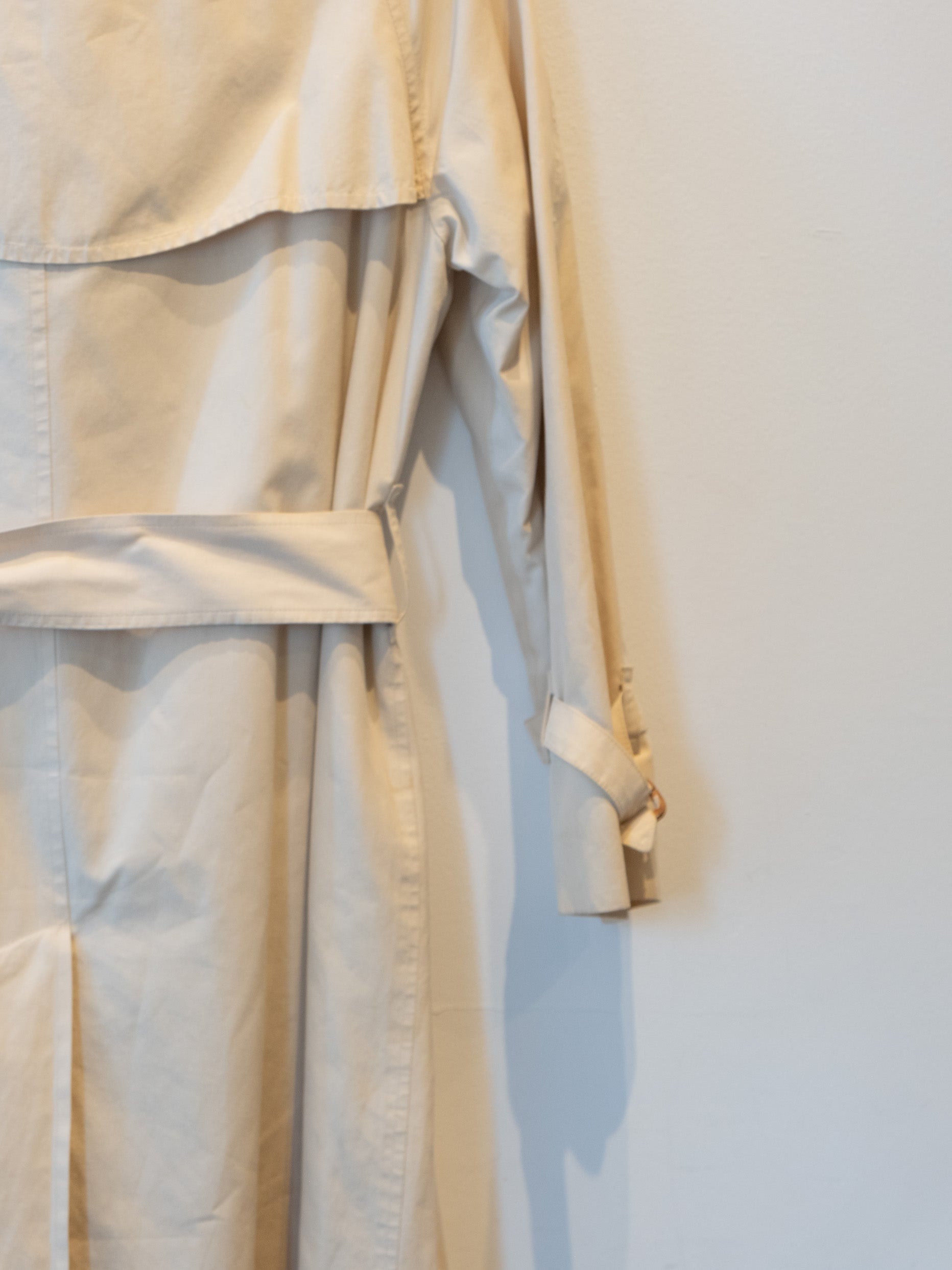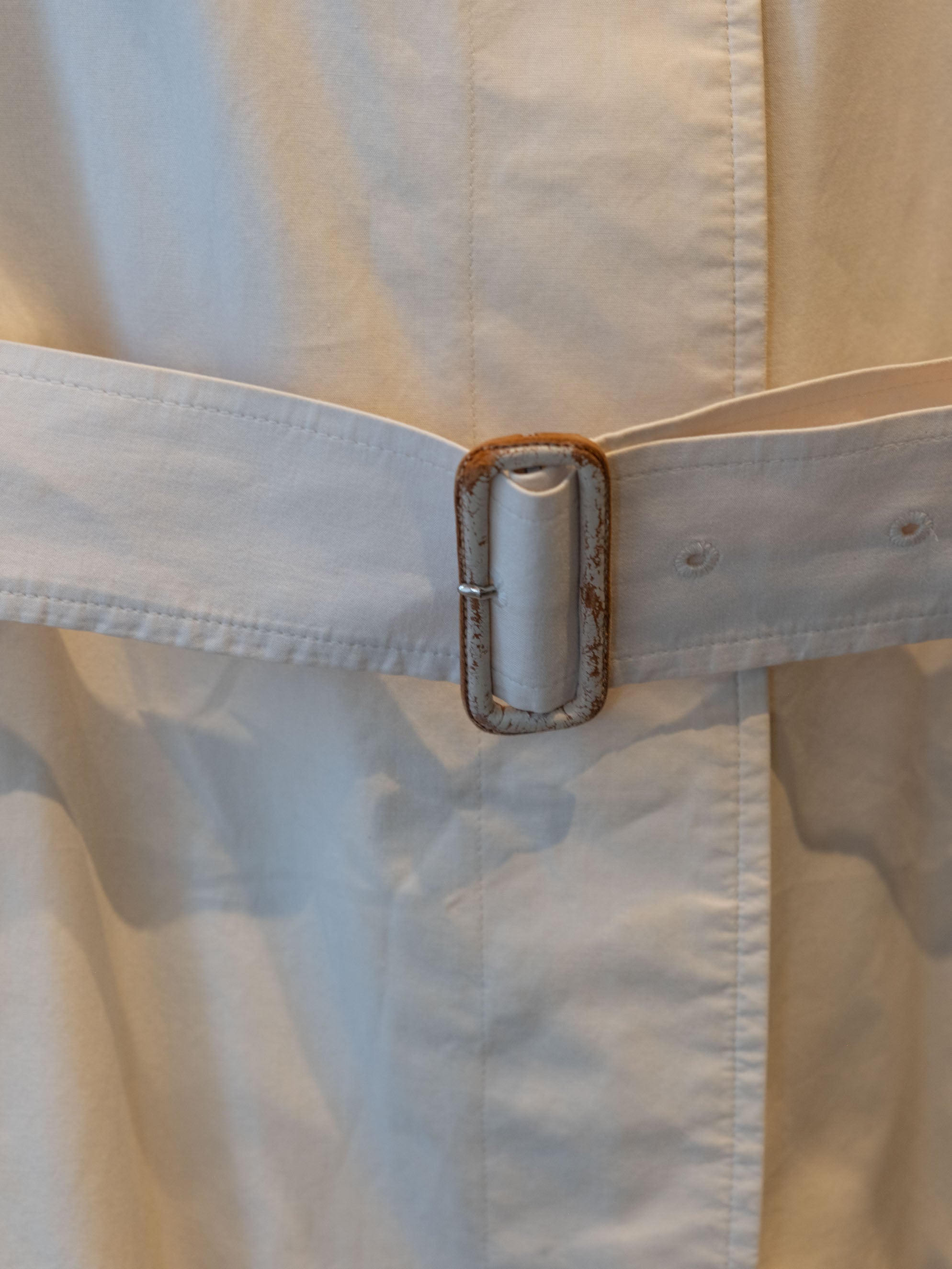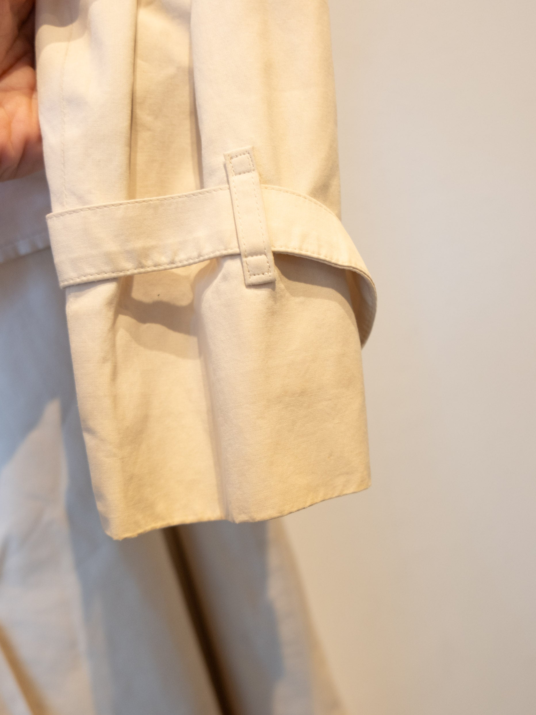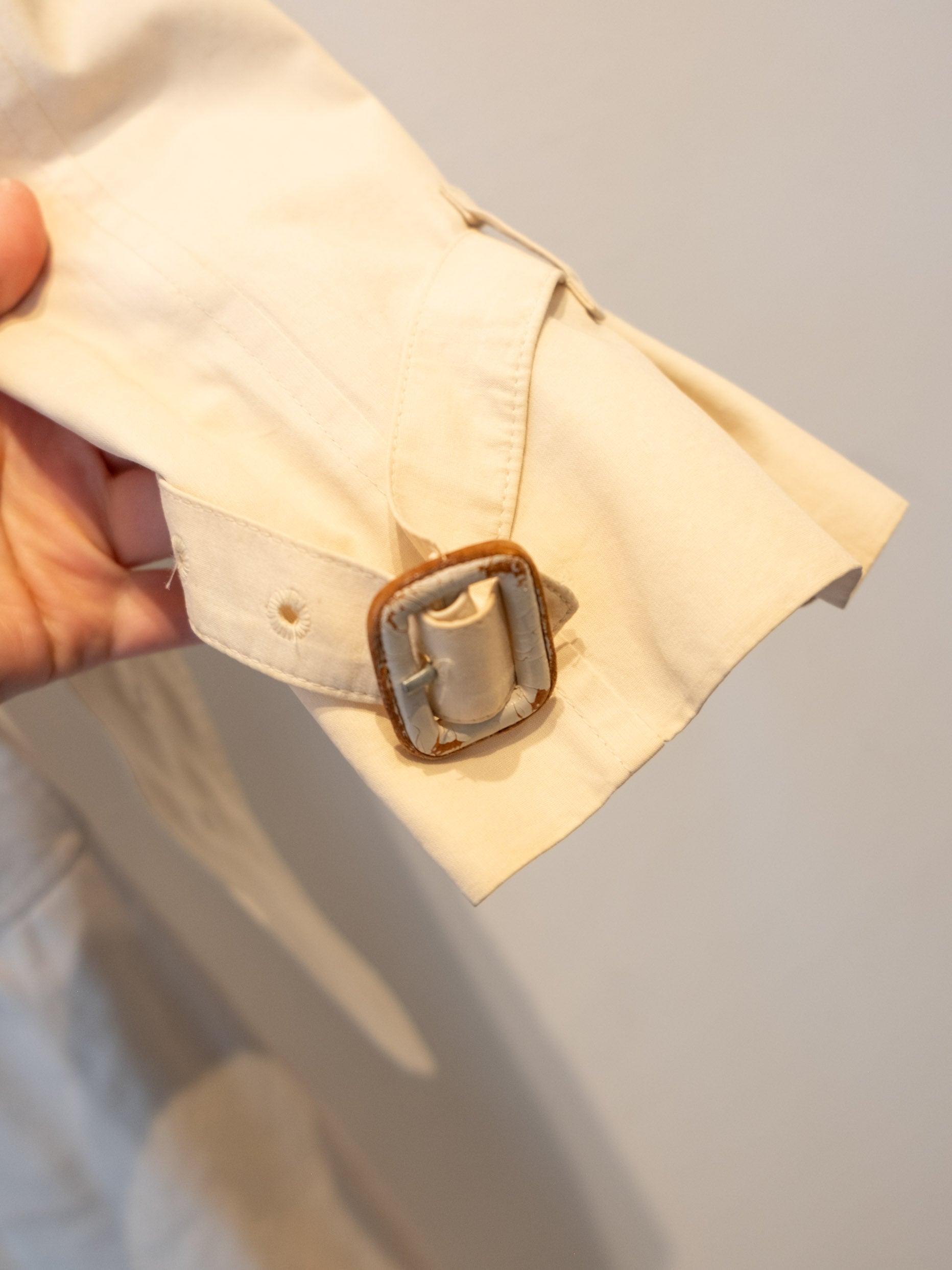 טרנץ׳ קלאסי בצבע בז׳ בהיר הנסגר באמצעות כפתורים וחגורה במותן, בעל שני כיסים צדדים הנסגרים באמצעות כפתור.