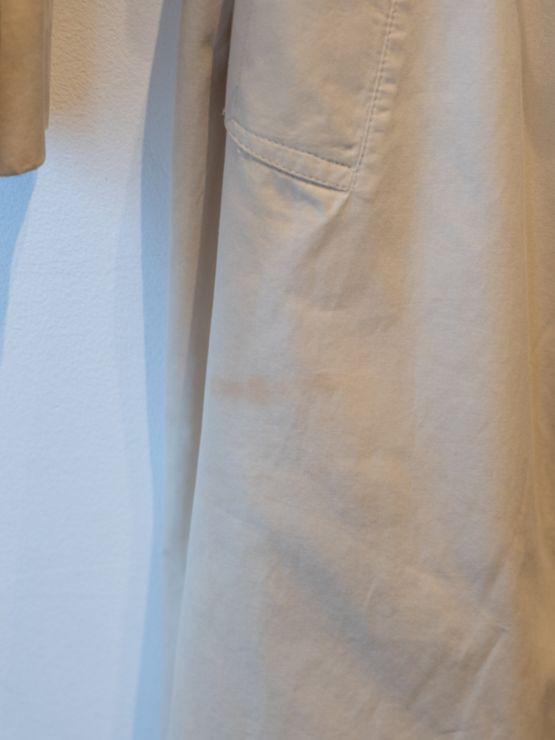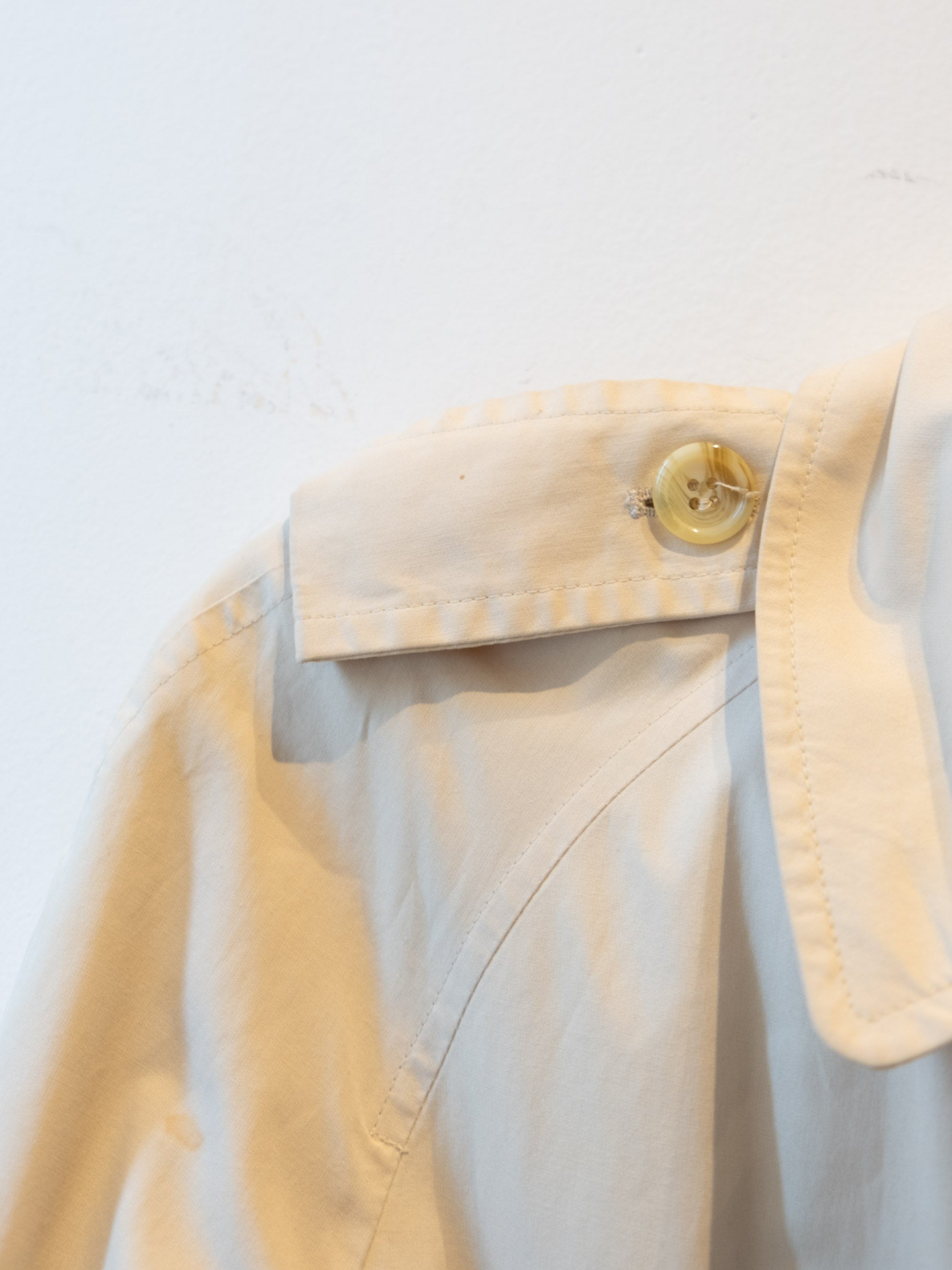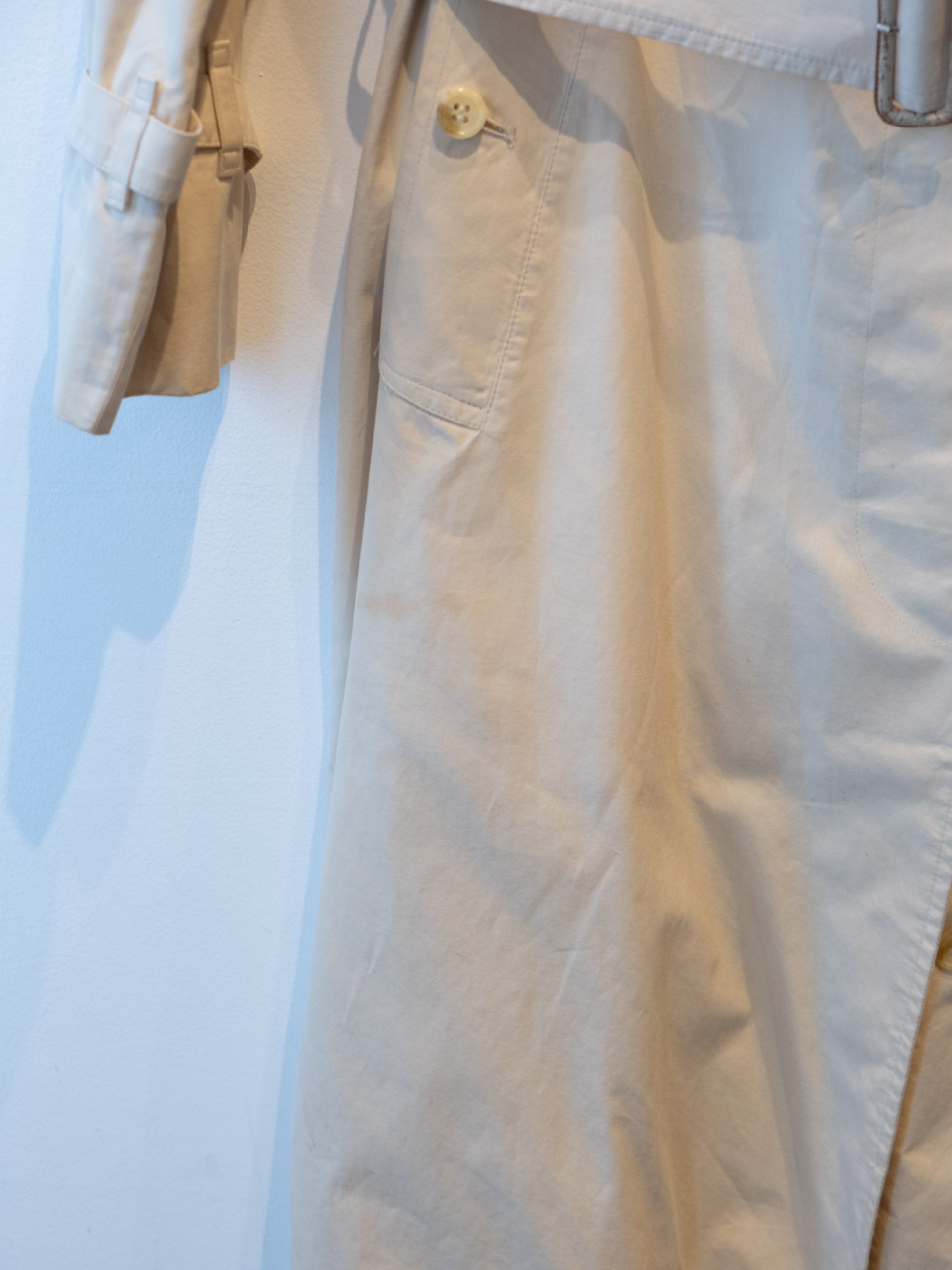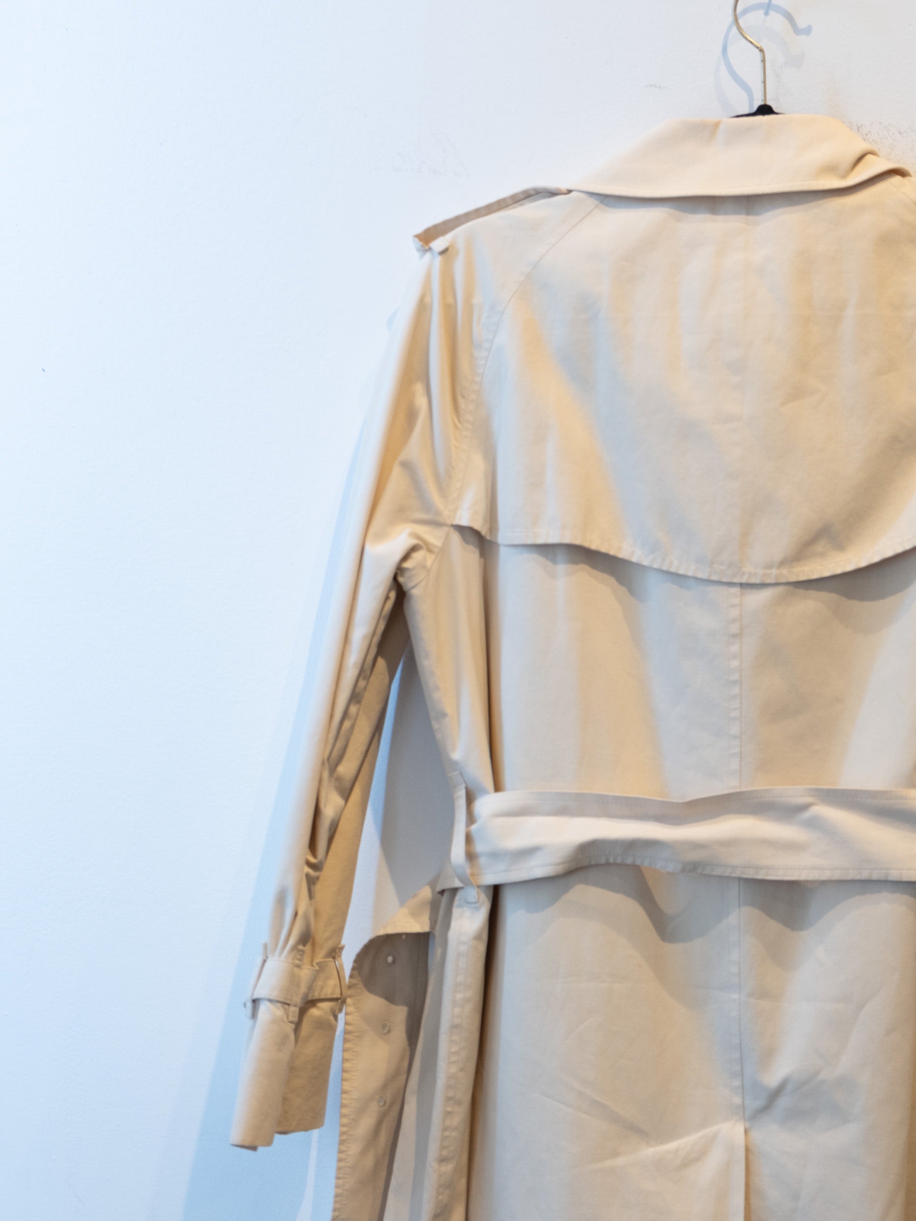 טרנץ׳ קלאסי בצבע בז׳ בהיר הנסגר באמצעות כפתורים וחגורה במותן, בעל שני כיסים צדדים הנסגרים באמצעות כפתור.