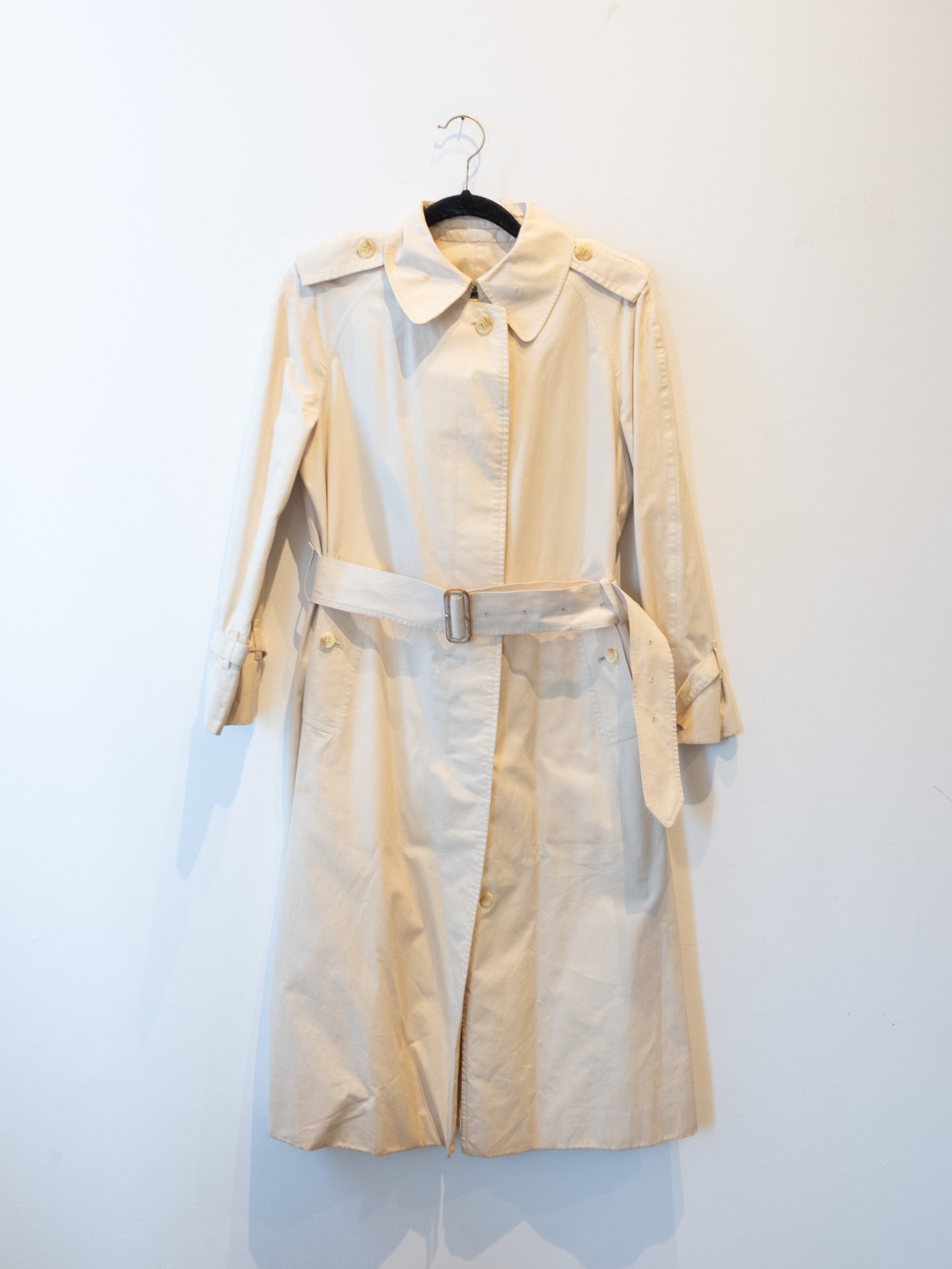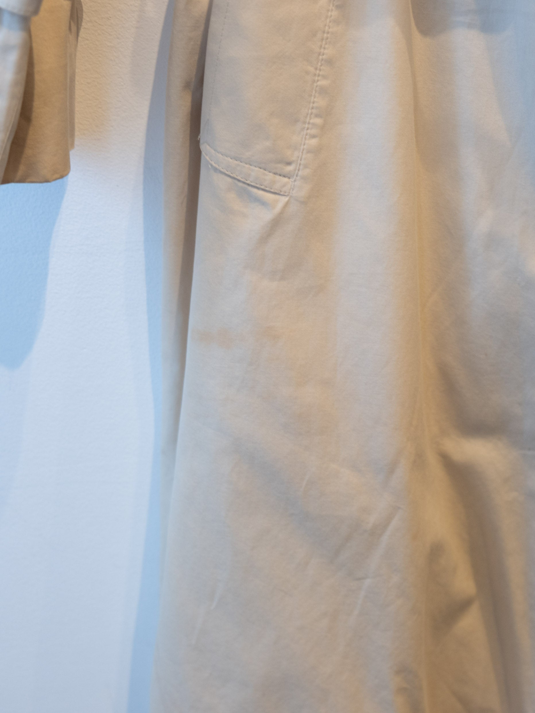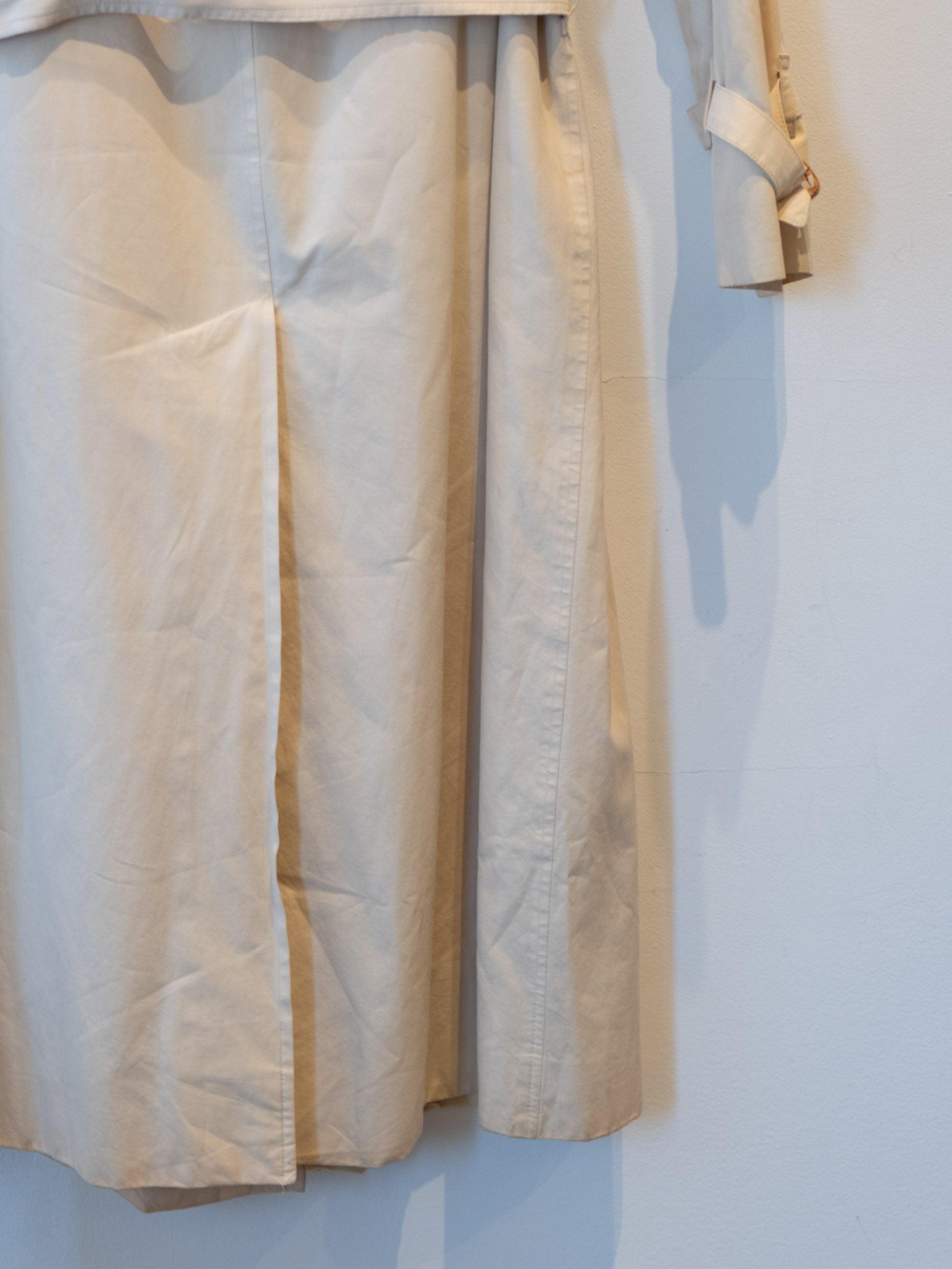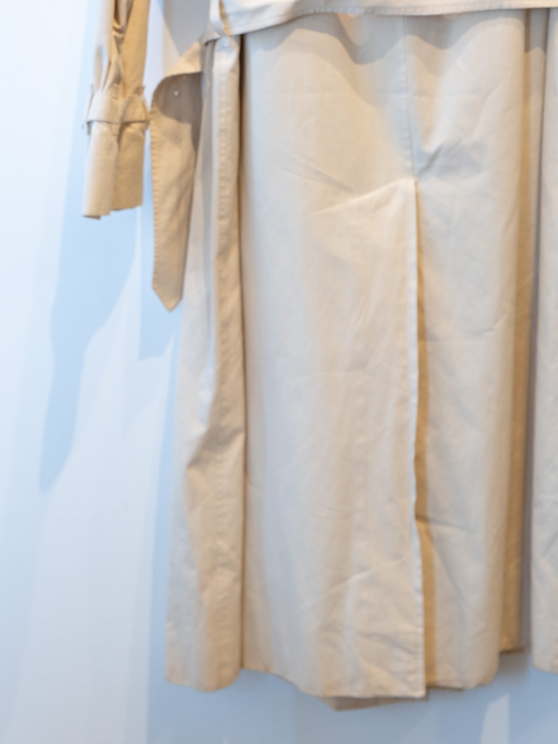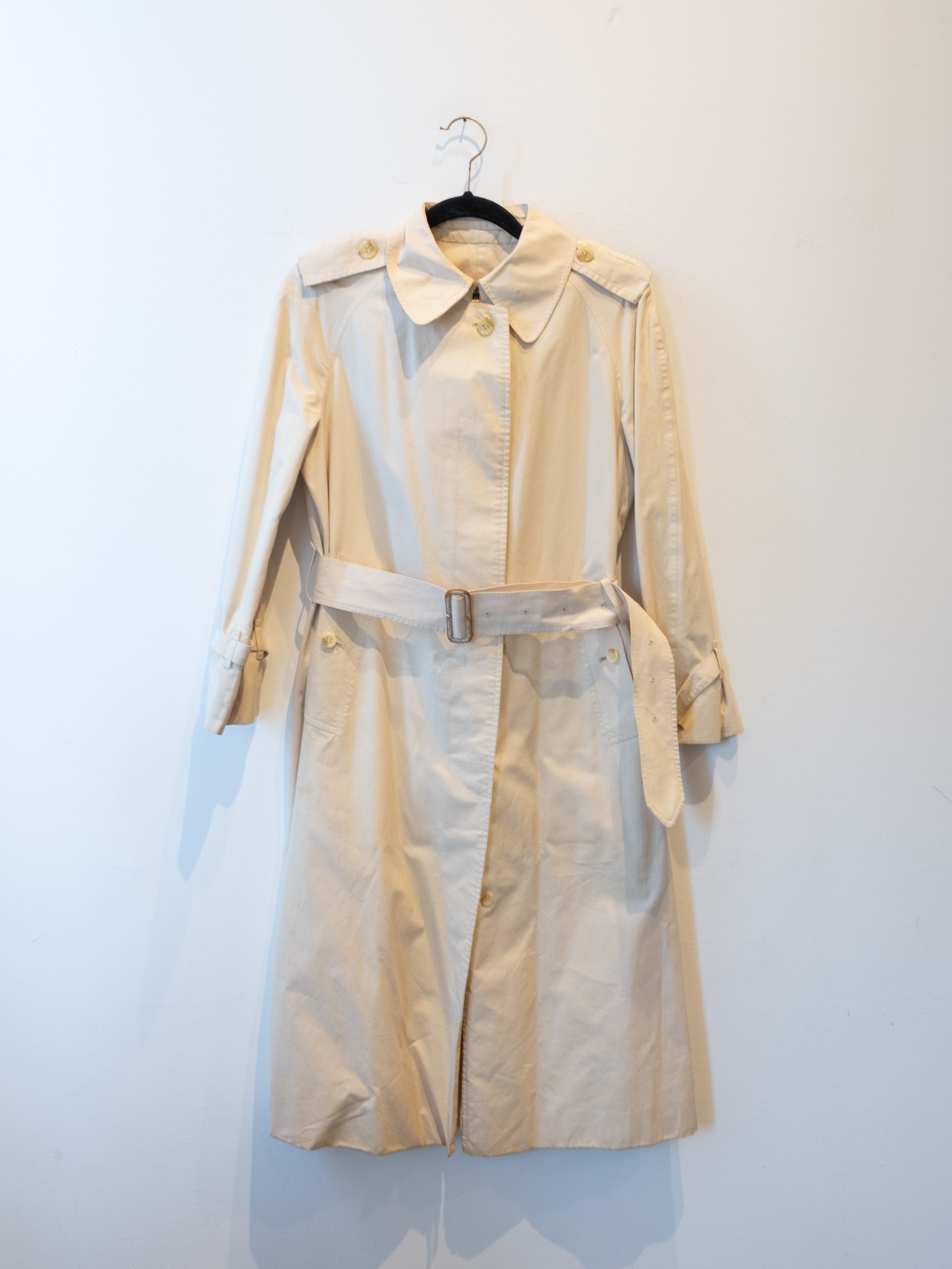 טרנץ׳ קלאסי בצבע בז׳ בהיר הנסגר באמצעות כפתורים וחגורה במותן, בעל שני כיסים צדדים הנסגרים באמצעות כפתור.