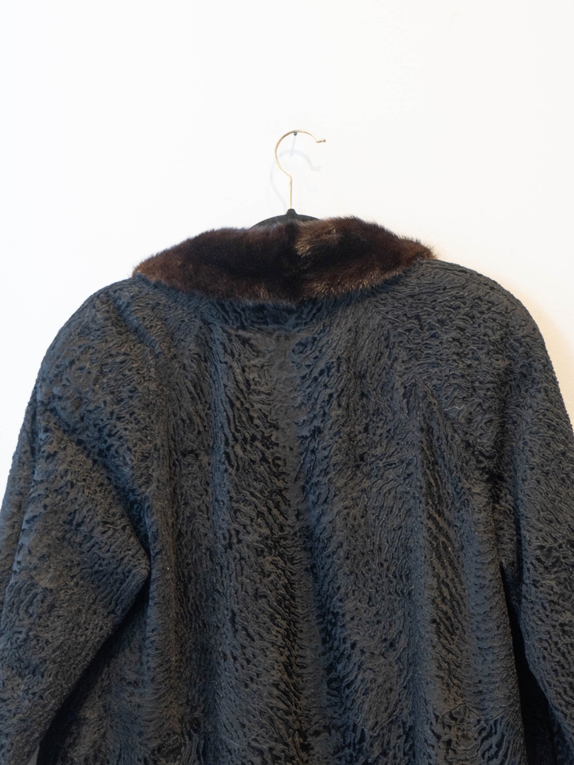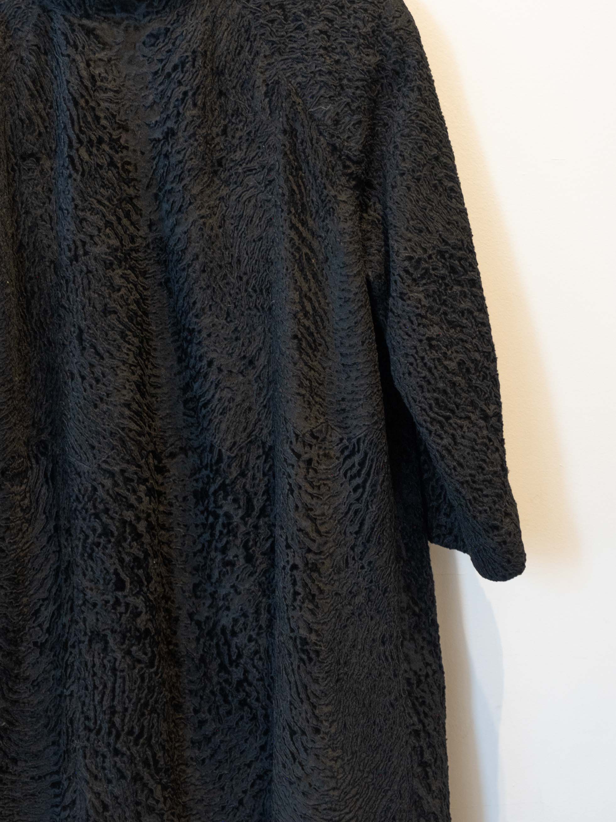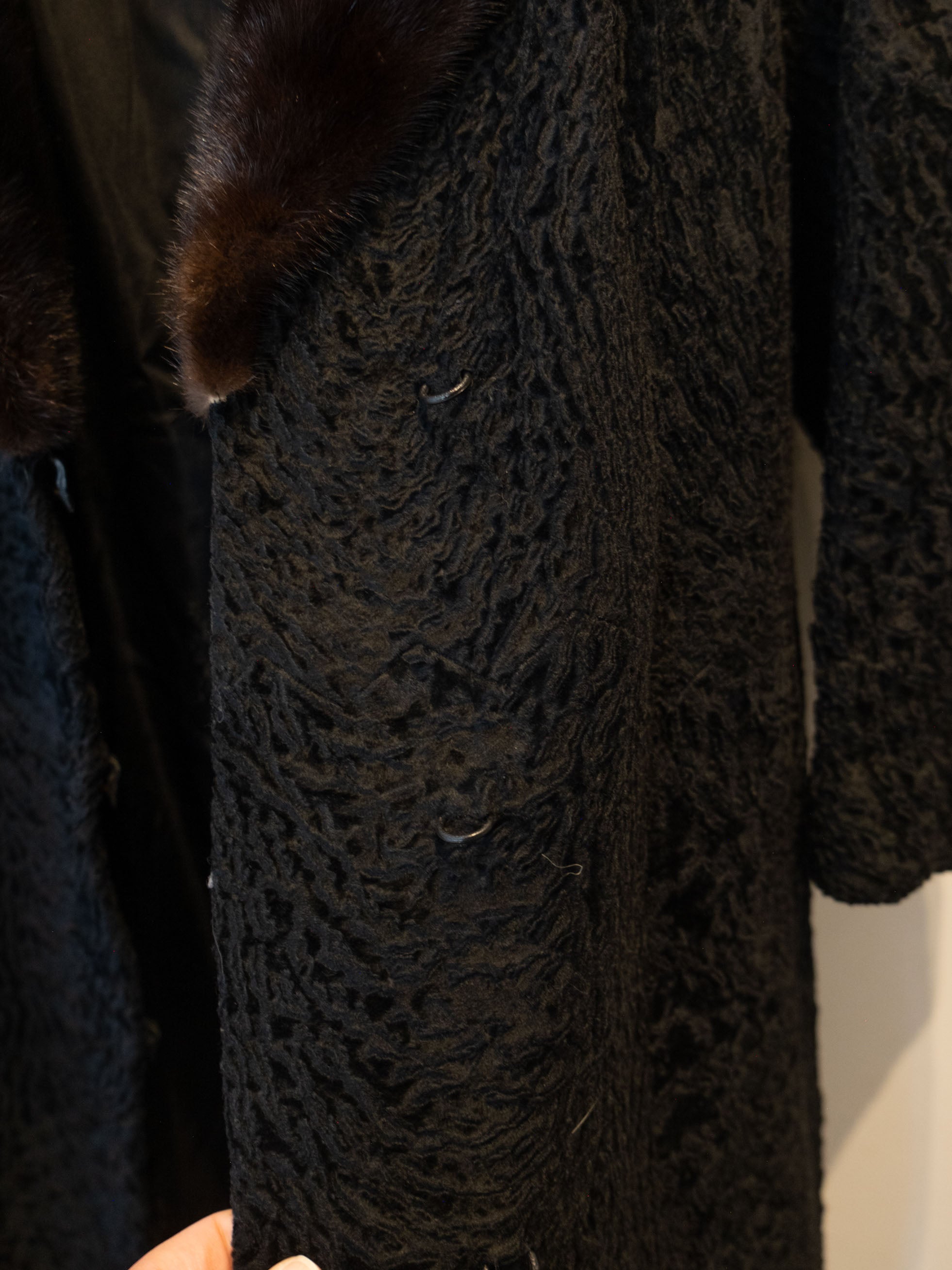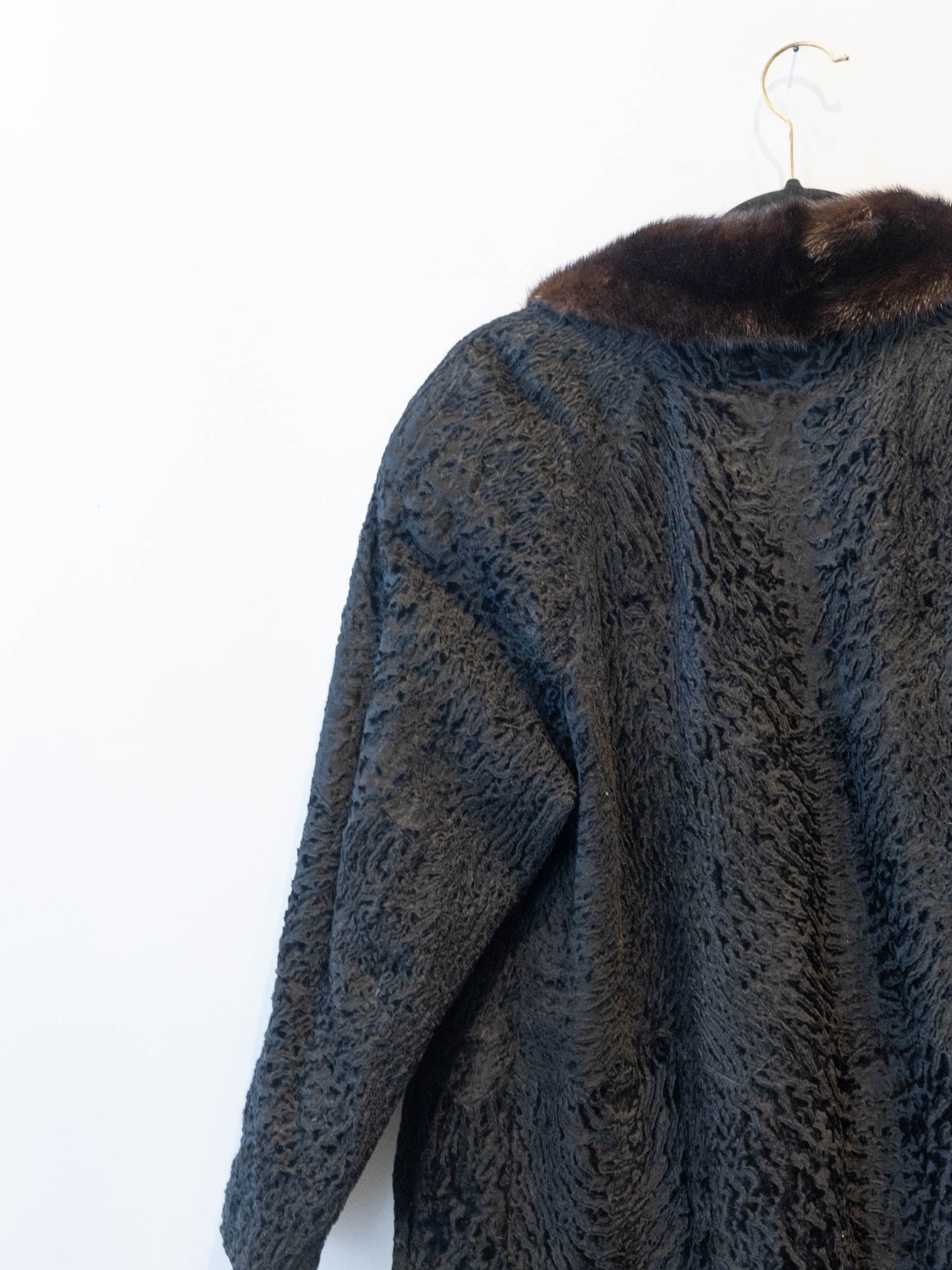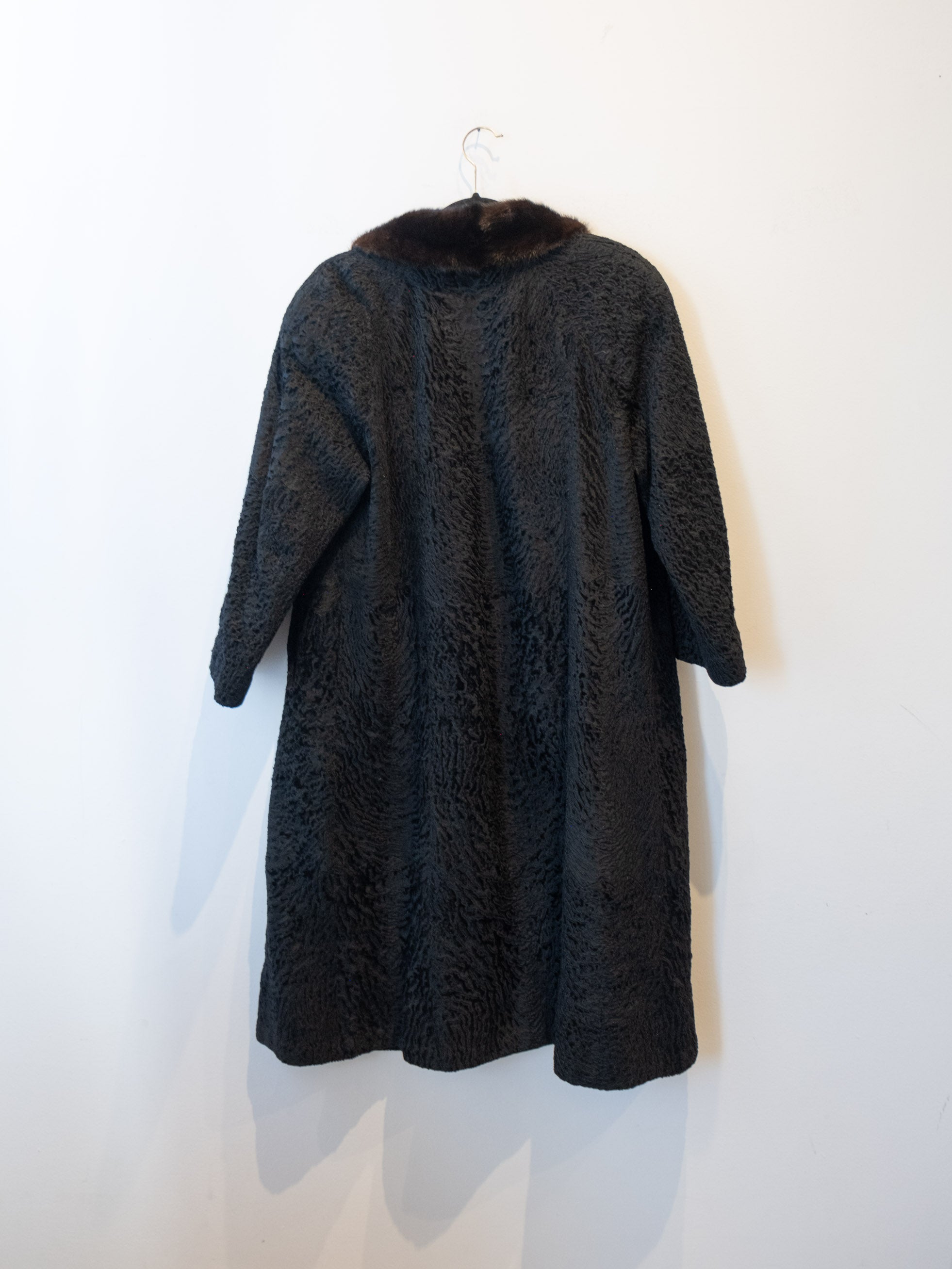 מעיל פרווה בצבע שחור המשולב עם חום כהה הנסגר באמצעות שלושה ווים בחזה, בעל שני כיסים ללא סגירה ושרוולים 7/8.