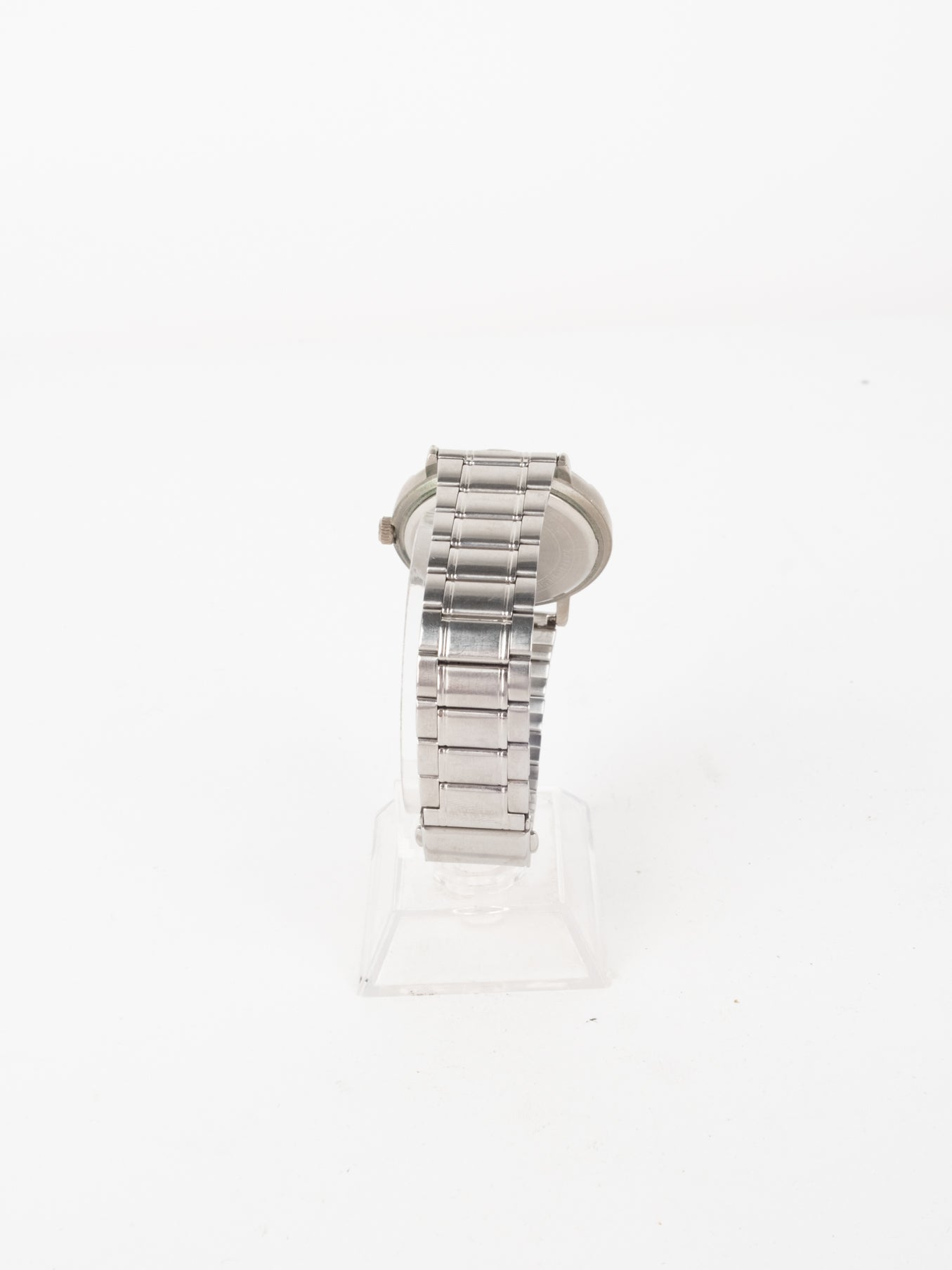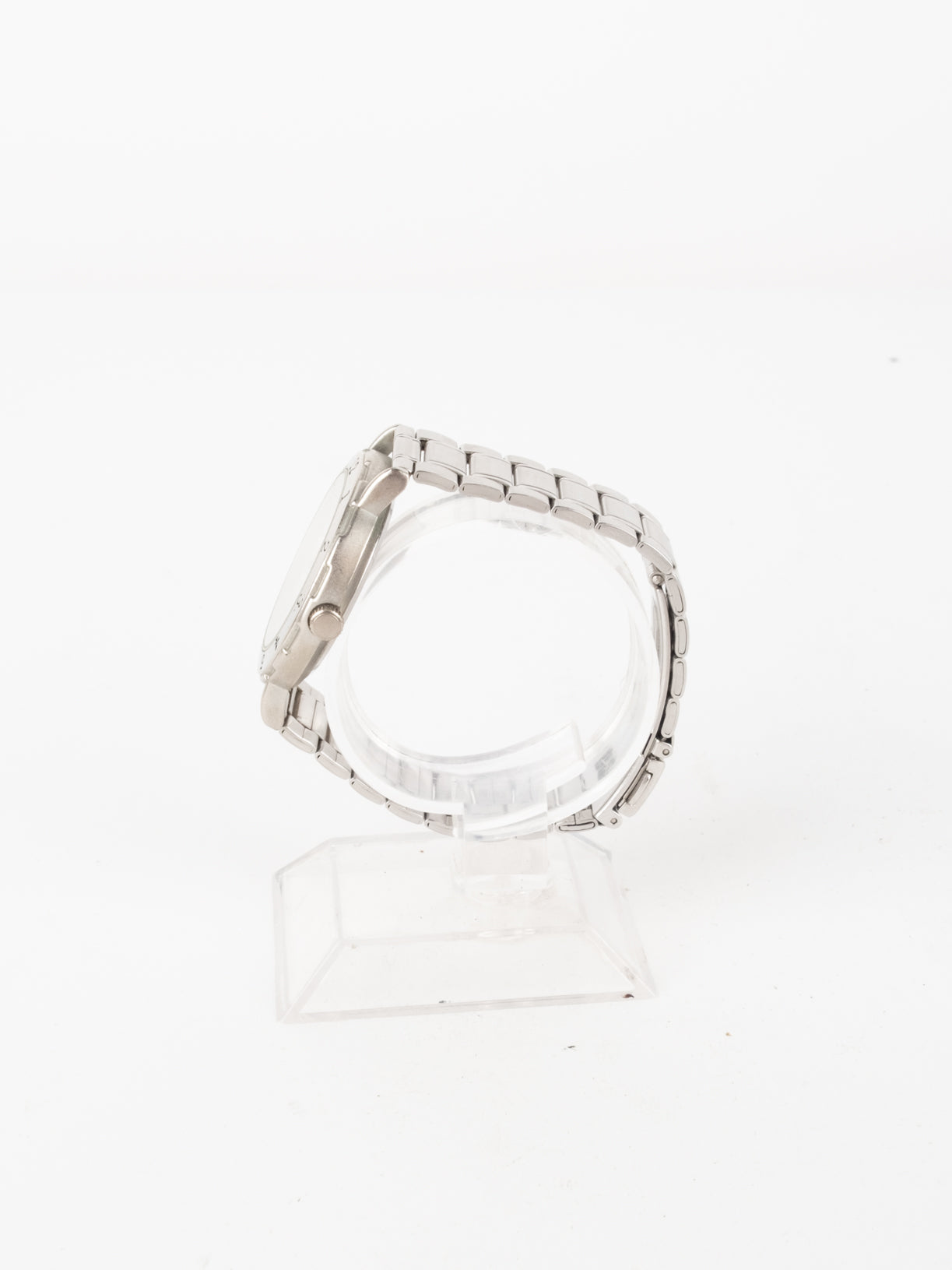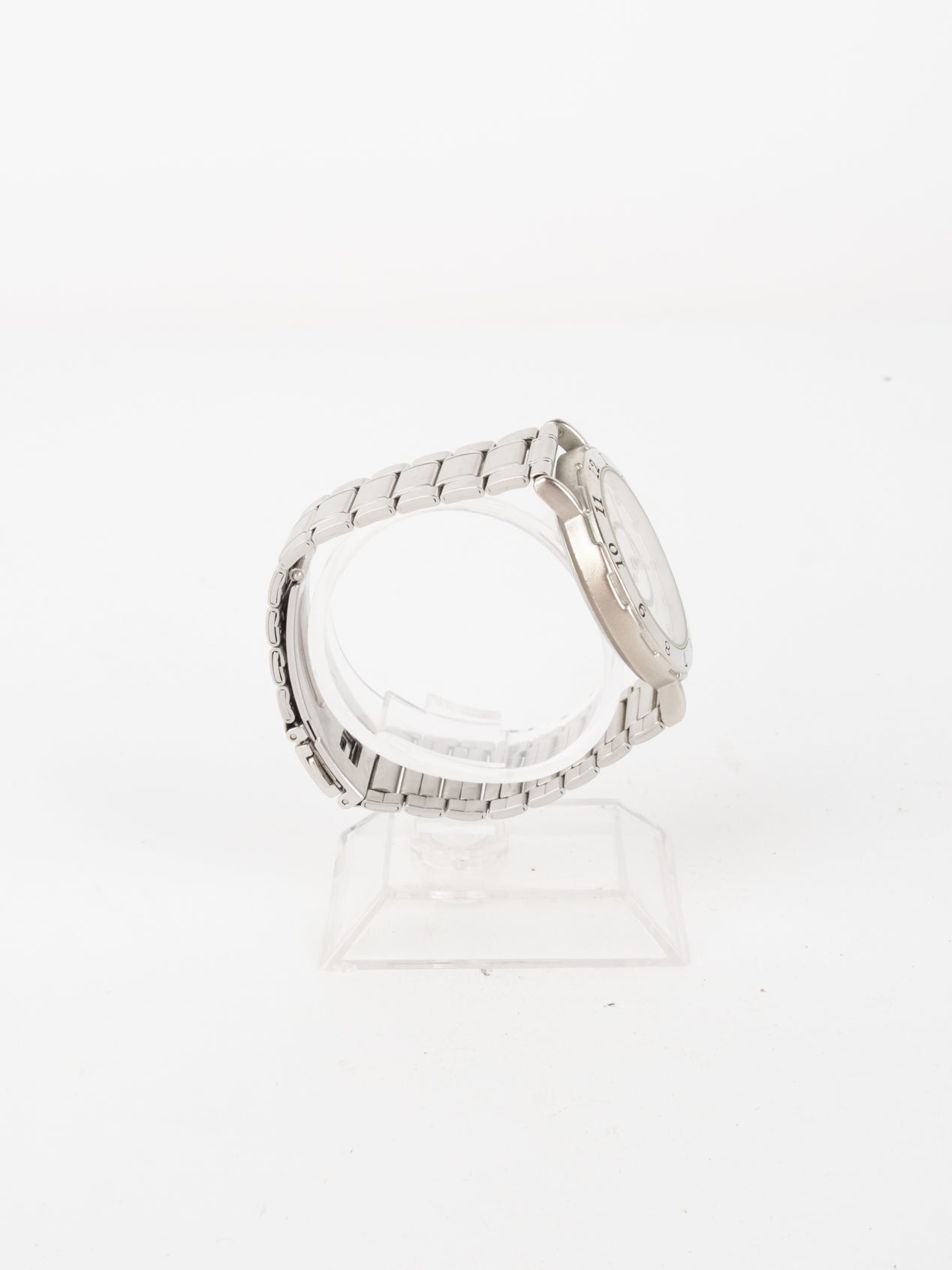 שעון מסיבי בסגנון ספורטיבי בצבע כסוף, בעל פני שעון בצורה עגולה עם רקע לבן ומחוגים. שעון זה נסגר באמצעות סוגר ממותג.