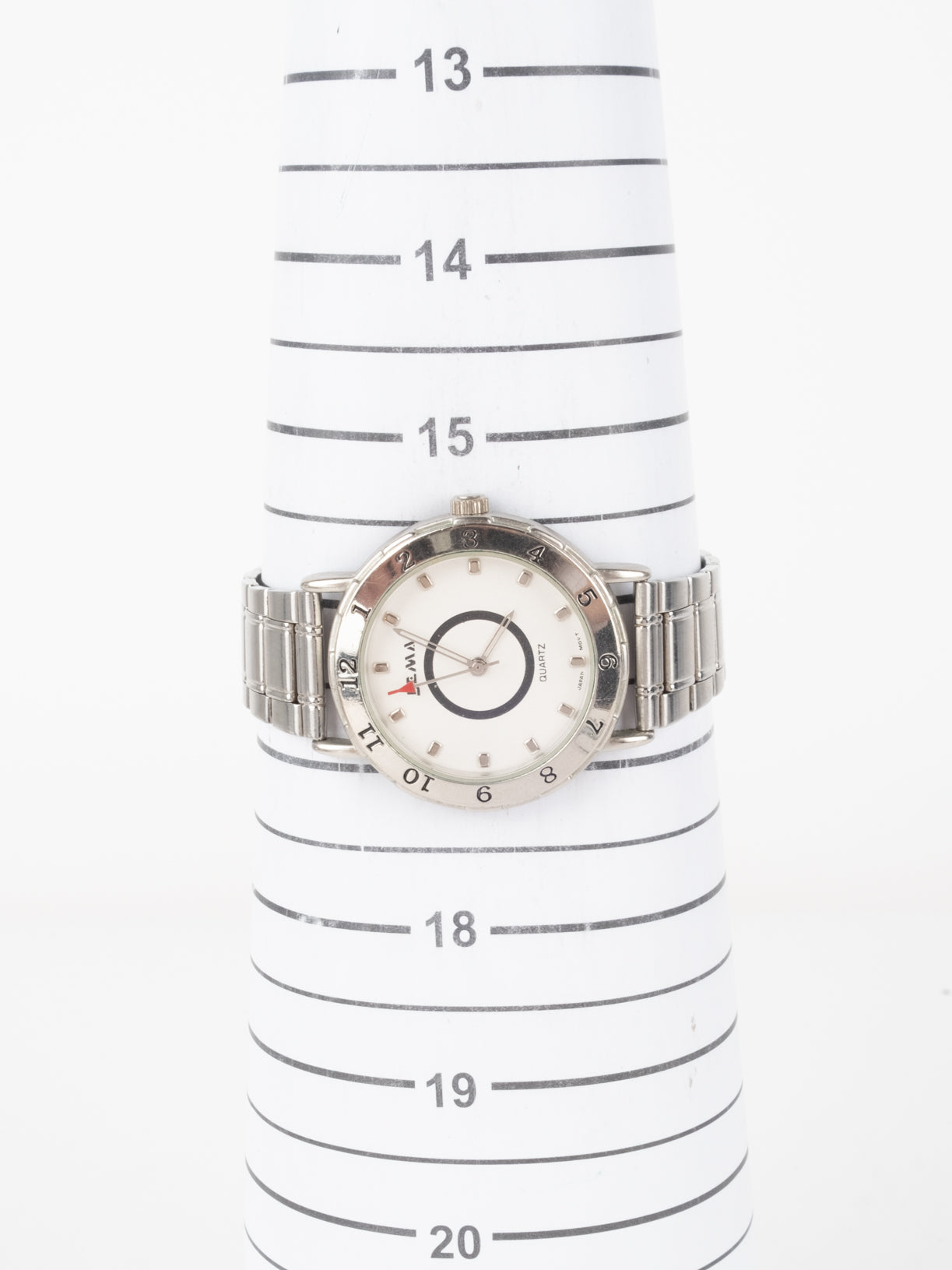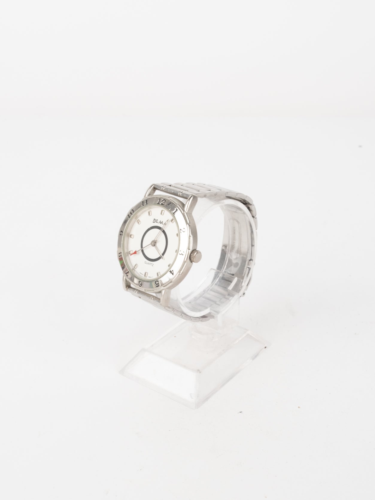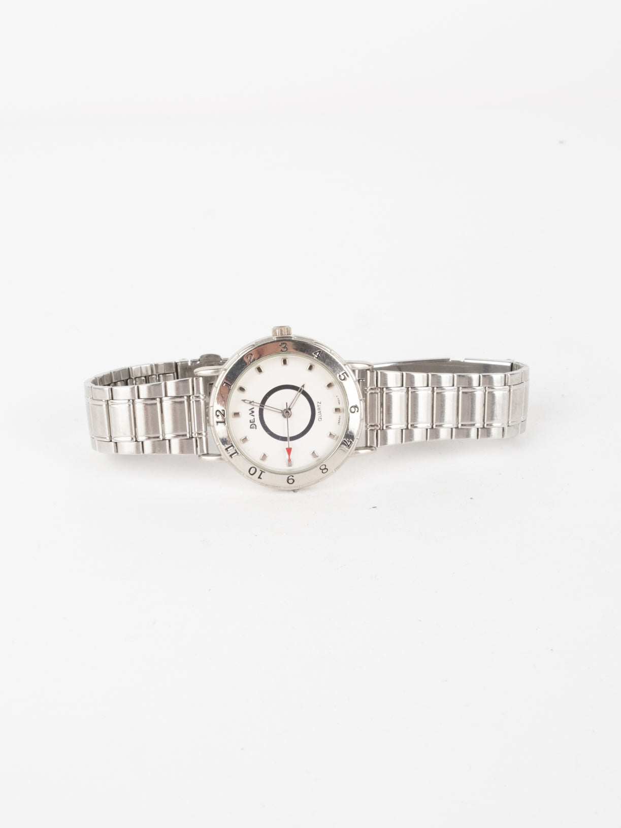 שעון מסיבי בסגנון ספורטיבי בצבע כסוף, בעל פני שעון בצורה עגולה עם רקע לבן ומחוגים. שעון זה נסגר באמצעות סוגר ממותג.