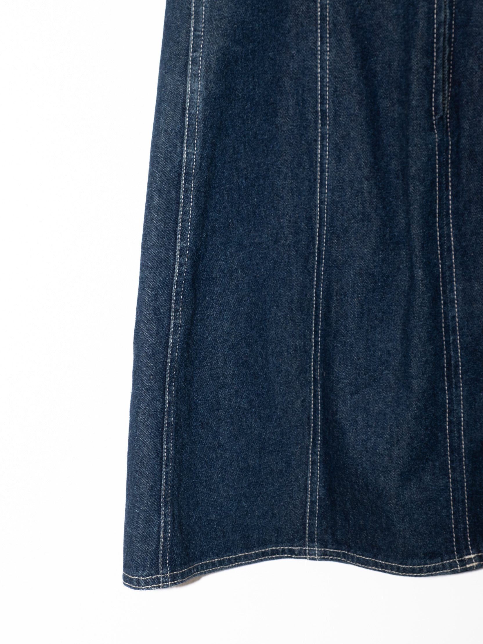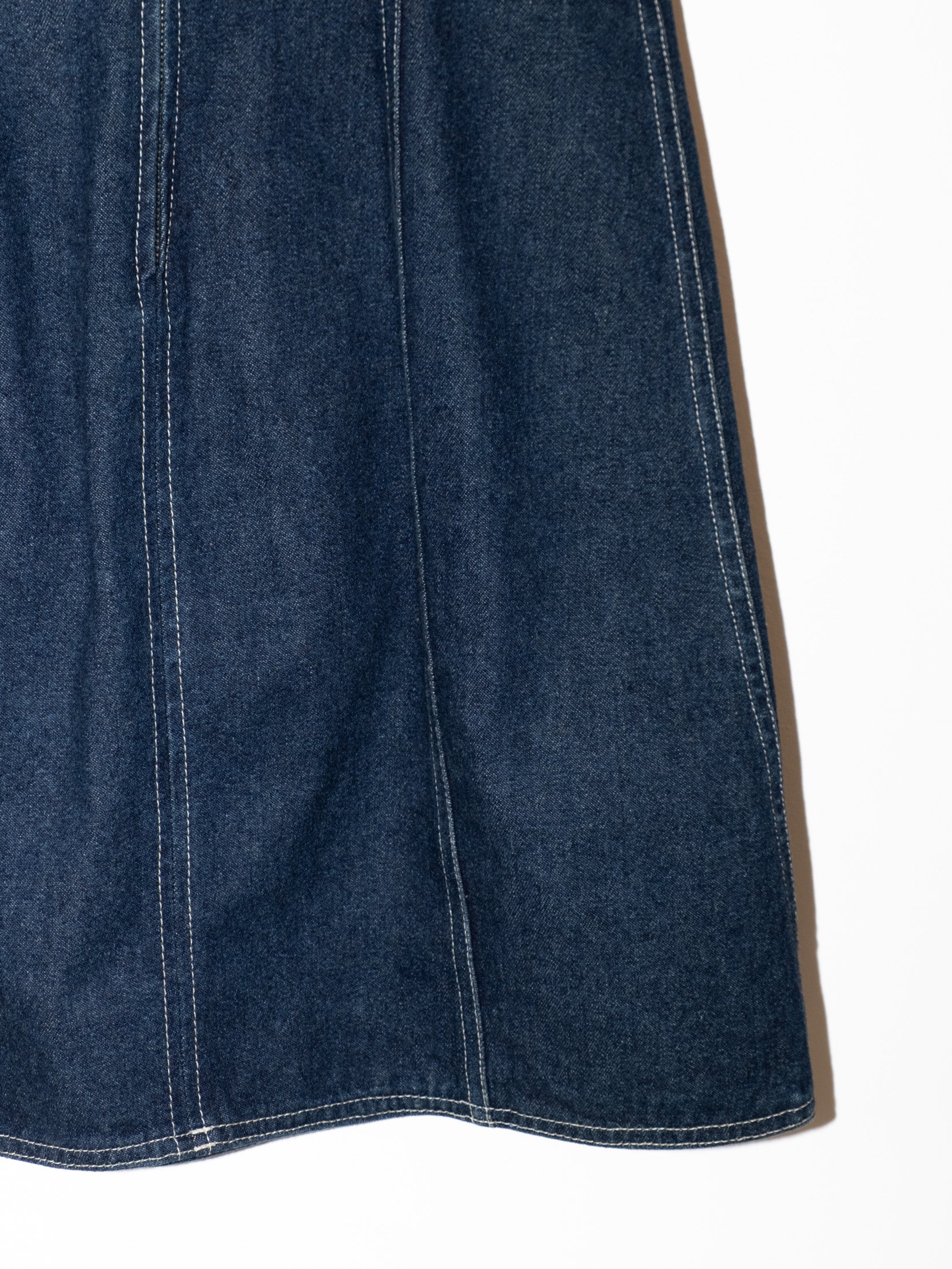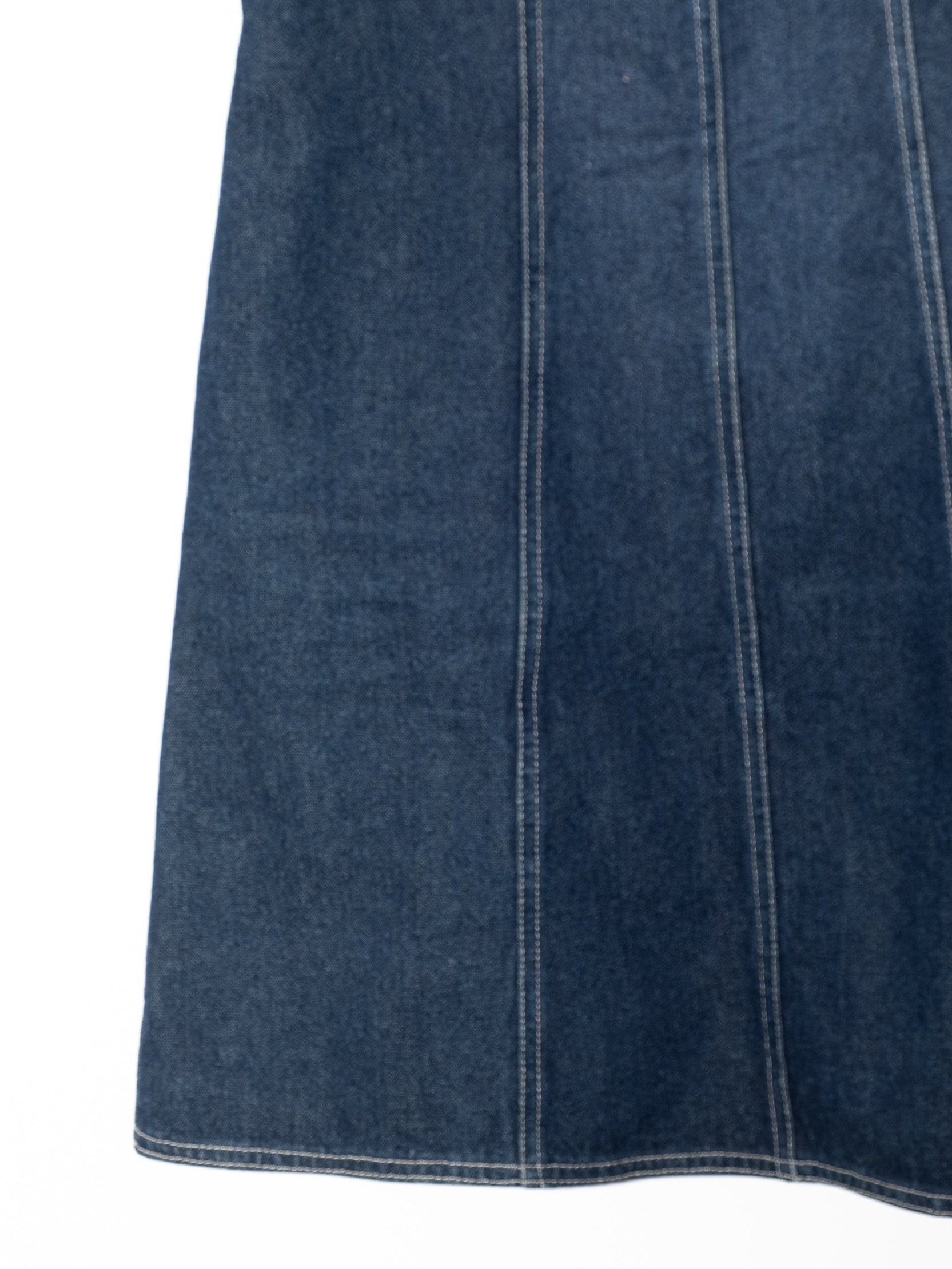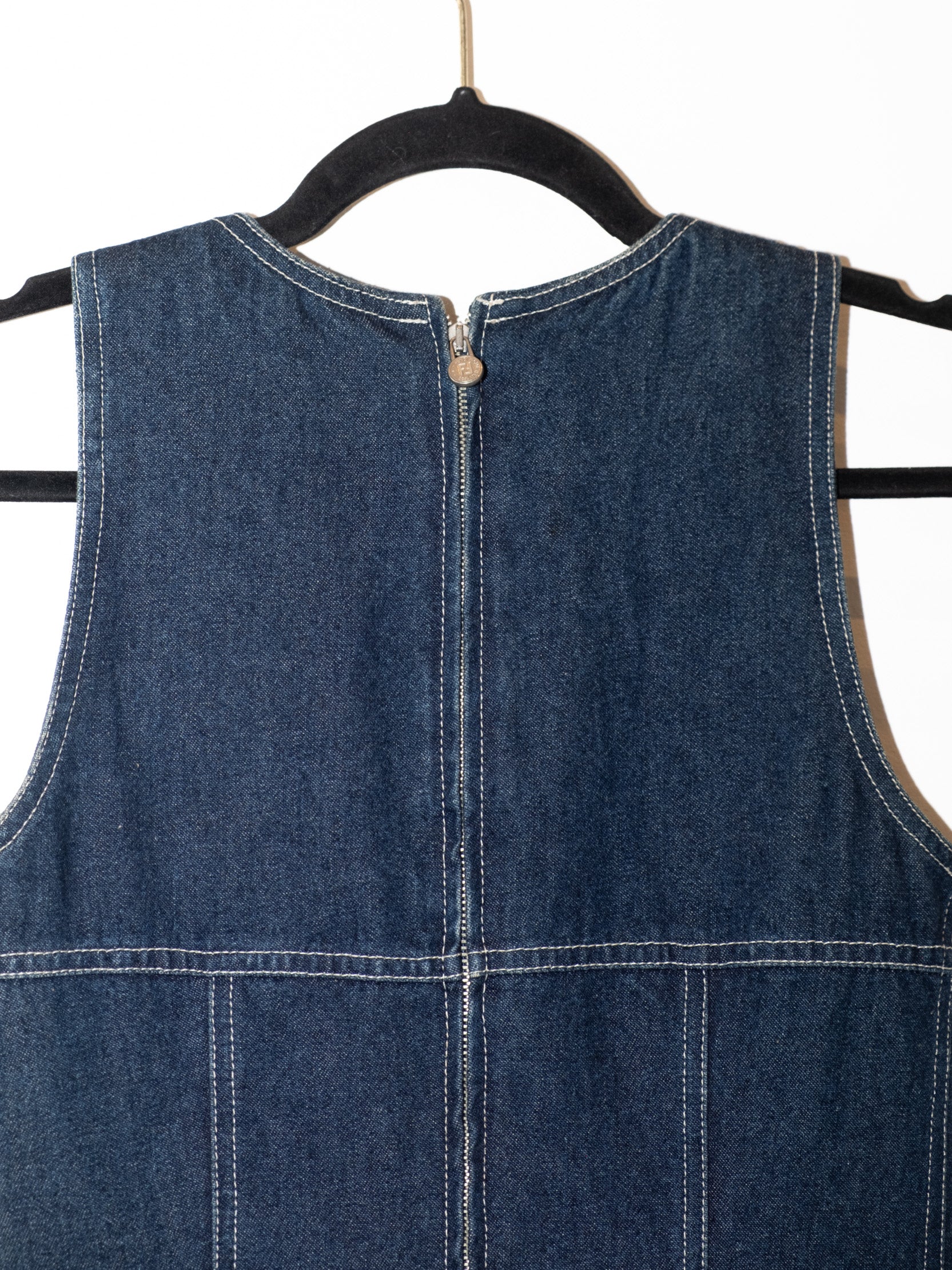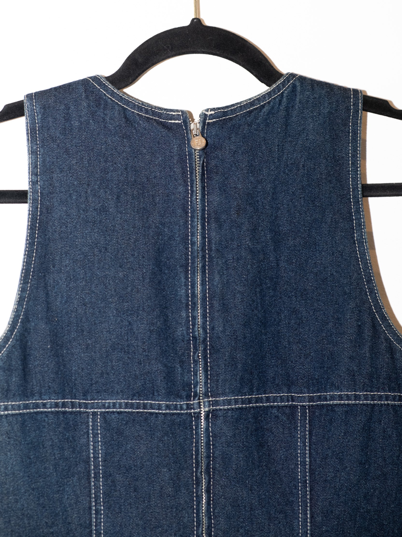 שמלת ג'ינס בצבע כחול ללא שרוולים בגזרה צמודה.