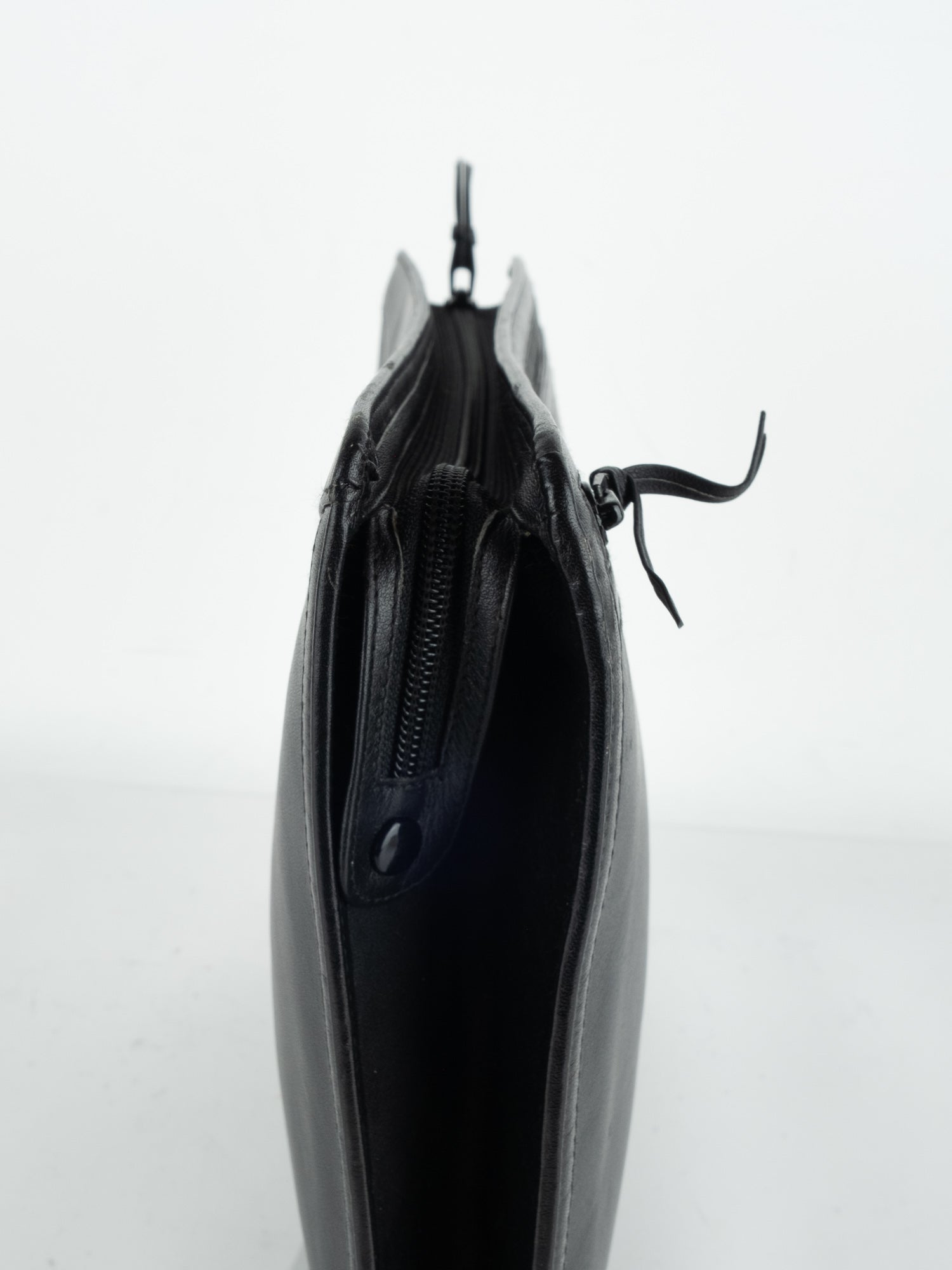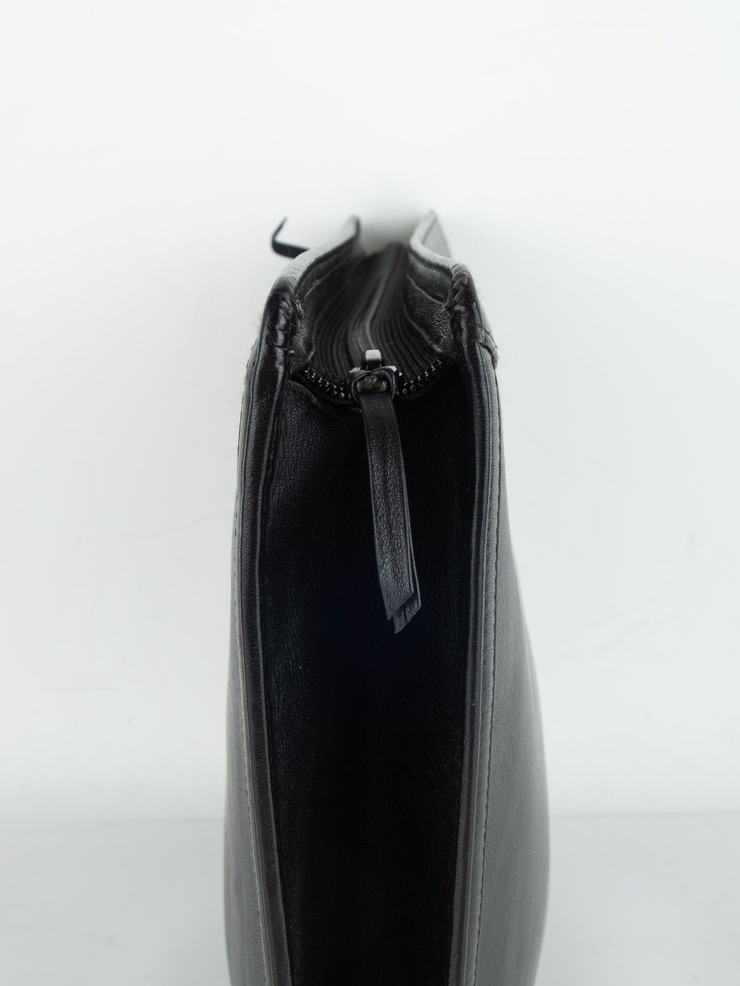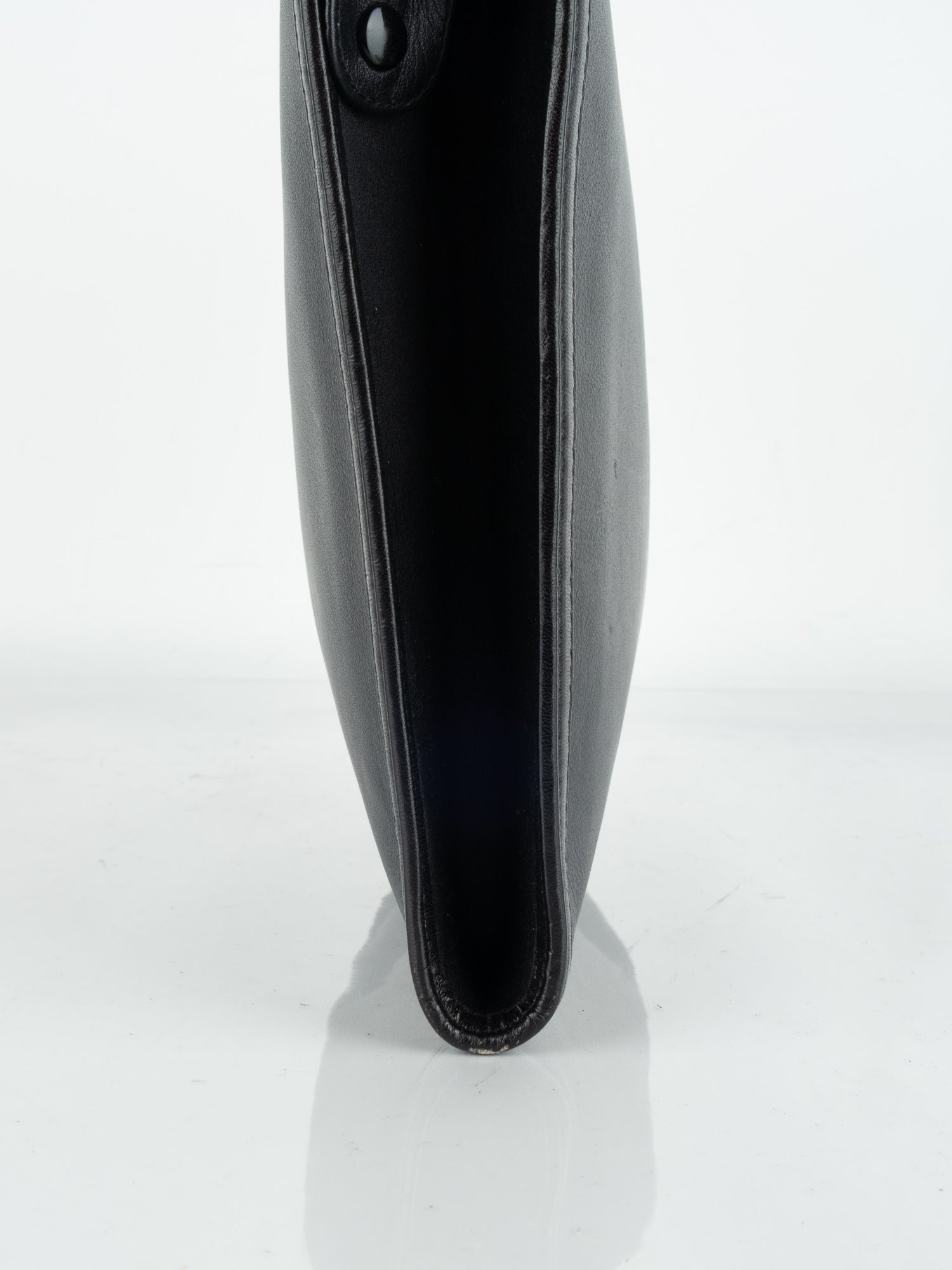 התיק עשוי עור שחור חלק במרקם טבעי. גזרת מעטפה עם סגירת כפתור קדמית. פנים מרופד ונוח לנשיאה של פריטים קטנים ואישיים.