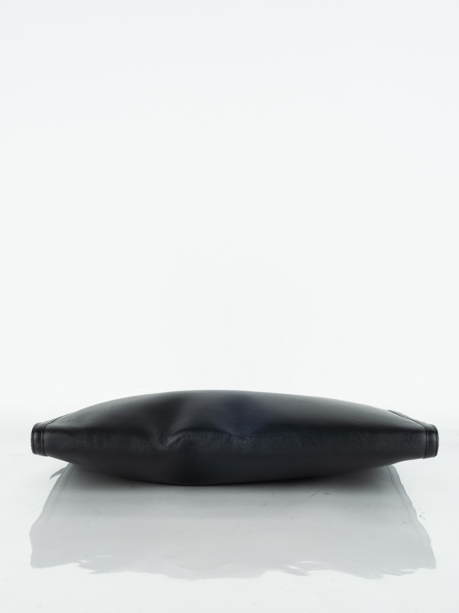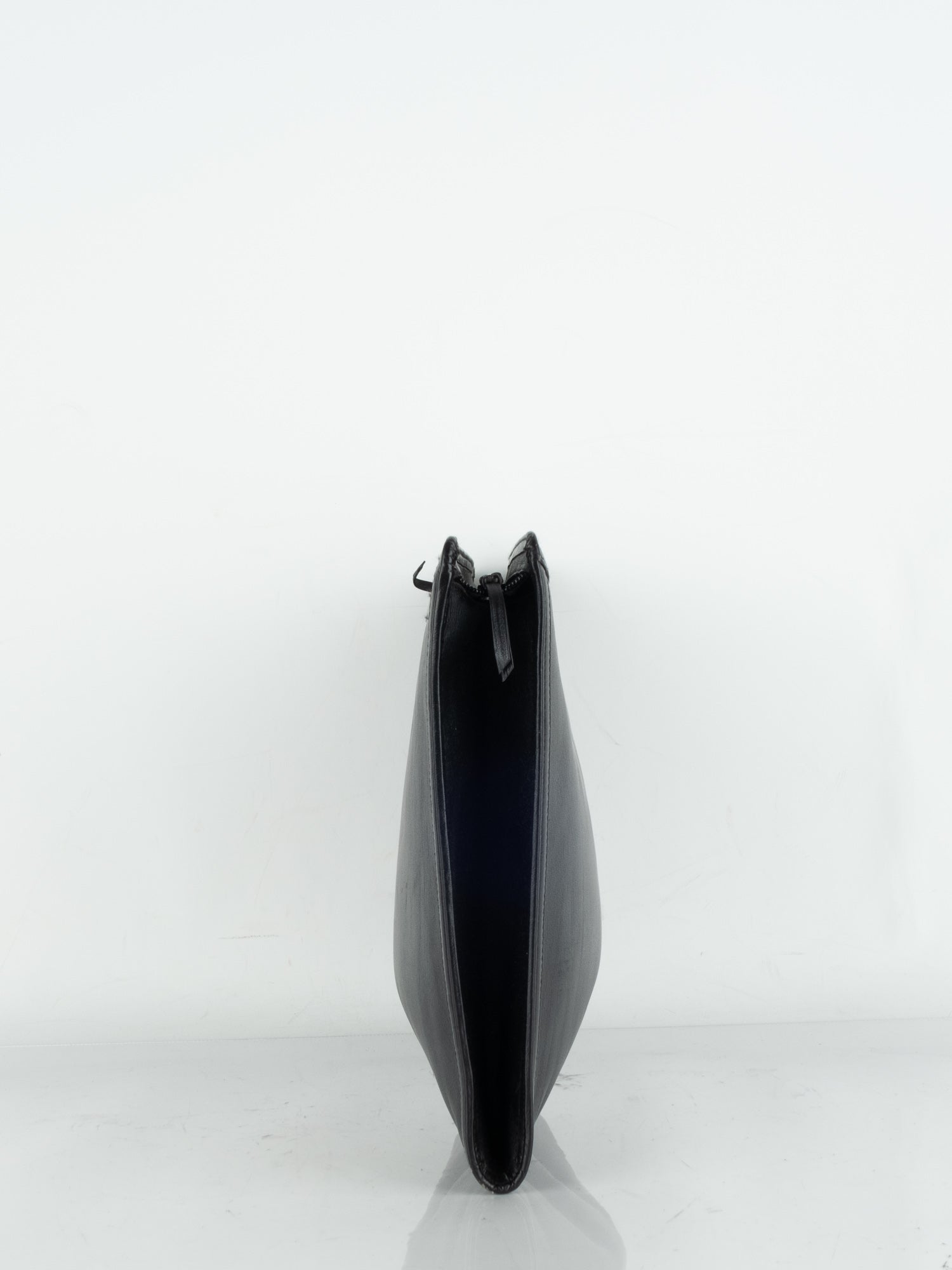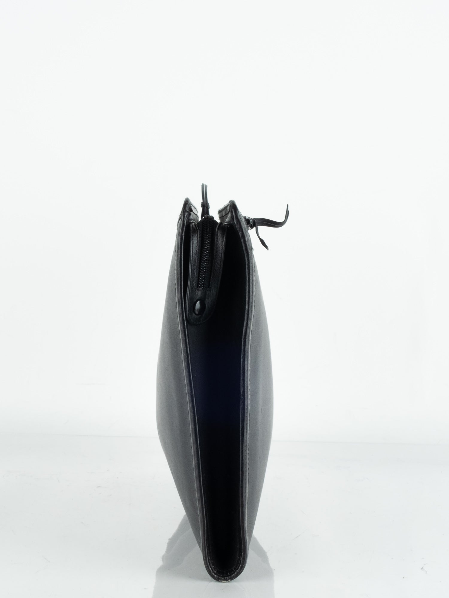 התיק עשוי עור שחור חלק במרקם טבעי. גזרת מעטפה עם סגירת כפתור קדמית. פנים מרופד ונוח לנשיאה של פריטים קטנים ואישיים.