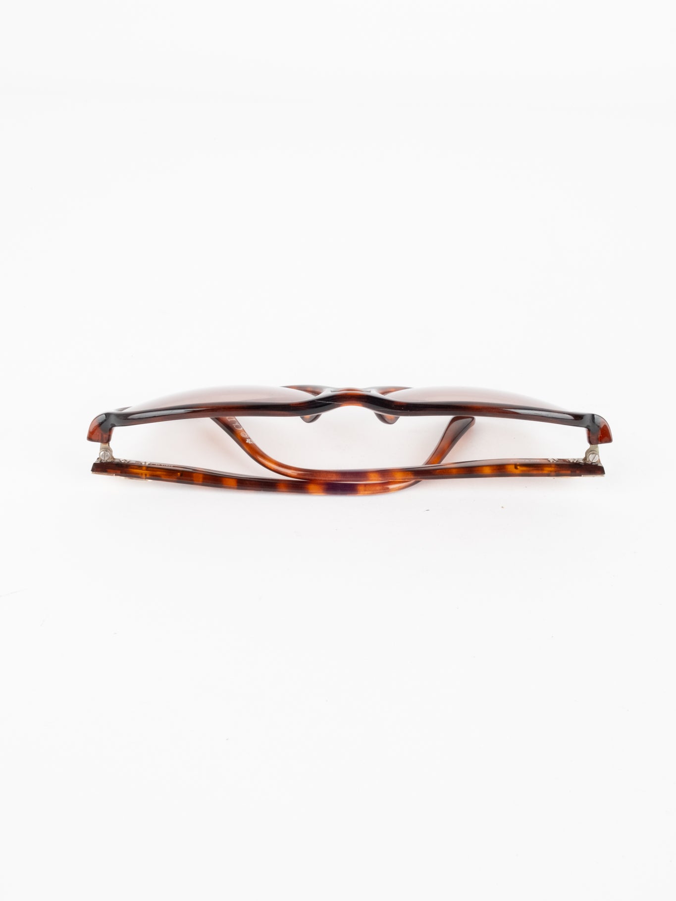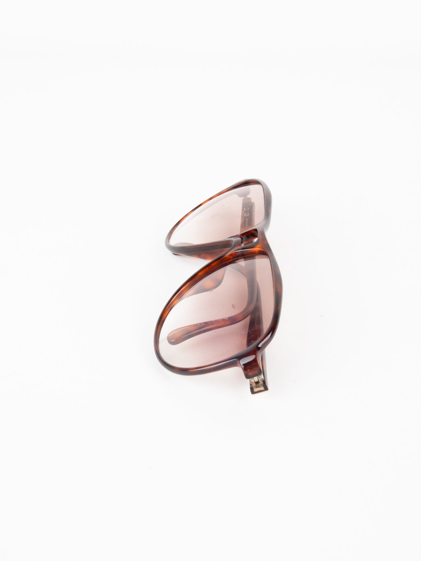 משקפי שמש מהממות בעלות עדשות גדולות כהות עם מסגרת חומה מנומר כאשר בצידי המשקפיים ישנו סמל המותג מוזהב.