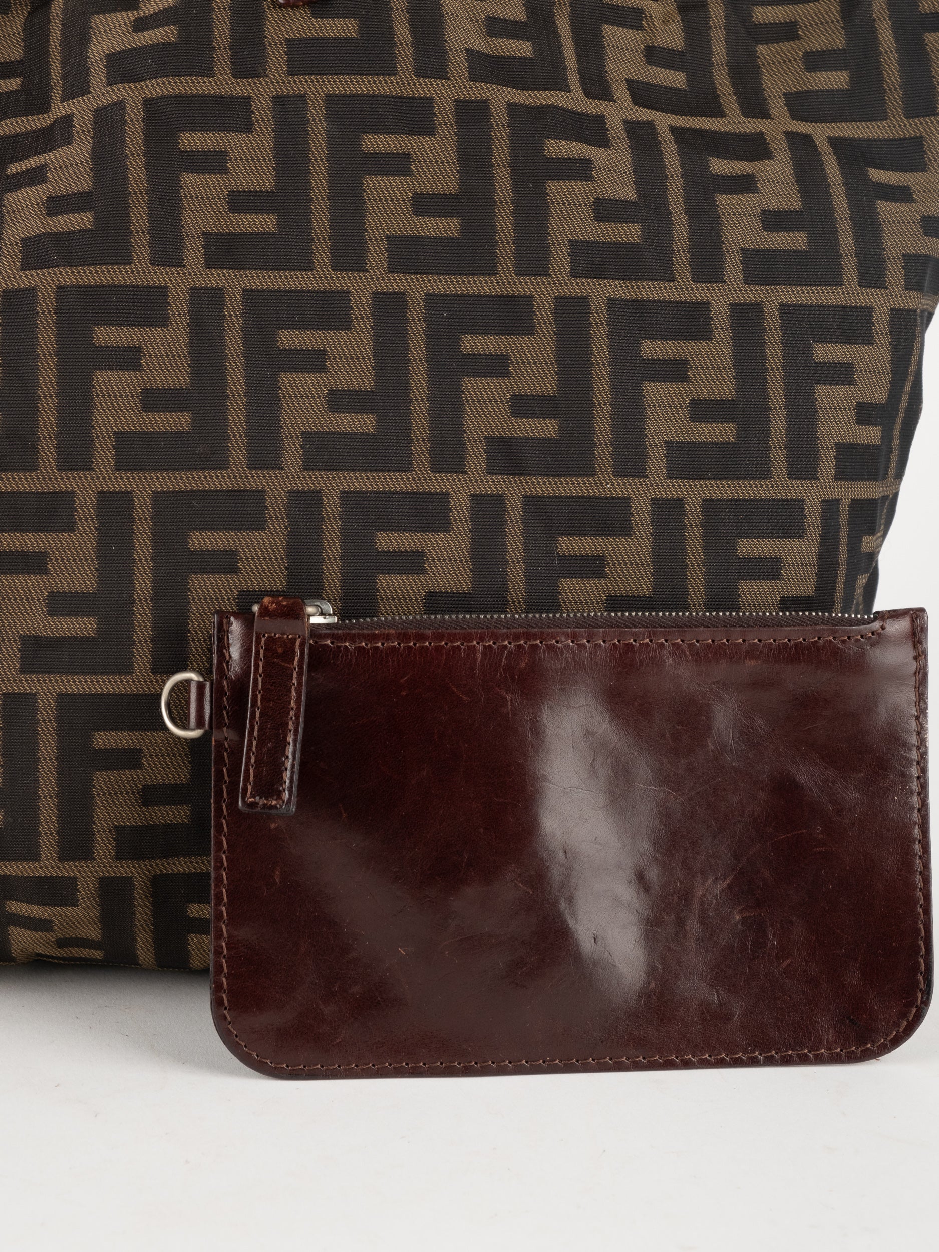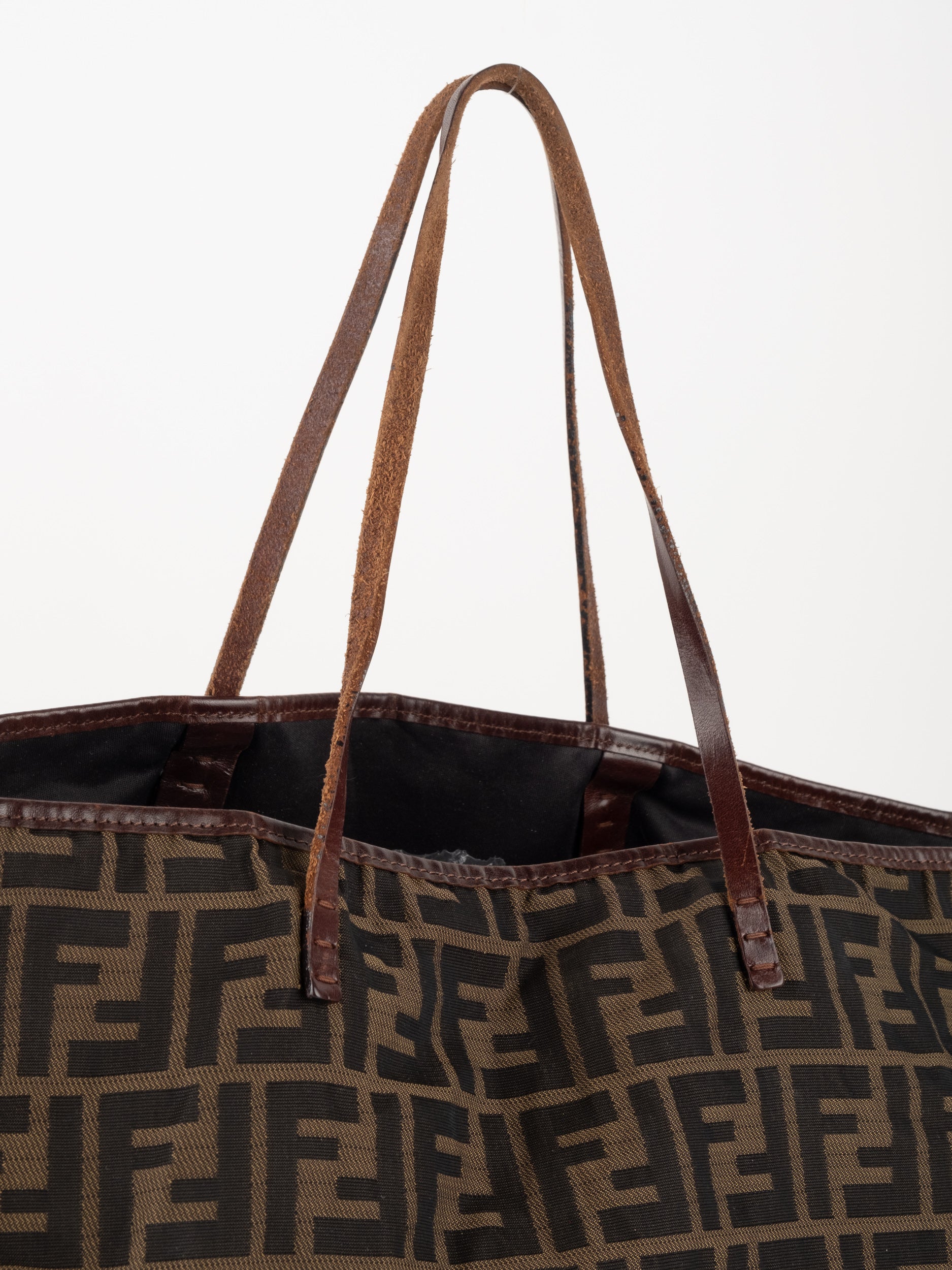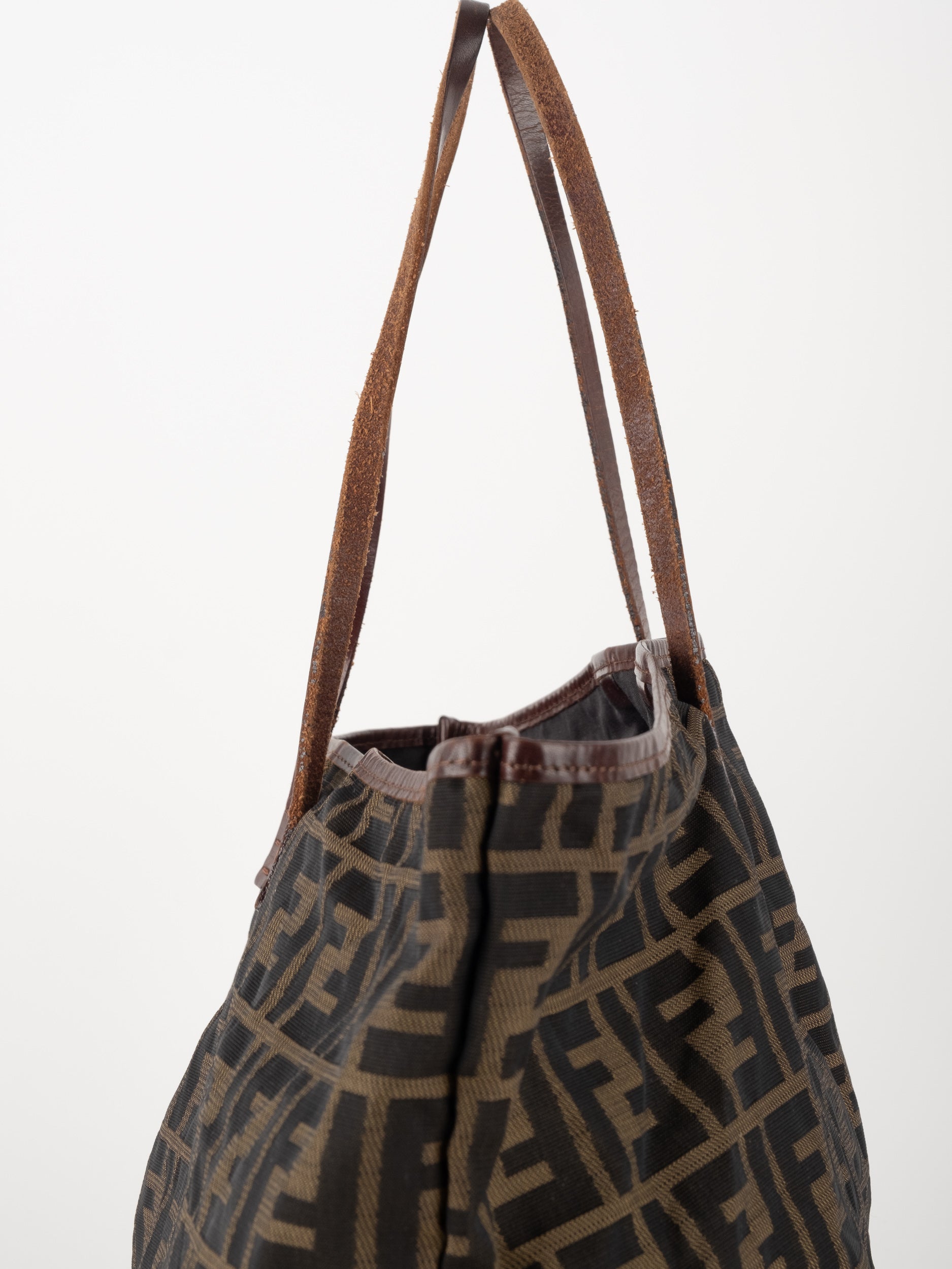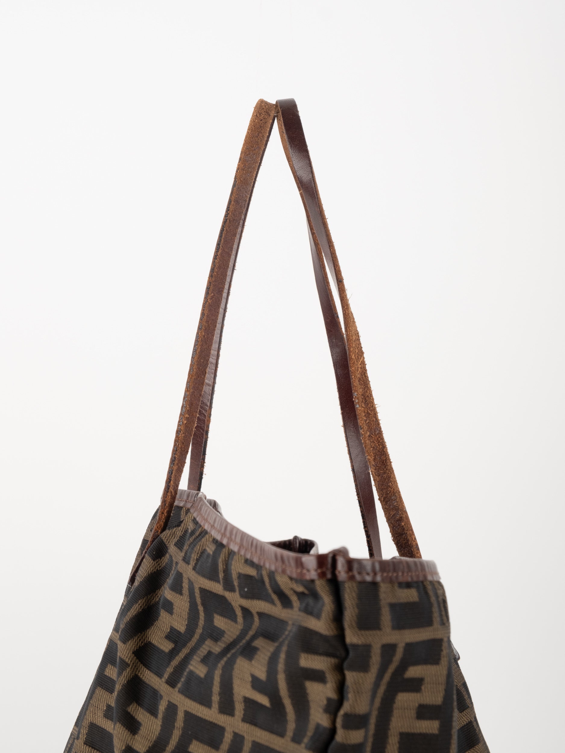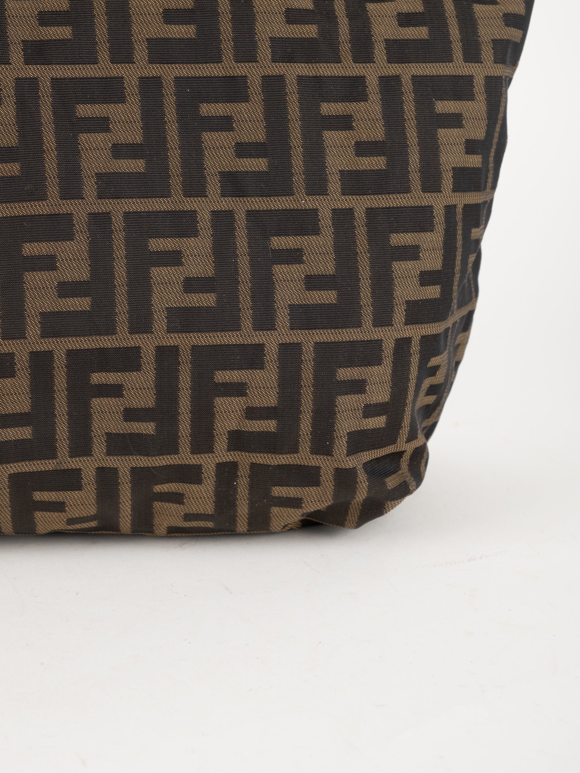 התיק עשוי קנבס בדוגמת Zucca בגווני חום ושחור, עם ידיות כתף ארוכות בגוון חום לנשיאה נוחה על הכתף. מבנה פתוח ומרווח המאפשר אחסון פריטים יומיומיים בקלות. כולל פאוץ' נלווה הנסגר ברוכסן.