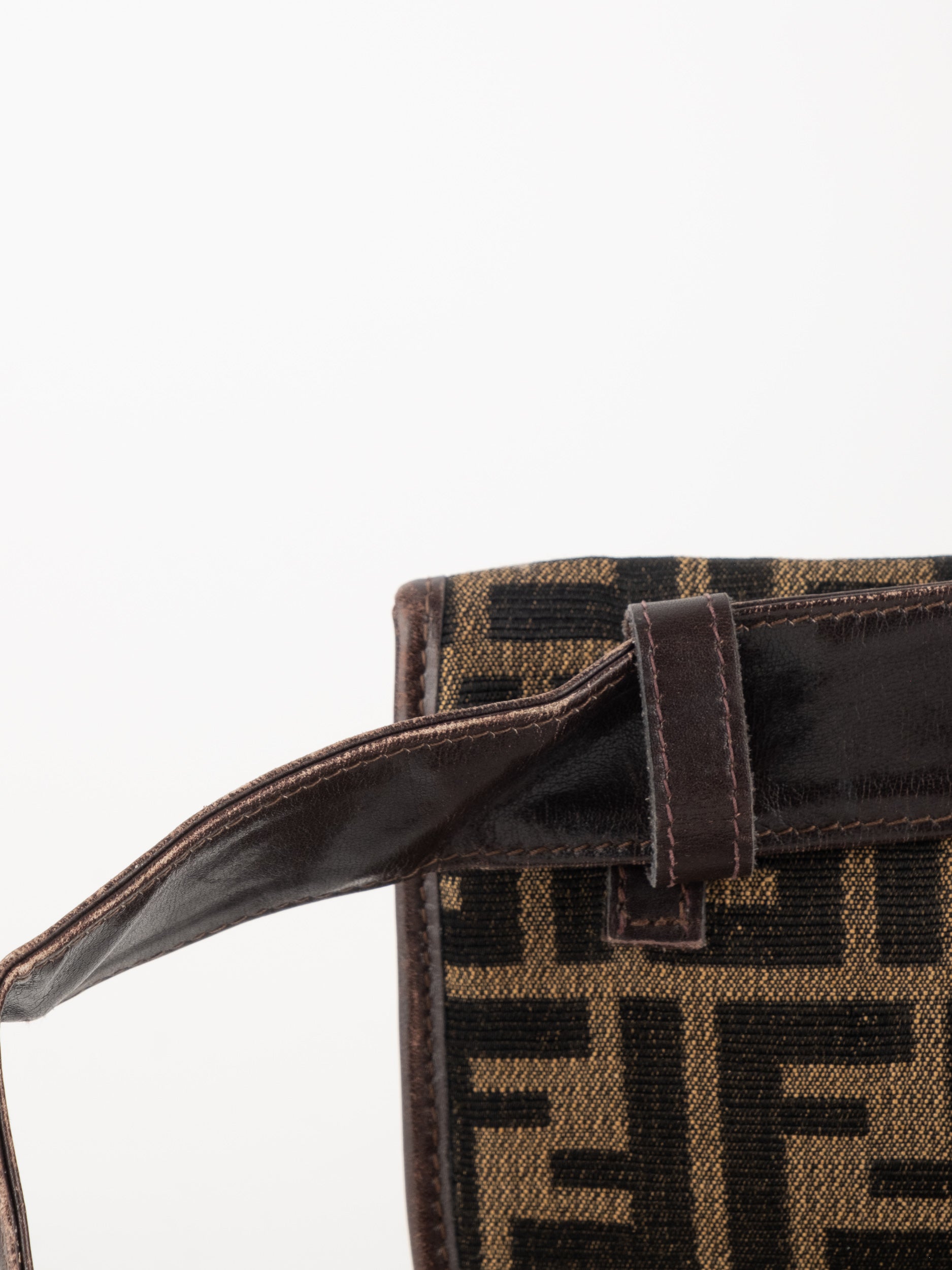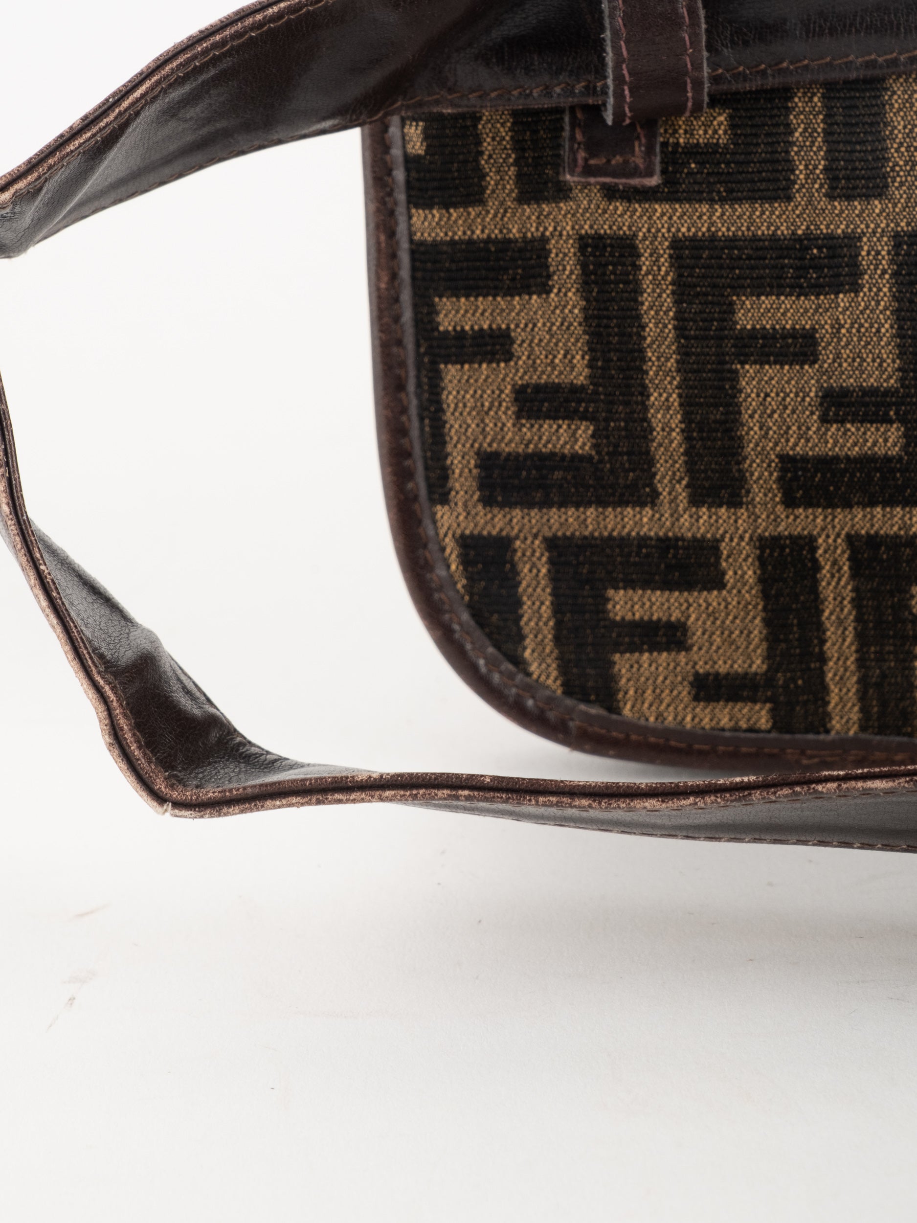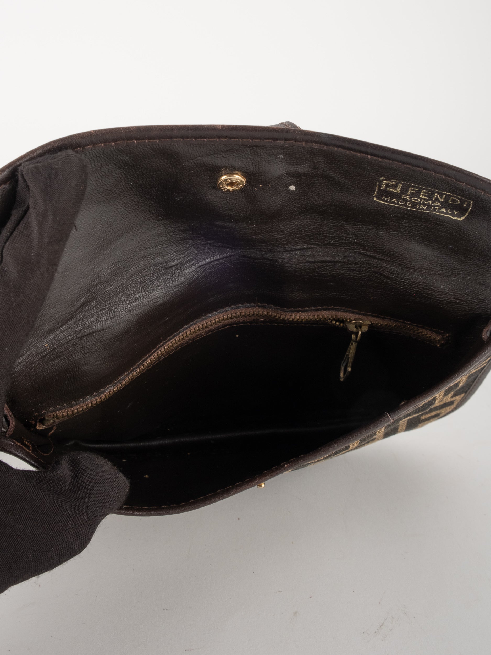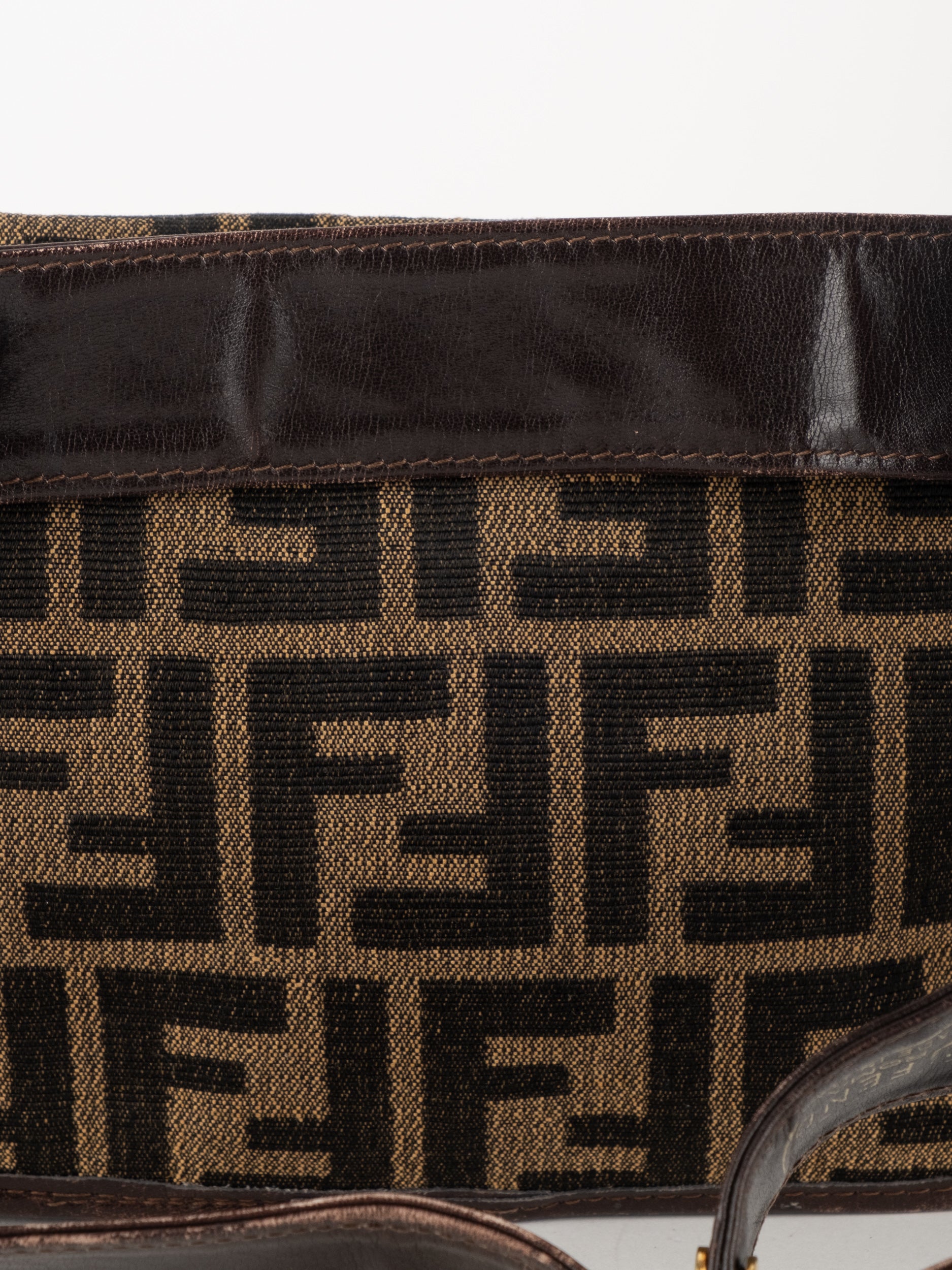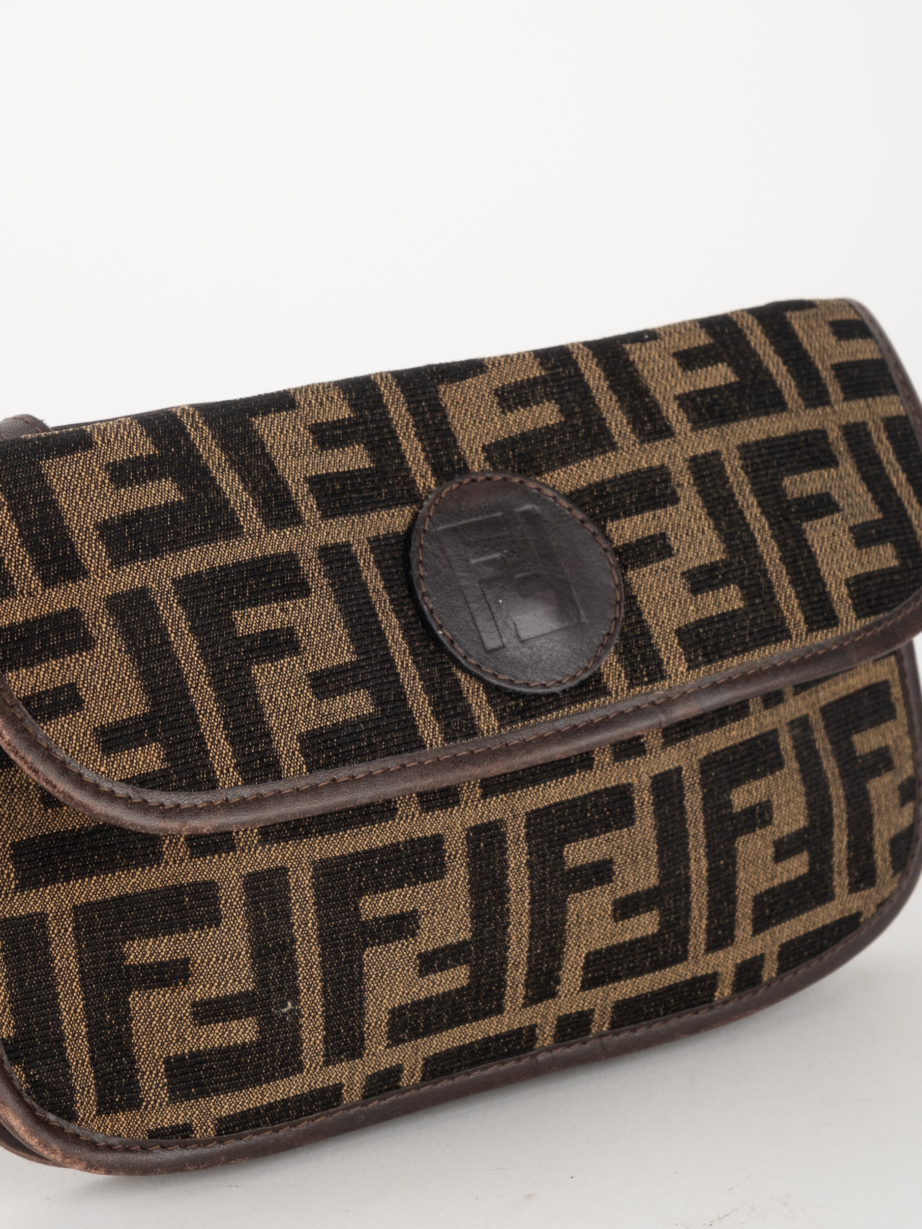 פנדי FENDI וינטג' יד שנייה בדוגמת Zucca האייקונית בגווני חום ושחור עם עיטורי עור כהים. פאוץ' קומפקטי עם אמירה ברורה ונוכחות אופנתית מדויקת, כזה שמרים כל לוק בקלות.