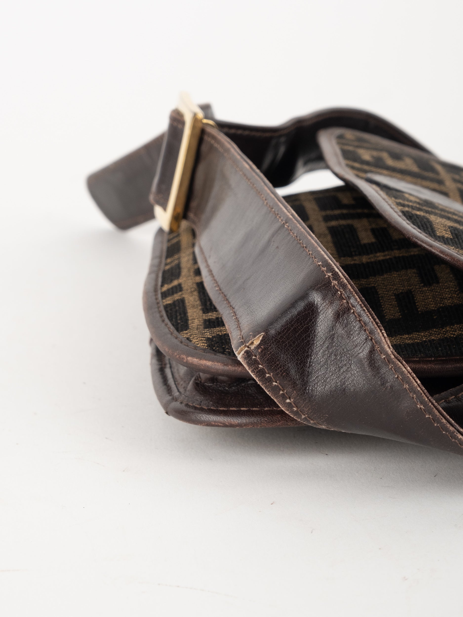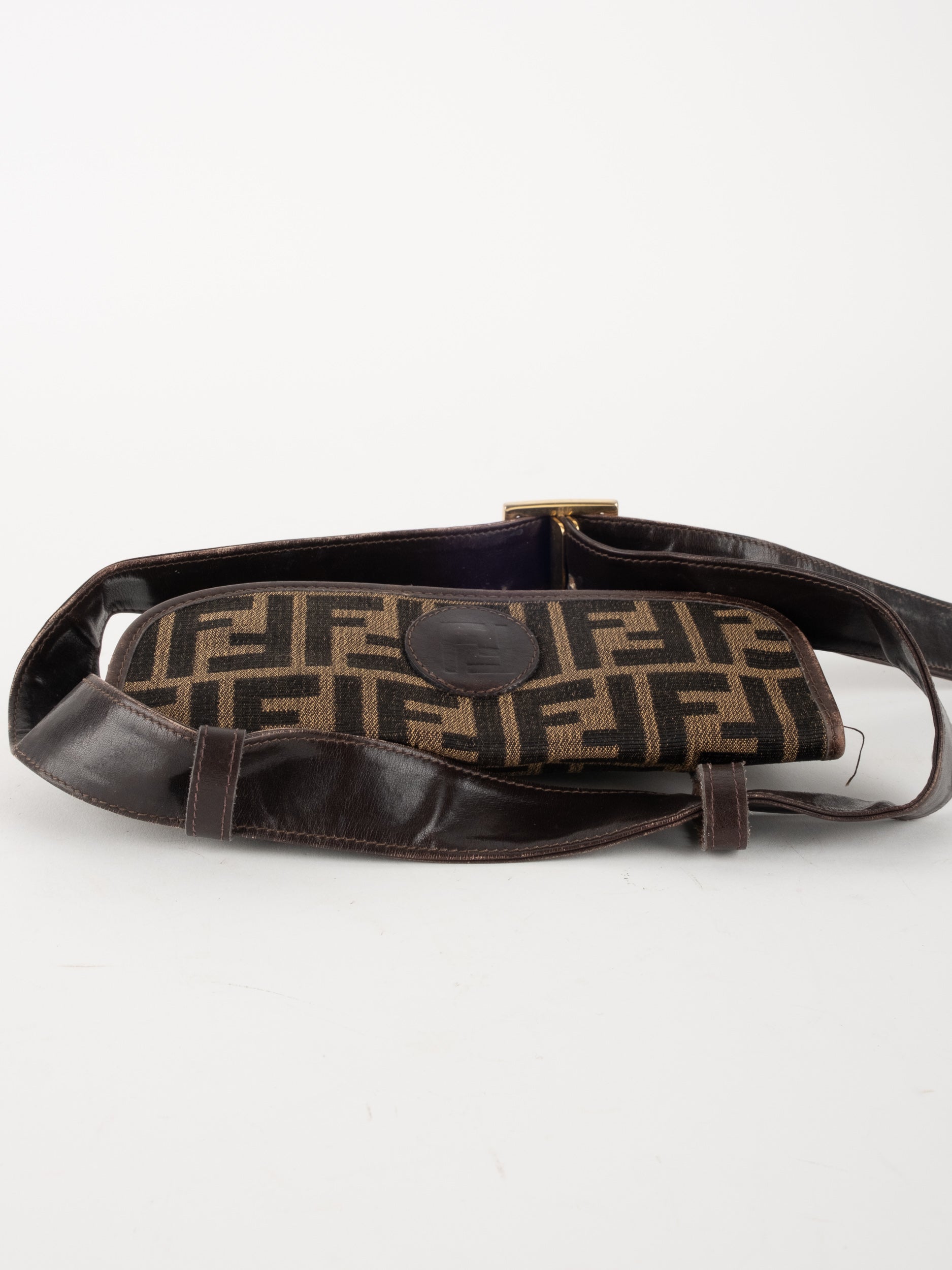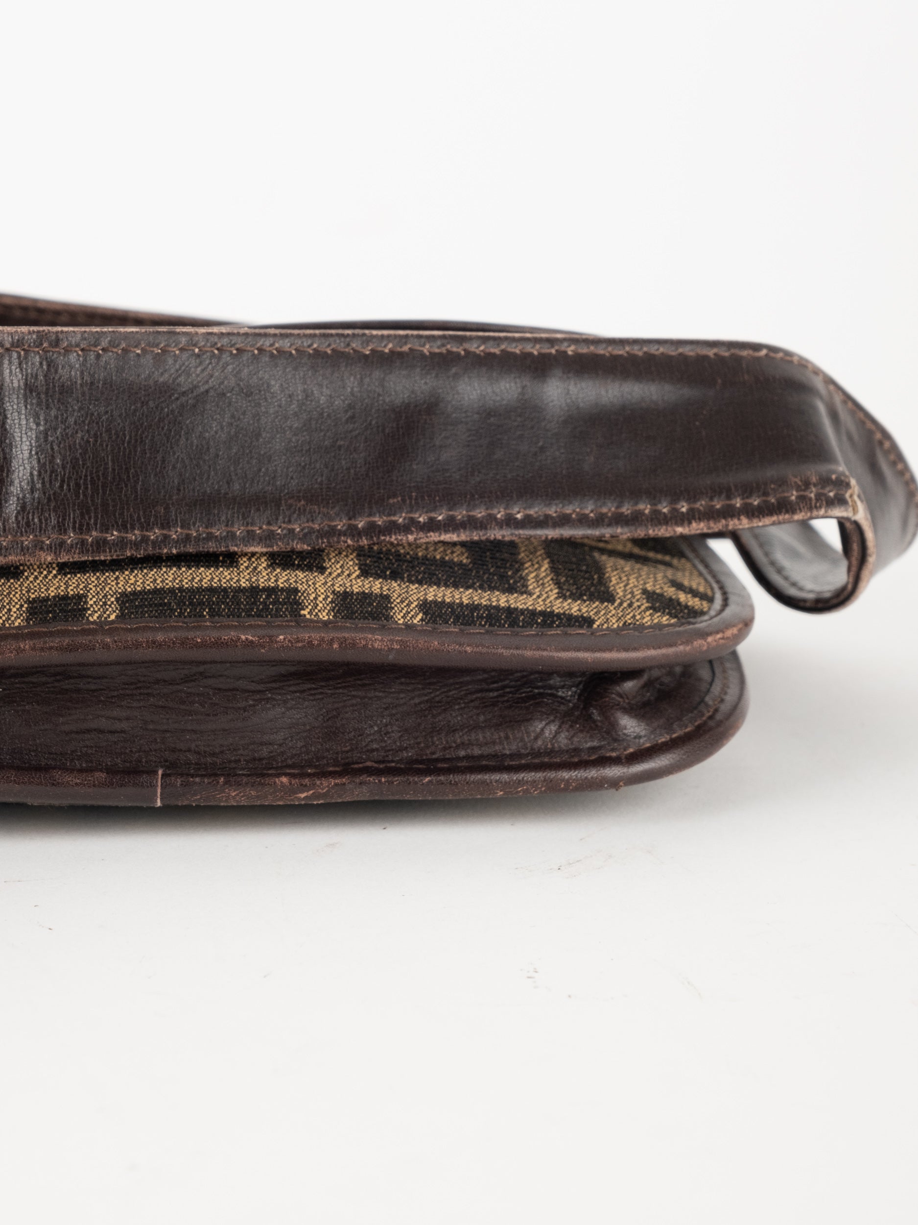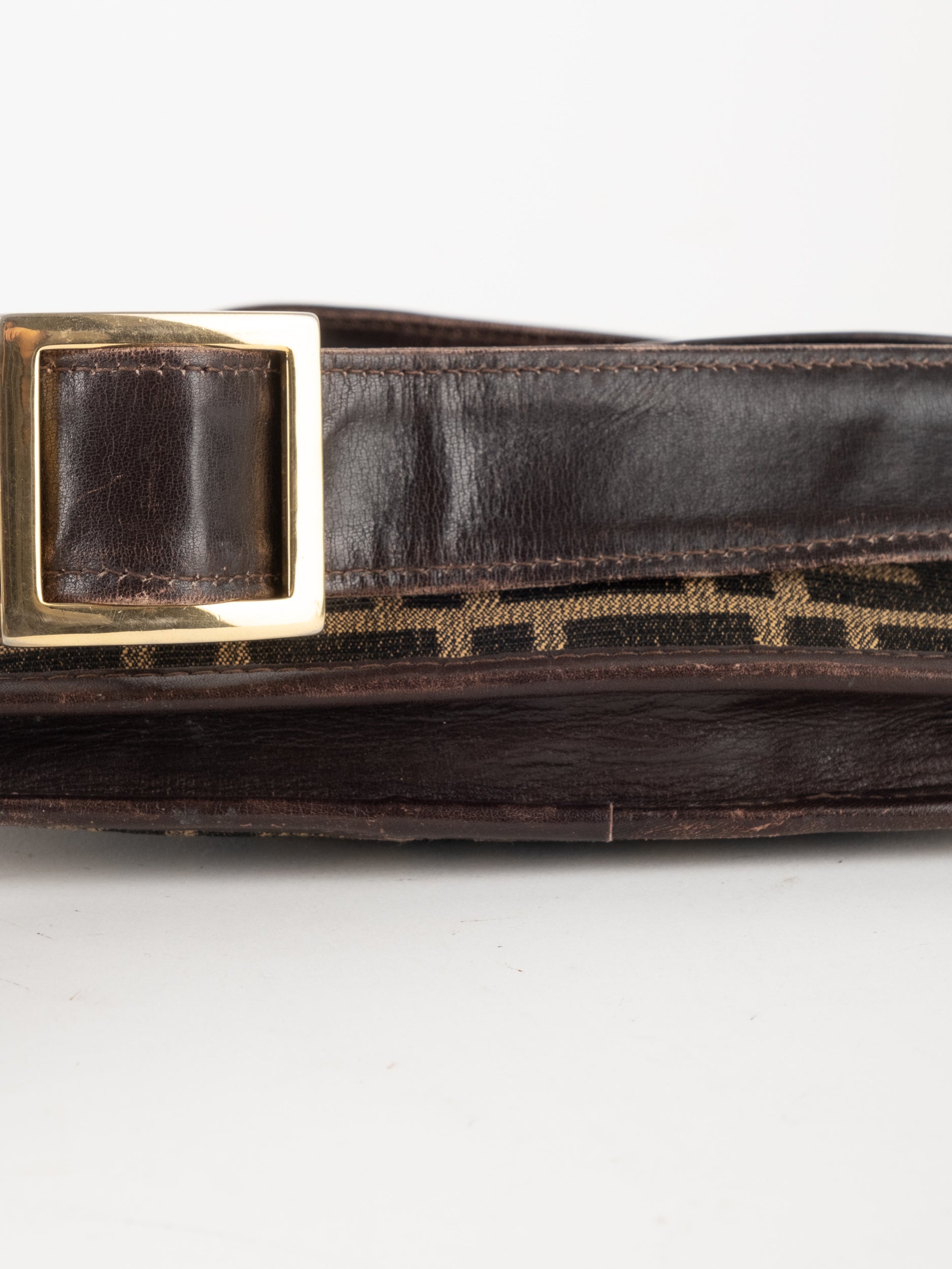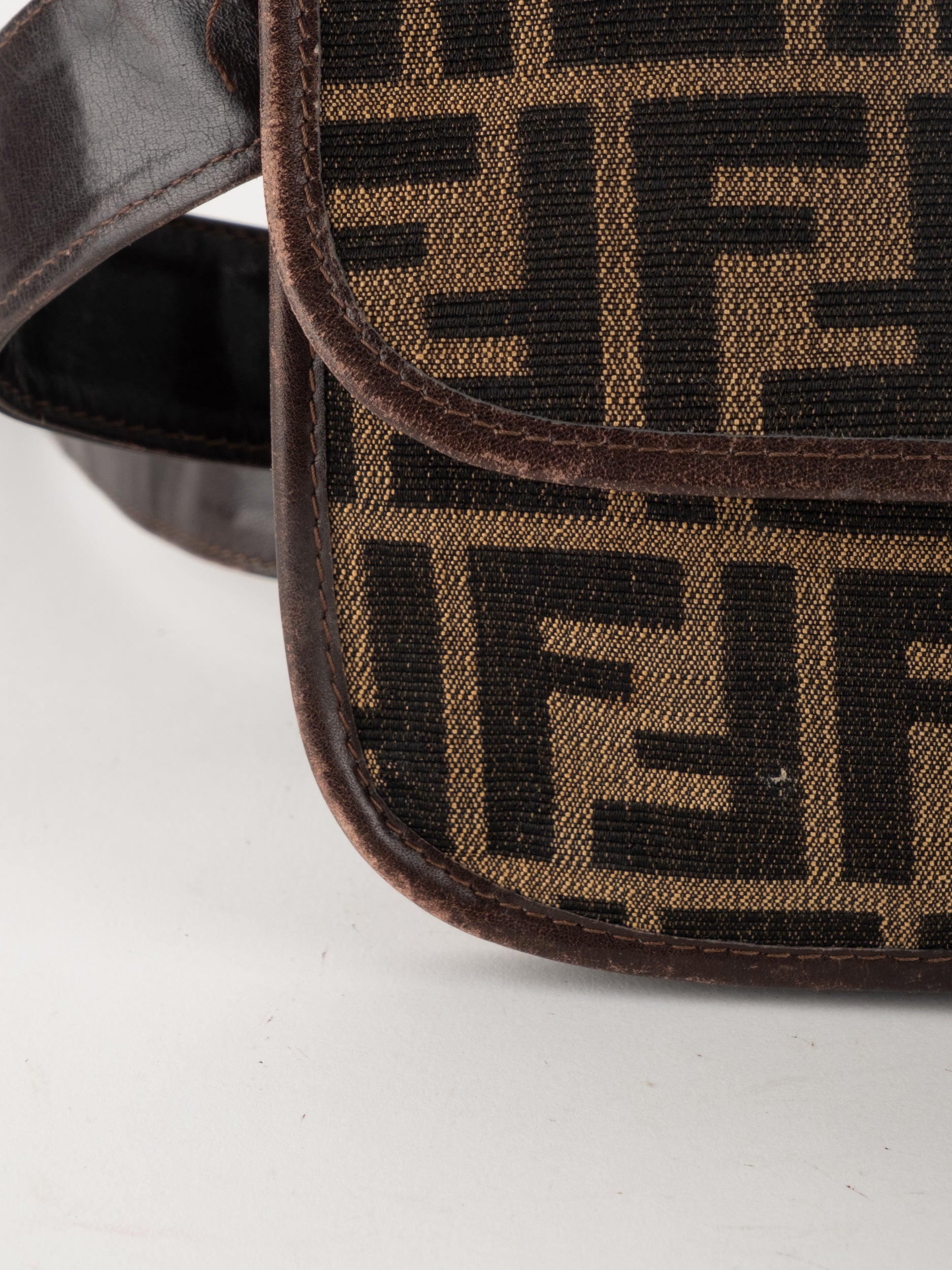 פנדי FENDI וינטג' יד שנייה בדוגמת Zucca האייקונית בגווני חום ושחור עם עיטורי עור כהים. פאוץ' קומפקטי עם אמירה ברורה ונוכחות אופנתית מדויקת, כזה שמרים כל לוק בקלות.