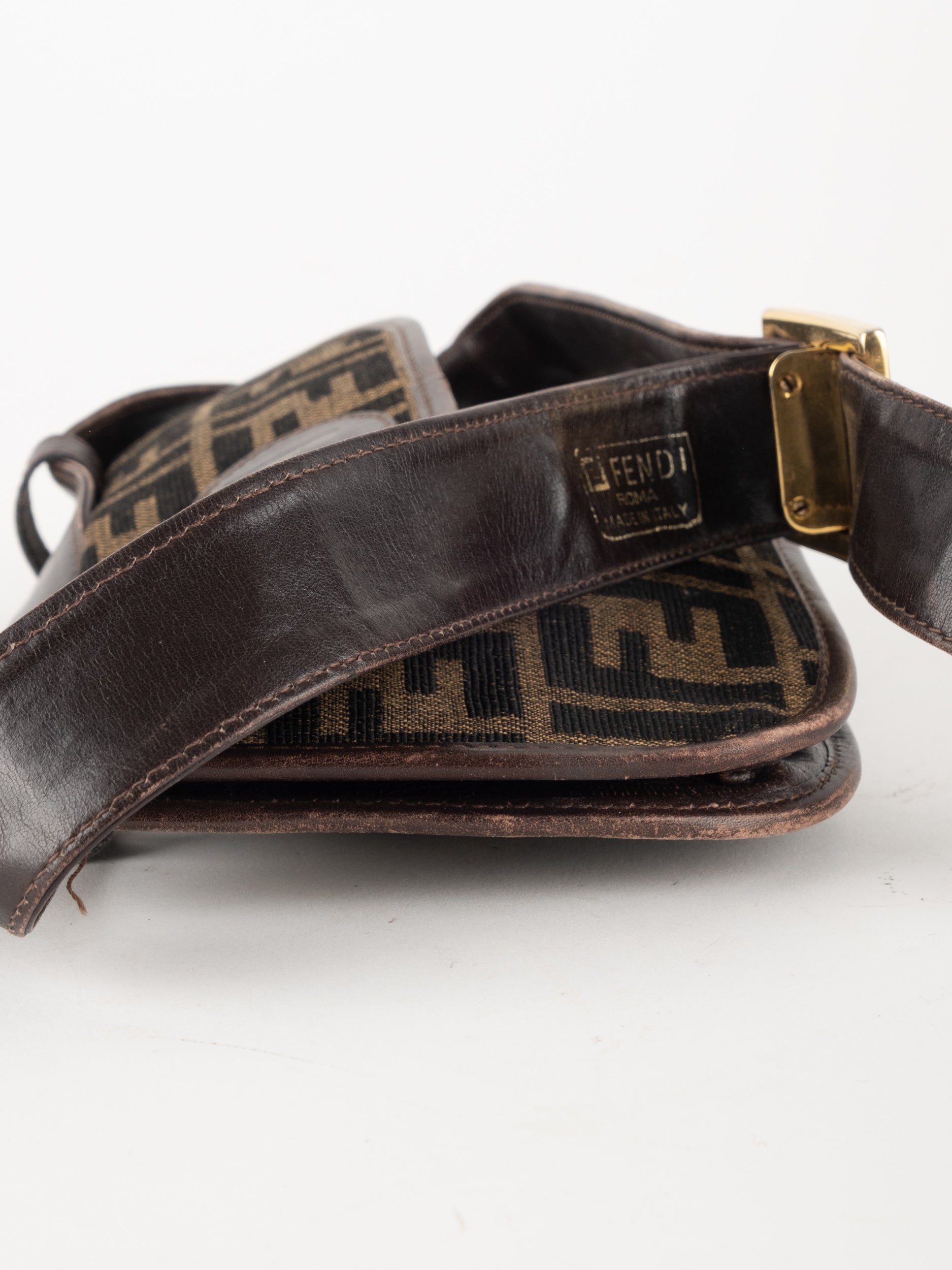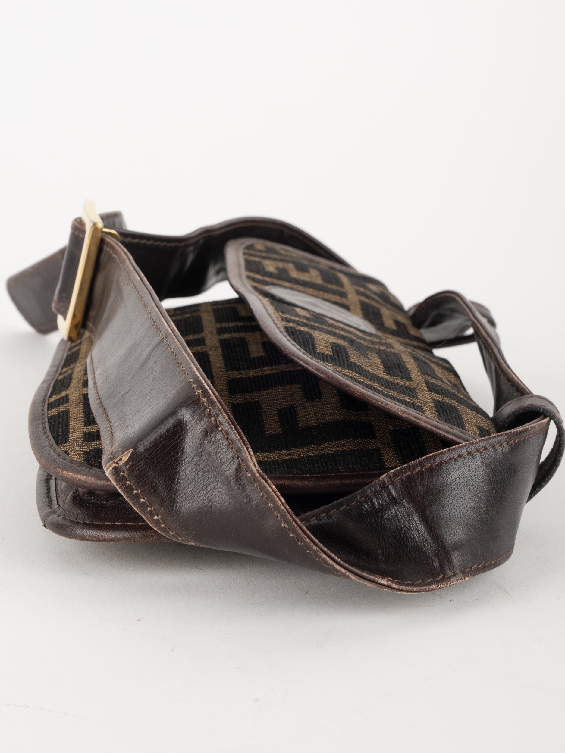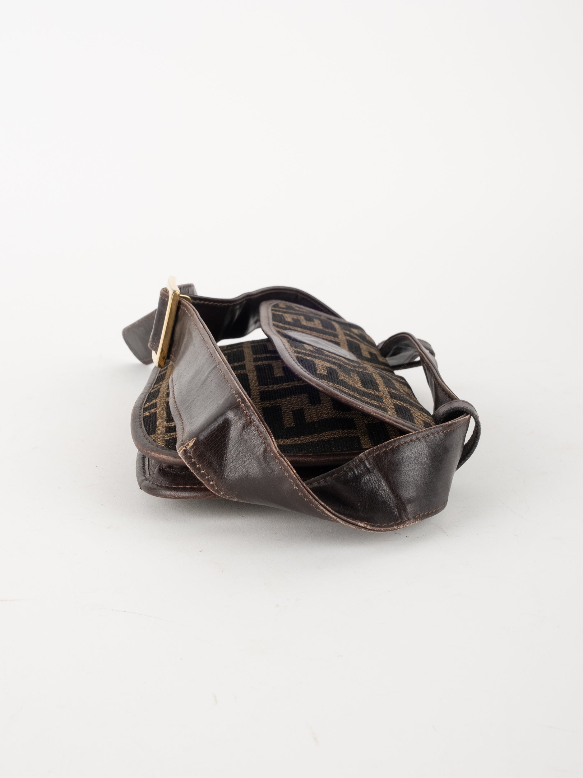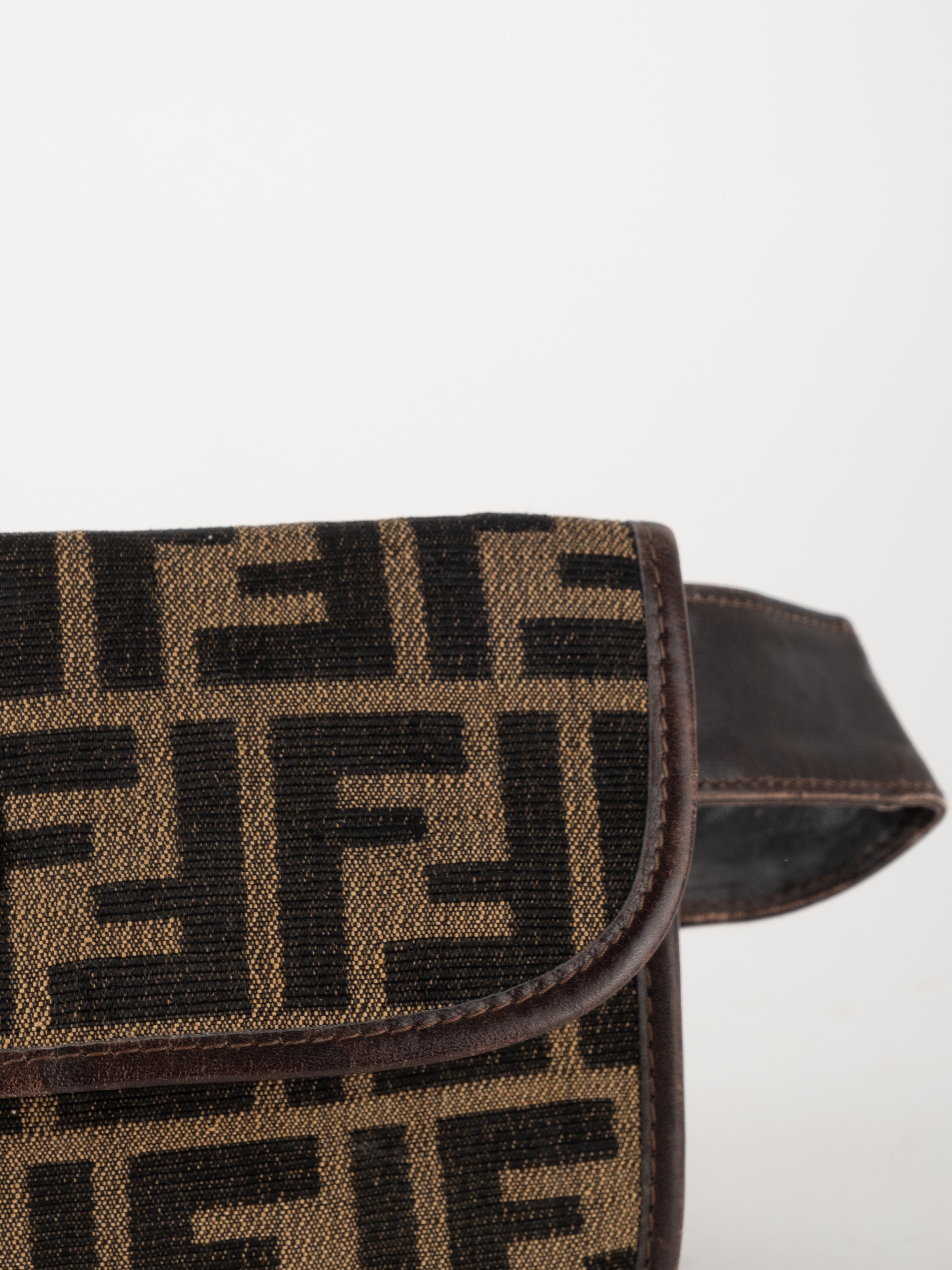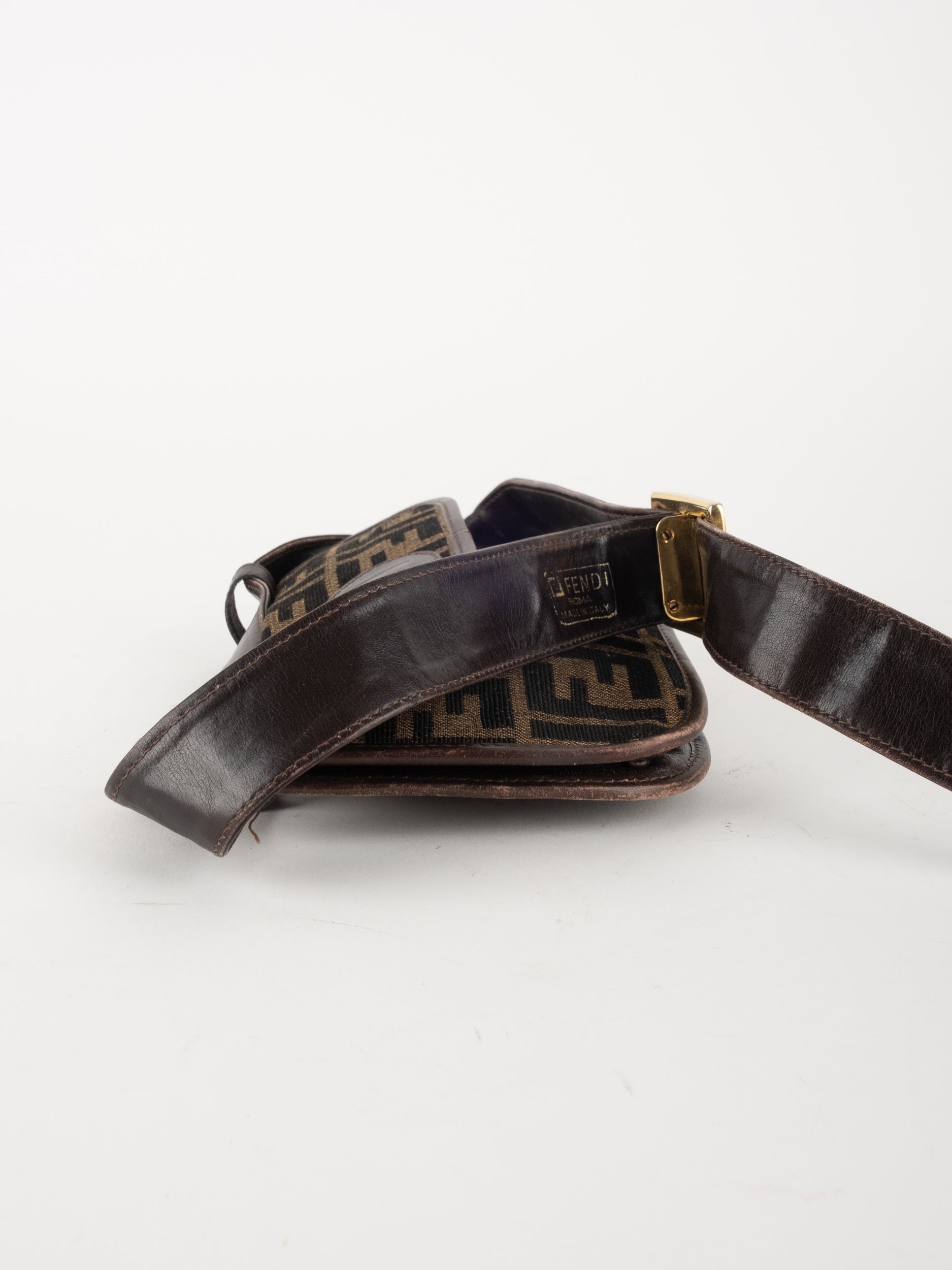 פנדי FENDI וינטג' יד שנייה בדוגמת Zucca האייקונית בגווני חום ושחור עם עיטורי עור כהים. פאוץ' קומפקטי עם אמירה ברורה ונוכחות אופנתית מדויקת, כזה שמרים כל לוק בקלות.