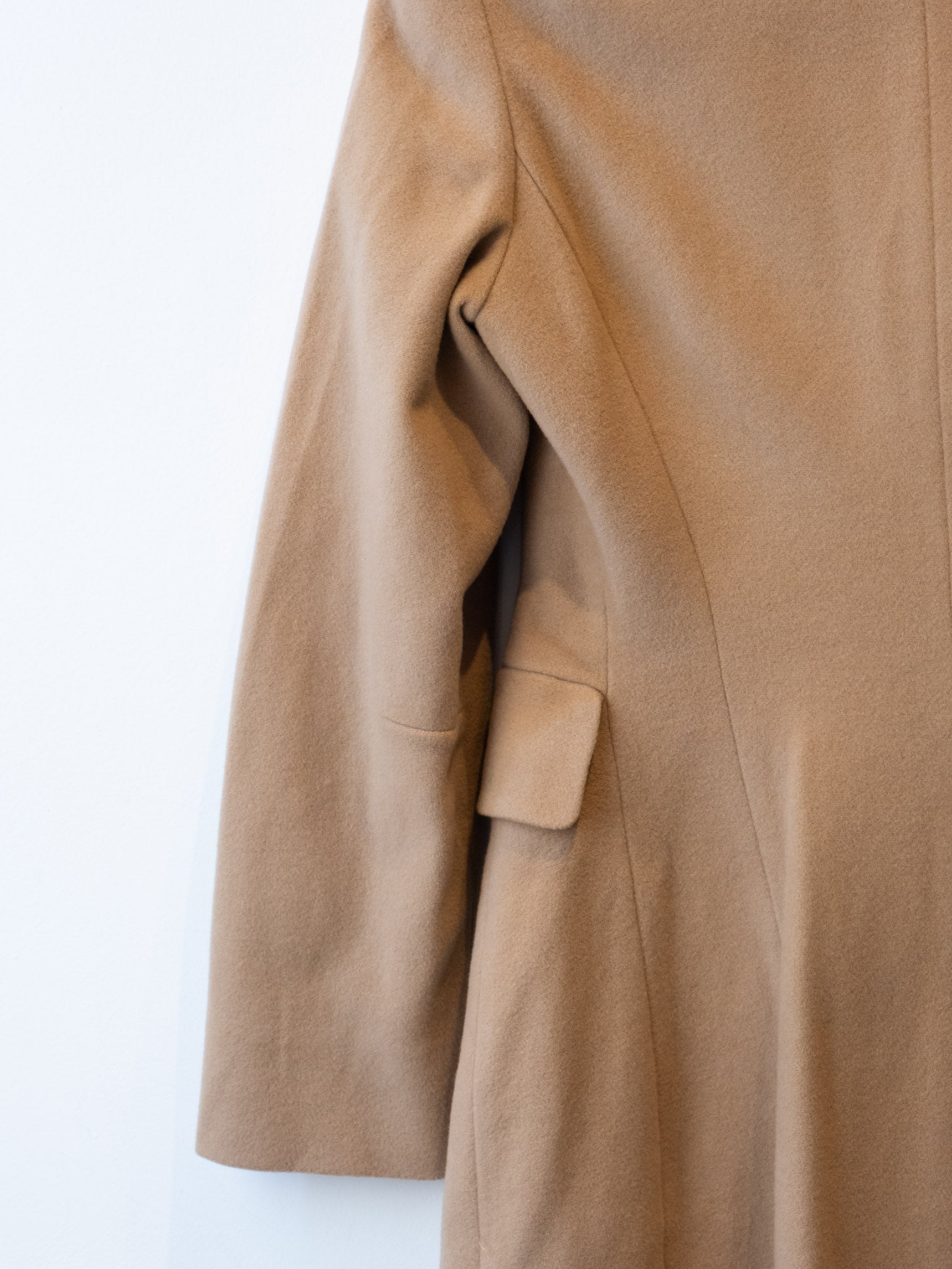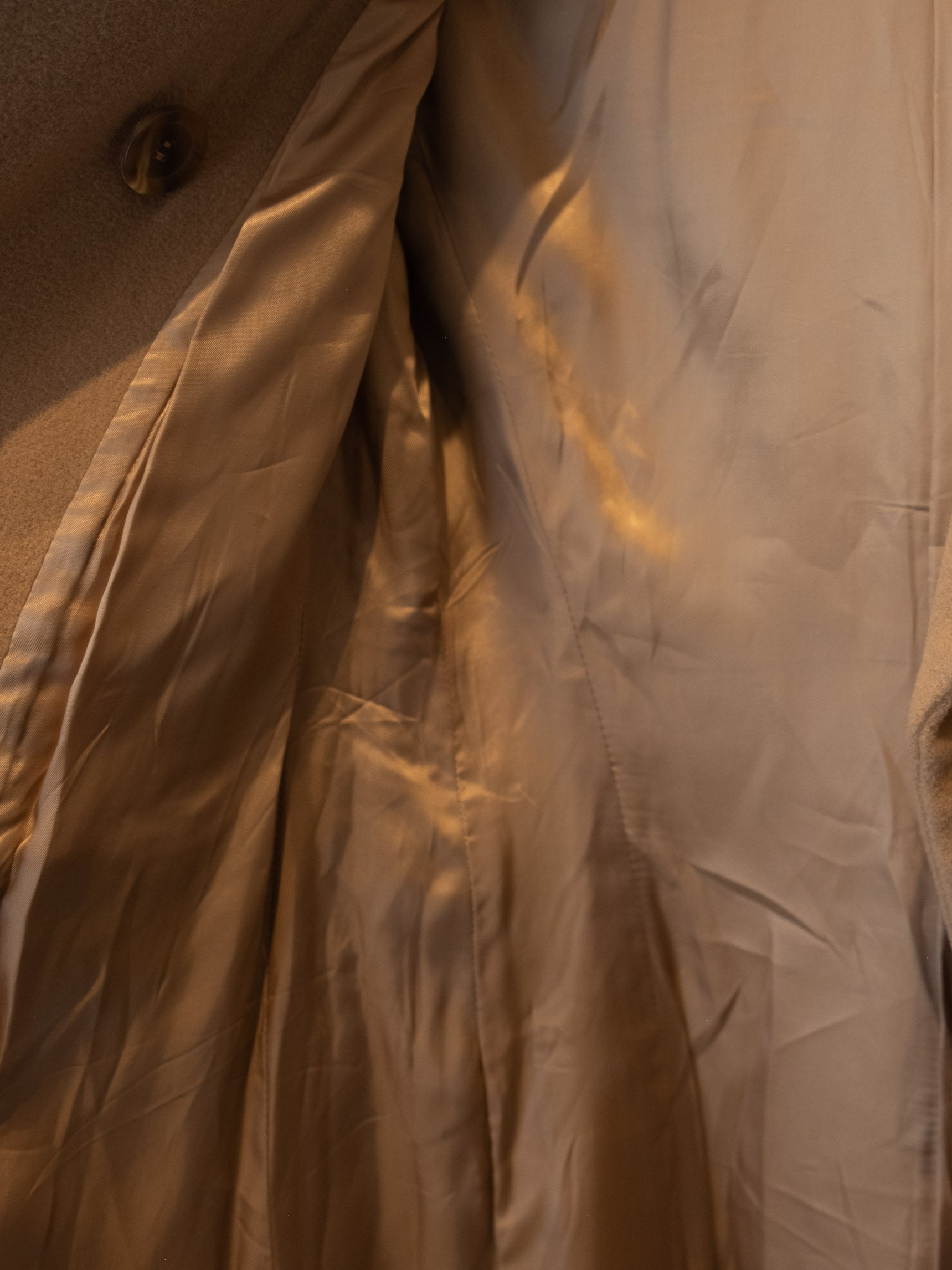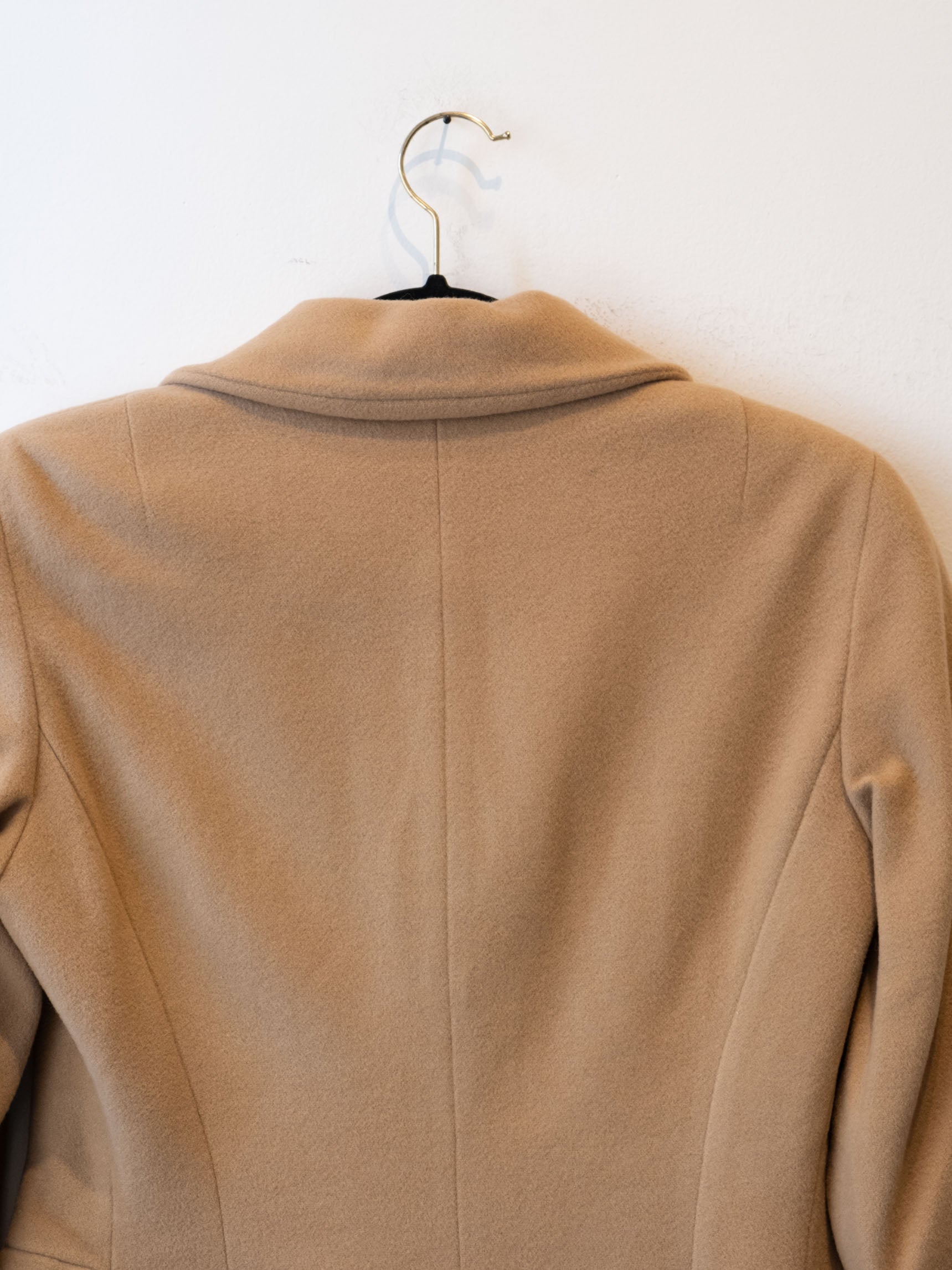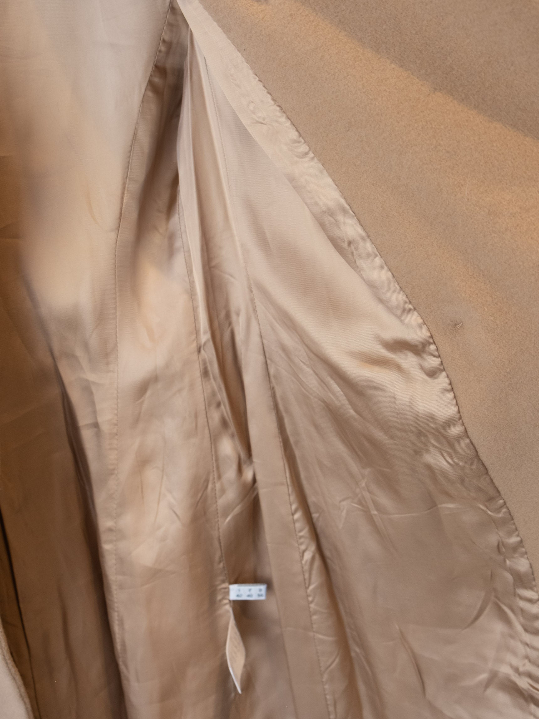 מעיל בצבע בז׳ הנסגר באמצעות כפתורים בעל שני כיסים צדדים ללא סגירה.
