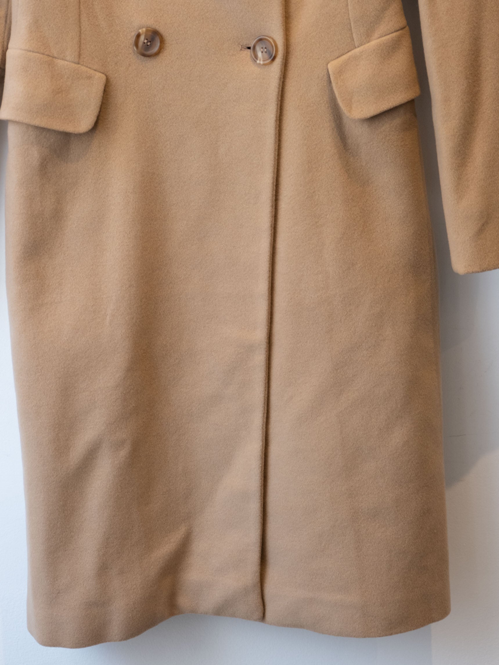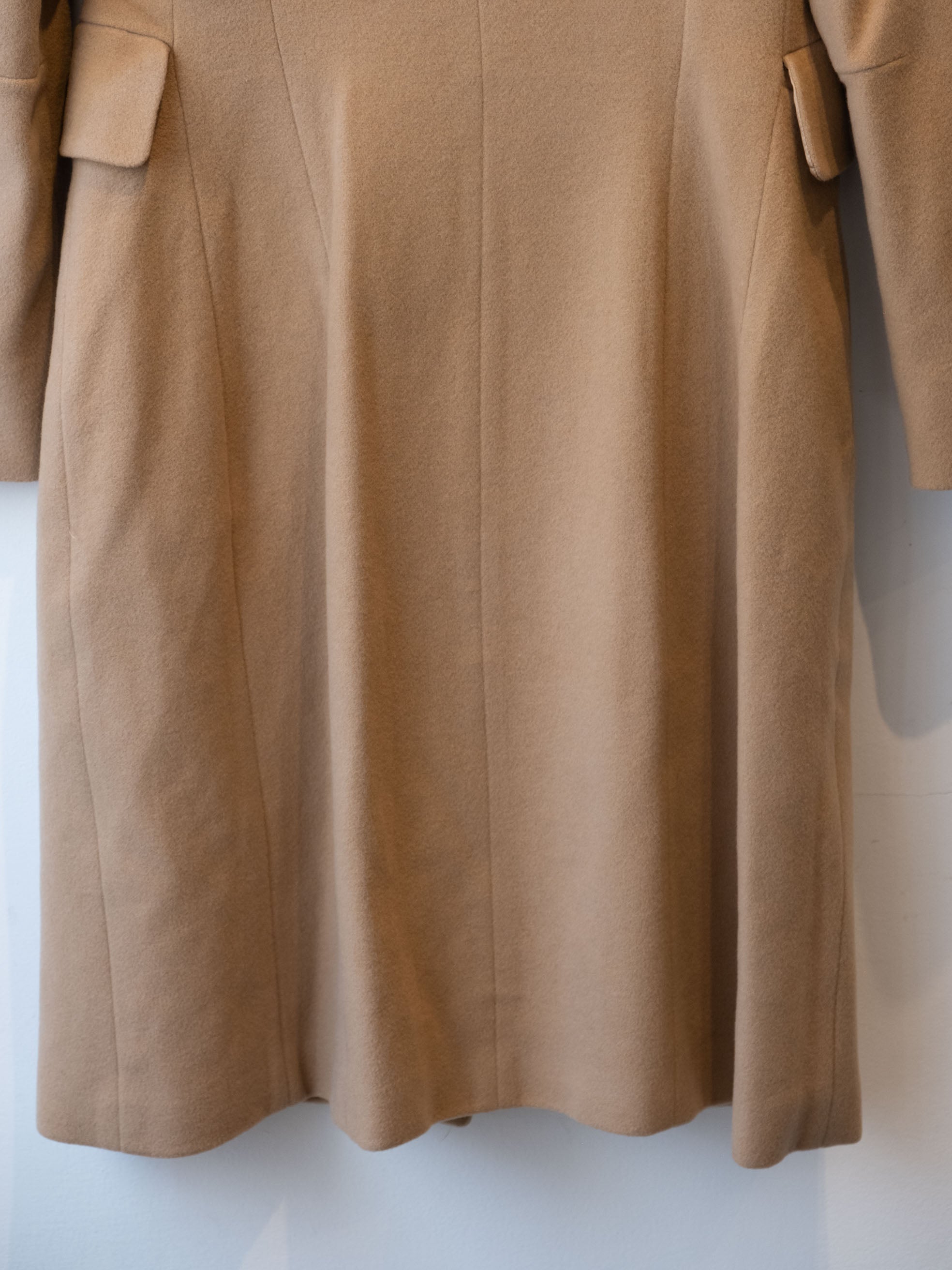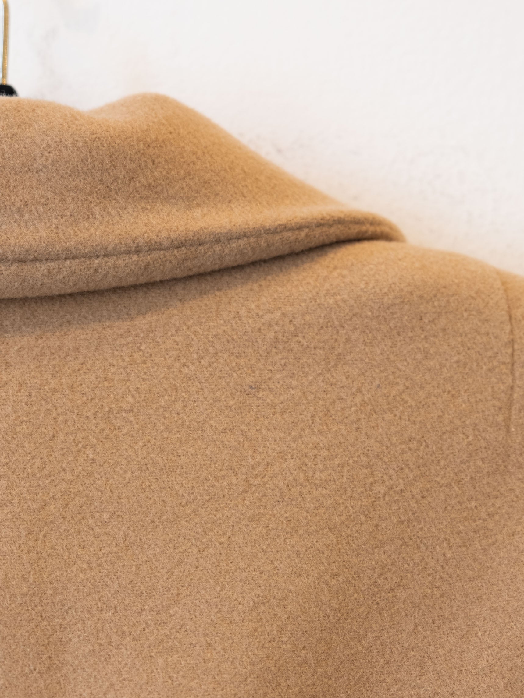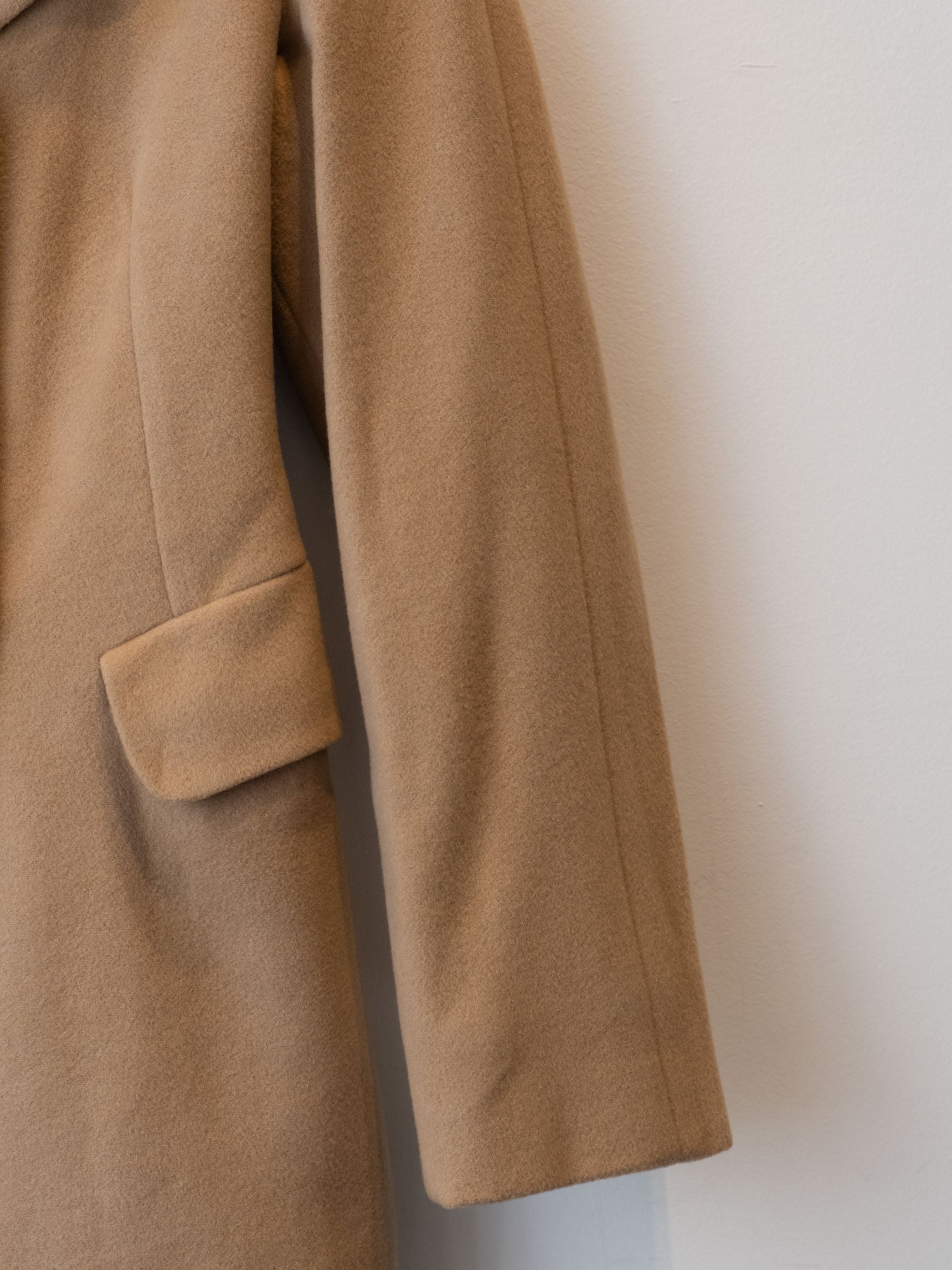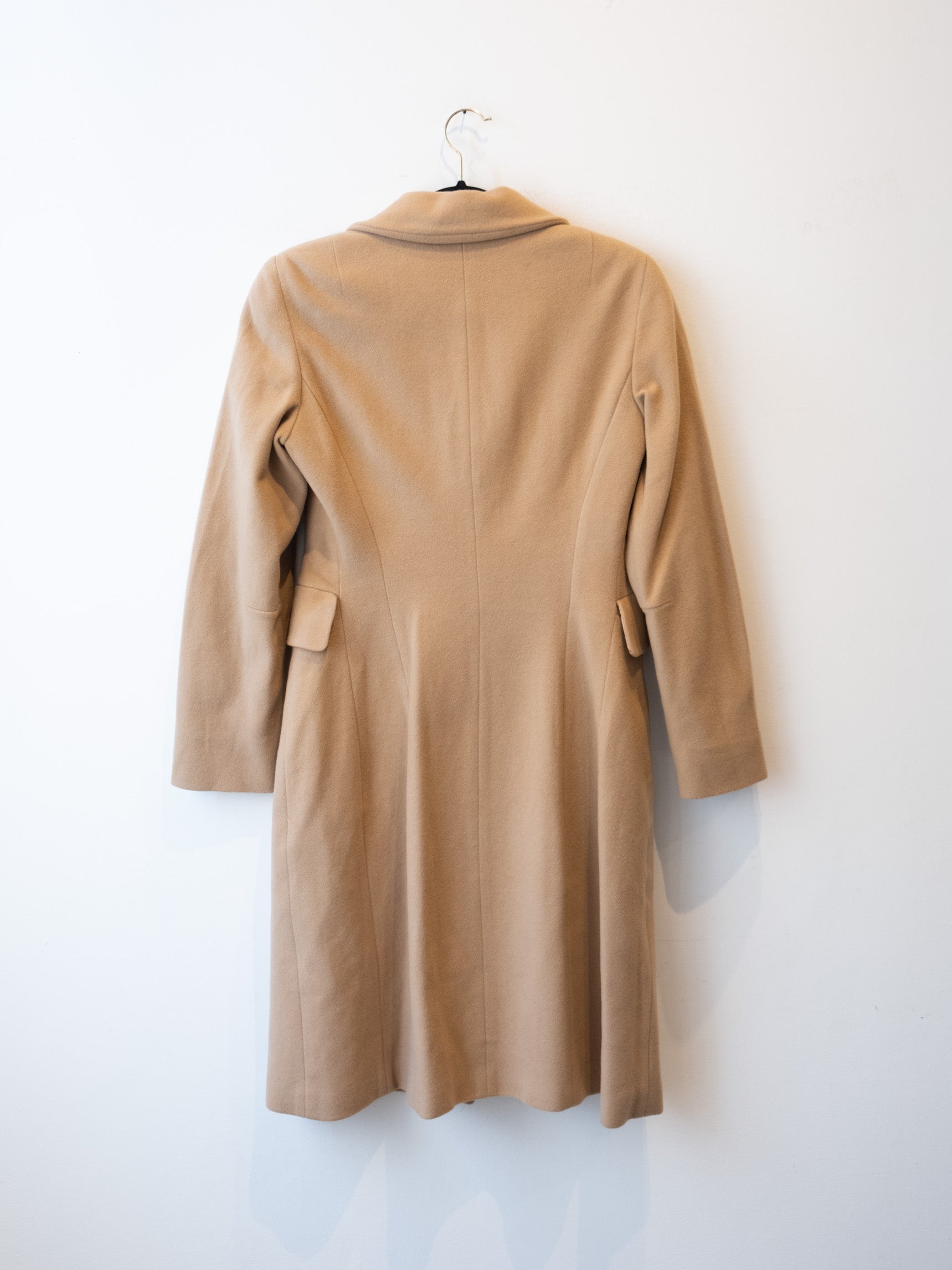 מעיל בצבע בז׳ הנסגר באמצעות כפתורים בעל שני כיסים צדדים ללא סגירה.