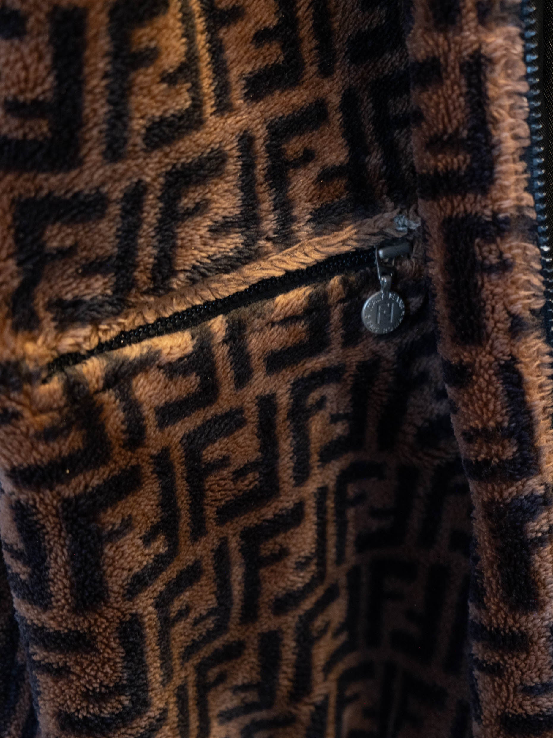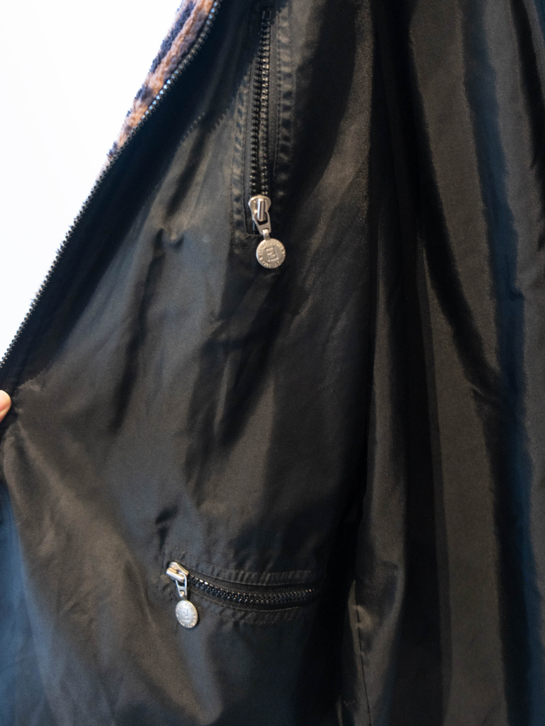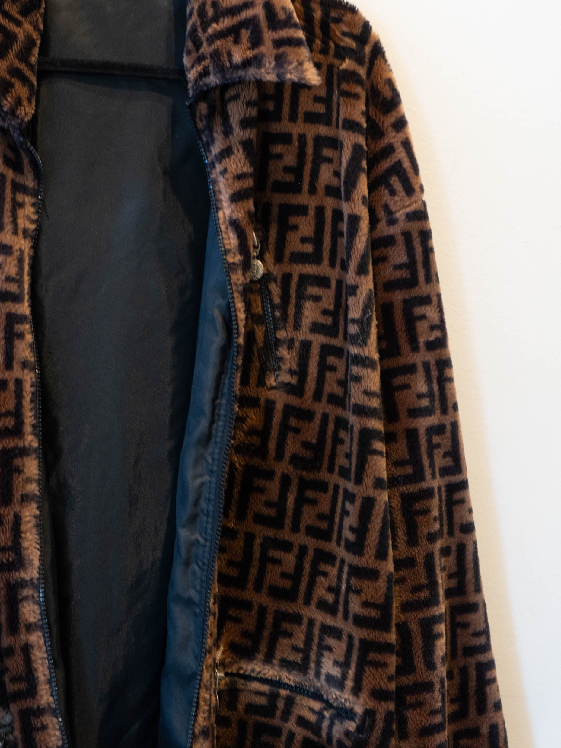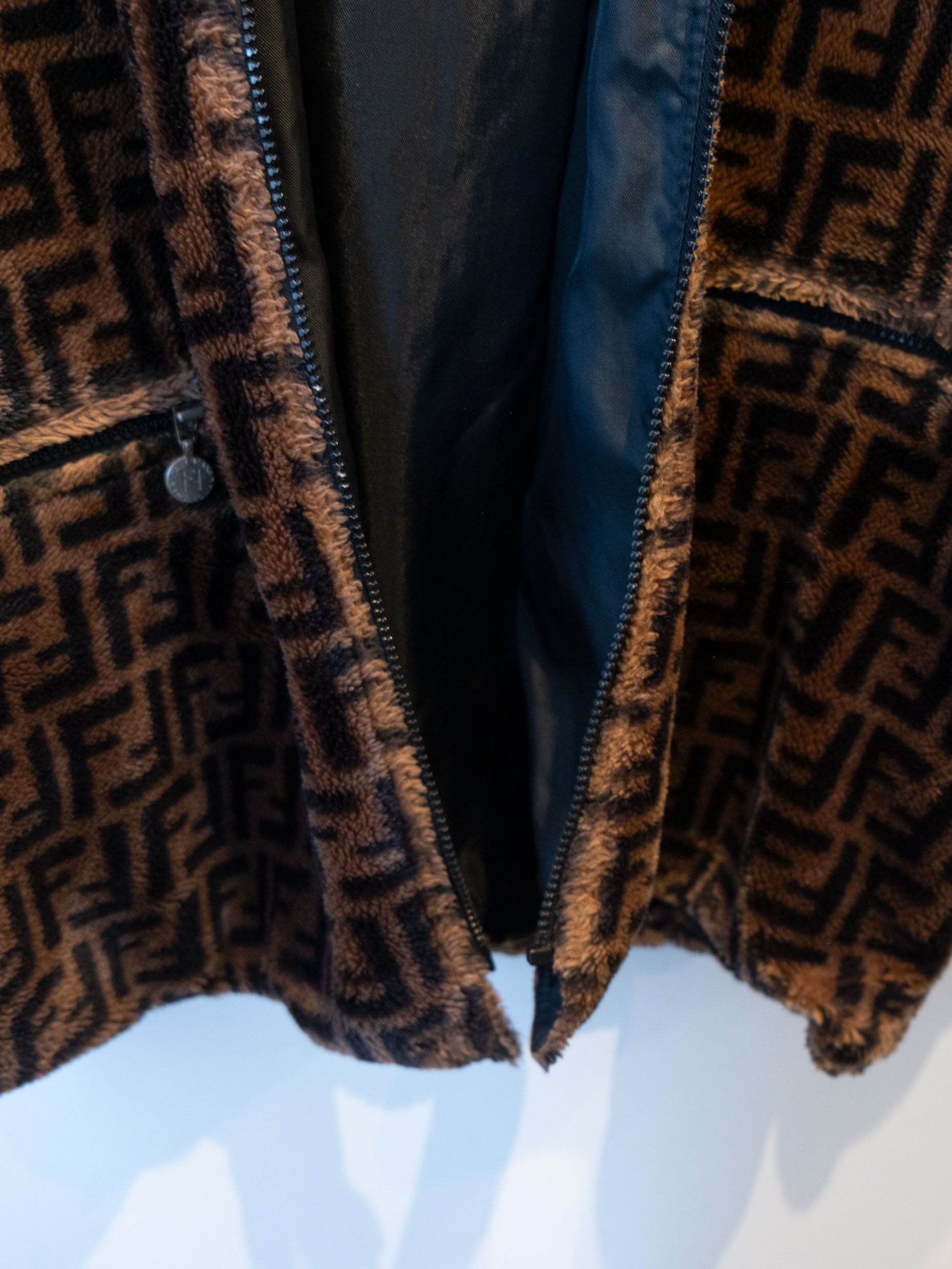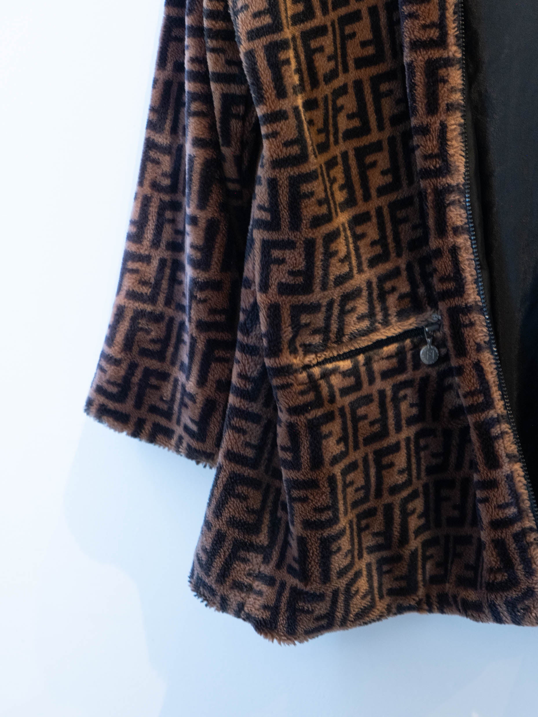 מעיל פרווה בהדפס המונוגרמי המוכר של המותג האיטלקי הנסגר באמצעות רוכסן בעל כיסים חיצוניים ופנימיים עם סגירה זהה.