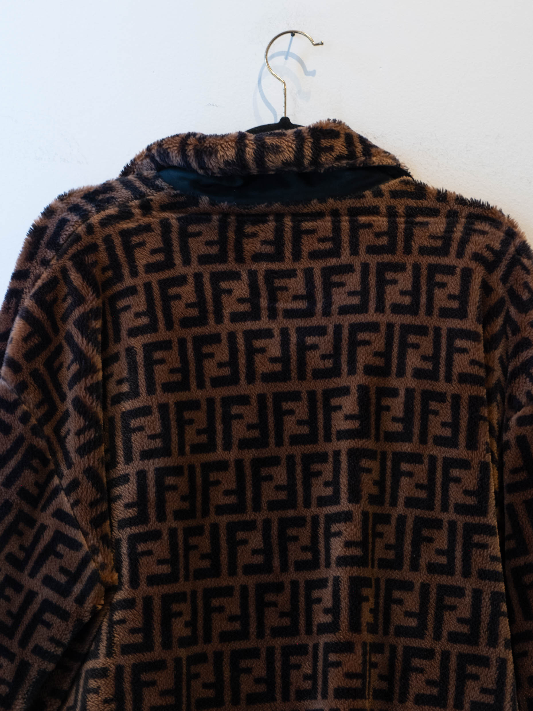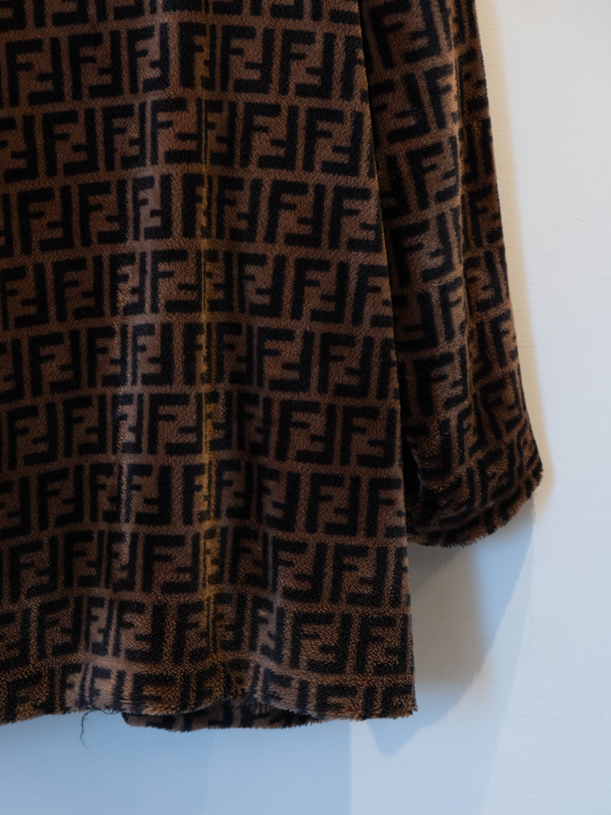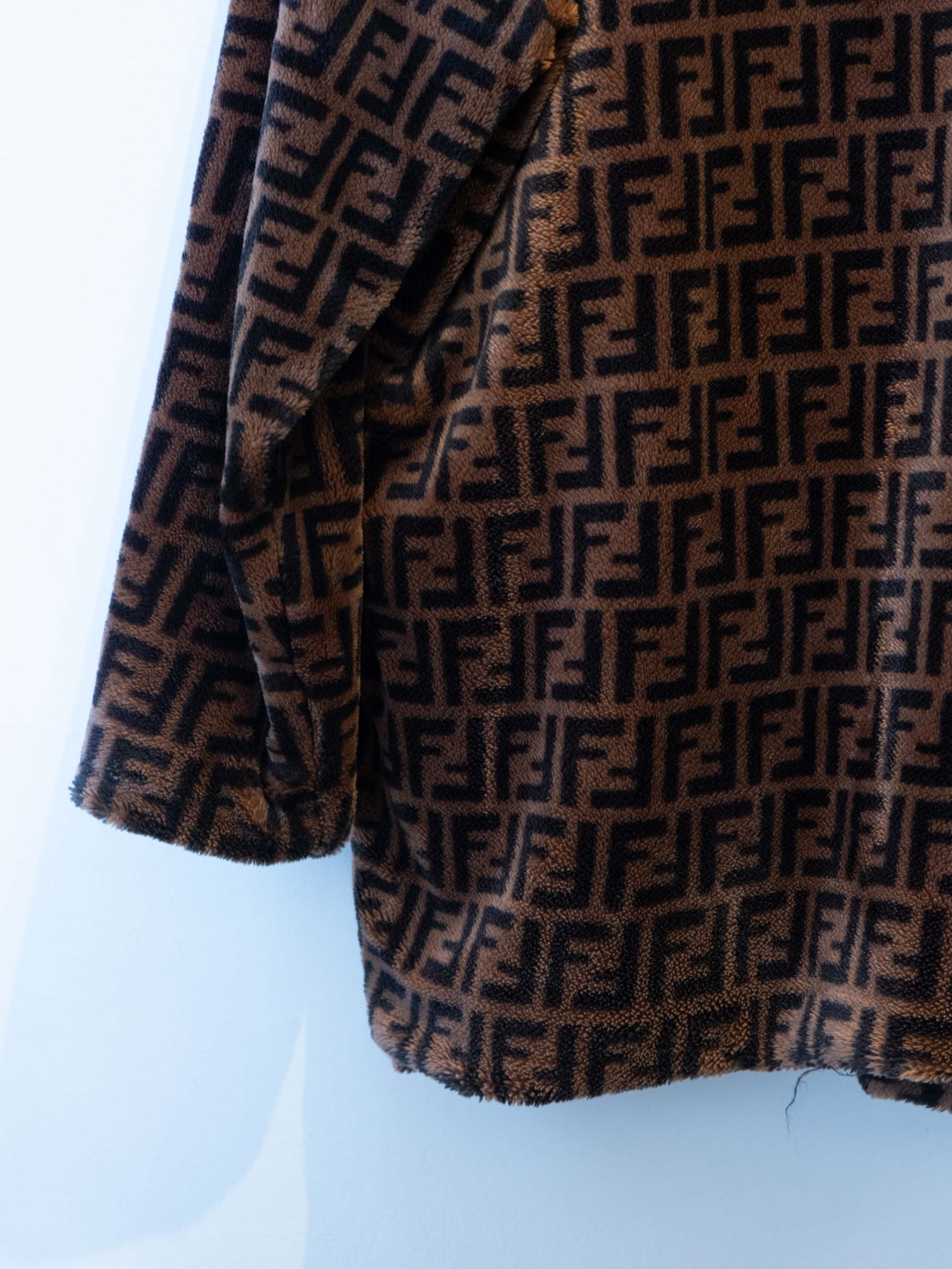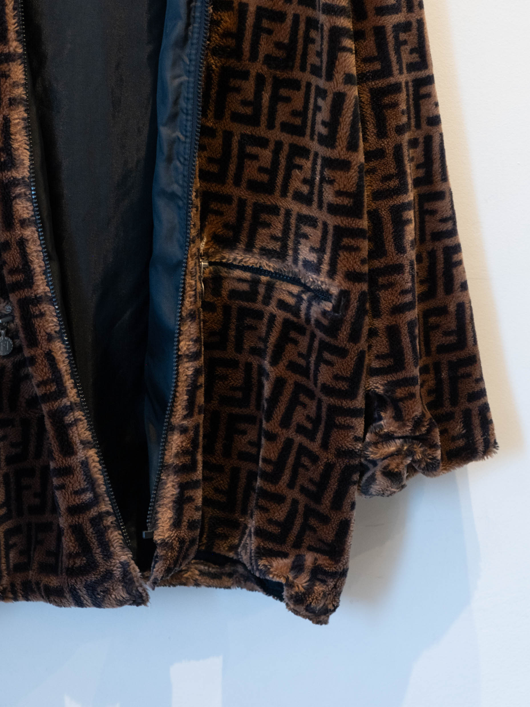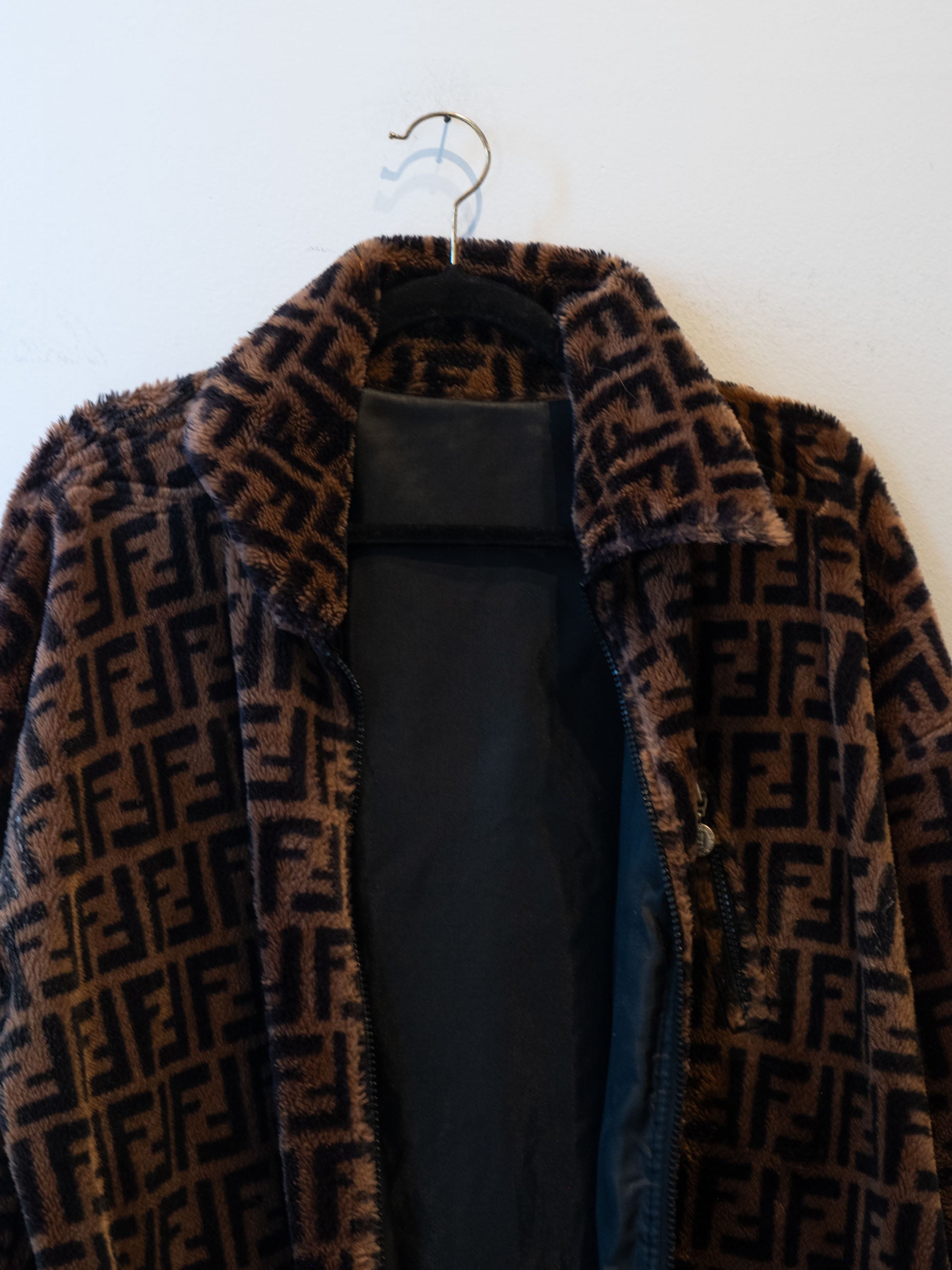 מעיל פרווה בהדפס המונוגרמי המוכר של המותג האיטלקי הנסגר באמצעות רוכסן בעל כיסים חיצוניים ופנימיים עם סגירה זהה.