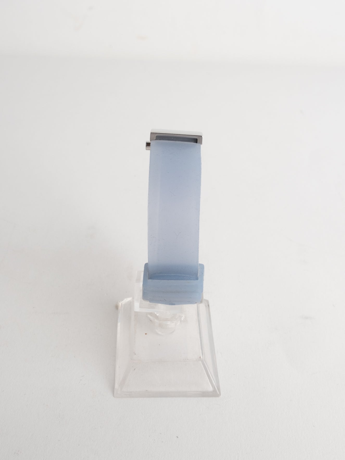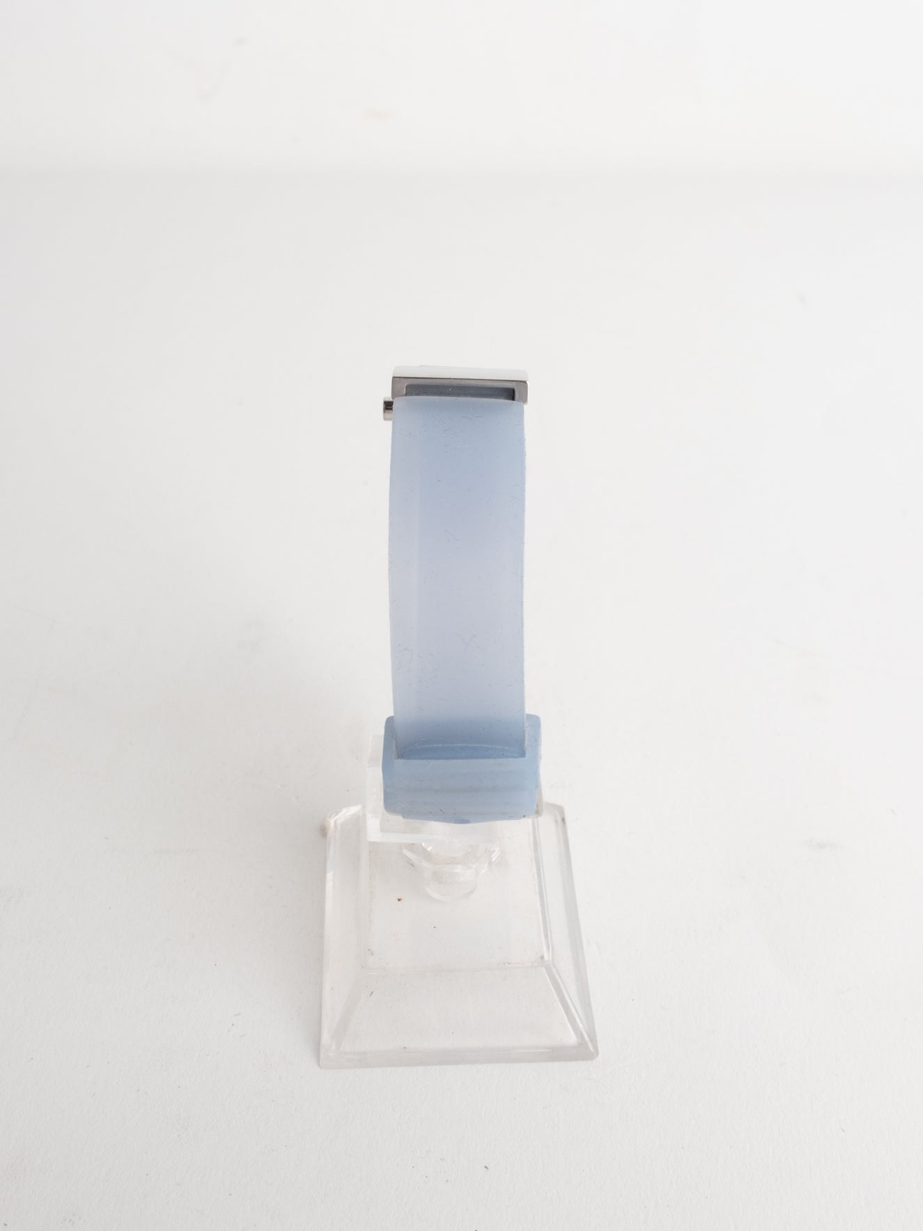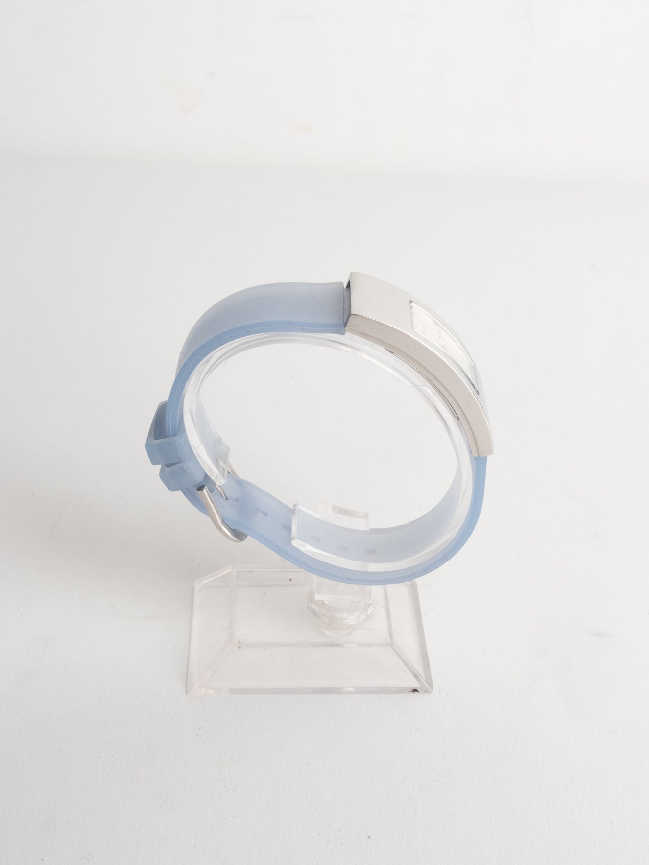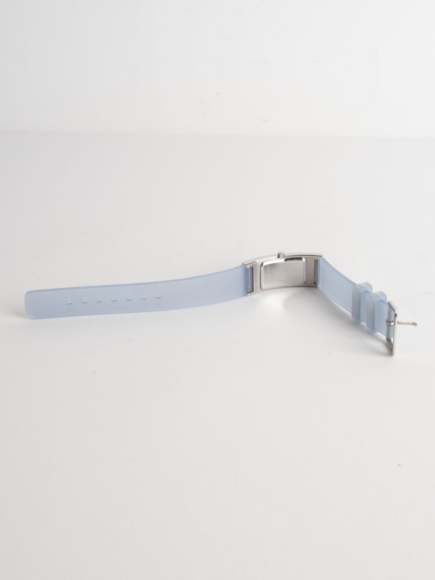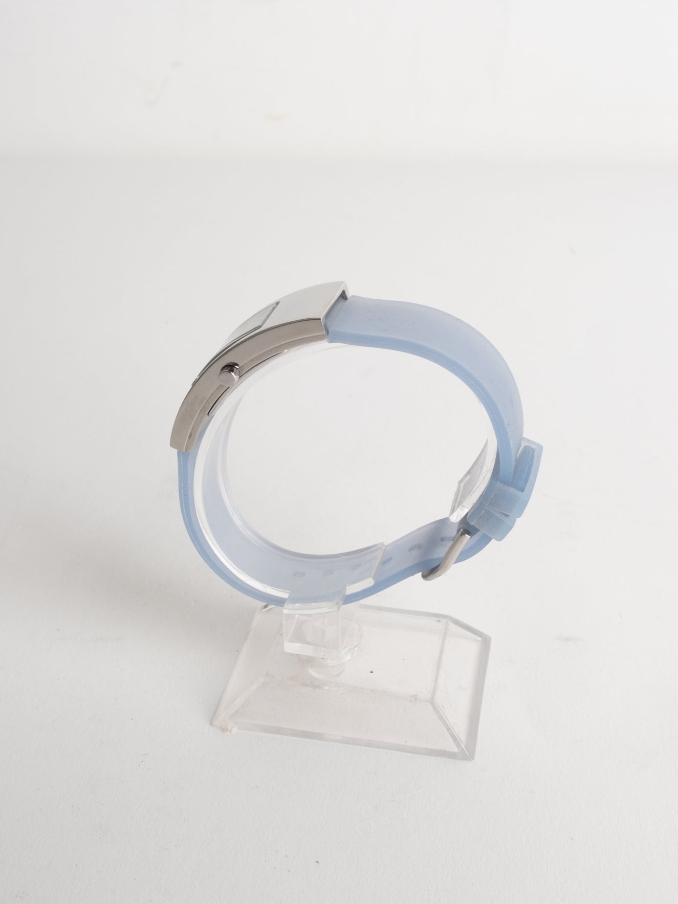 שעון ספורטיבי בעל פני שעון בצורה מלבנית עם מסגרת כסופה, רקע לבן ומחוגים. שעון זה נסגר באמצעות רצועות העשויות מפלסטיק גמיש בצבע תכלת שניתן לכוון.