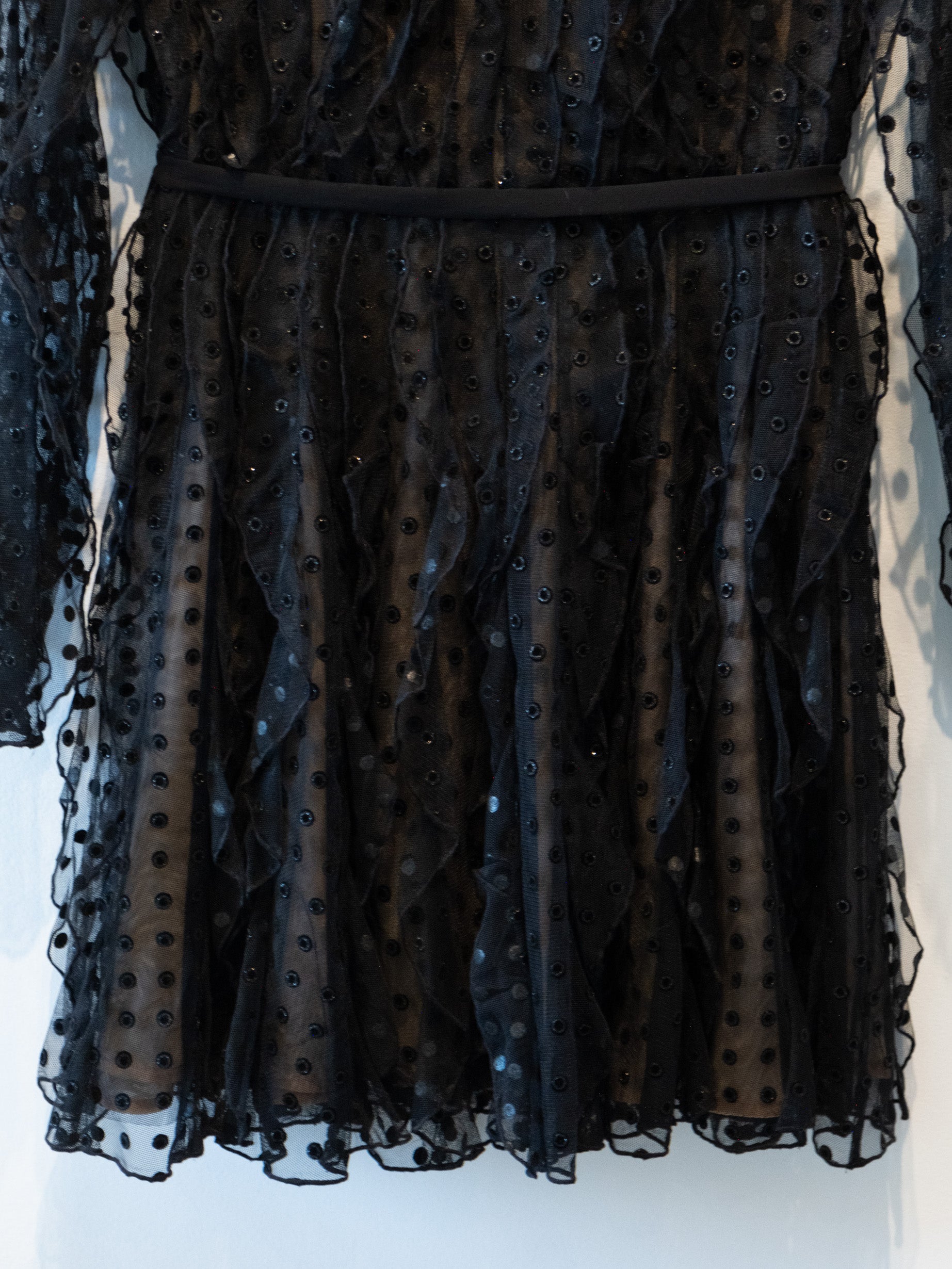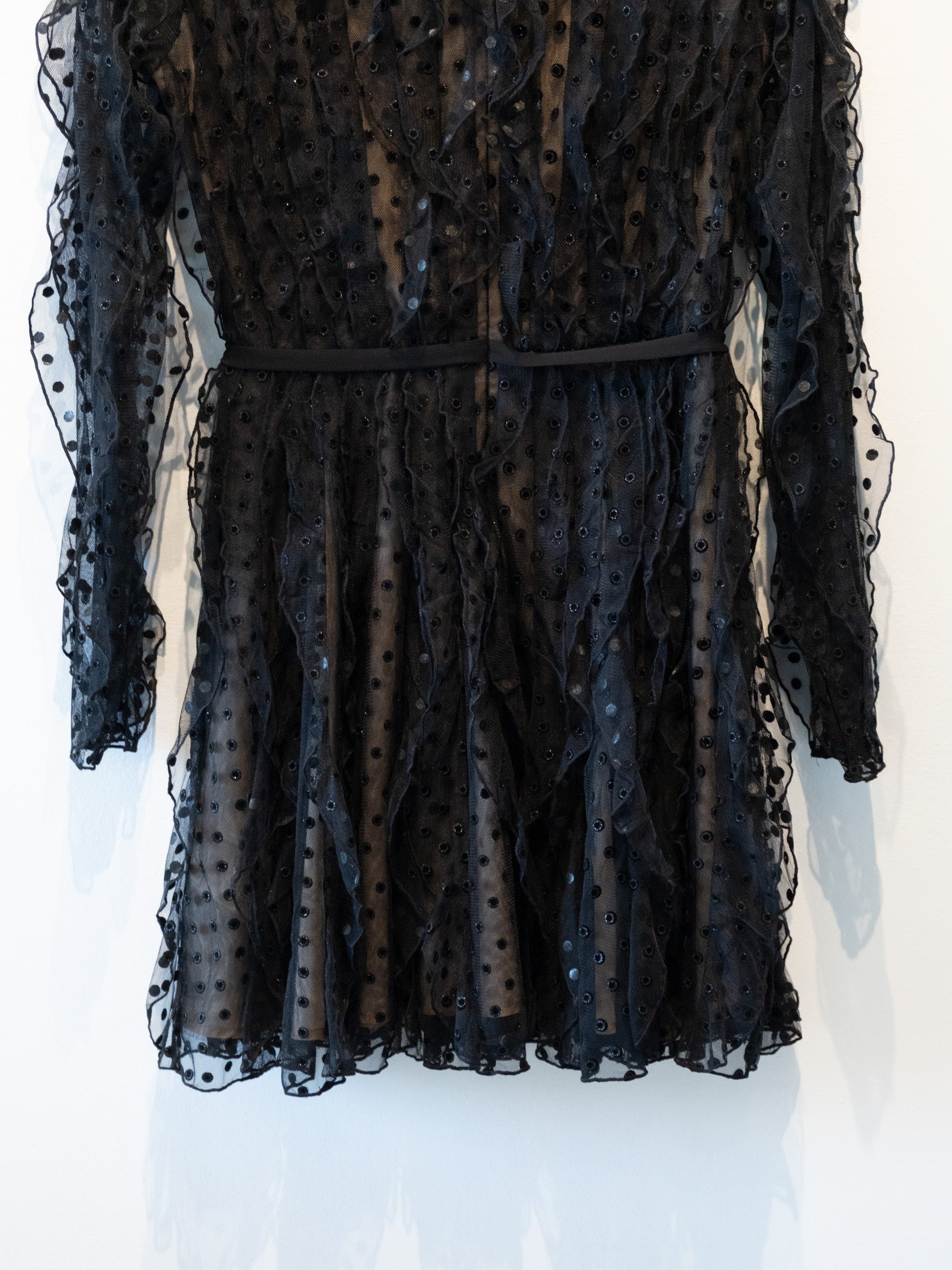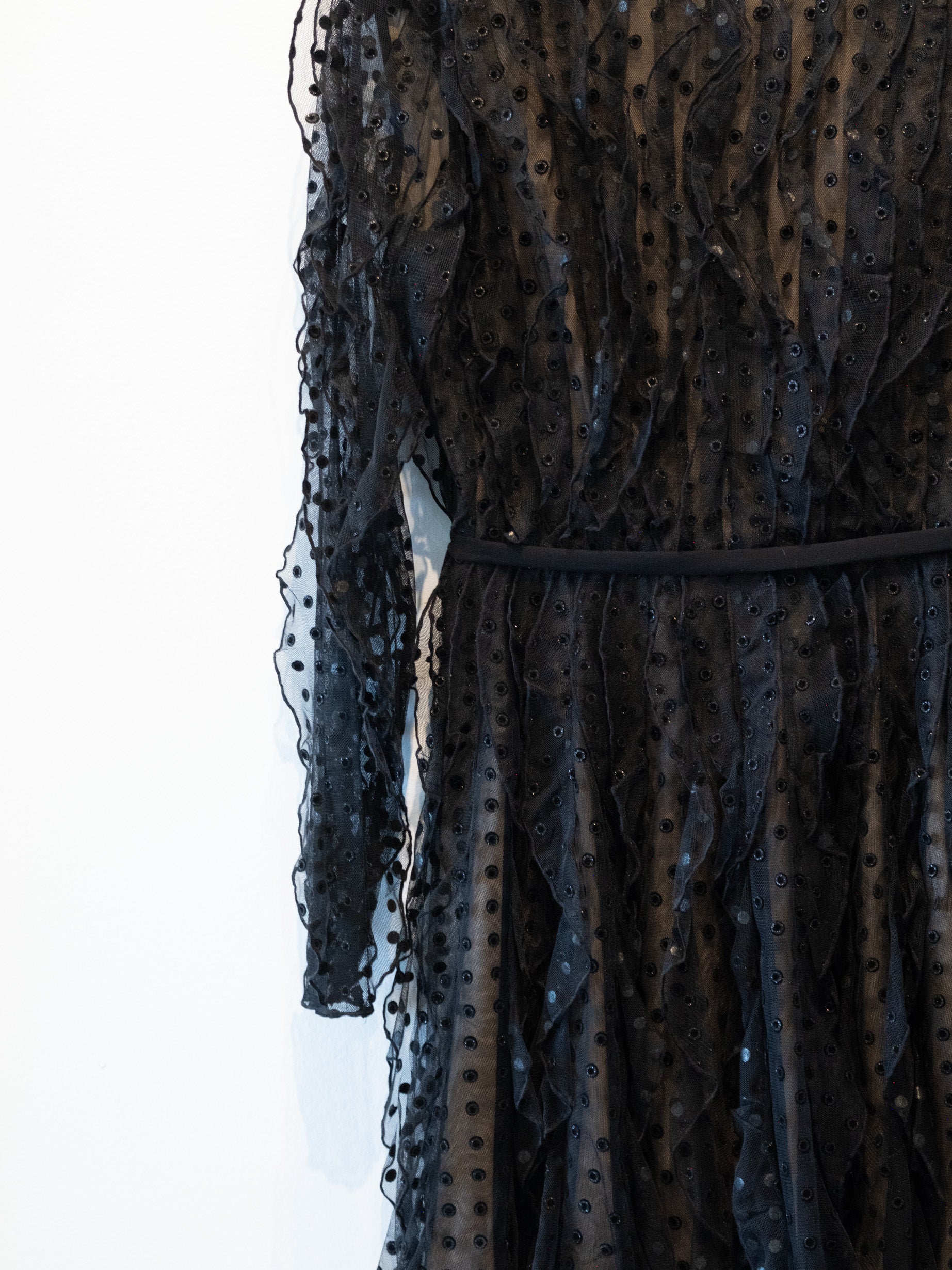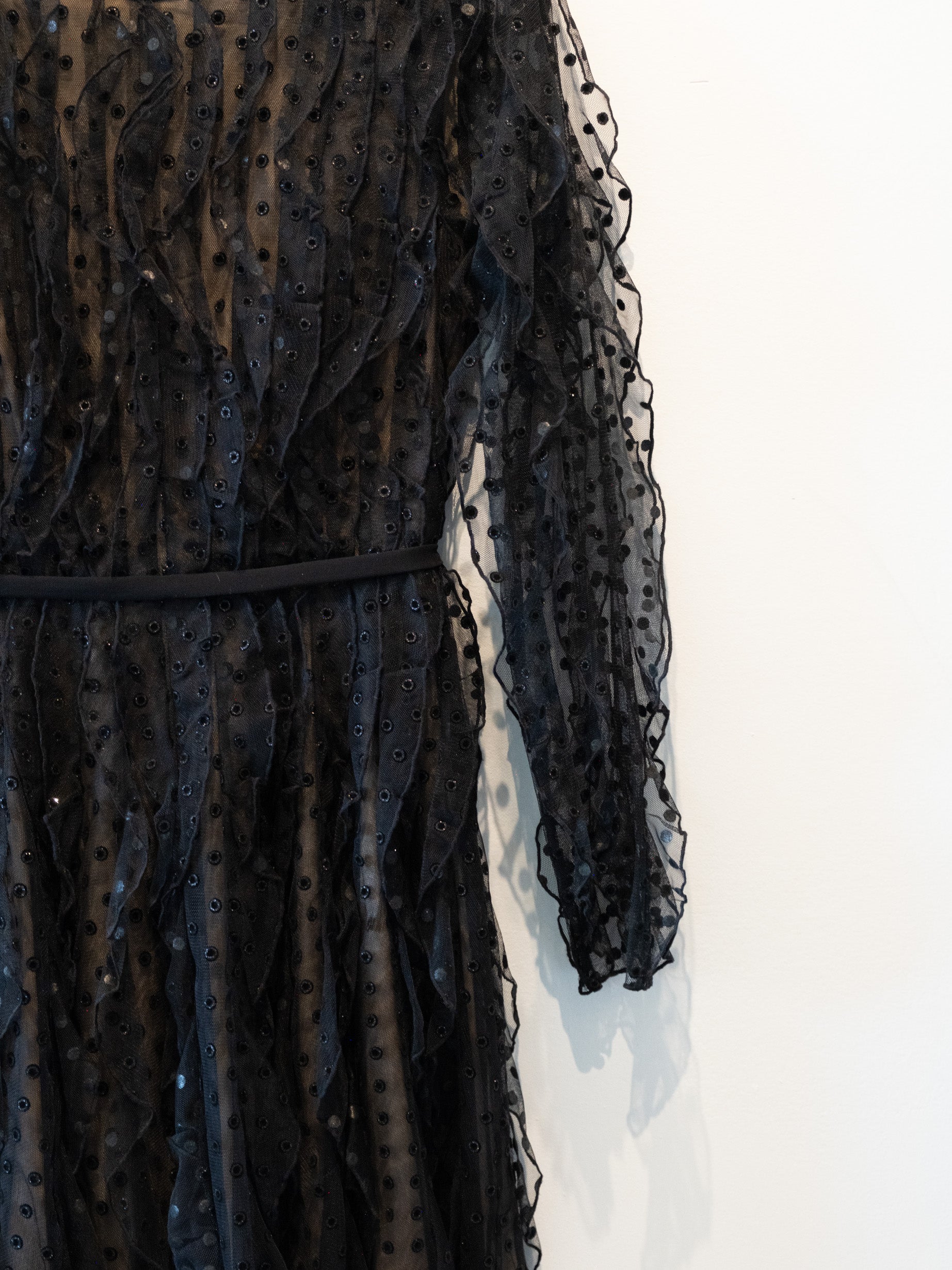 שמלה מהמת בצבע שחור בעלת שרוולים ארוכים עשויה מתחרה ופייטים. השמלה נסגרת באמצעות רוכסן וסוגר וו בגב של השמלה.