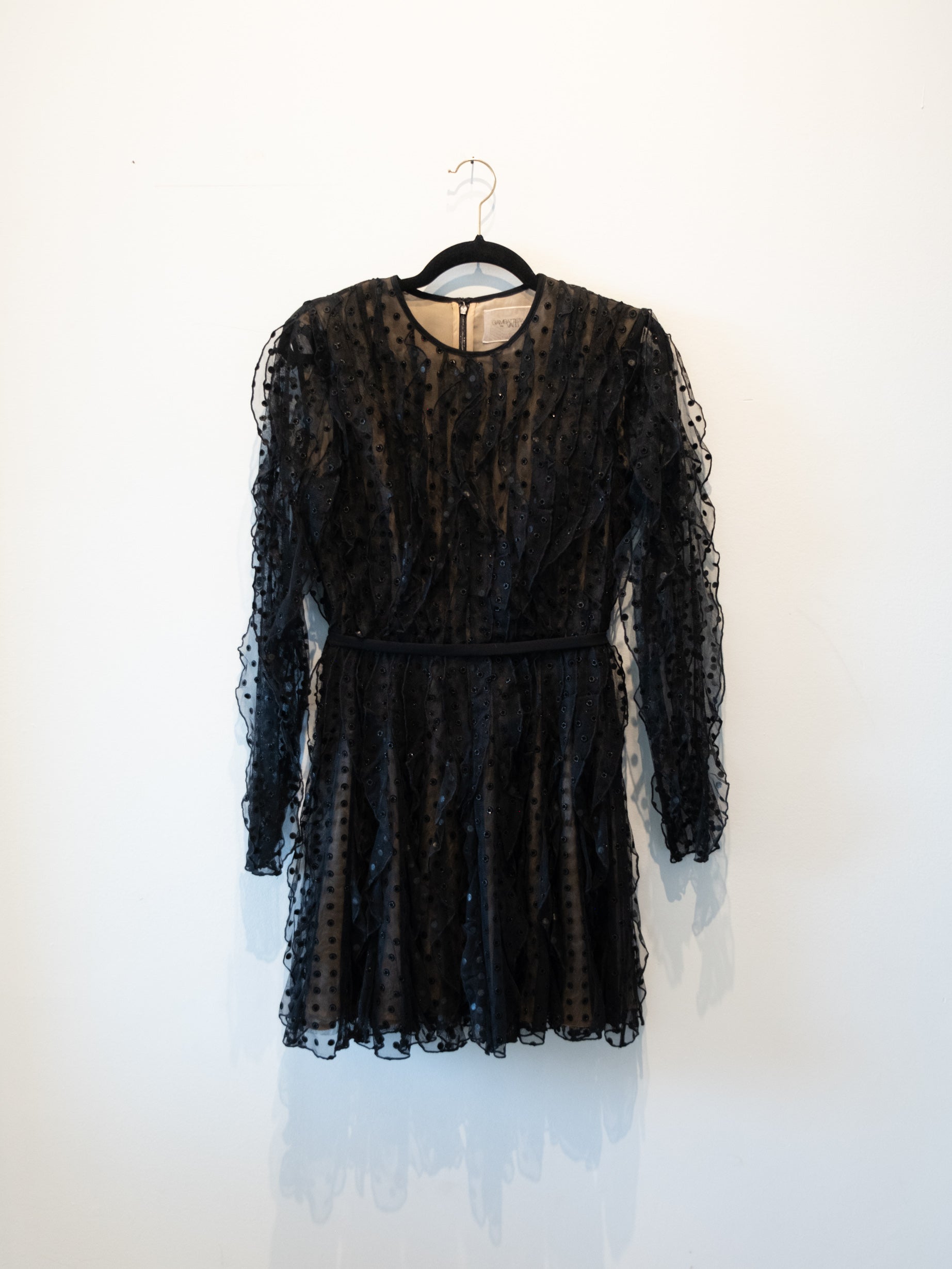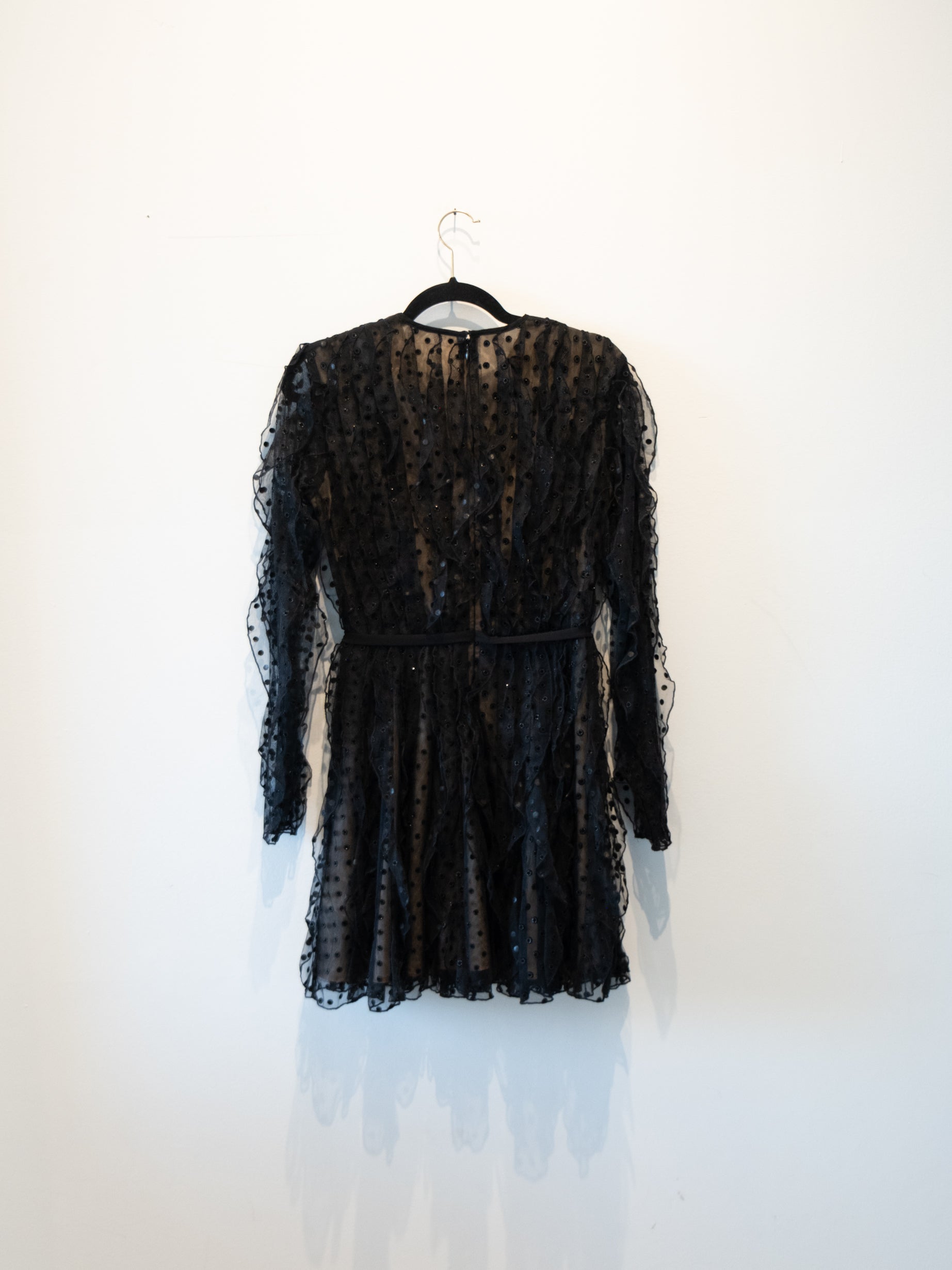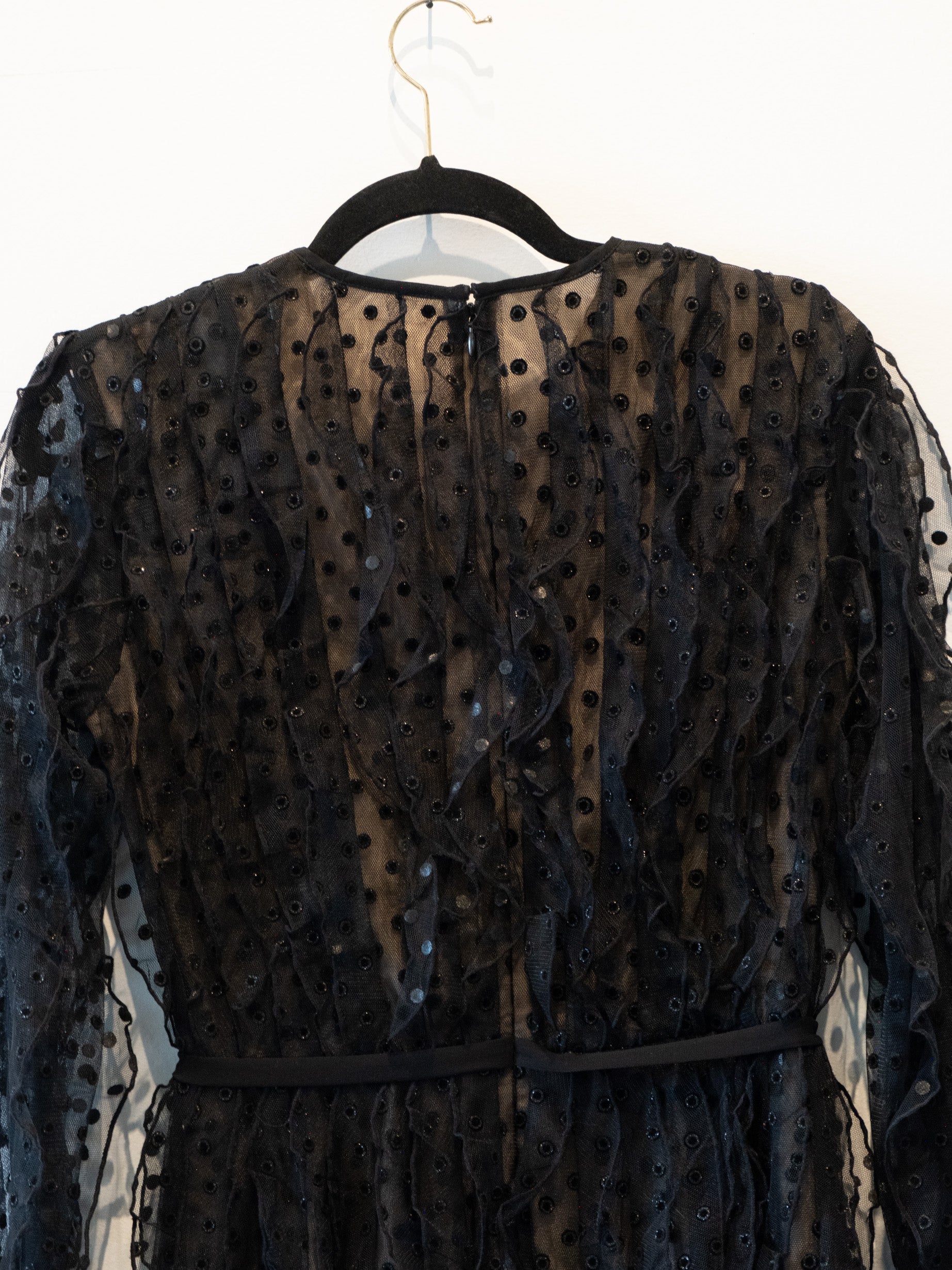 שמלה מהמת בצבע שחור בעלת שרוולים ארוכים עשויה מתחרה ופייטים. השמלה נסגרת באמצעות רוכסן וסוגר וו בגב של השמלה.