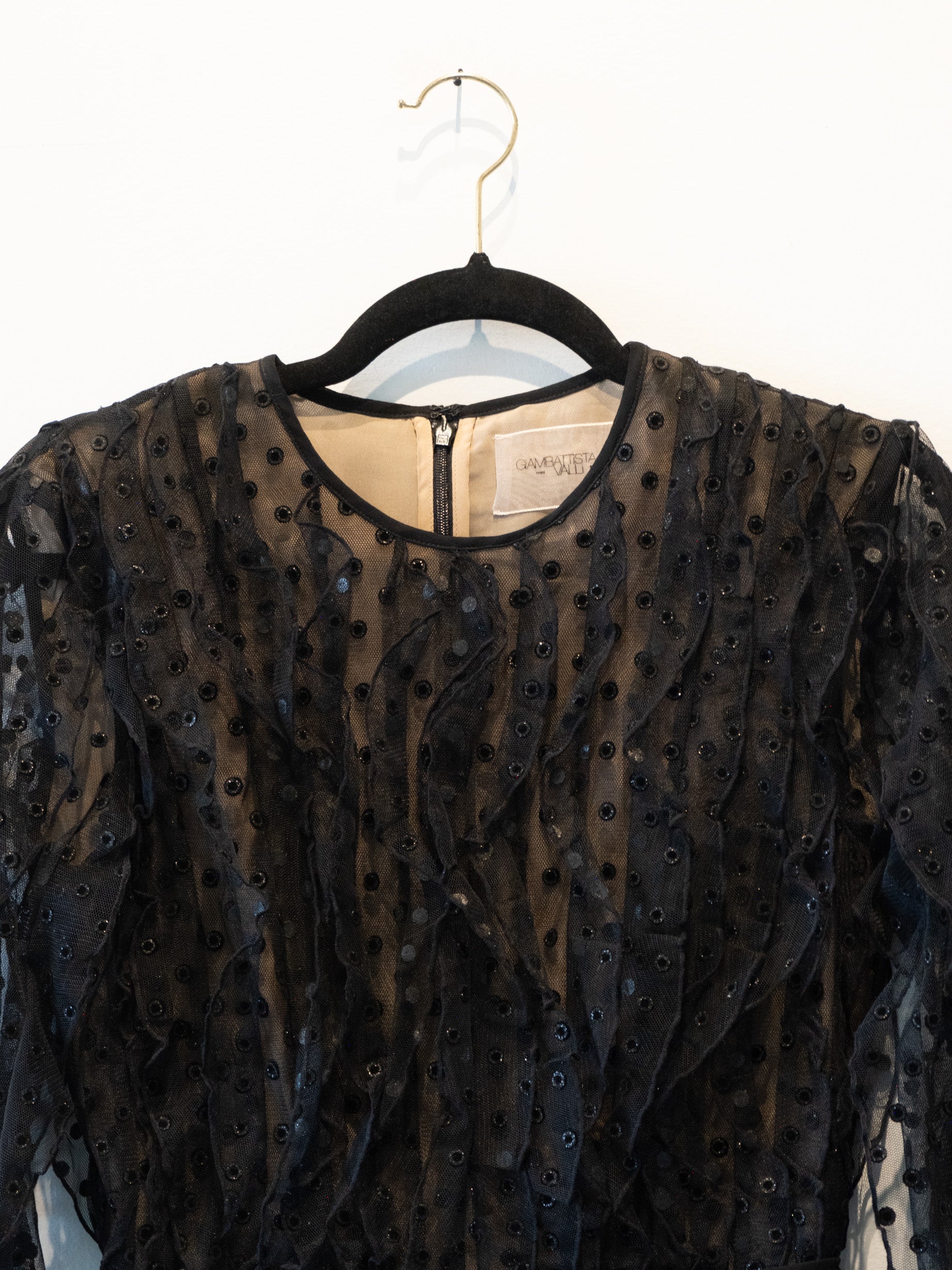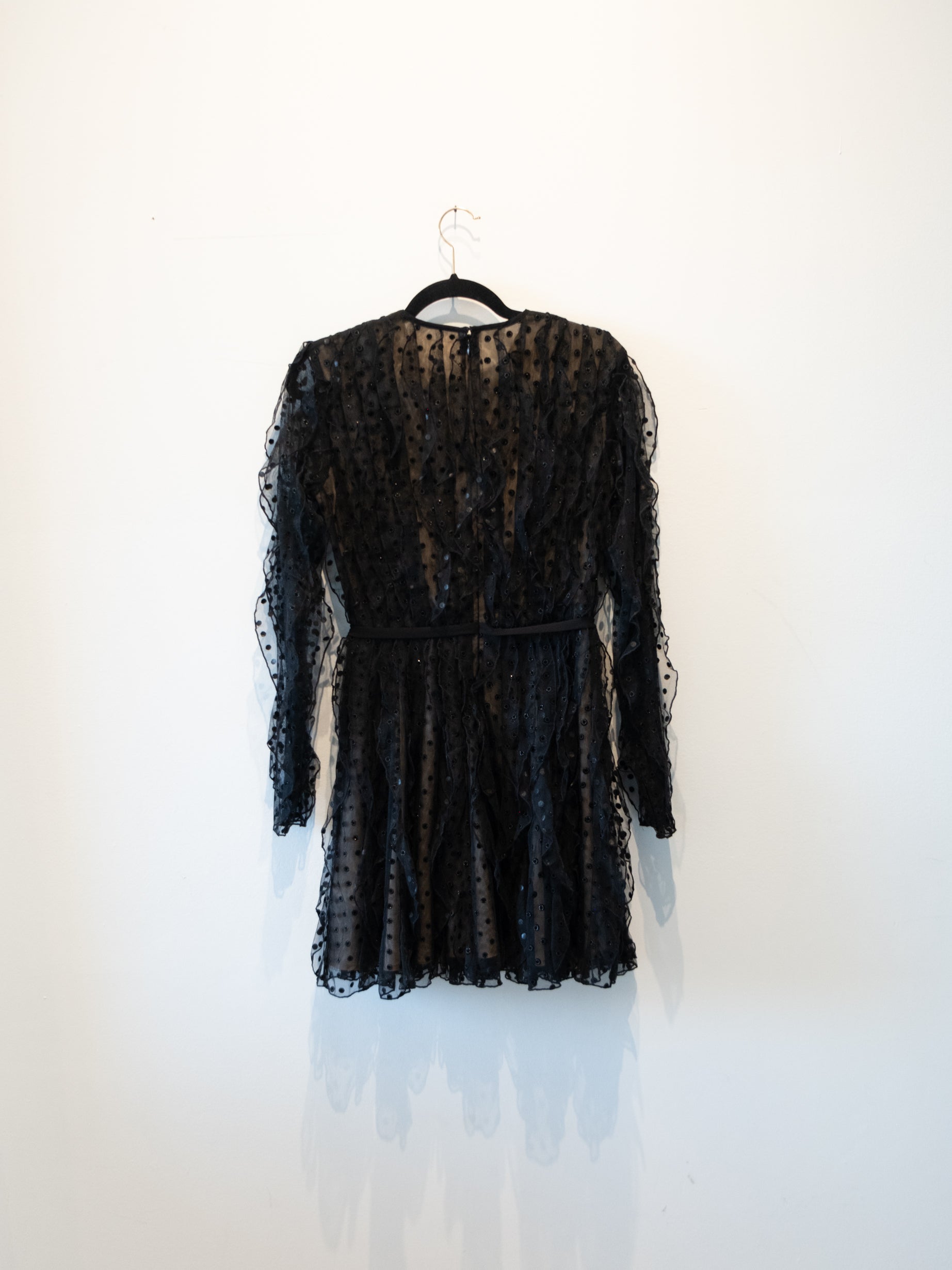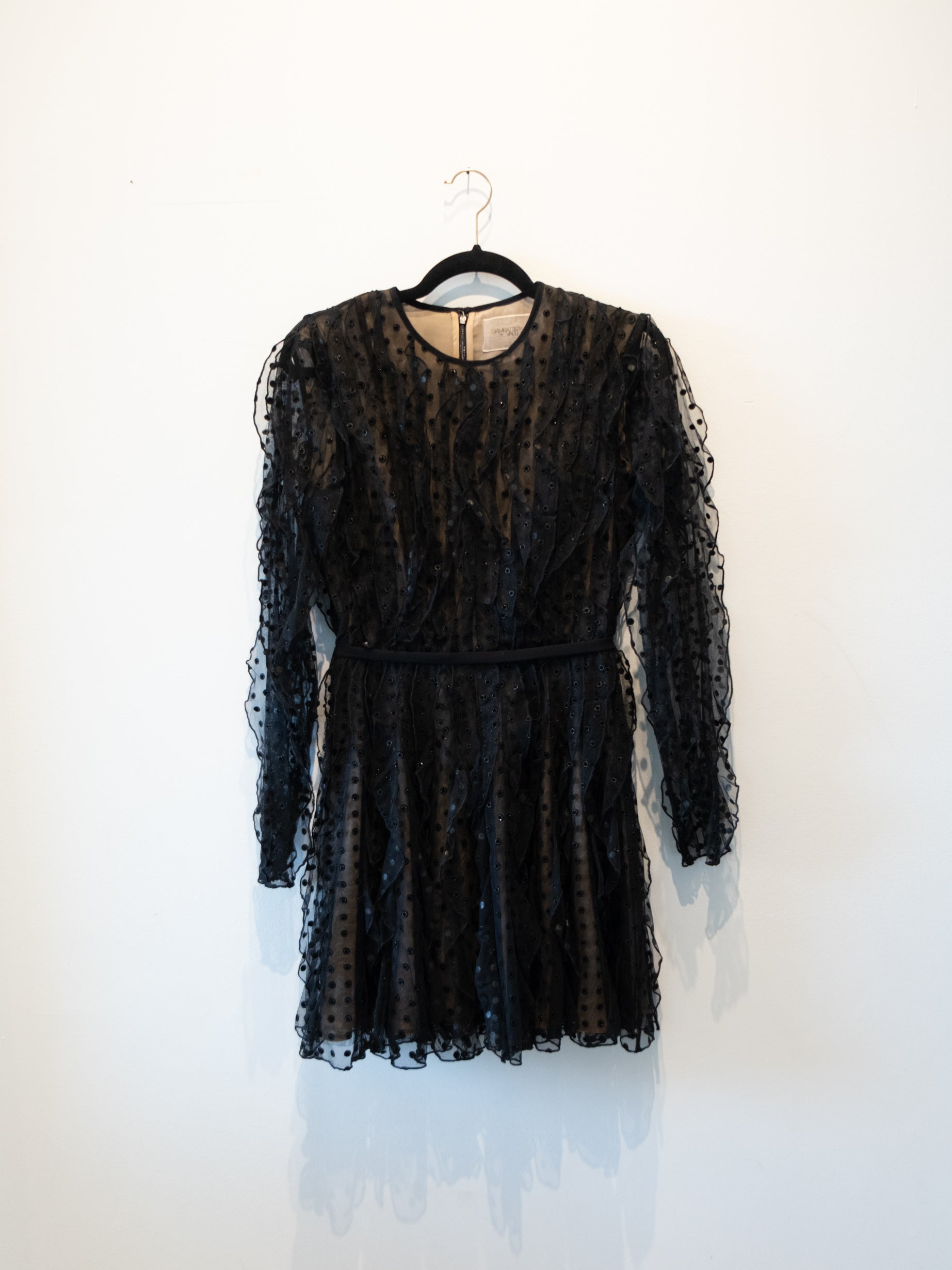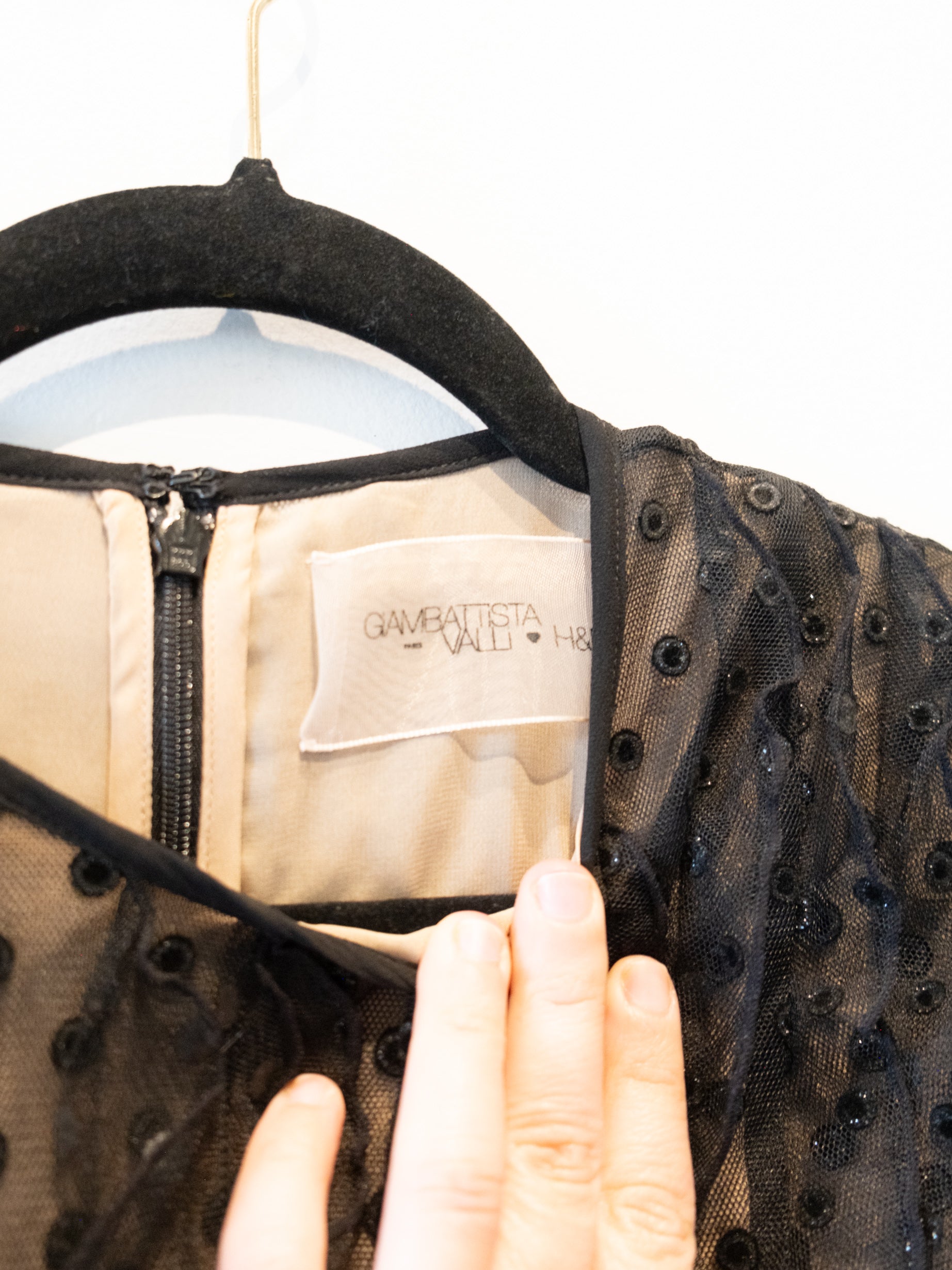 שמלה מהמת בצבע שחור בעלת שרוולים ארוכים עשויה מתחרה ופייטים. השמלה נסגרת באמצעות רוכסן וסוגר וו בגב של השמלה.