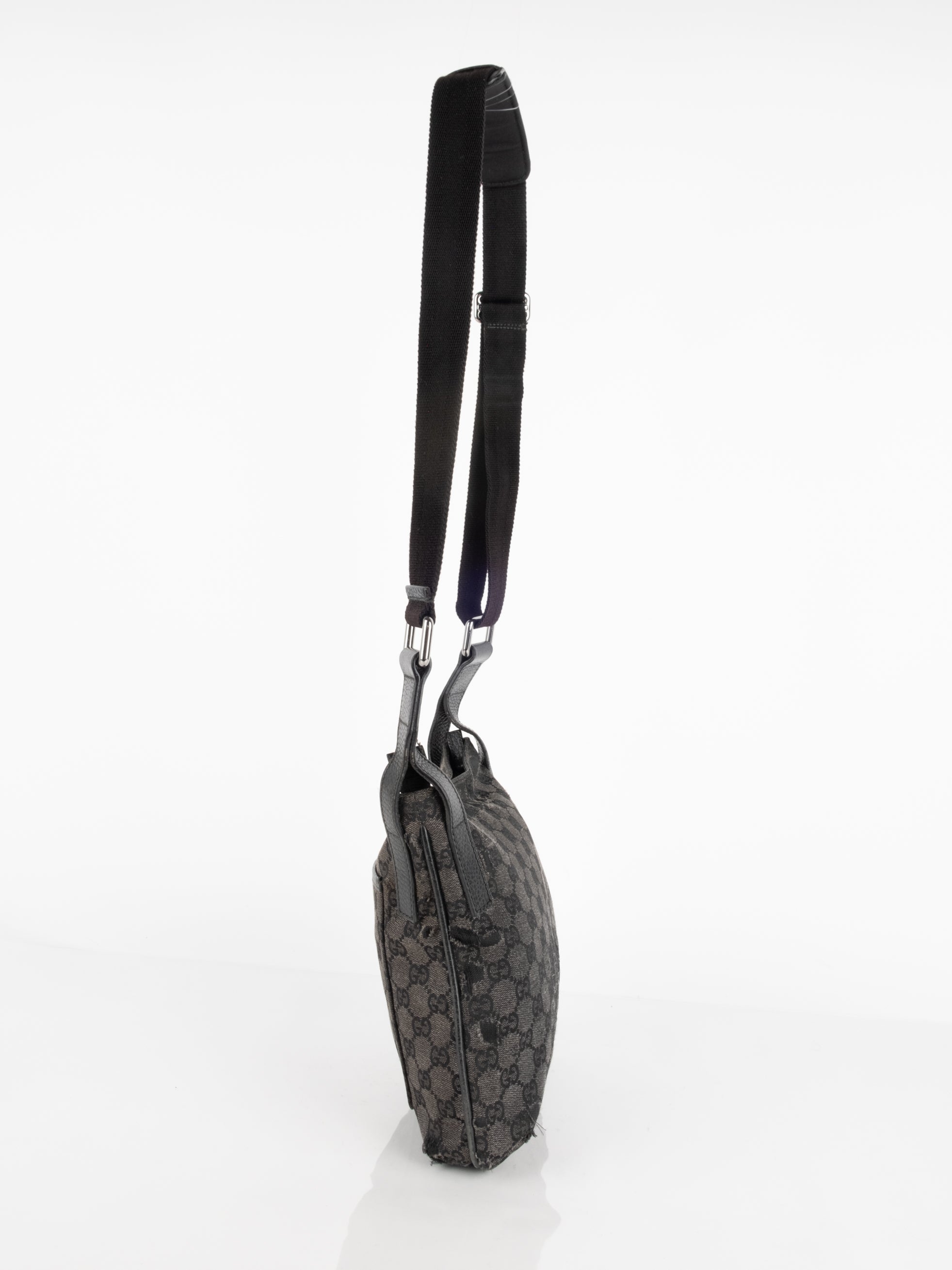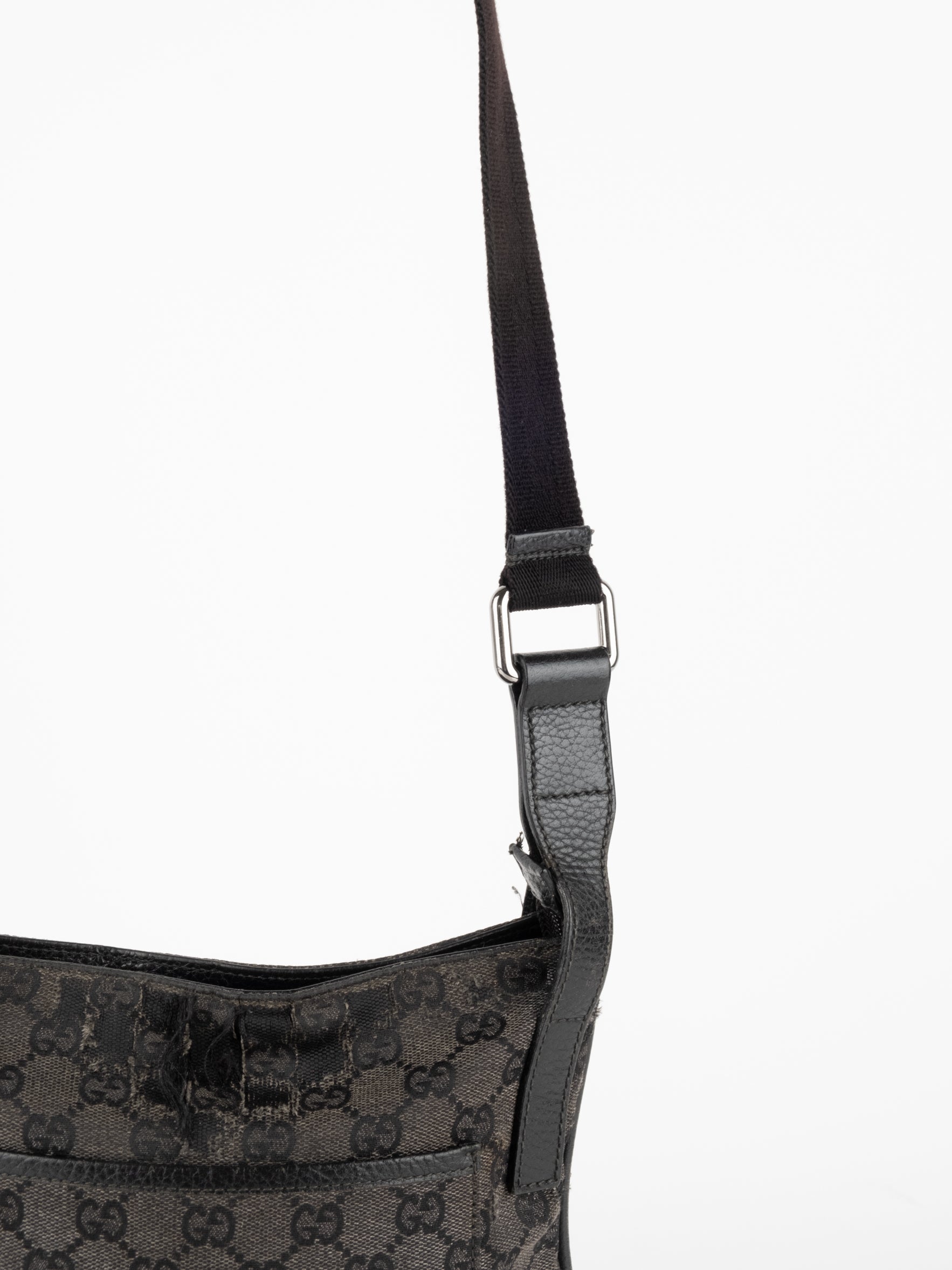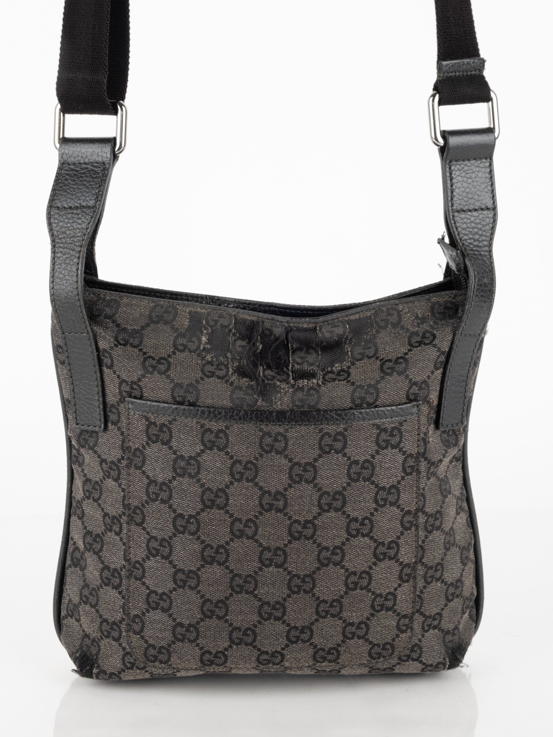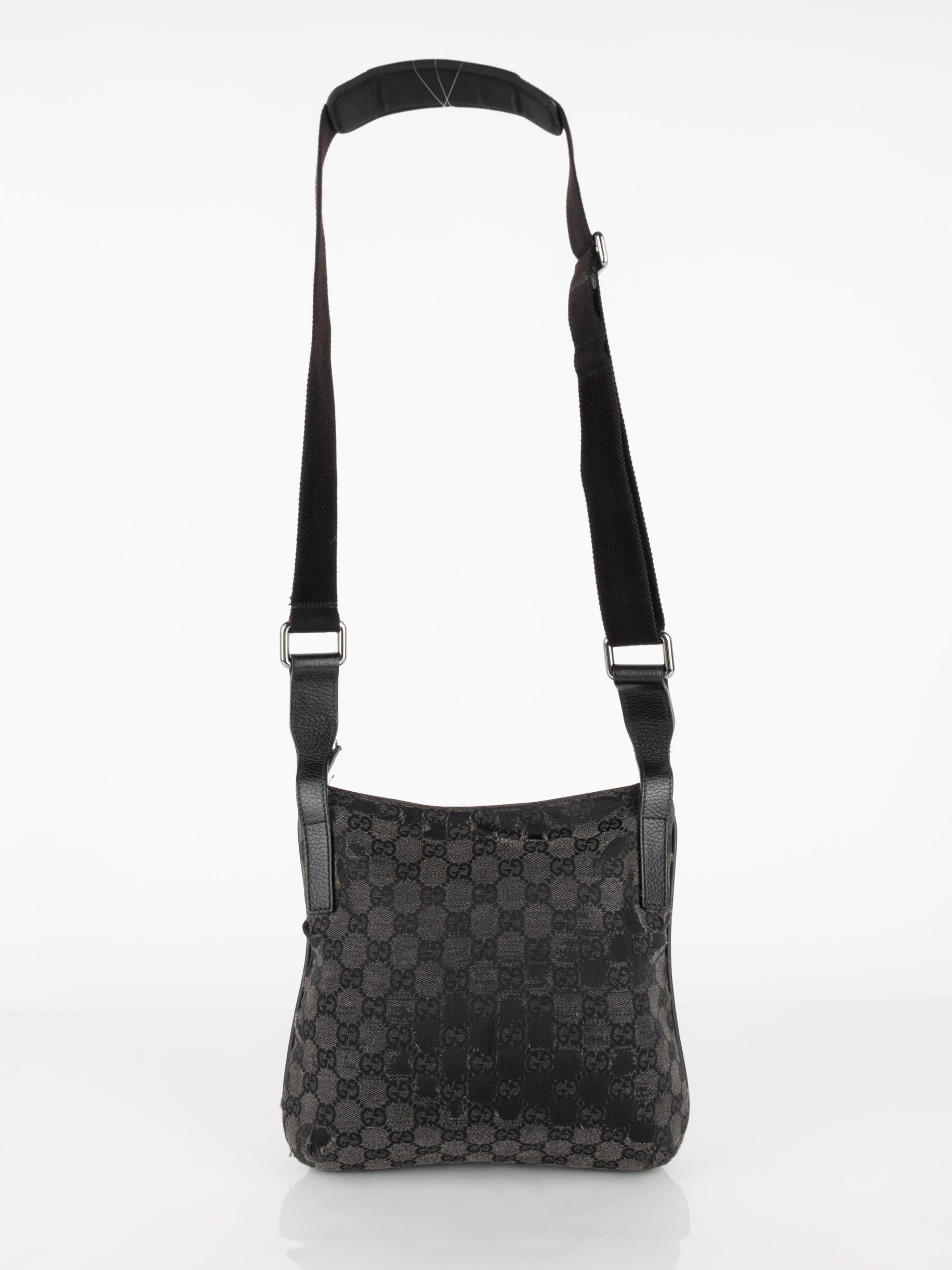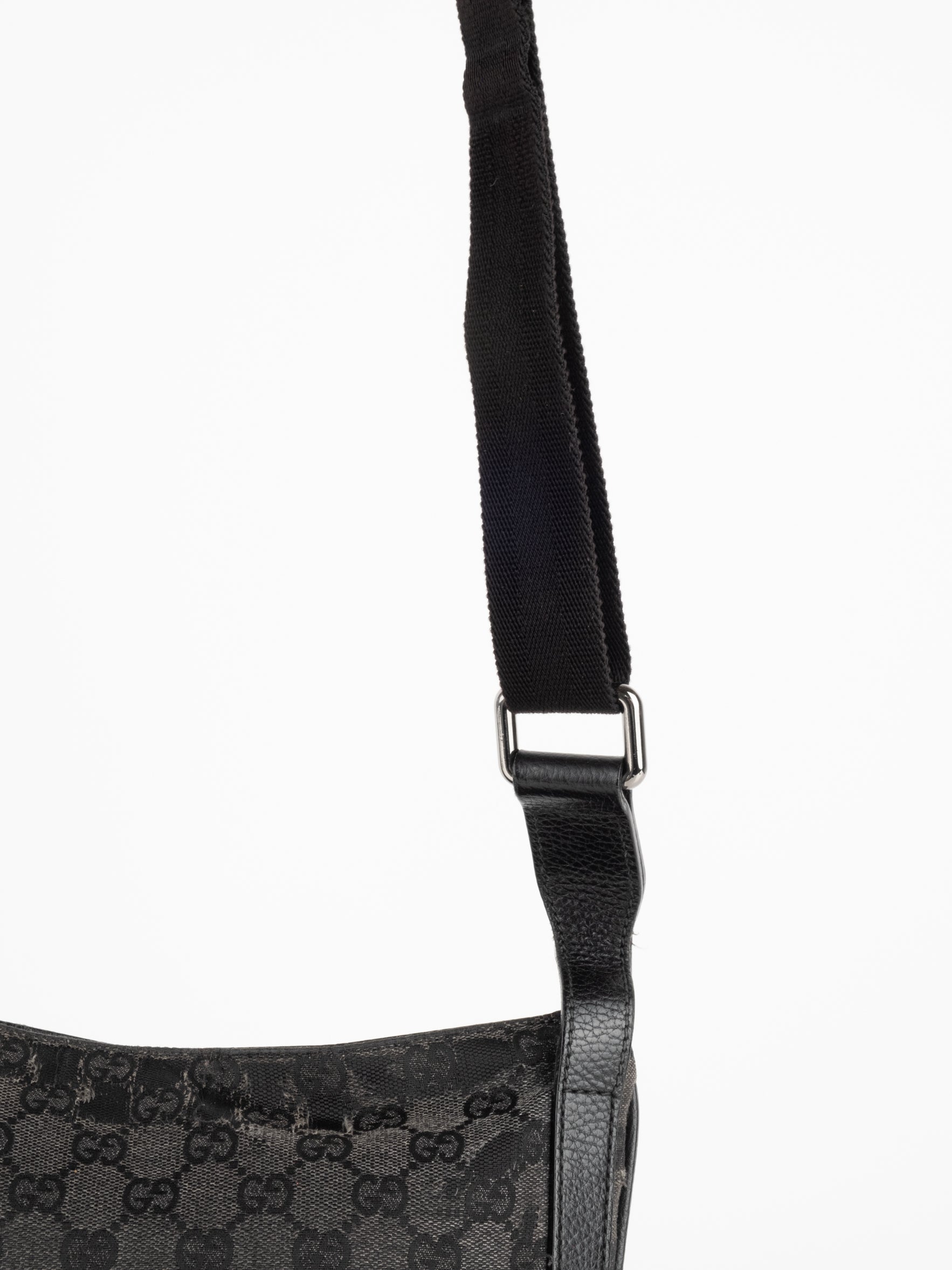 תיק כתף (מתאים לקרוסבודי) העשוי מבד קנבס בשילוש של עור בצבע שחור בהדפס המונוגרמי המוכר של המותג האיטלקי, בעל רצועה העשויה מבד שניתן לכוון ודיטיילים כסופים.