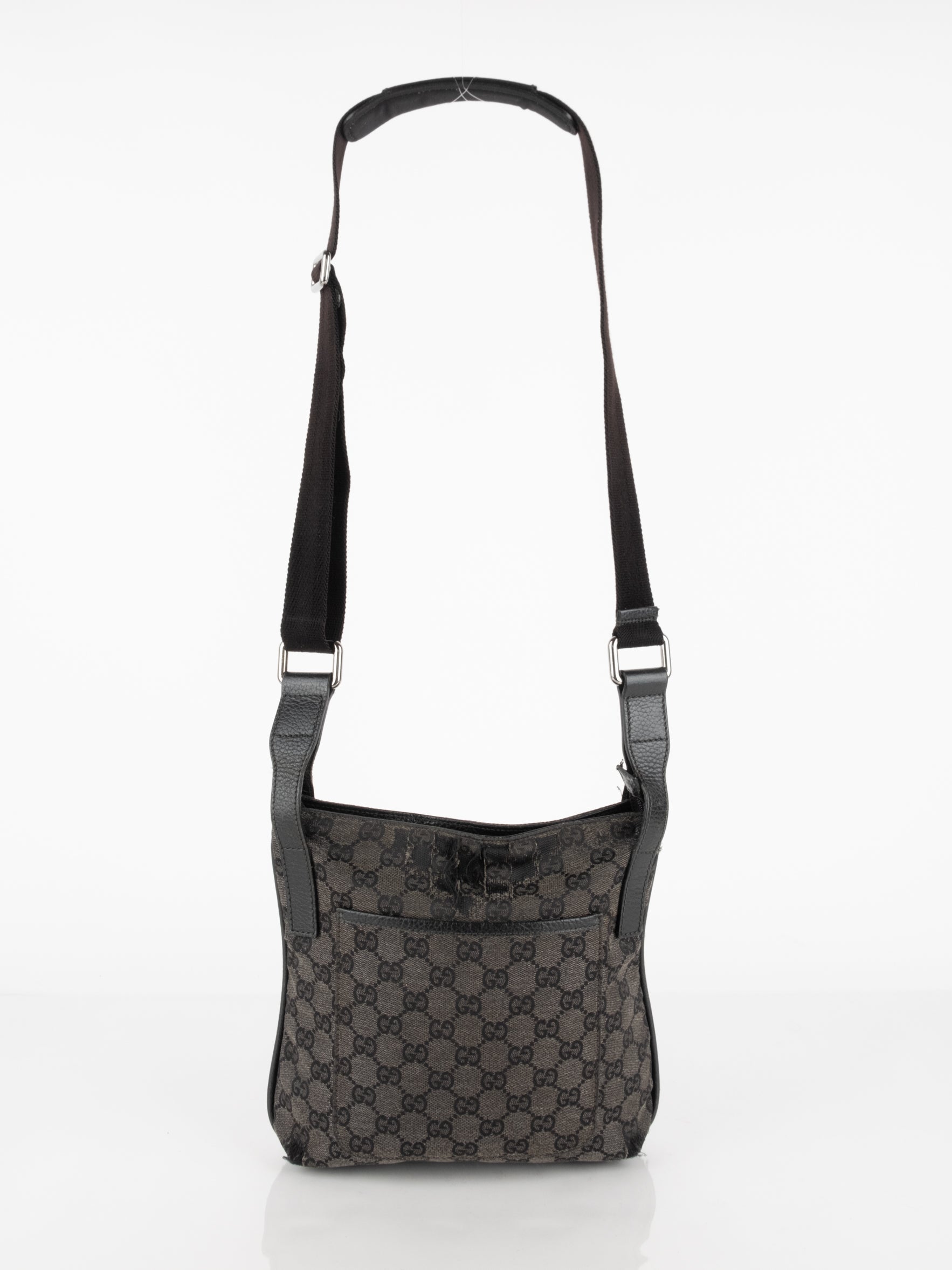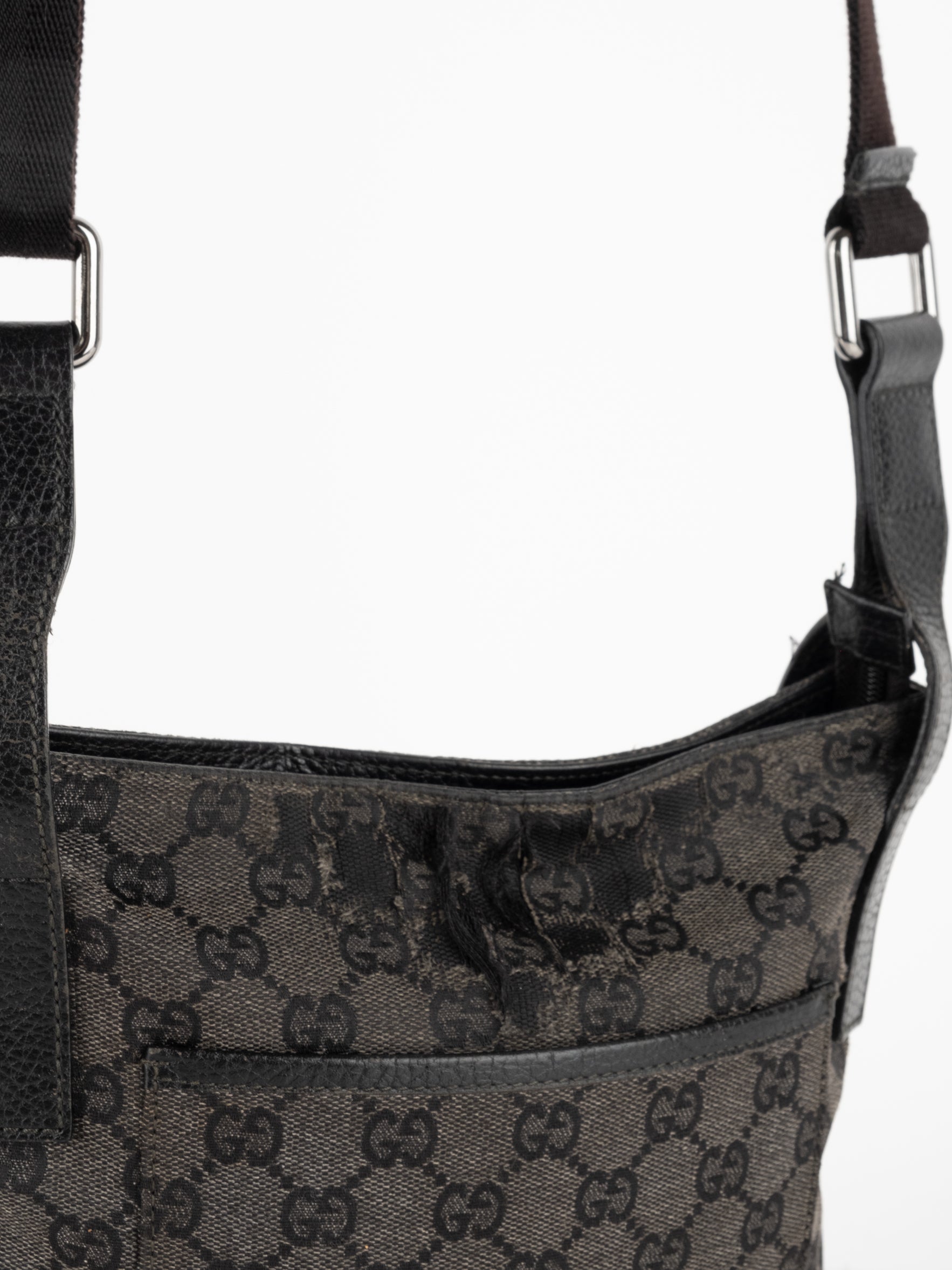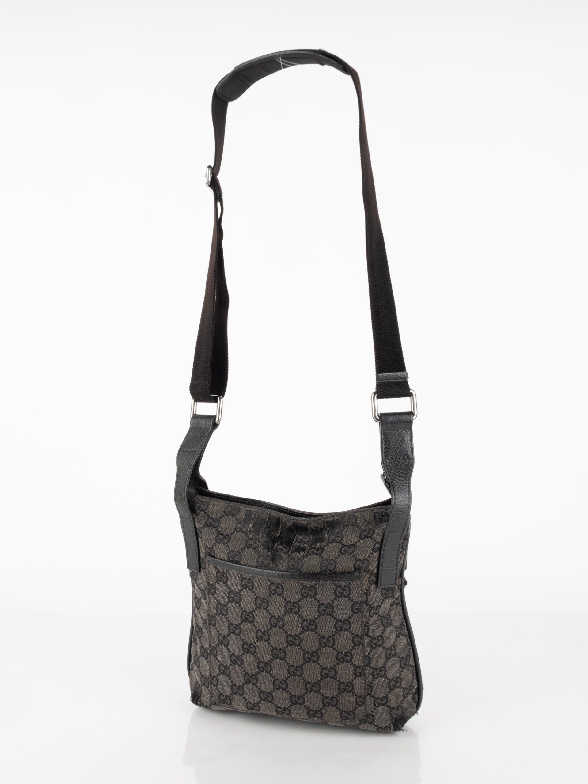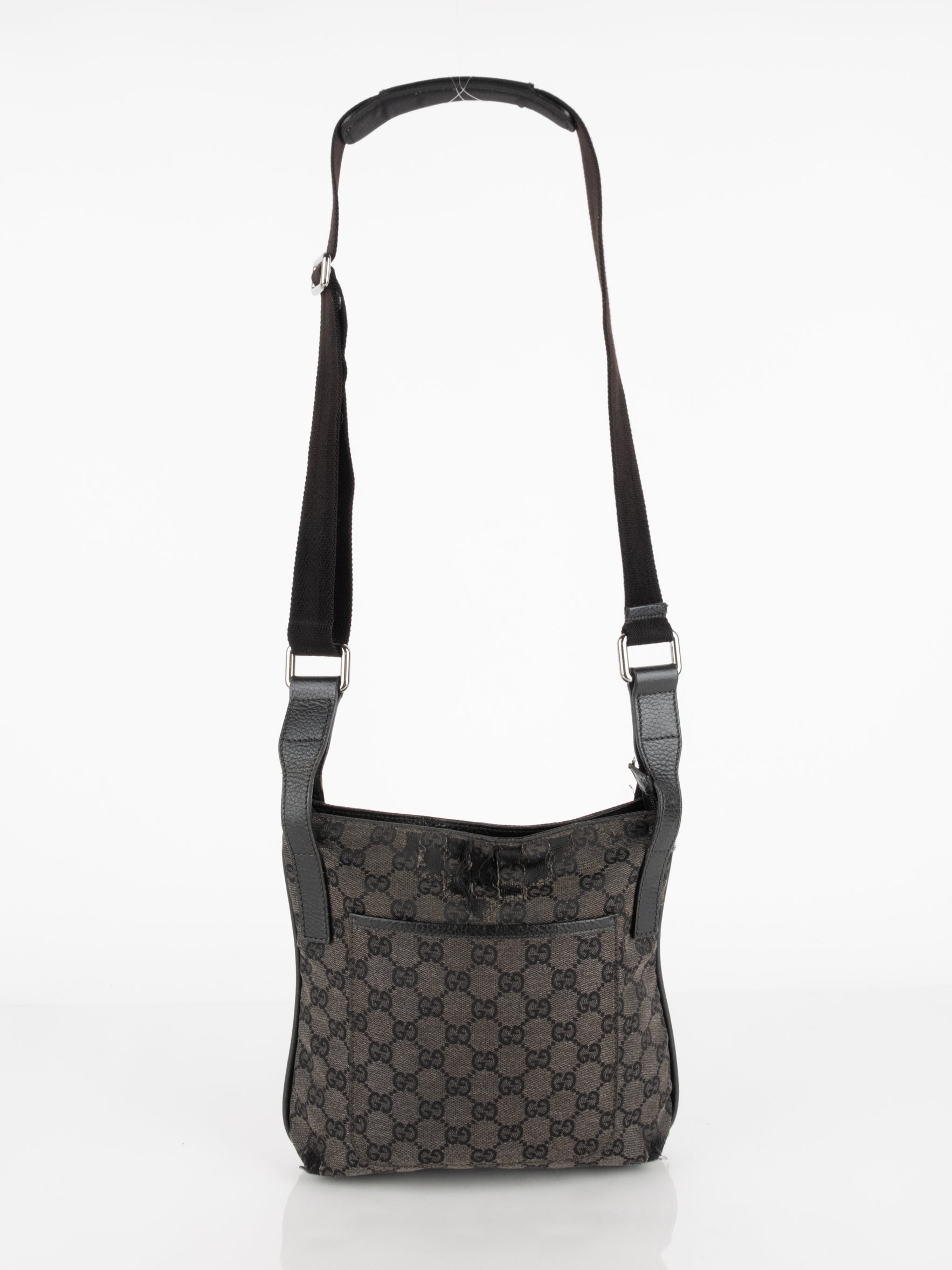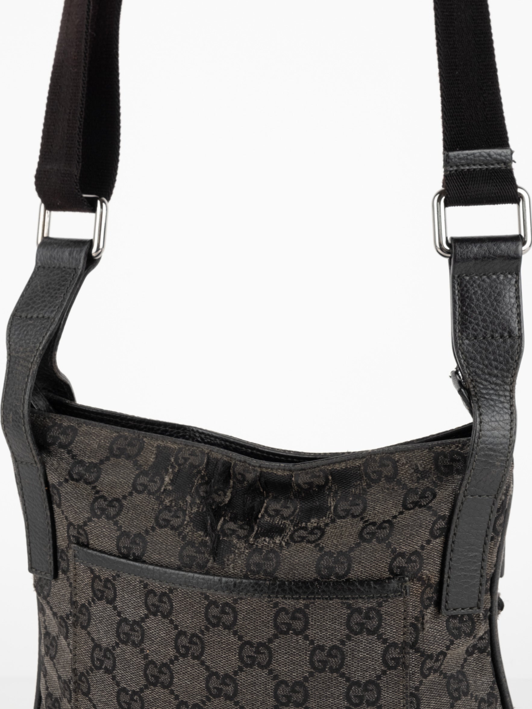 תיק כתף (מתאים לקרוסבודי) העשוי מבד קנבס בשילוש של עור בצבע שחור בהדפס המונוגרמי המוכר של המותג האיטלקי, בעל רצועה העשויה מבד שניתן לכוון ודיטיילים כסופים.