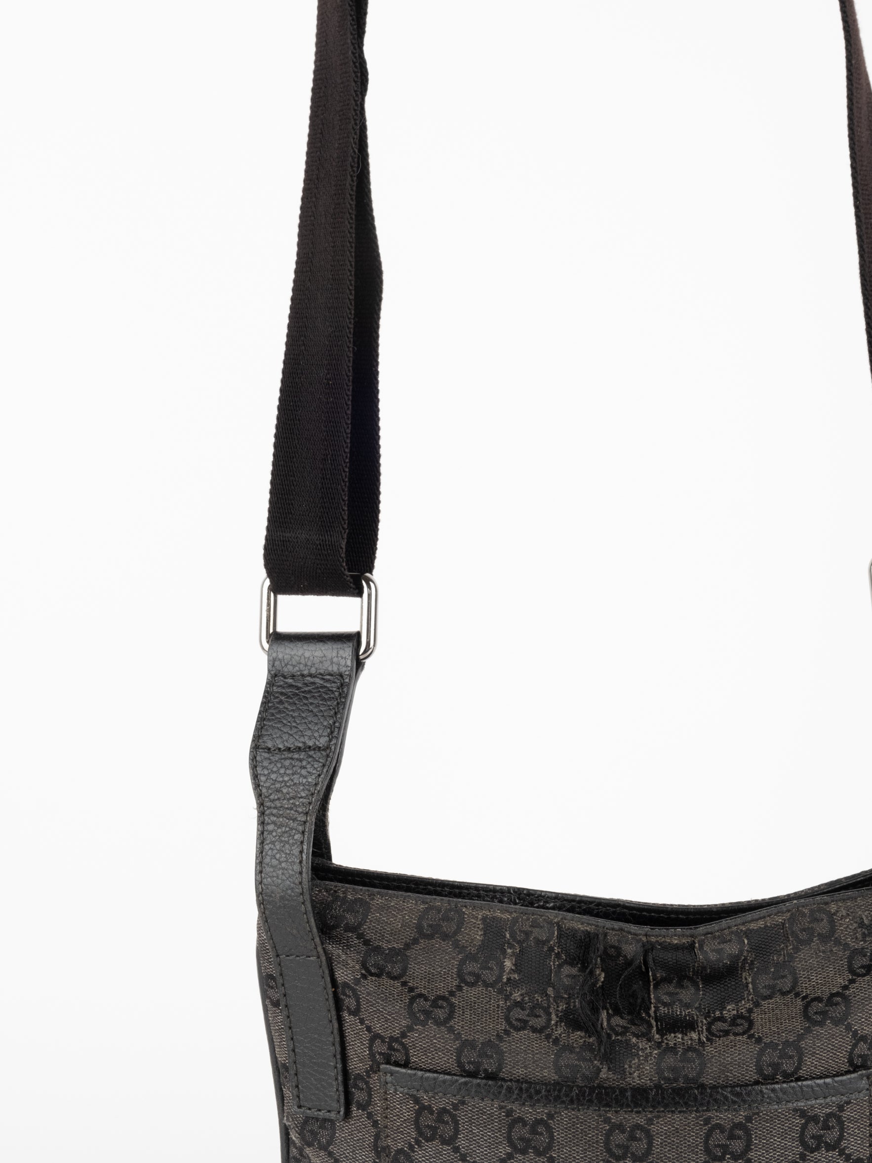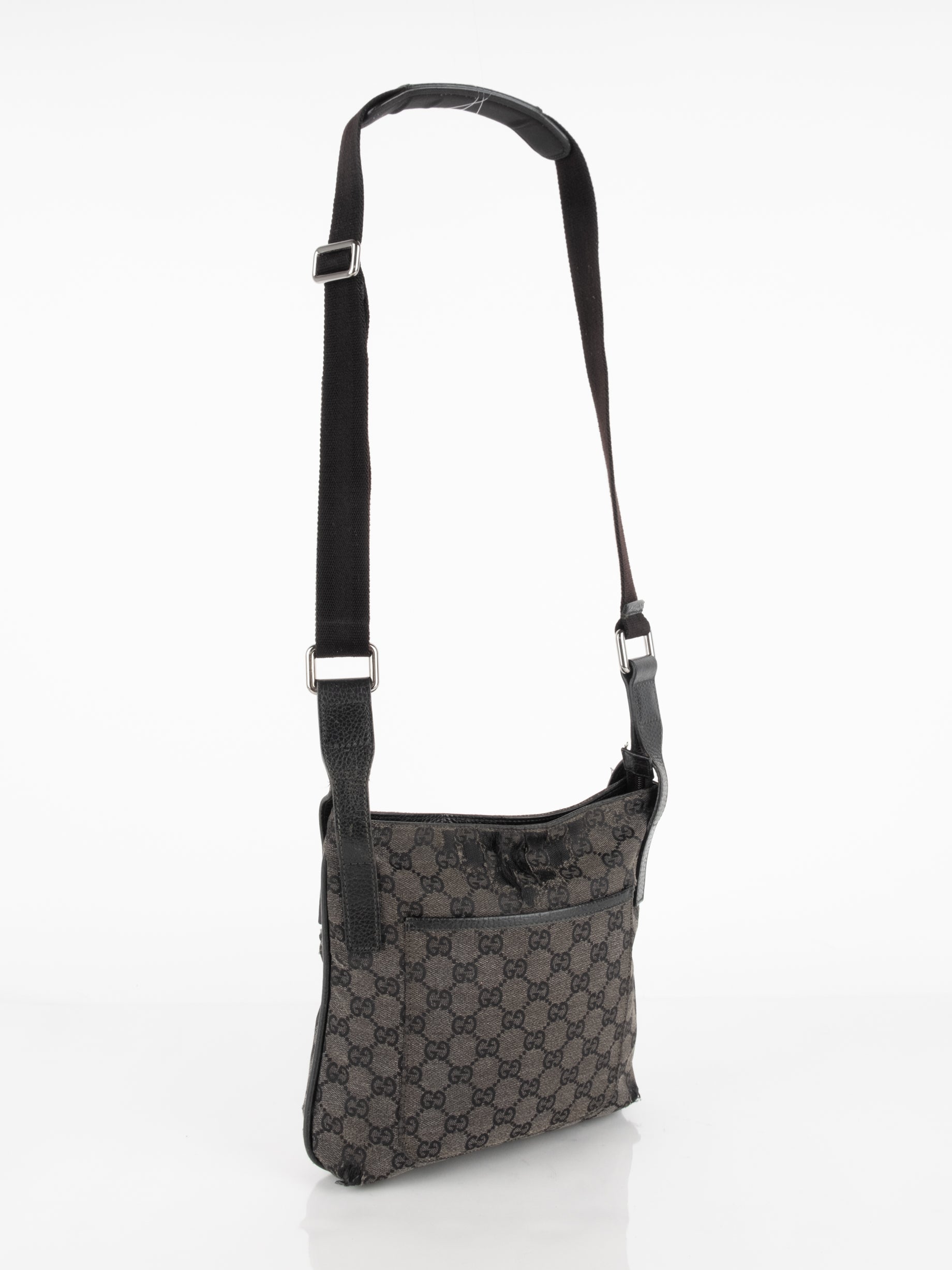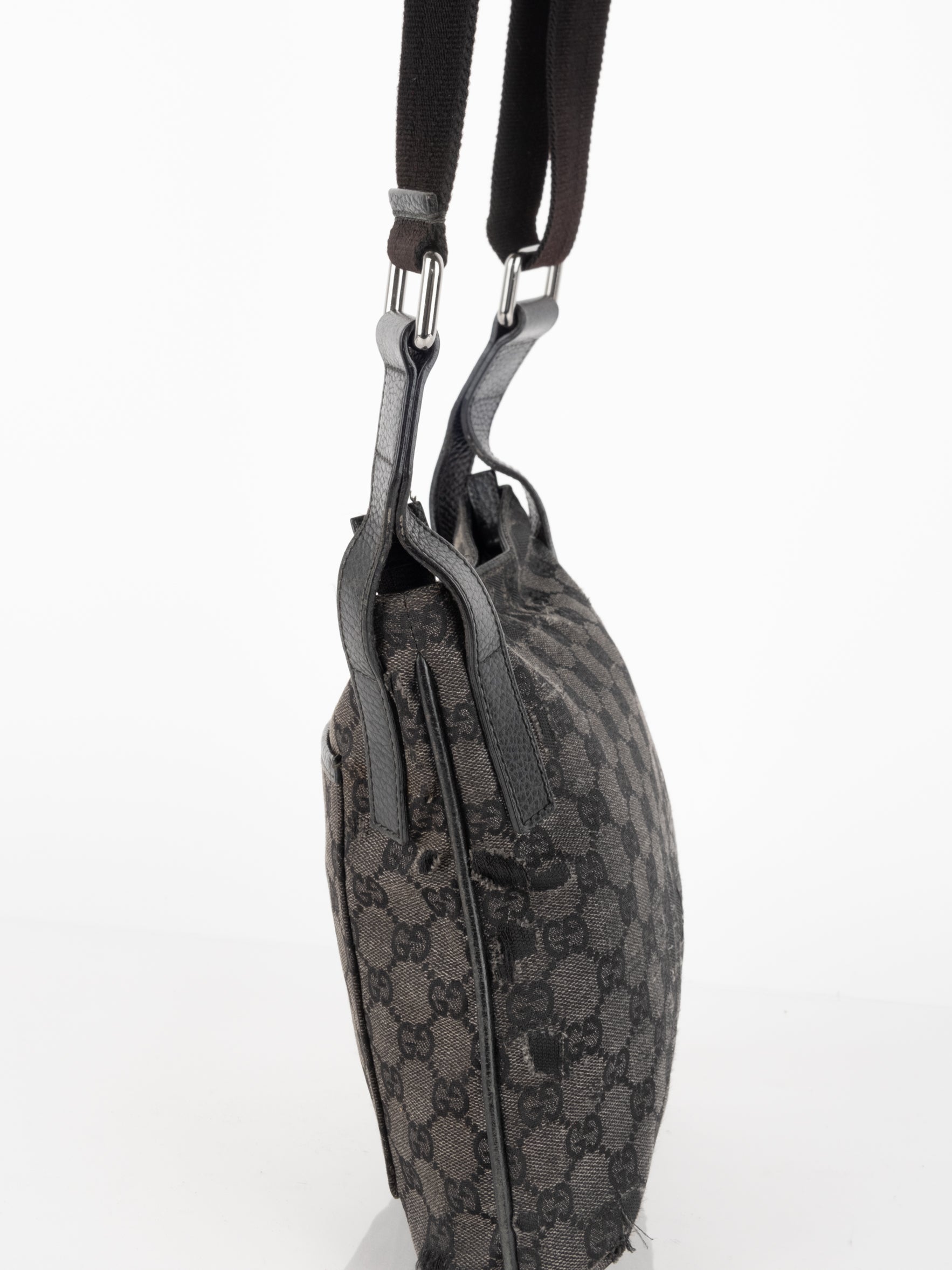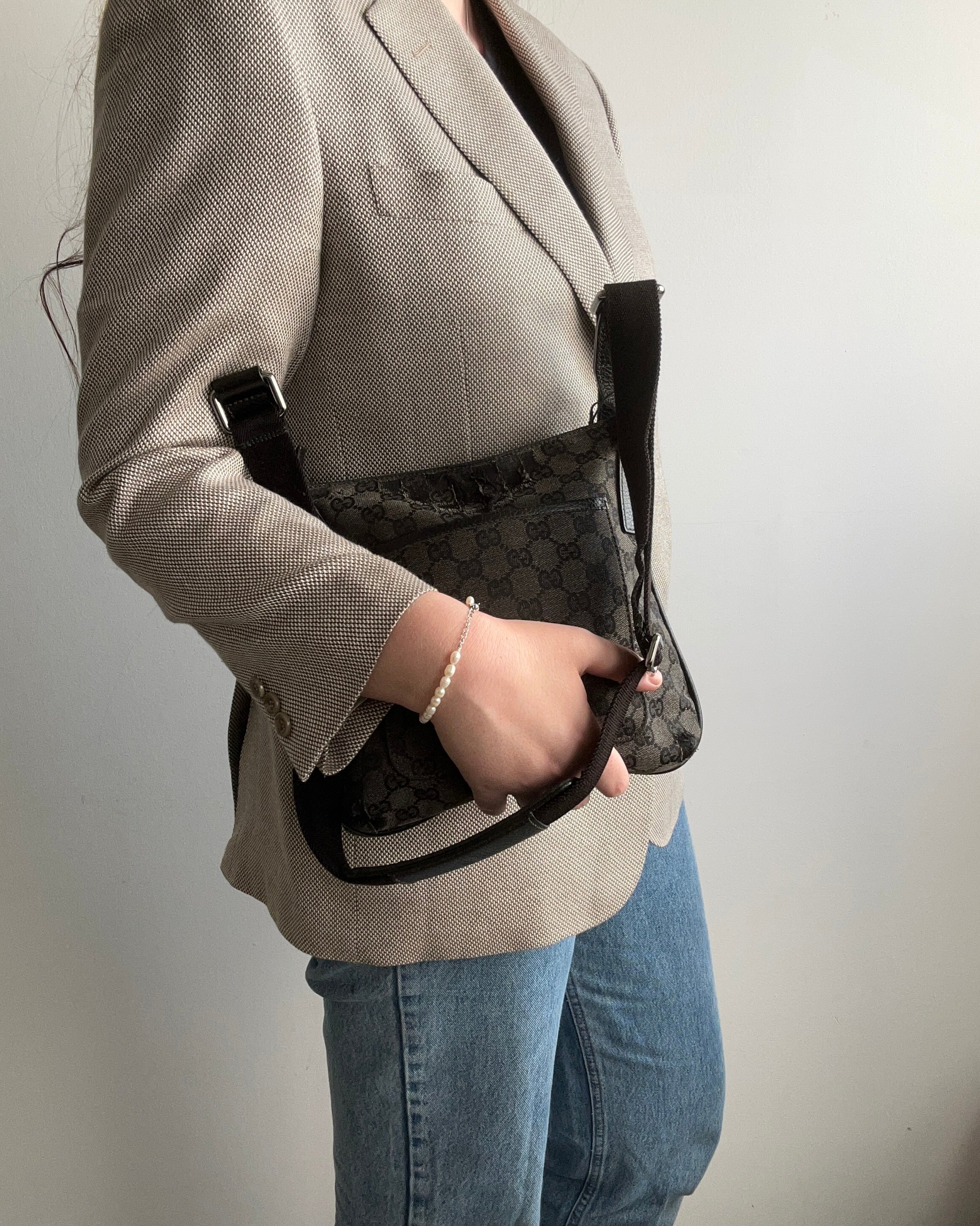 תיק כתף (מתאים לקרוסבודי) העשוי מבד קנבס בשילוש של עור בצבע שחור בהדפס המונוגרמי המוכר של המותג האיטלקי, בעל רצועה העשויה מבד שניתן לכוון ודיטיילים כסופים.