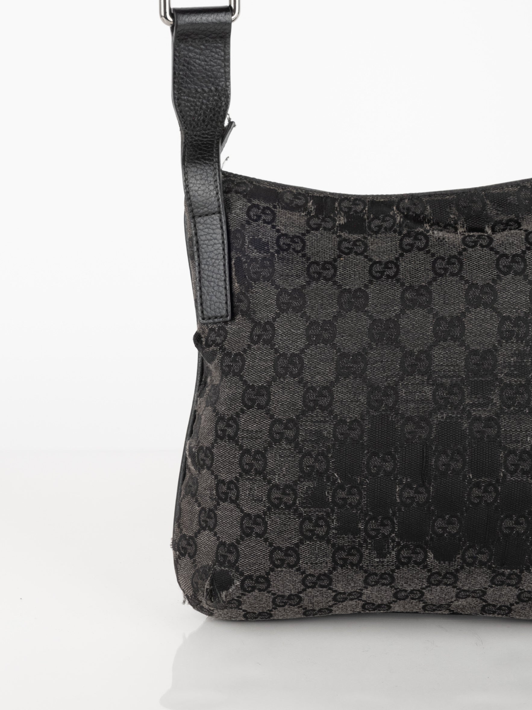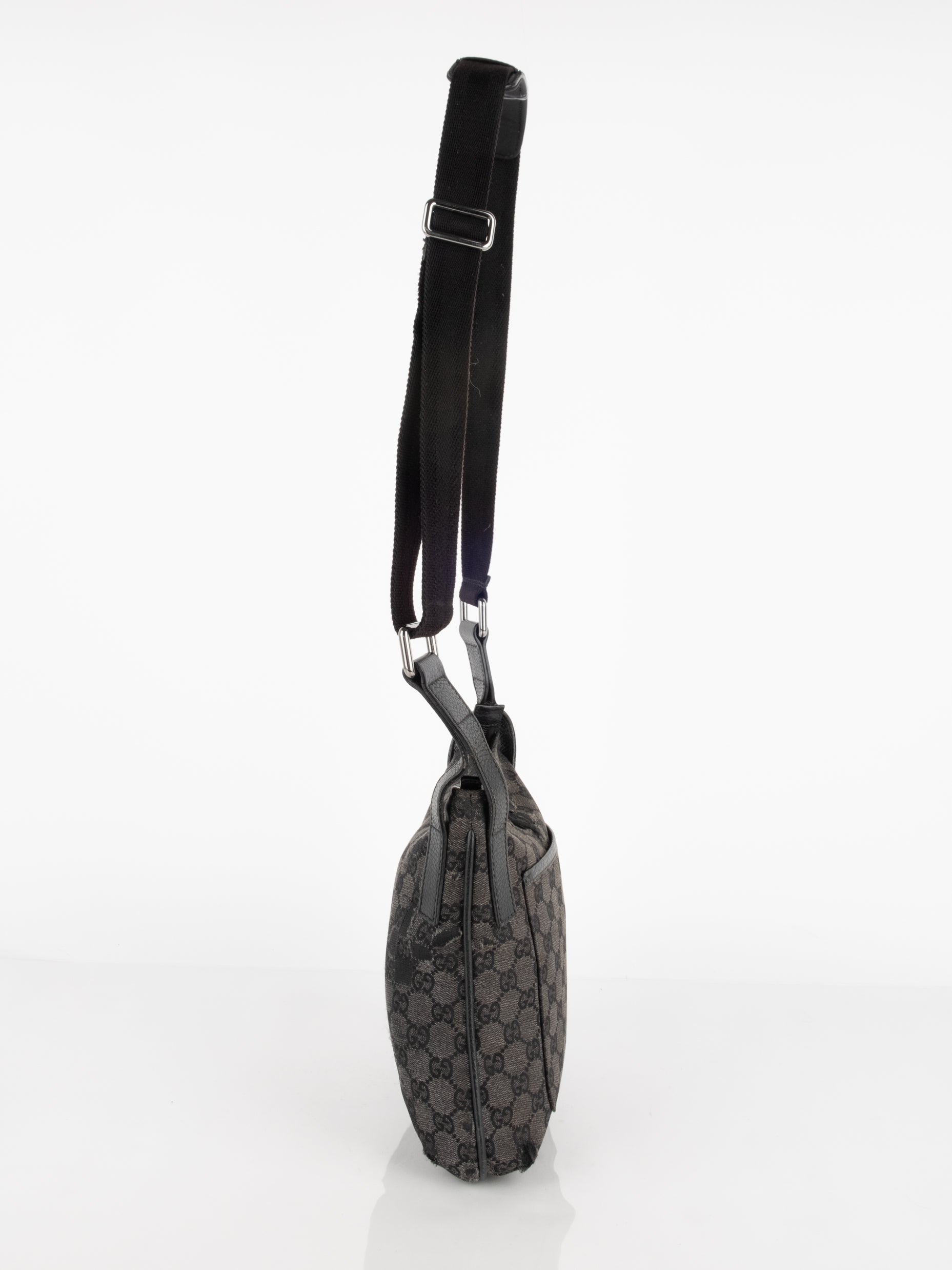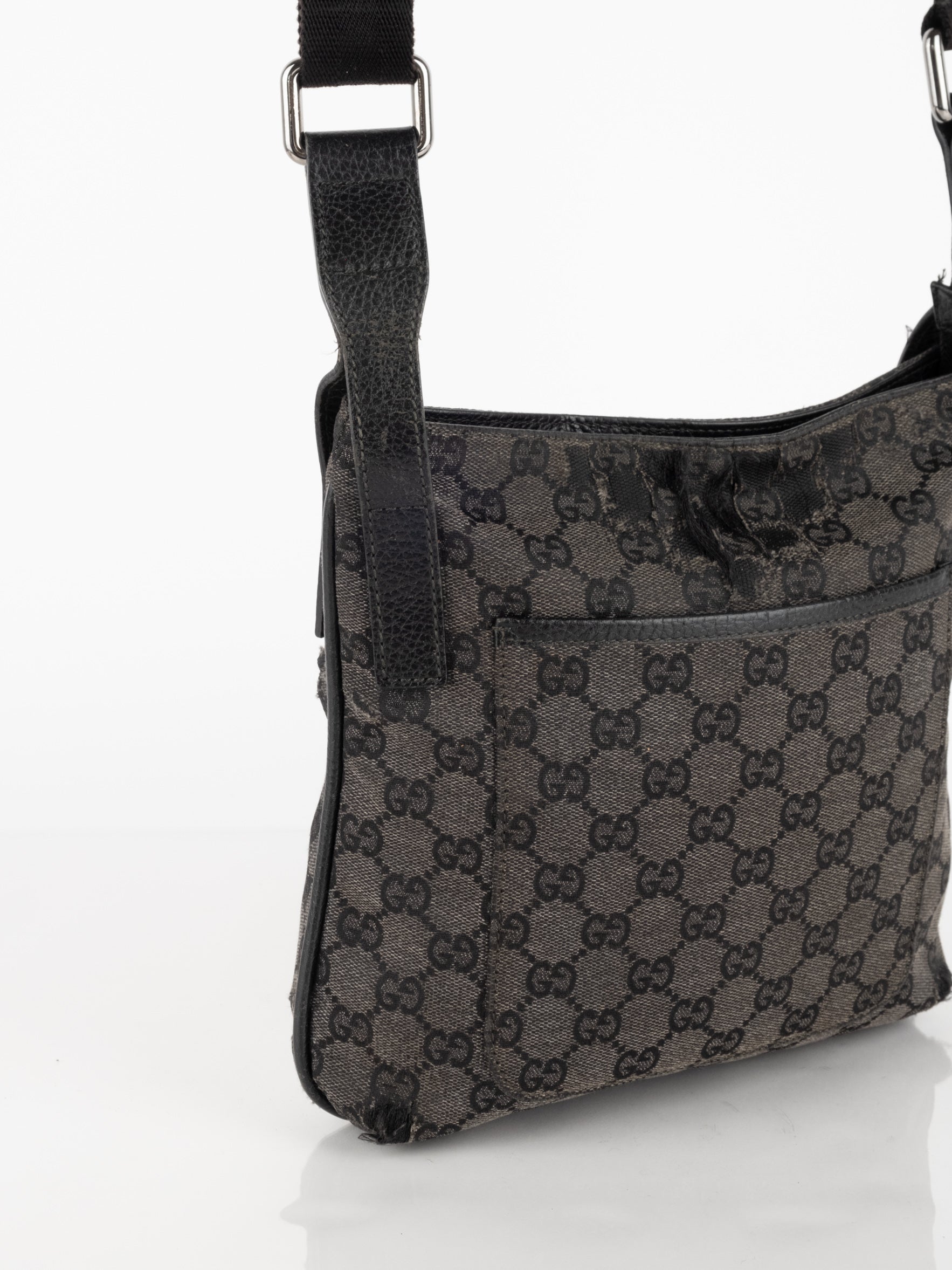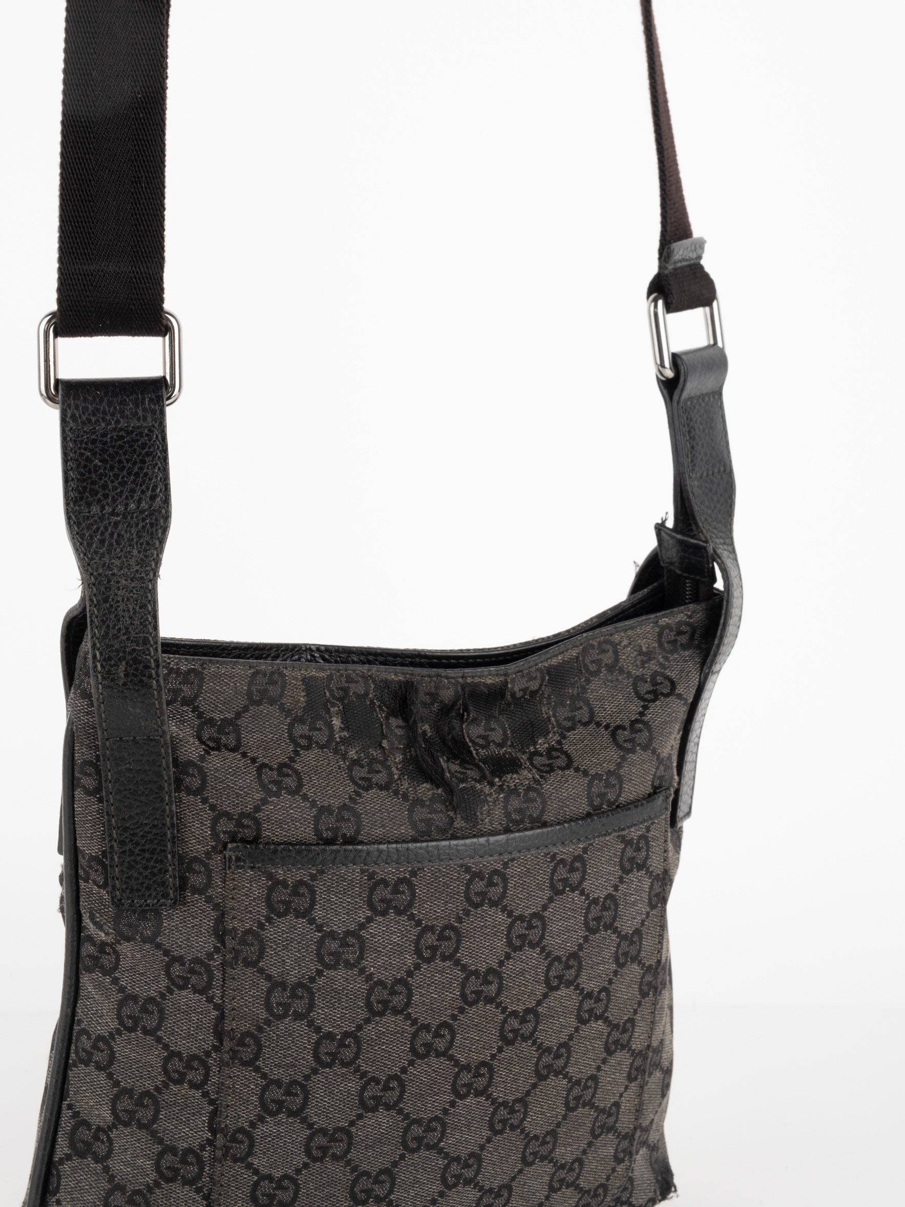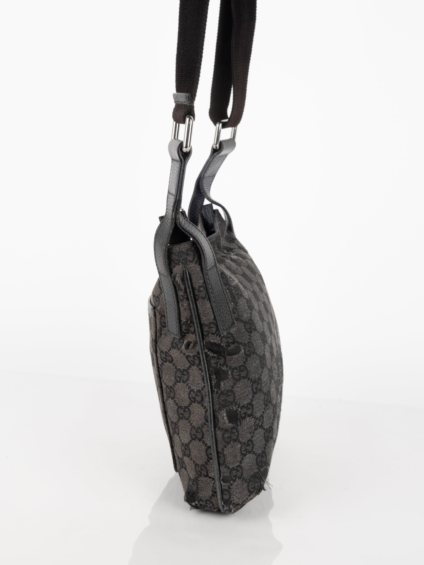 תיק כתף (מתאים לקרוסבודי) העשוי מבד קנבס בשילוש של עור בצבע שחור בהדפס המונוגרמי המוכר של המותג האיטלקי, בעל רצועה העשויה מבד שניתן לכוון ודיטיילים כסופים.